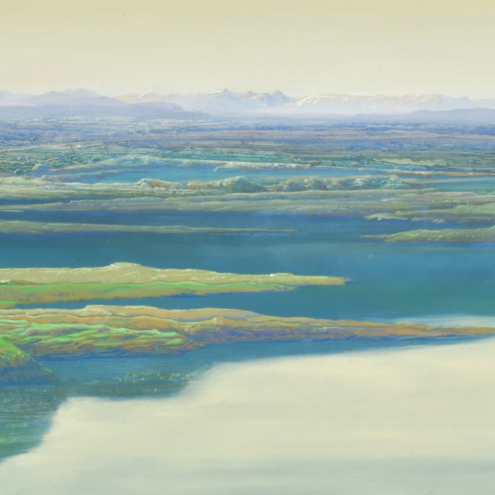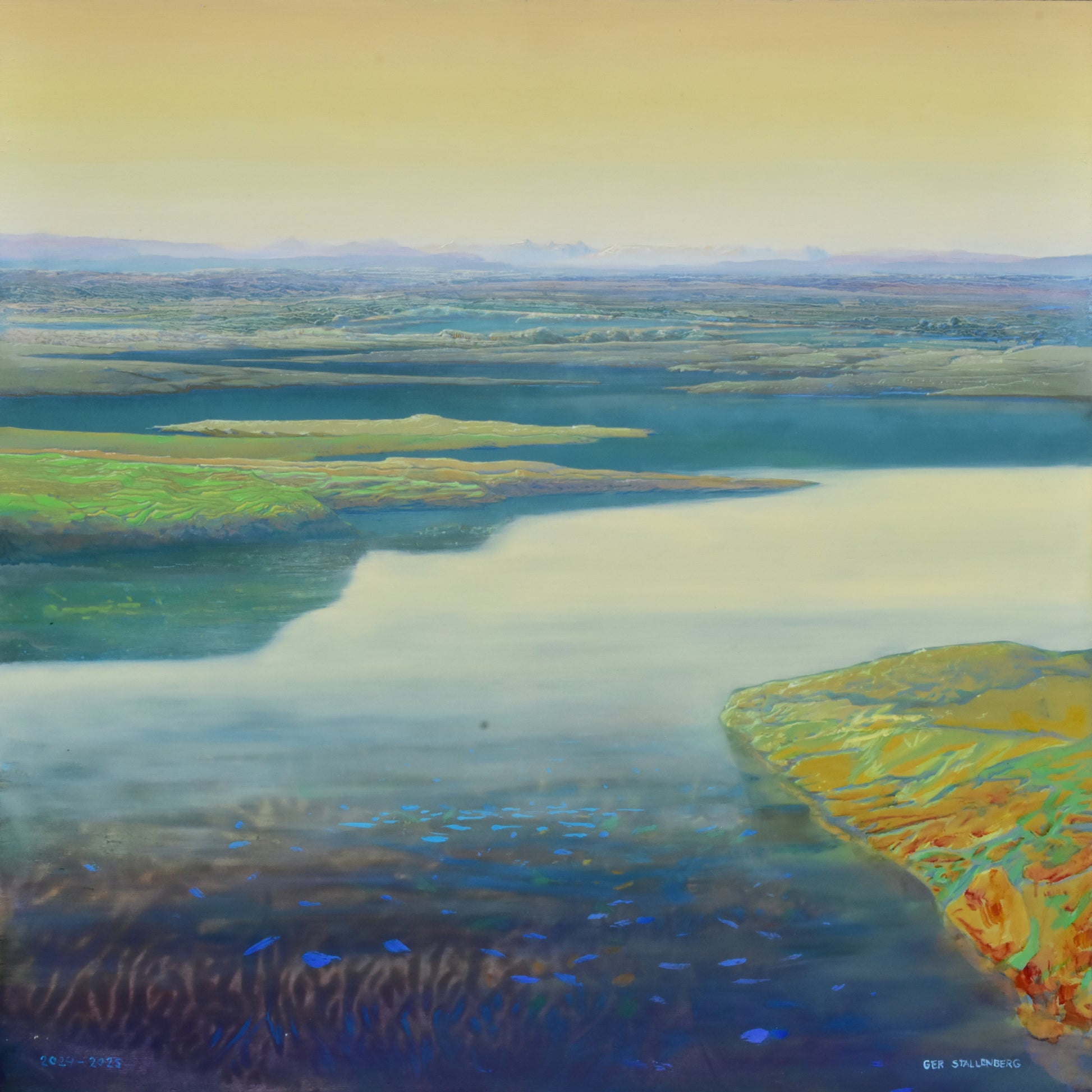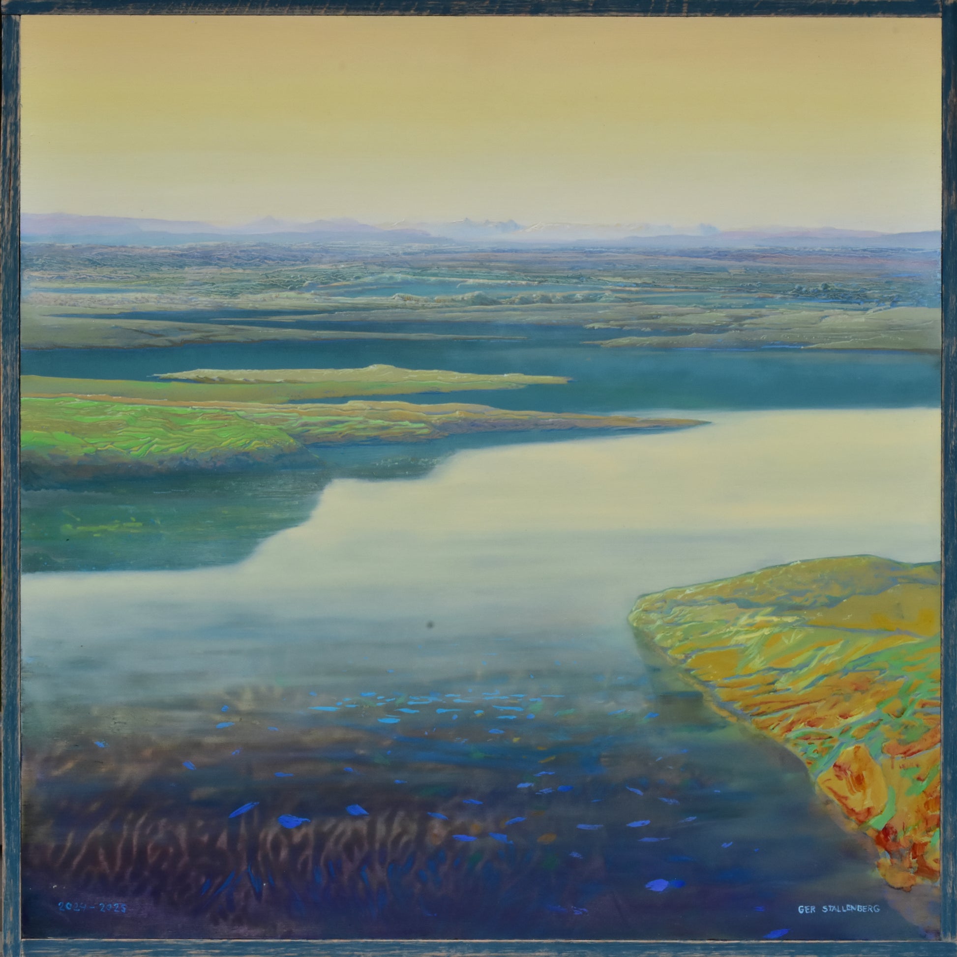 Dit landschap straalt een en al rust uit. En hoewel ik veel details geschilderd heb is daar van een afstandje weinig van te zien. En zo is het in de werkelijkheid ook; als we uitzoomen belanden we in de oneindigheid, en als we inzoomen komen we daar ook terecht. Die verwijzing naar de oneindigheid waarin wij en onze hele planeet een oneindig klein momentje zijn zou ik graag in een schilderij willen vangen.