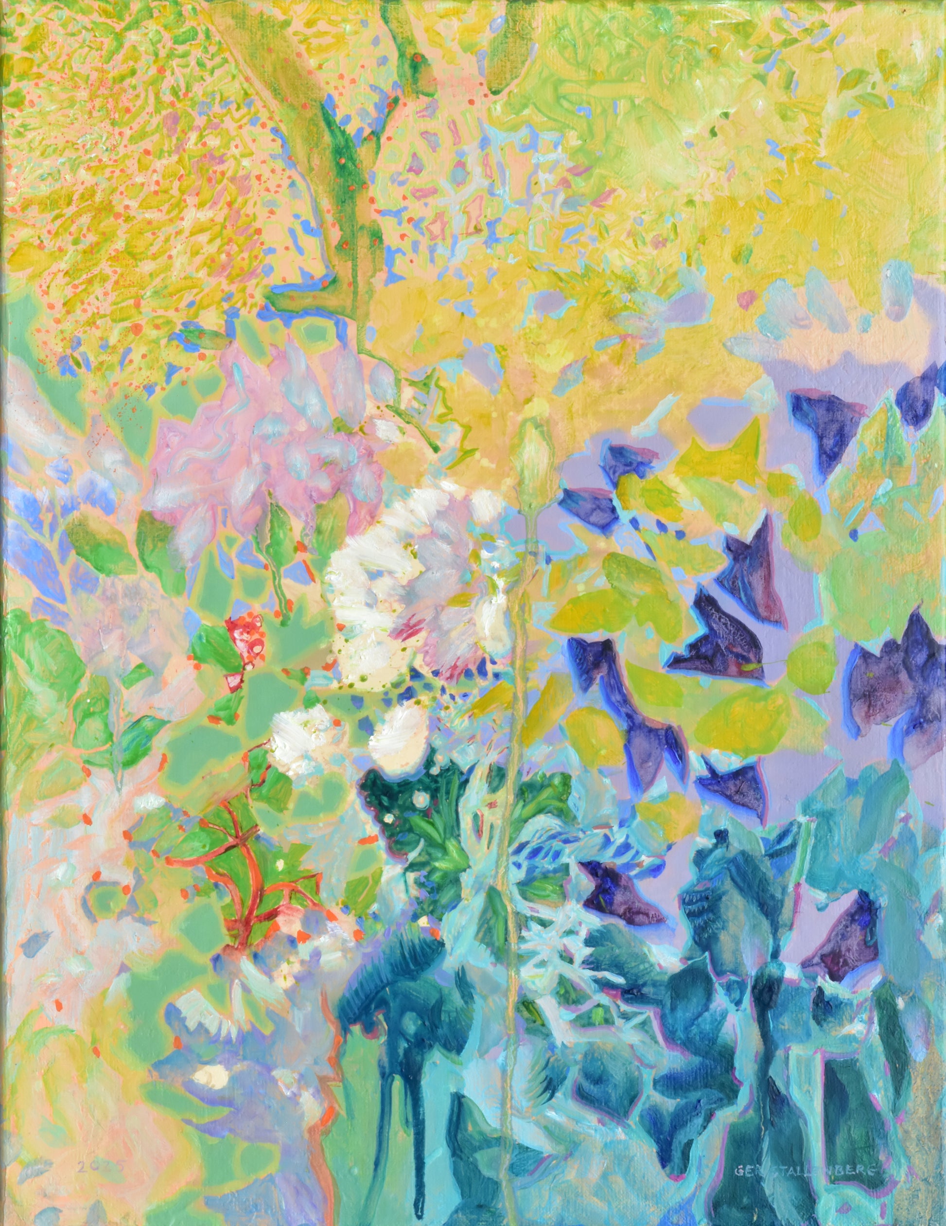 De magie van het bestaan is een onuitputtelijke inspiratiebron voor mij. Het wonder is "zichtbaar"op momenten dat je echt in contact staat met de natuur. Dat ervaren van het mysterie probeer ik door te laten klinken in mijn schilderijen. Het schilderproces verloopt even organisch als de groei in de natuur. Ik zie aan het einde pas waar het heen gegaan is en welke afbeelding er tot stand is gekomen. In dit schilderij zie je bloemen en blaadjes, zonder dat ik die echt geschilder heb.