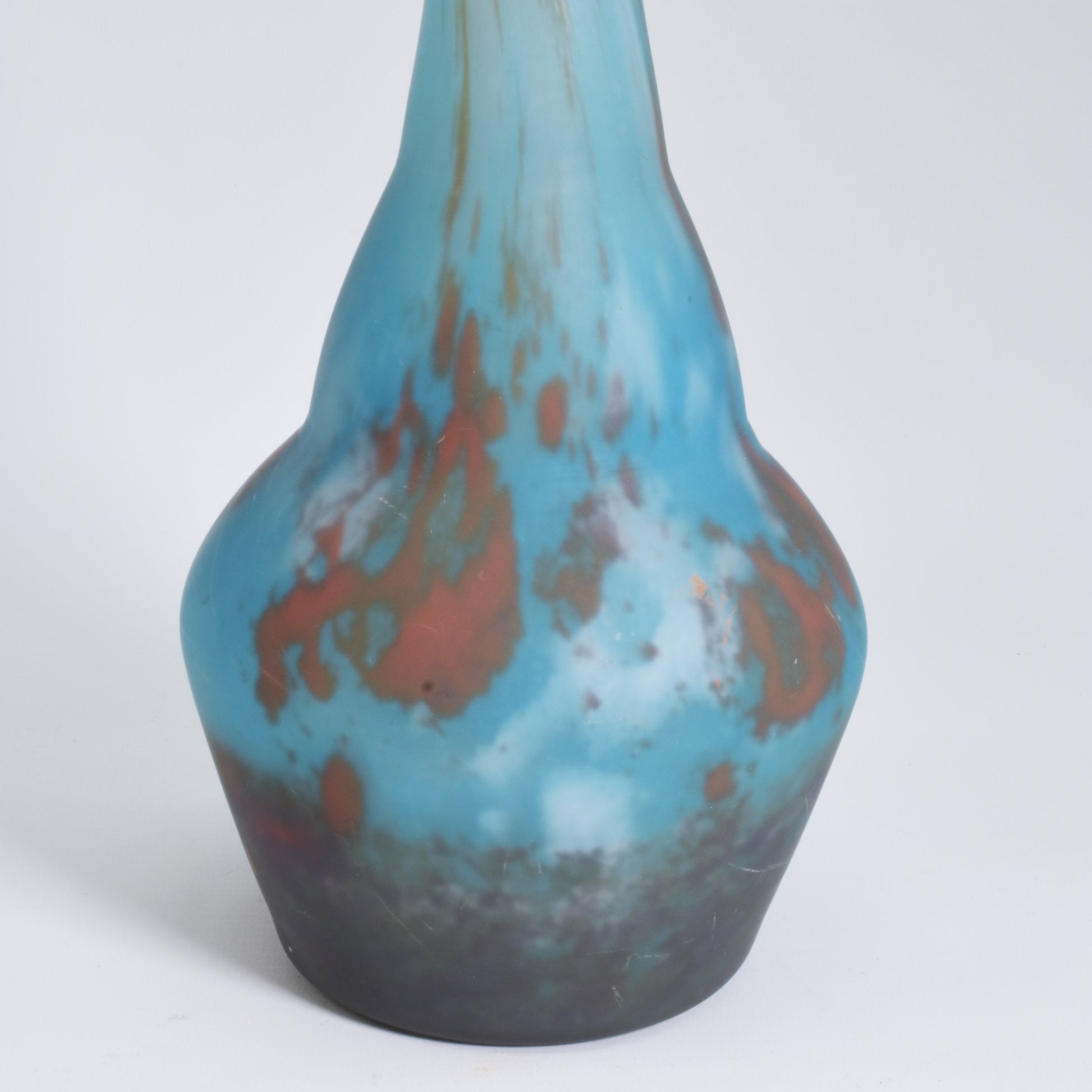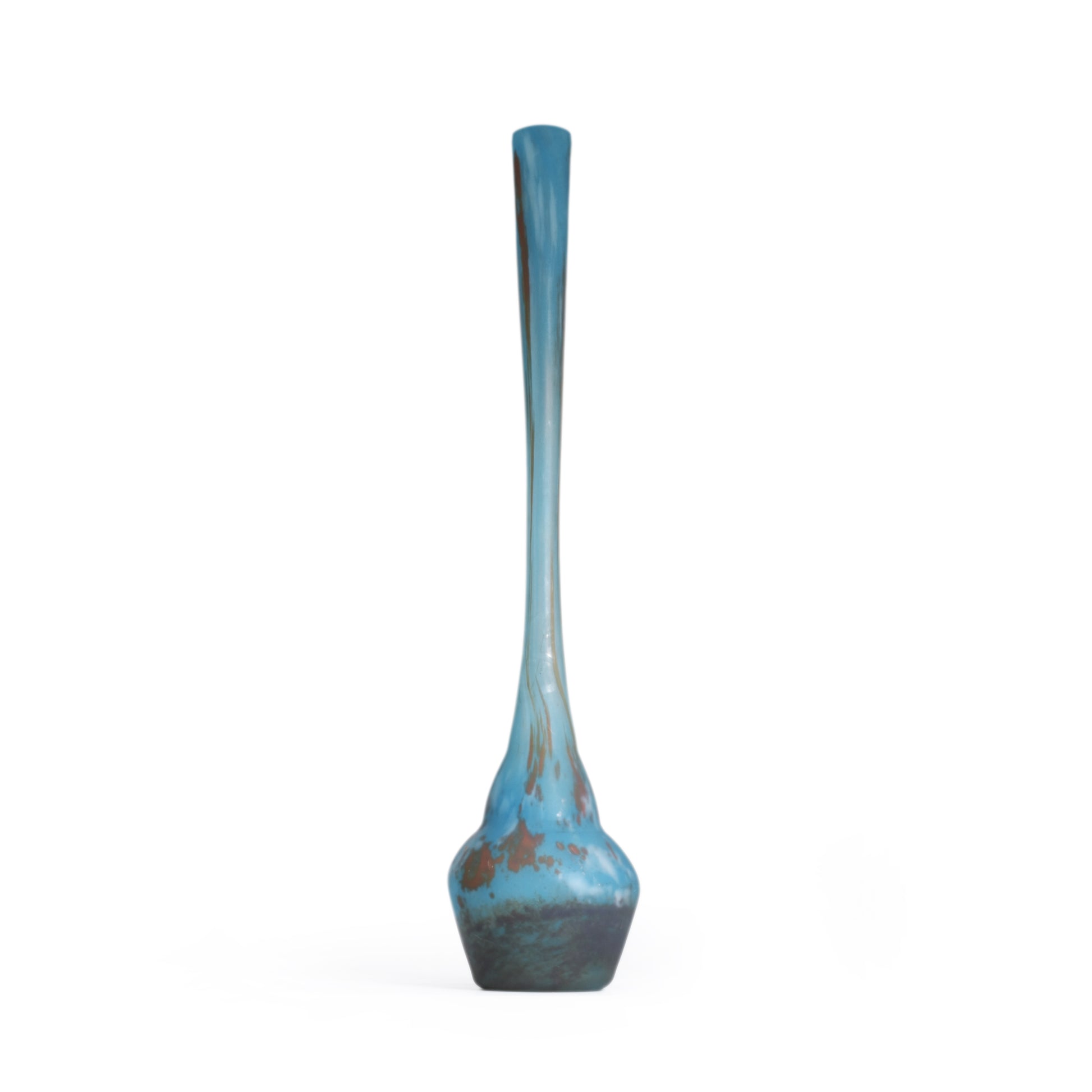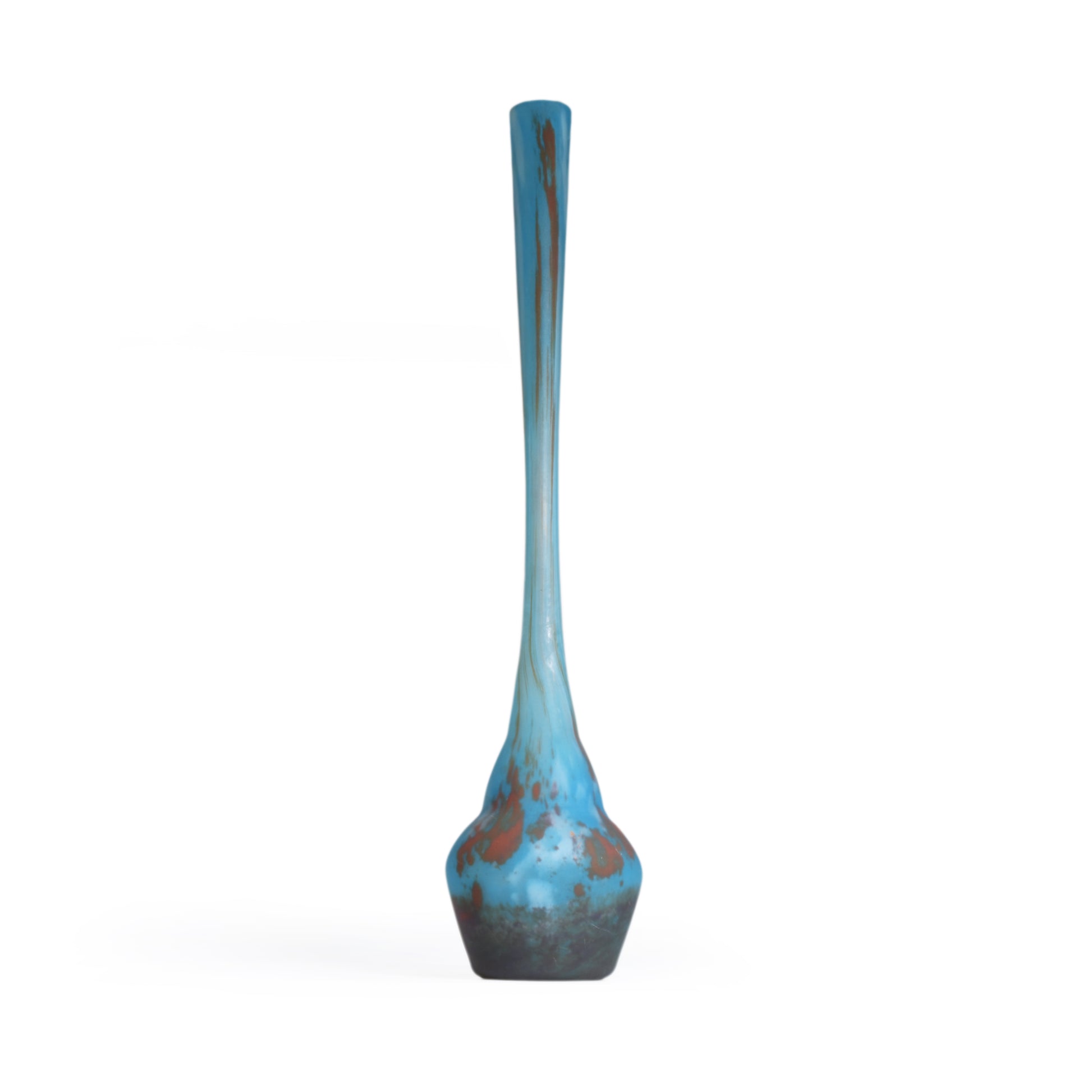 Mooi gevormde berluze met ingesmolten kleurpoeders, mat geëtst. Bij dit soort éénbloemsvazen is het erg belangrijk dat de hals niet ingekort is. Omdat deze vazen van boven ag geblazen zijn zijn ze aan de hals geslepen. Maar aan de verhoudingen kan men zien of de lengte origineel is, zoals bij deze vaas.