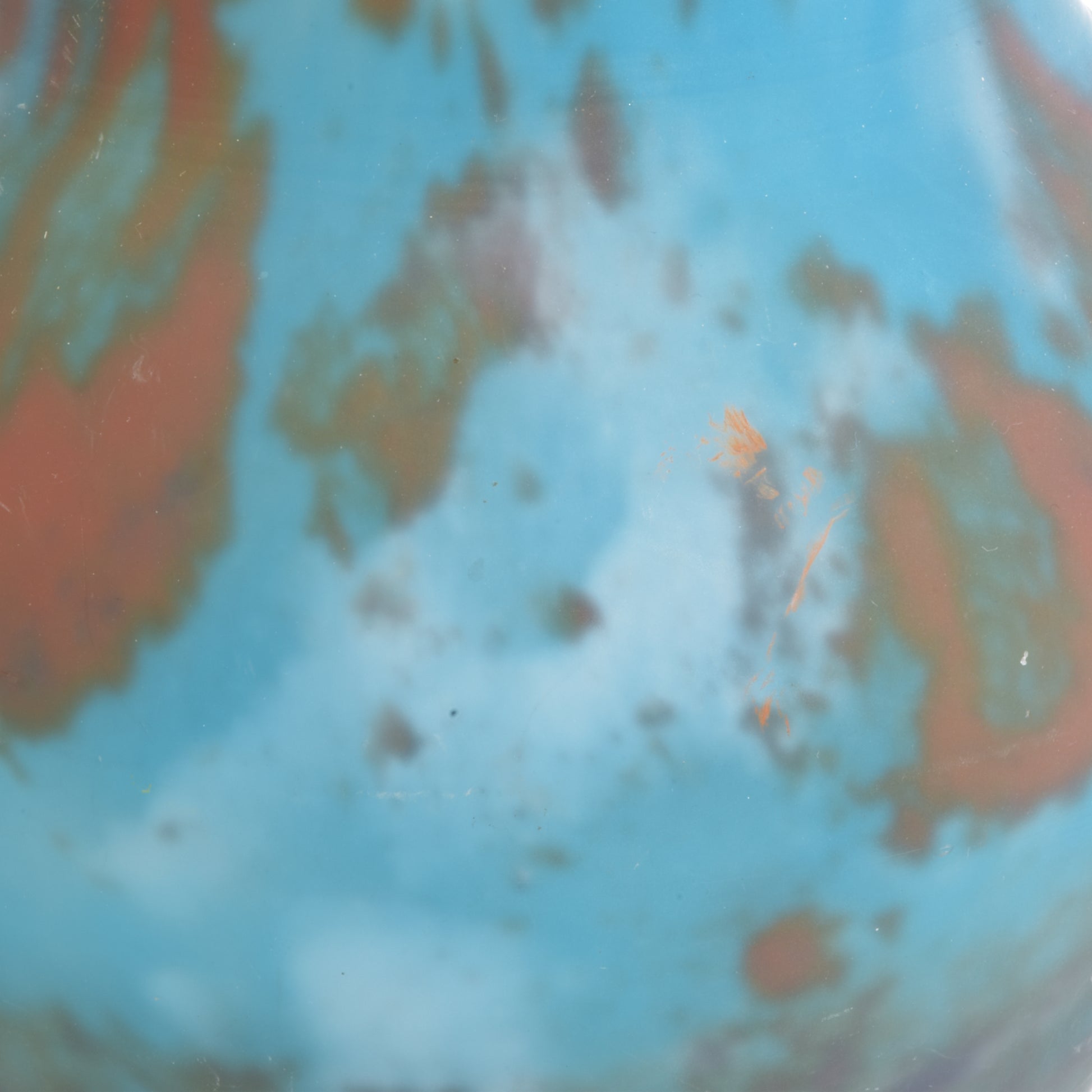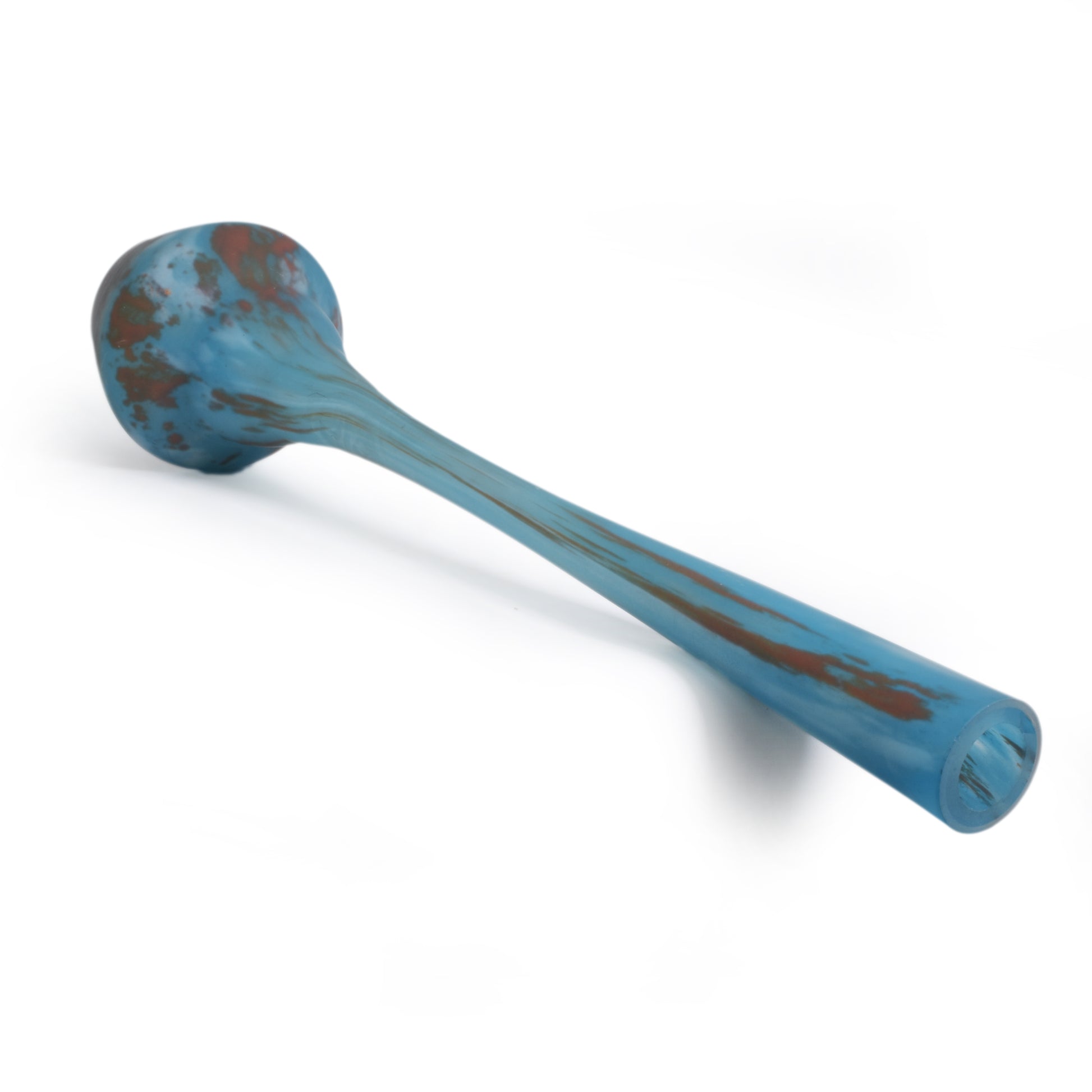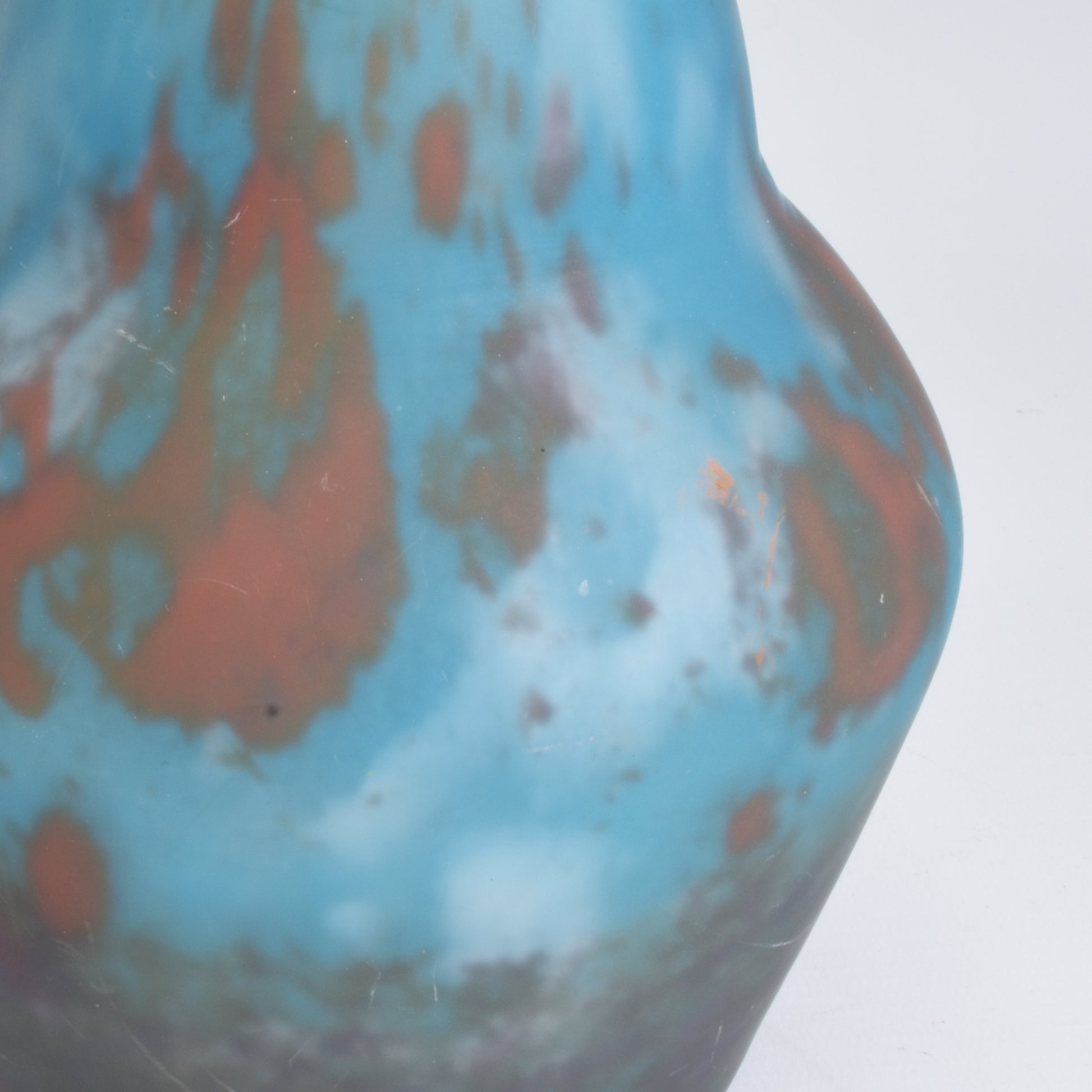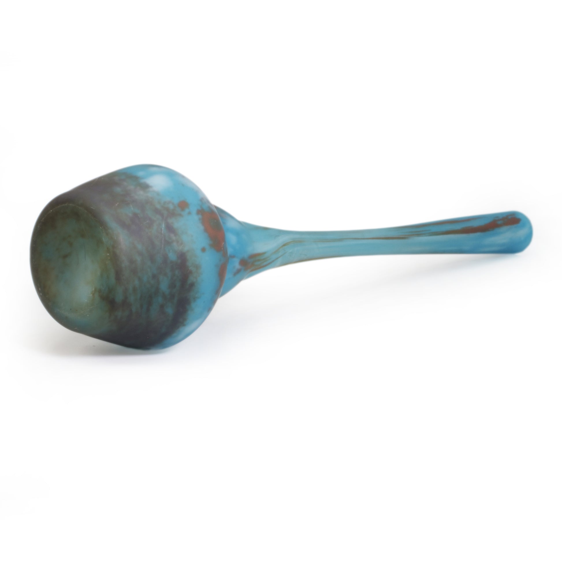 Mooi gevormde berluze met ingesmolten kleurpoeders, mat geëtst. Bij dit soort éénbloemsvazen is het erg belangrijk dat de hals niet ingekort is. Omdat deze vazen van boven ag geblazen zijn zijn ze aan de hals geslepen. Maar aan de verhoudingen kan men zien of de lengte origineel is, zoals bij deze vaas.