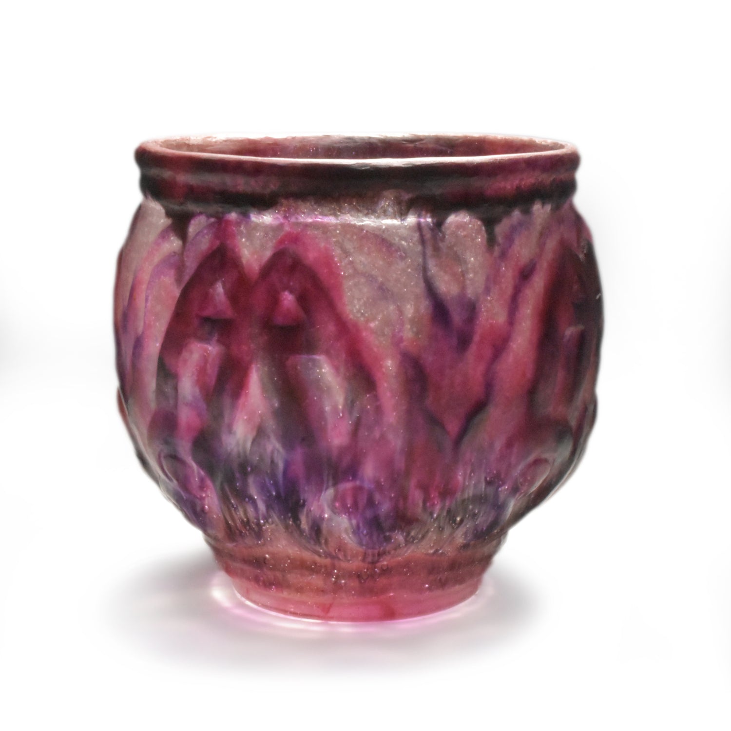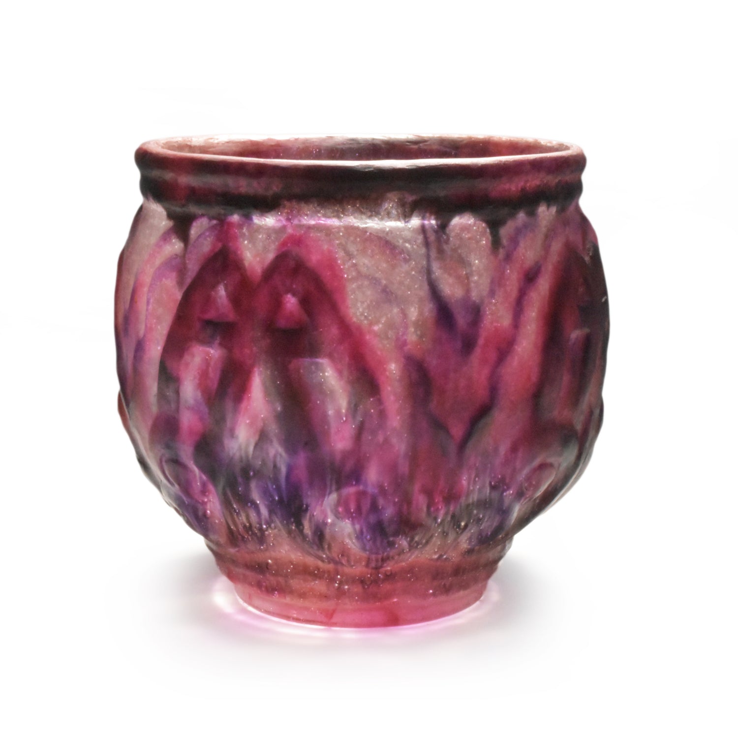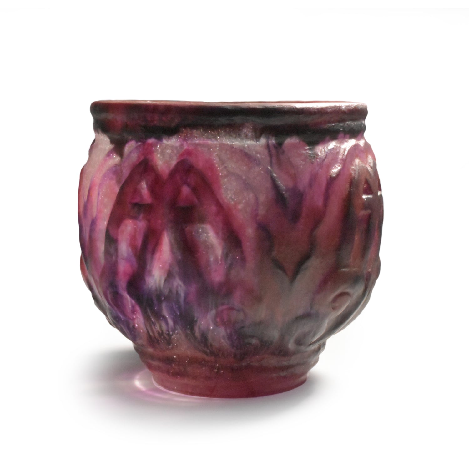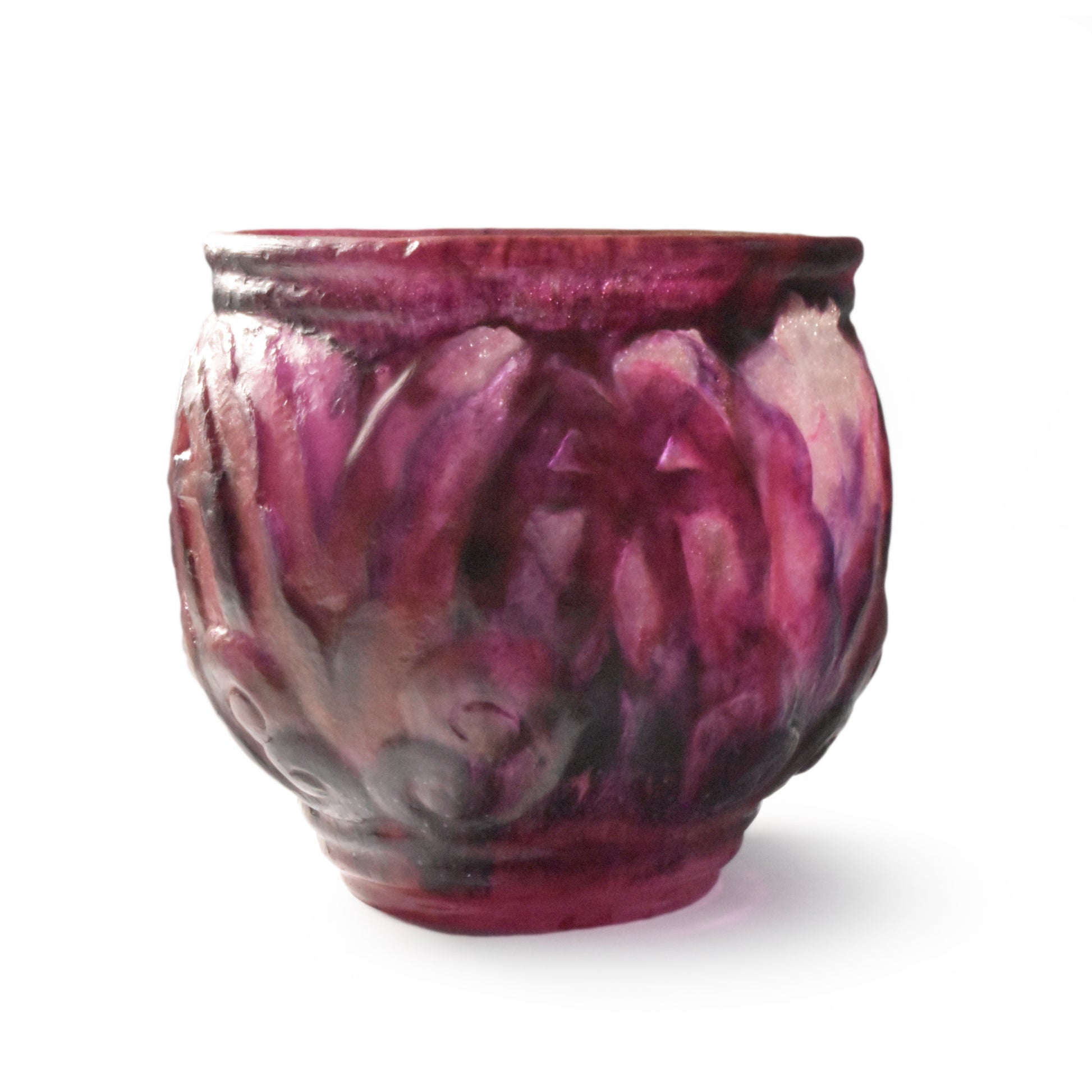 Grote vaas van Argy Rousseau in pâte de christal. Het materiaal dat hij hier gebruikt is dikker en zwaarder dan het pâte de verre. Het glas is ook transparanter en anders dan bij het pâte de verre zit de kleur niet alleen aan de buitenkant maar ook door het glas. De pure schoonheid van het materiaal speelt in het ontwerp een grote rol.