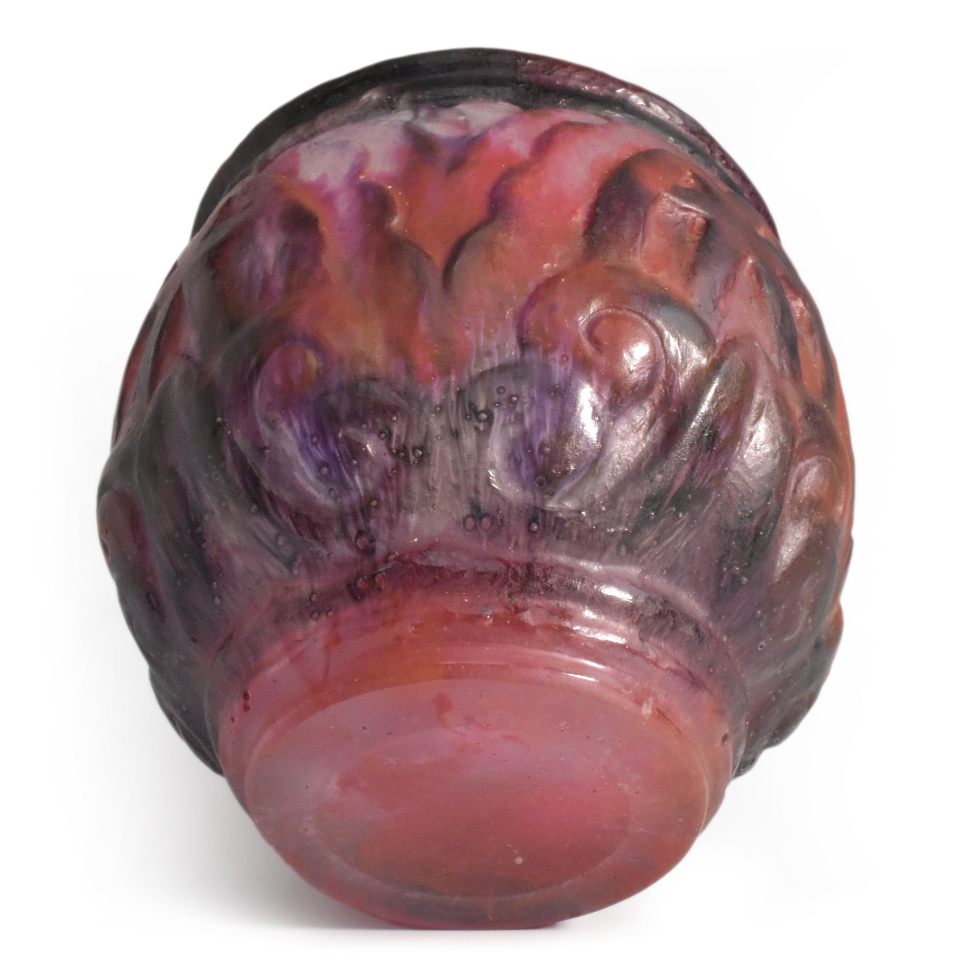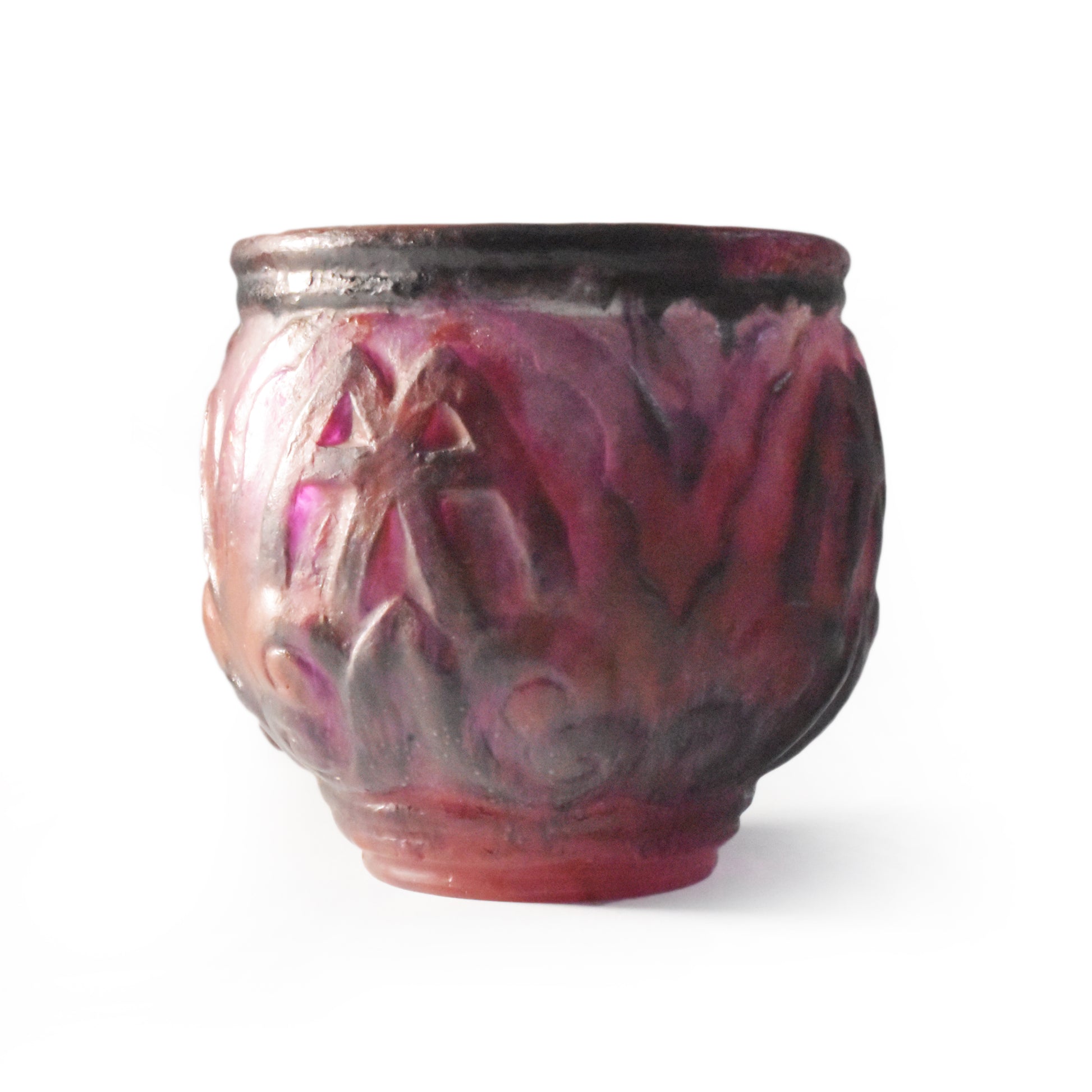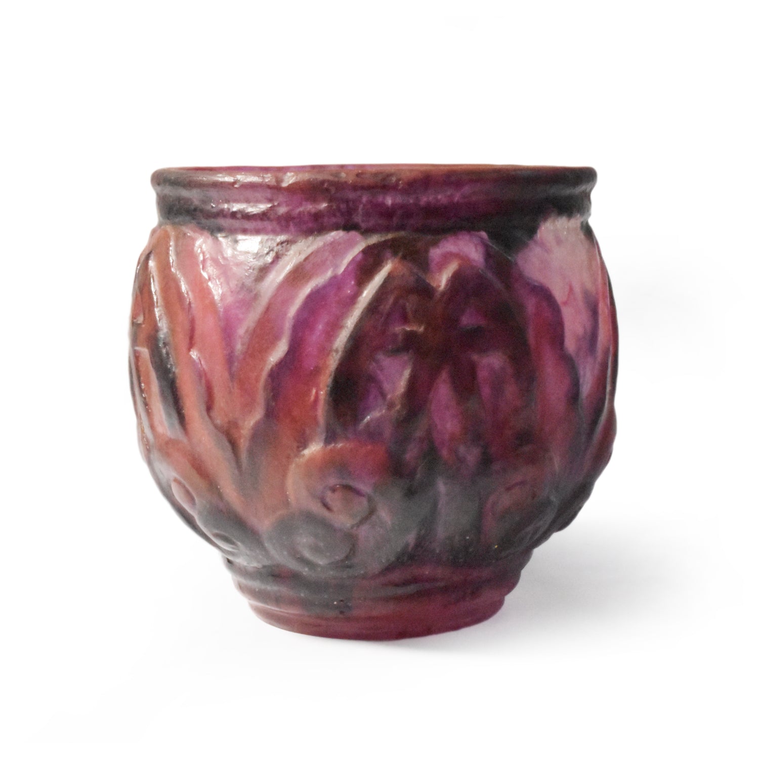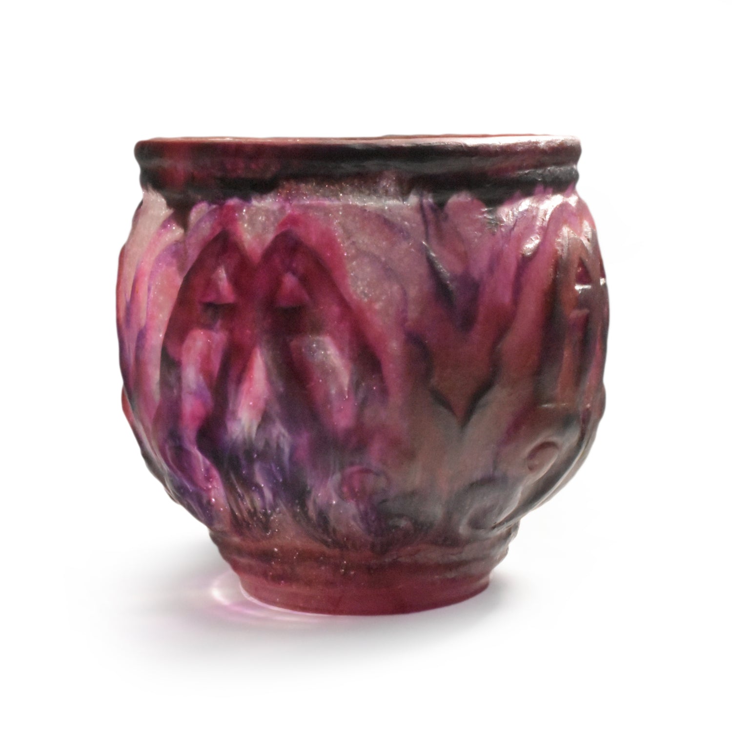 Grote vaas van Argy Rousseau in pâte de christal. Het materiaal dat hij hier gebruikt is dikker en zwaarder dan het pâte de verre. Het glas is ook transparanter en anders dan bij het pâte de verre zit de kleur niet alleen aan de buitenkant maar ook door het glas. De pure schoonheid van het materiaal speelt in het ontwerp een grote rol.