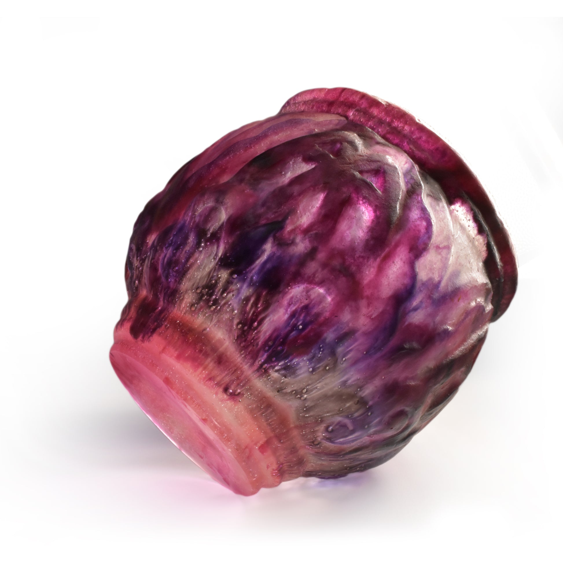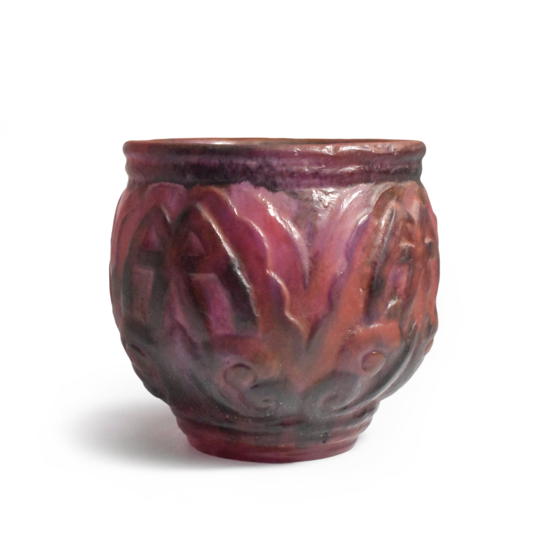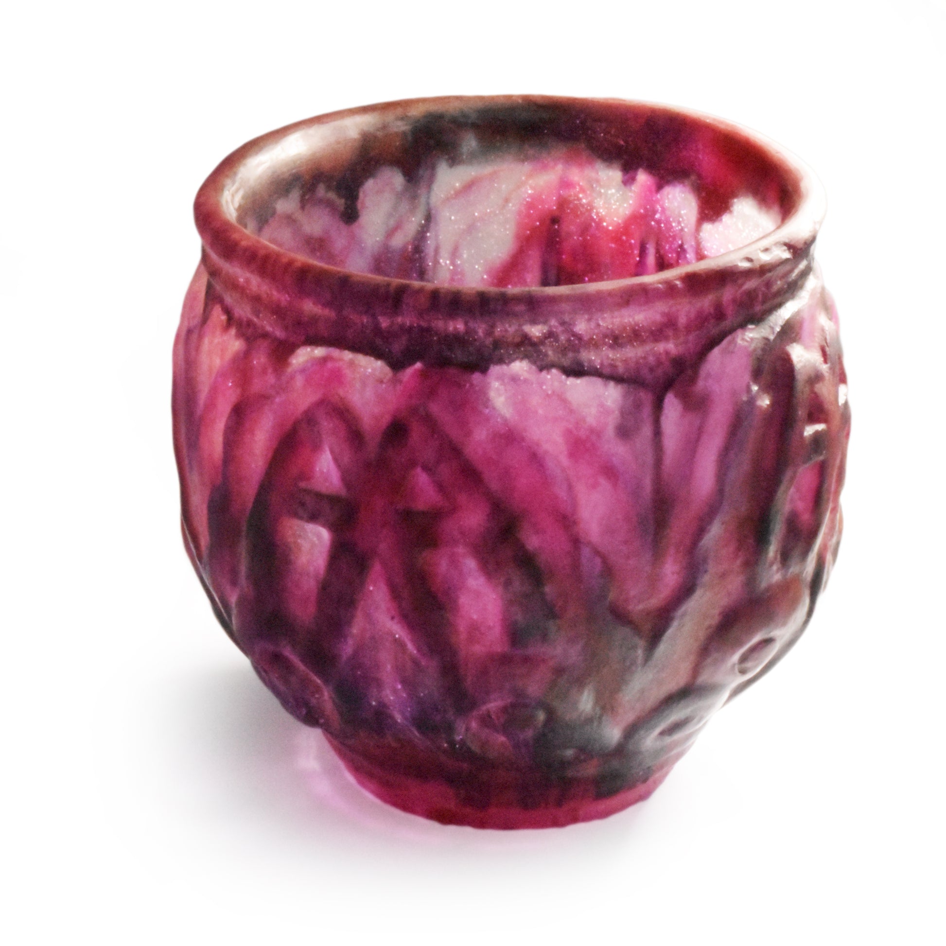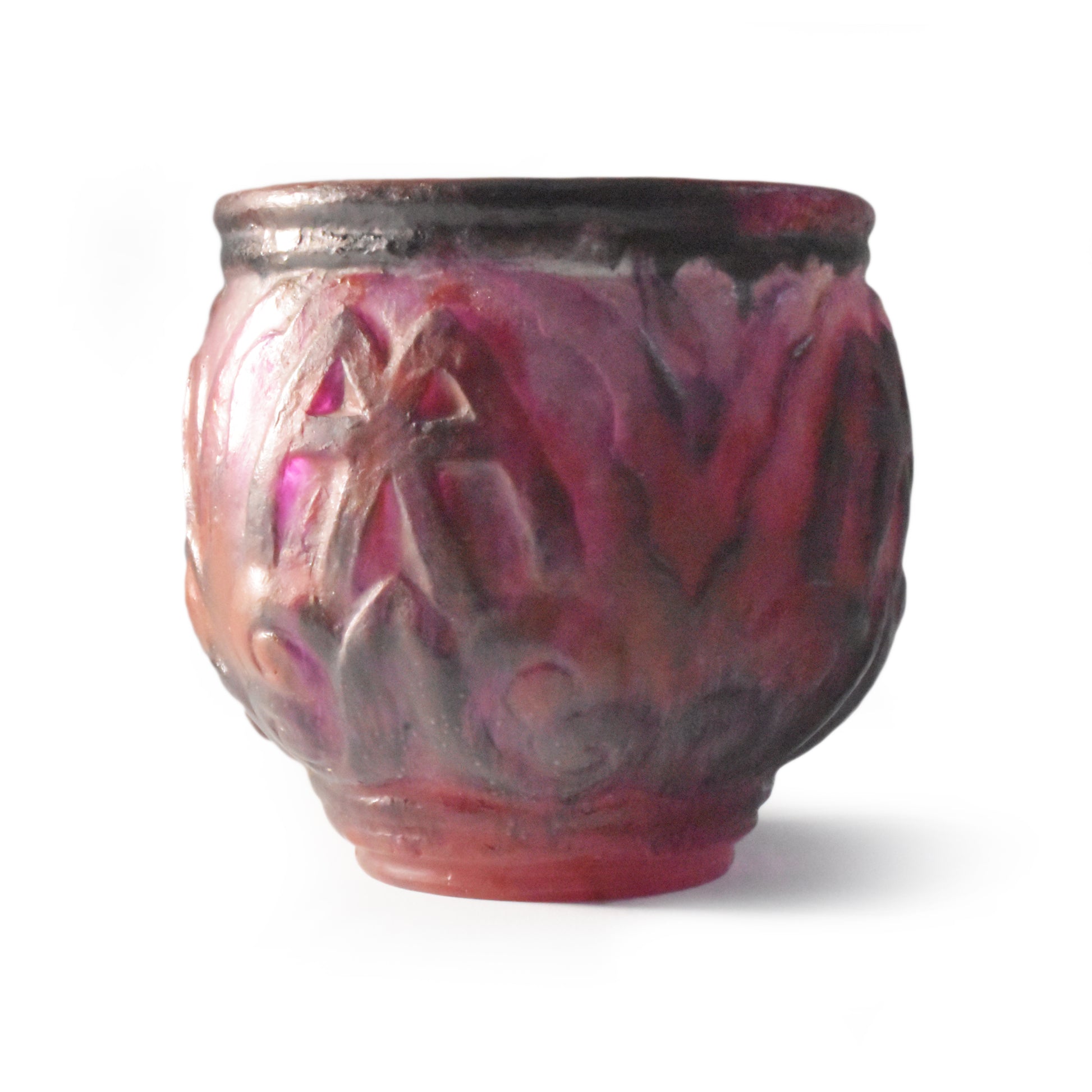 Grote vaas van Argy Rousseau in pâte de christal. Het materiaal dat hij hier gebruikt is dikker en zwaarder dan het pâte de verre. Het glas is ook transparanter en anders dan bij het pâte de verre zit de kleur niet alleen aan de buitenkant maar ook door het glas. De pure schoonheid van het materiaal speelt in het ontwerp een grote rol.