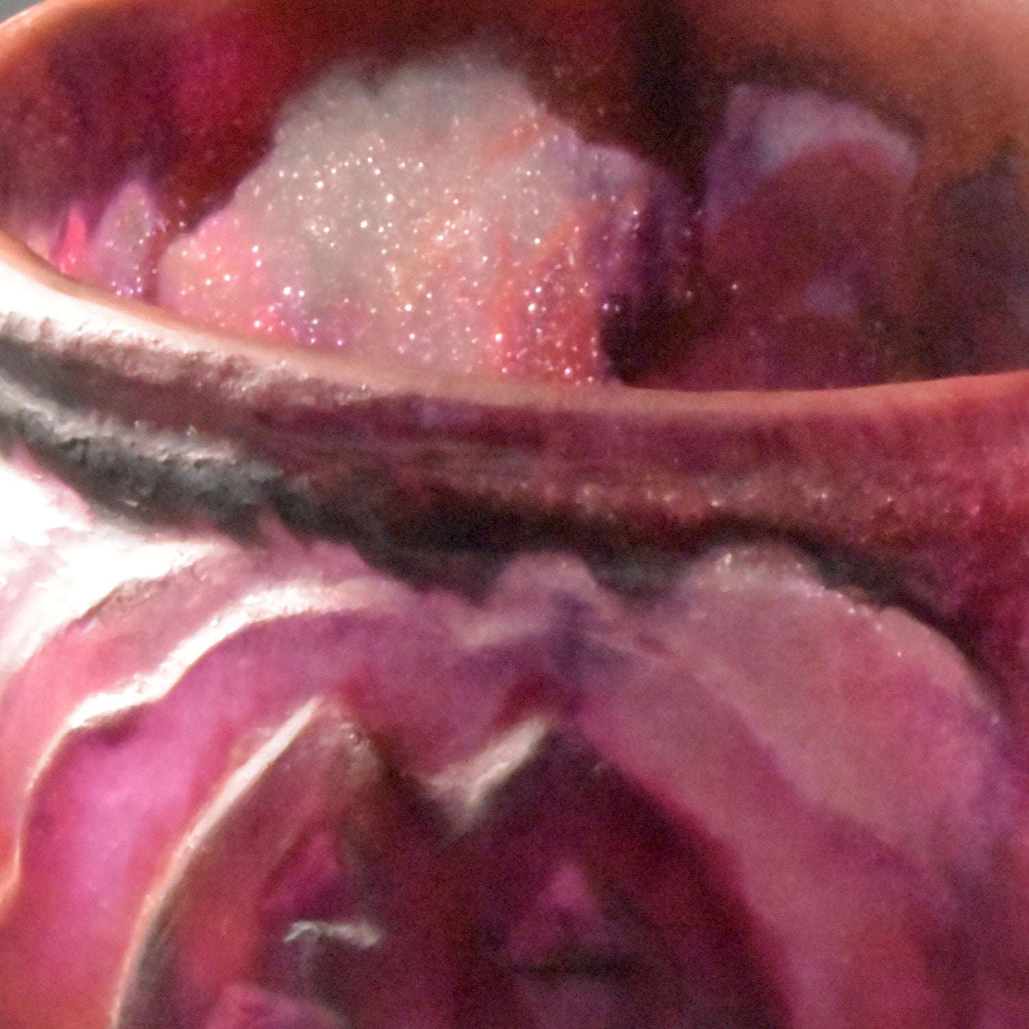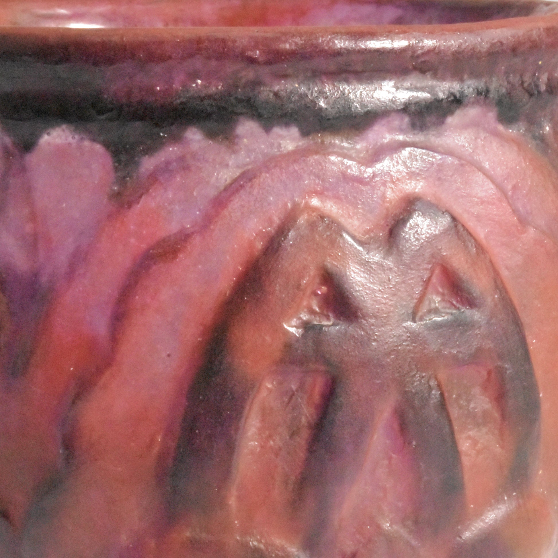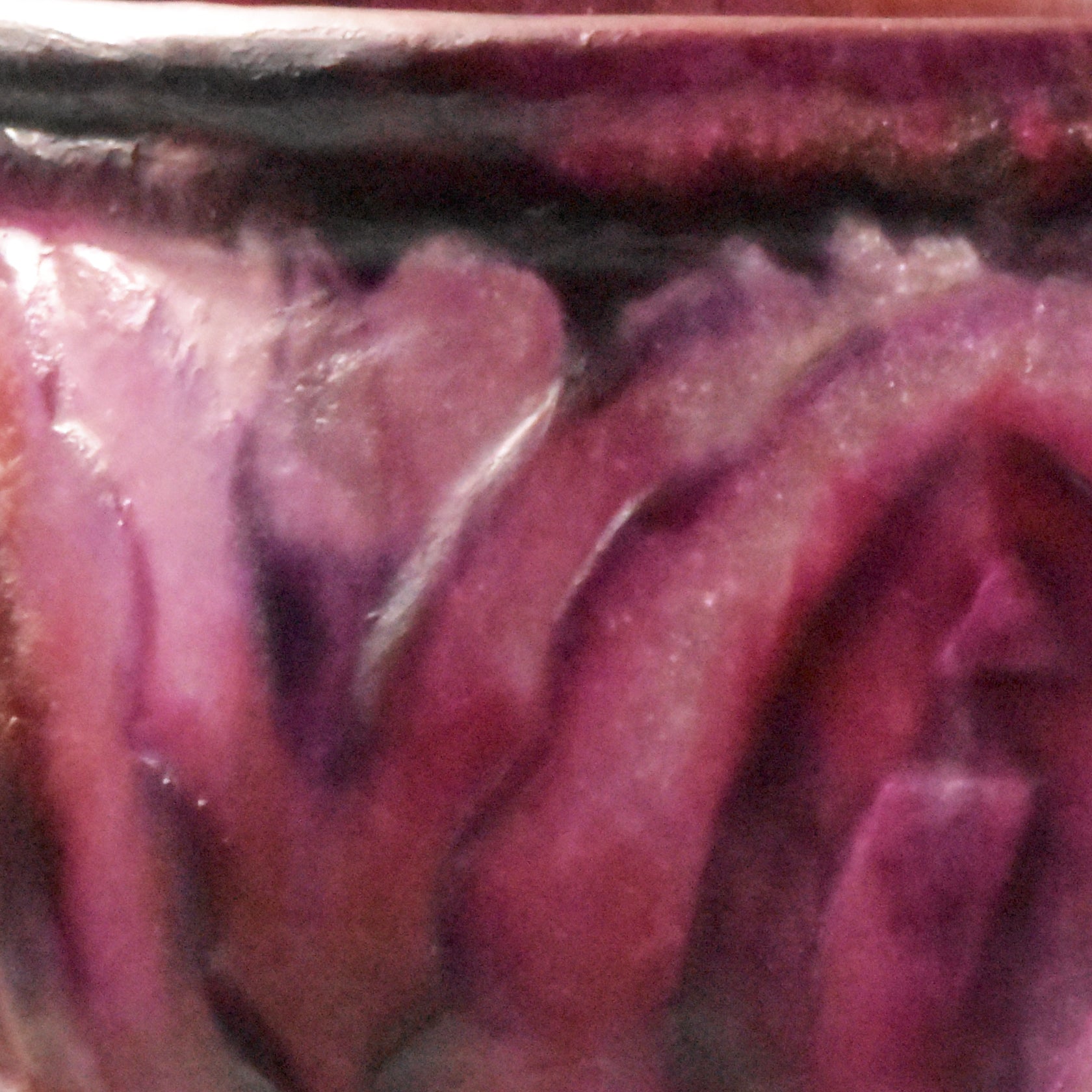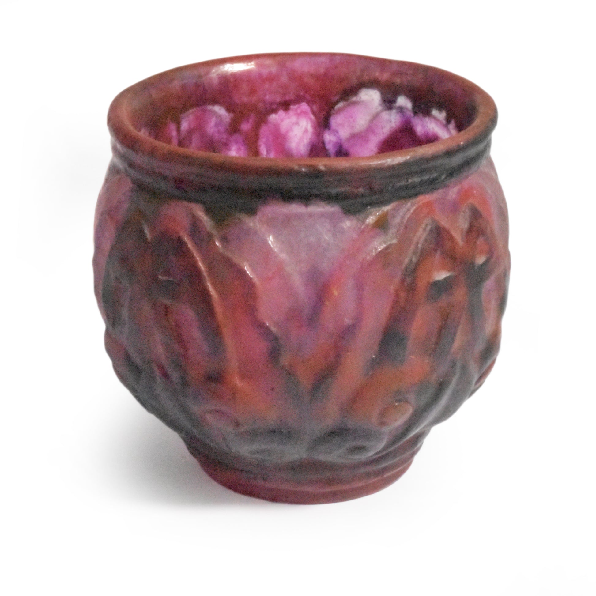 Grote vaas van Argy Rousseau in pâte de christal. Het materiaal dat hij hier gebruikt is dikker en zwaarder dan het pâte de verre. Het glas is ook transparanter en anders dan bij het pâte de verre zit de kleur niet alleen aan de buitenkant maar ook door het glas. De pure schoonheid van het materiaal speelt in het ontwerp een grote rol.
