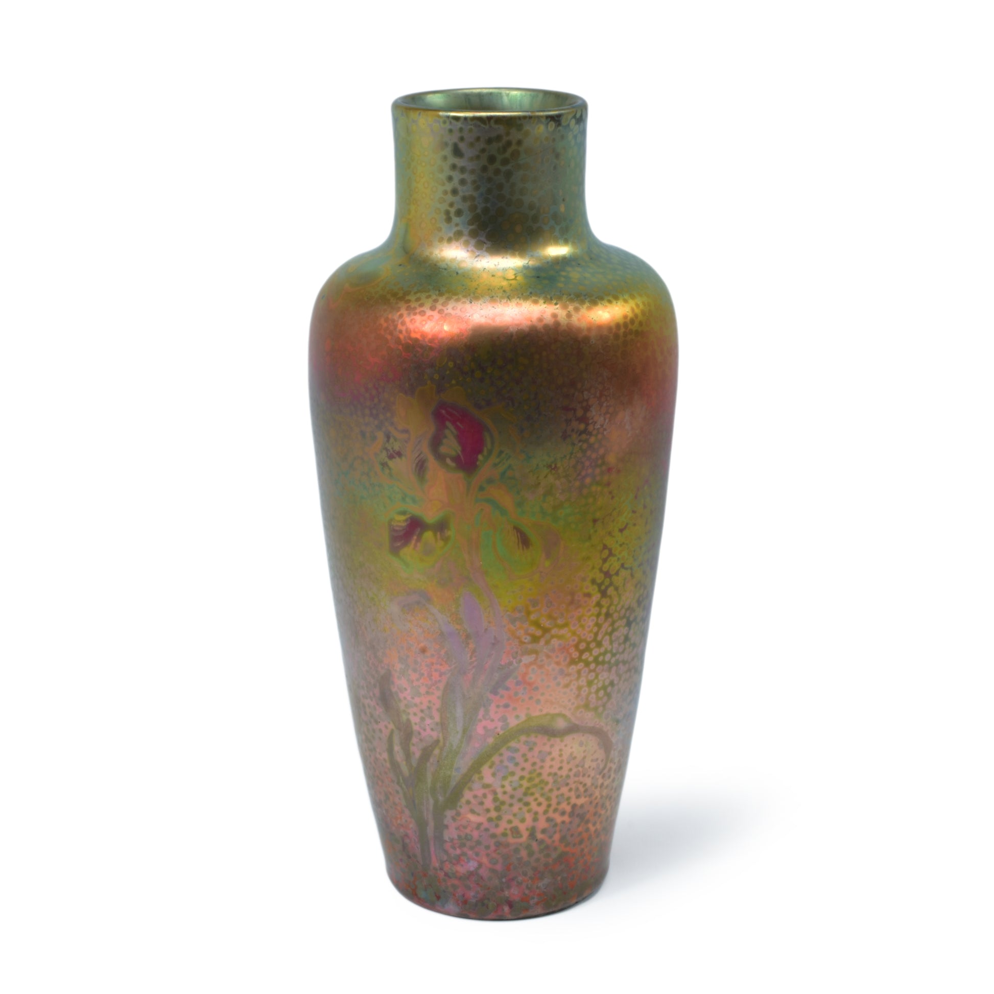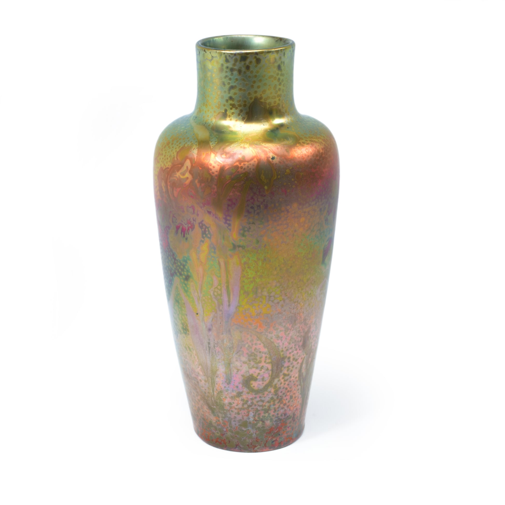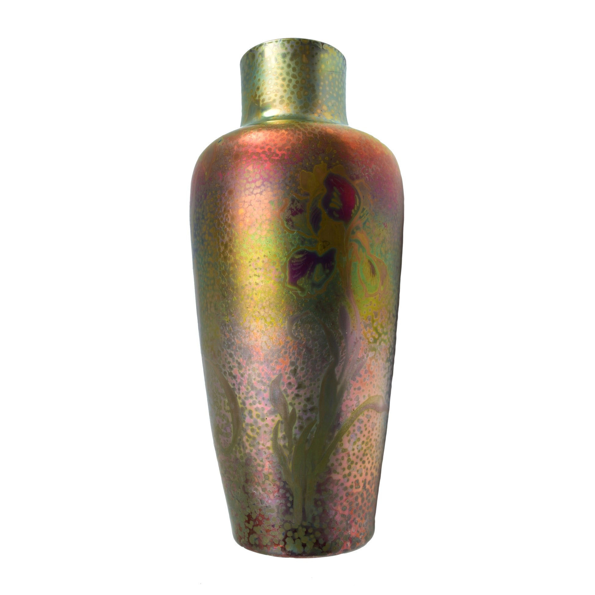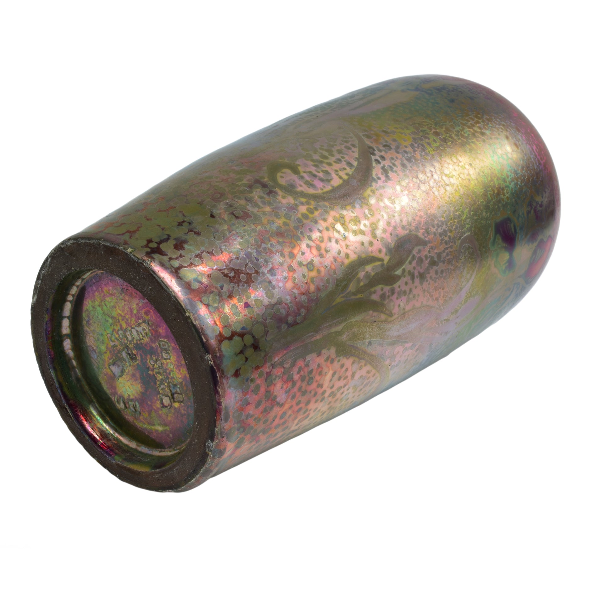 Clement Massier is de meester van het lustre glazuur. Zijn eerste experimenten startte hij al in 1865. In 1887 kon hij trots zijn collectie reflets metallique keramiek presenteren. Op de wereldtentoonstelling in Parijs won hij een gouden medaille. De ingewikkelde en fragiele techniek leidt in het beste geval, zoals bij deze vaas tot een spectaculair kleurrijk schilderachtig en feëriek resultaat.