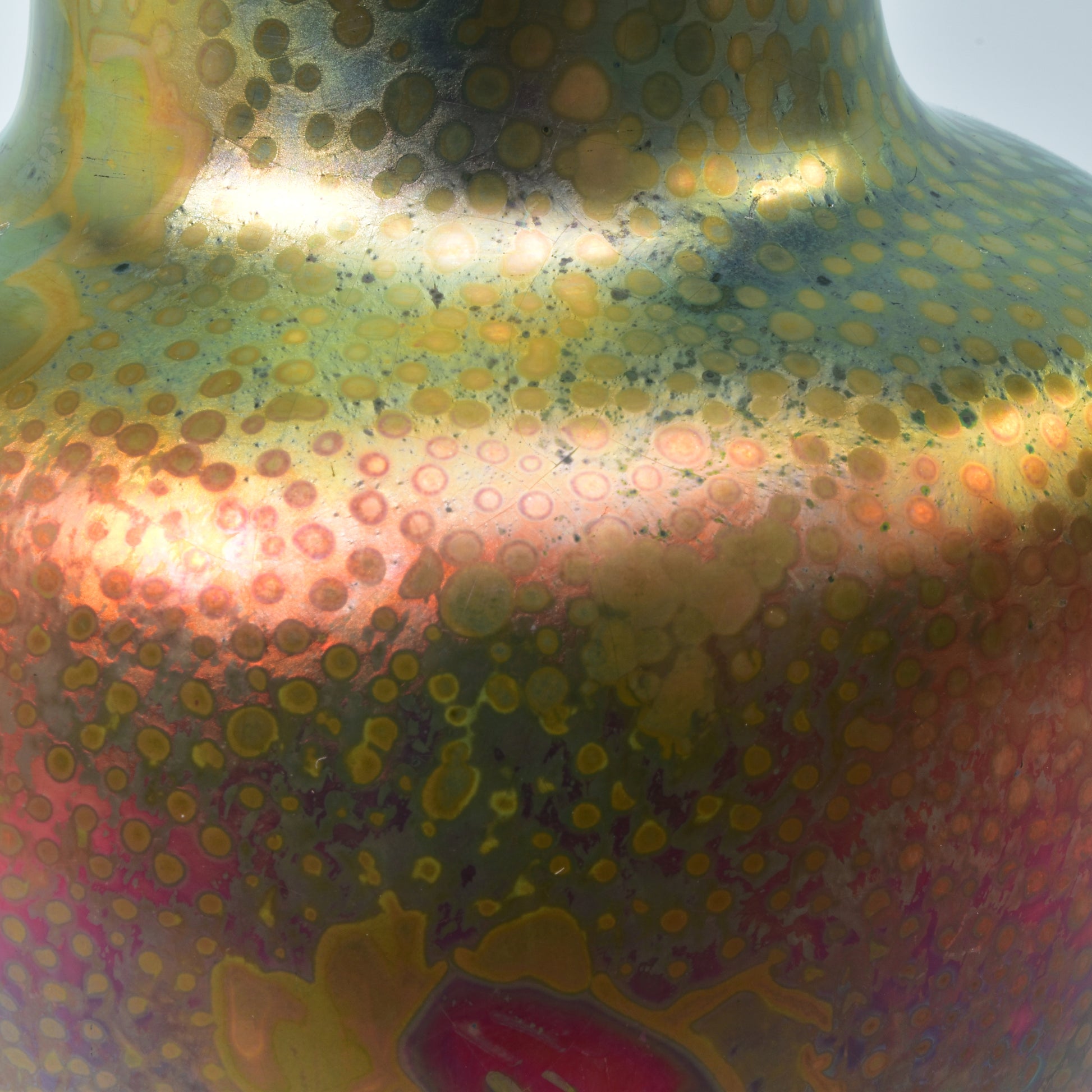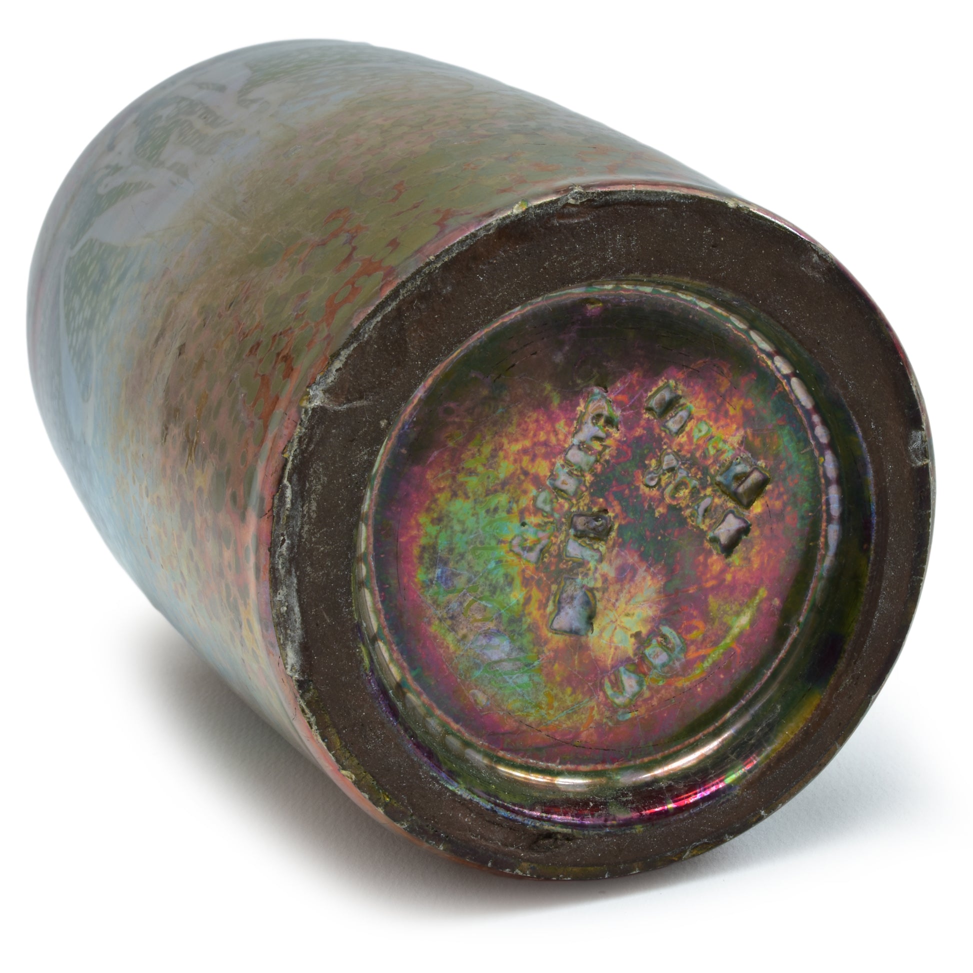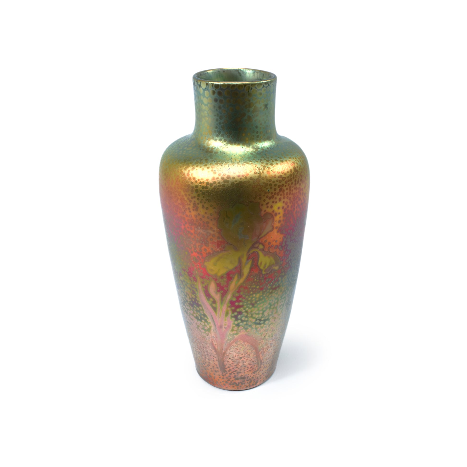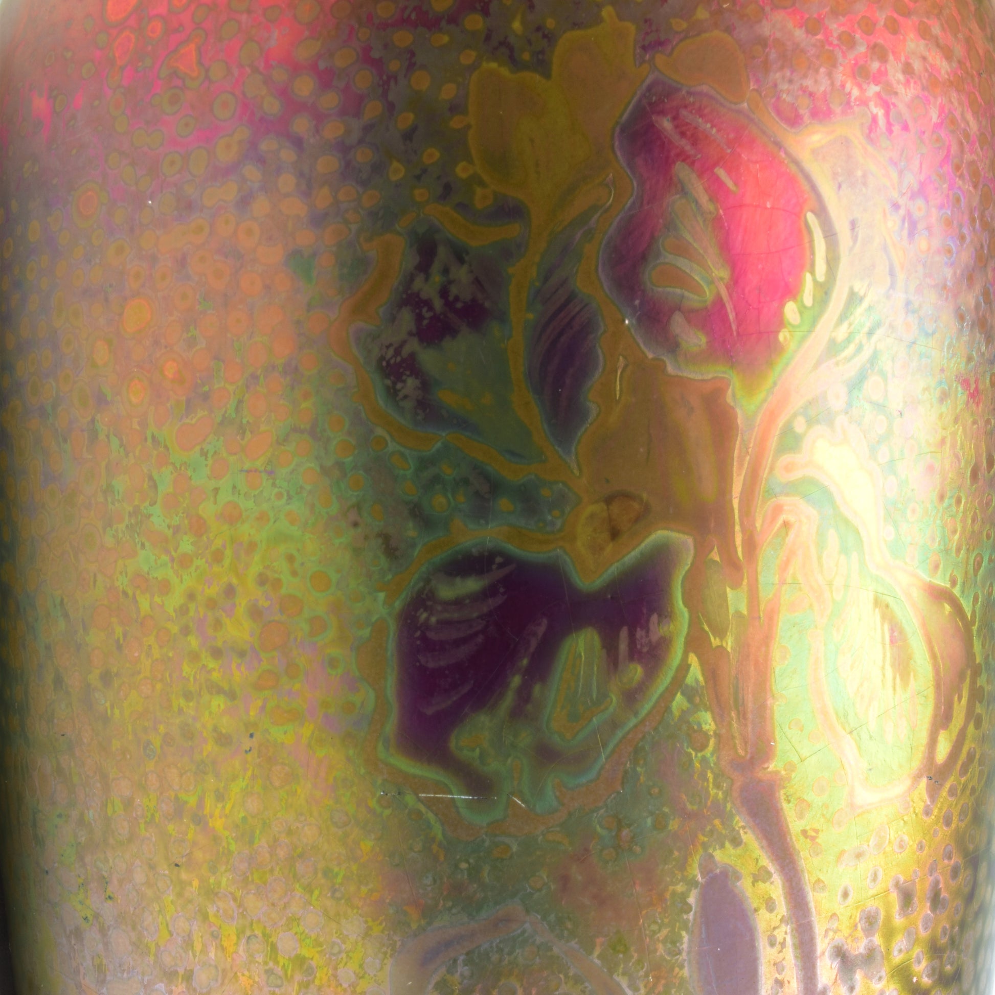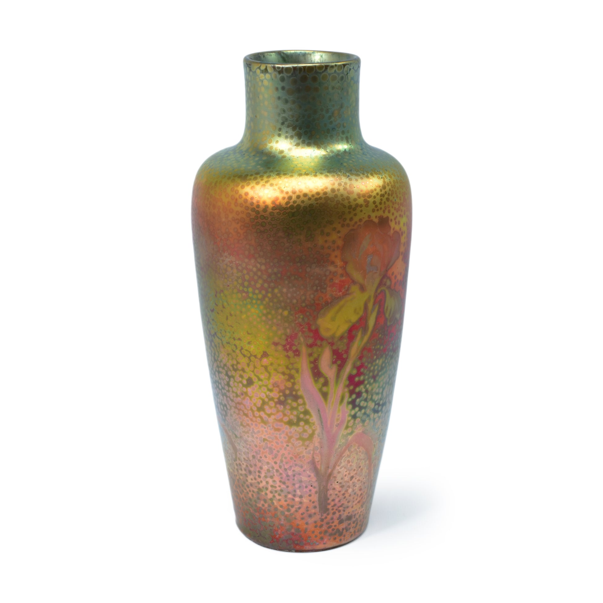Clement Massier is de meester van het lustre glazuur. Zijn eerste experimenten startte hij al in 1865. In 1887 kon hij trots zijn collectie reflets metallique keramiek presenteren. Op de wereldtentoonstelling in Parijs won hij een gouden medaille. De ingewikkelde en fragiele techniek leidt in het beste geval, zoals bij deze vaas tot een spectaculair kleurrijk schilderachtig en feëriek resultaat.