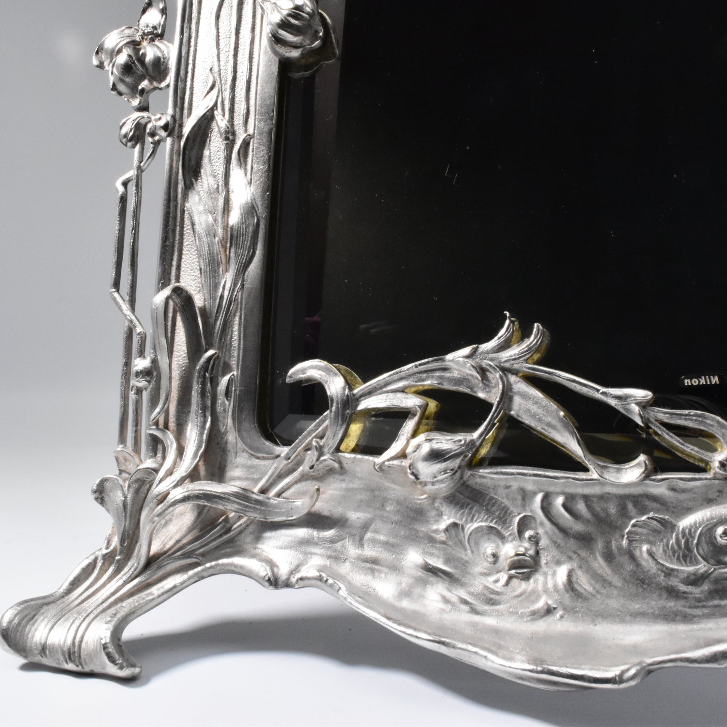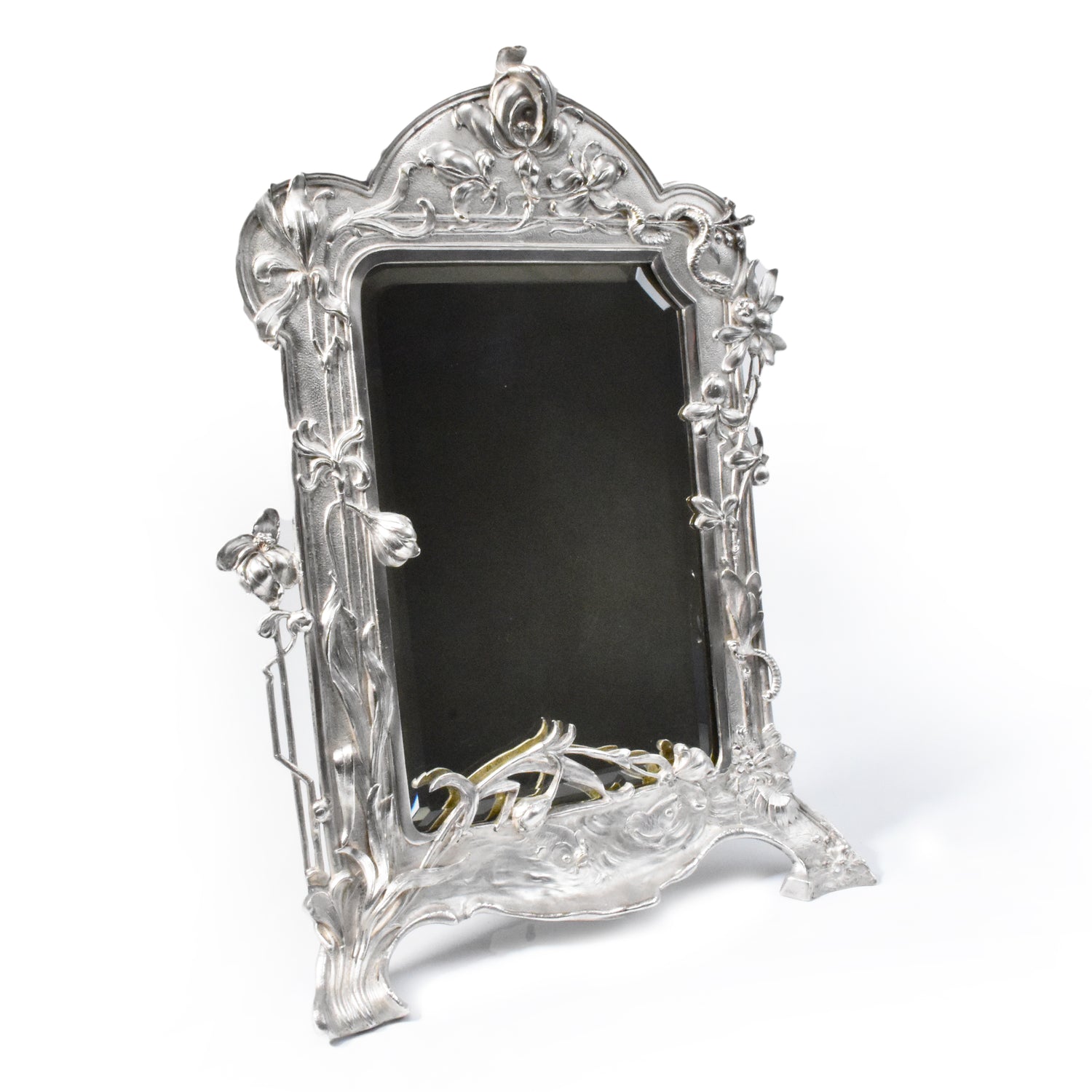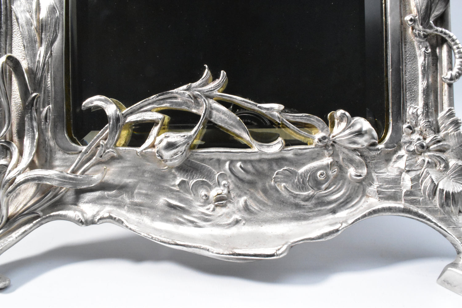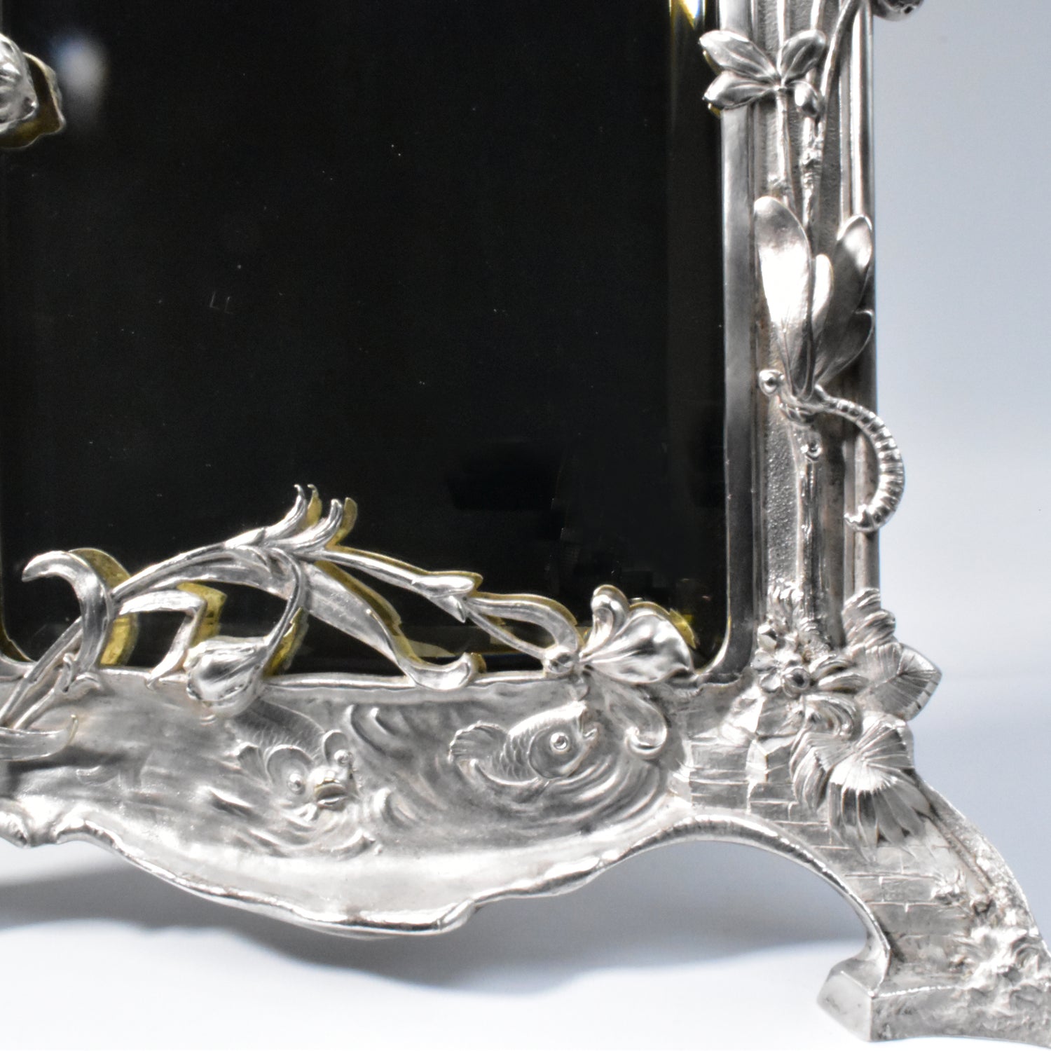 Zwaar verzilverde vroege messingbronzen spiegel van WMF. Zeer gedetailleerd uitgevoerde naturalistische tafelspiegel. Gemerkt WMFM. De M verwijst naar Messingbrons. I/O en As verwijzen naar één gram zilver per vierkante centimeter en naar het patina. Om de schoonheid en kwaliteit van deze spiegel te bewonderen moet je gedetailleerd kijken. We zien verfijnd uitgevoerde bloemen, een libelle, een slang en vissen. De vleugels van de libelle en de stengels en blaadjes van de bloemen komen los van de achtergrond. adembenemend wat een details, en wat is dit kunstwerk goed geconserveerd.