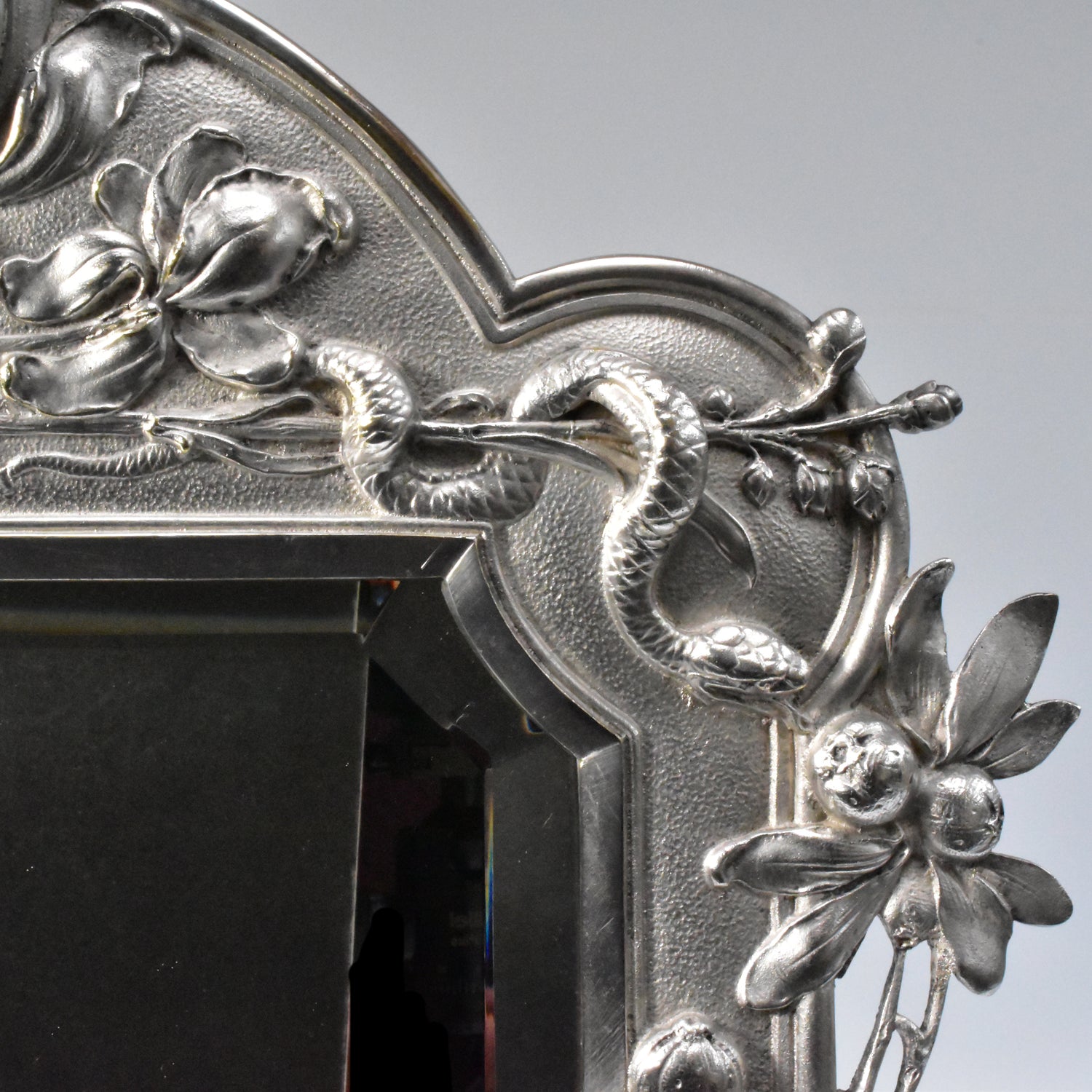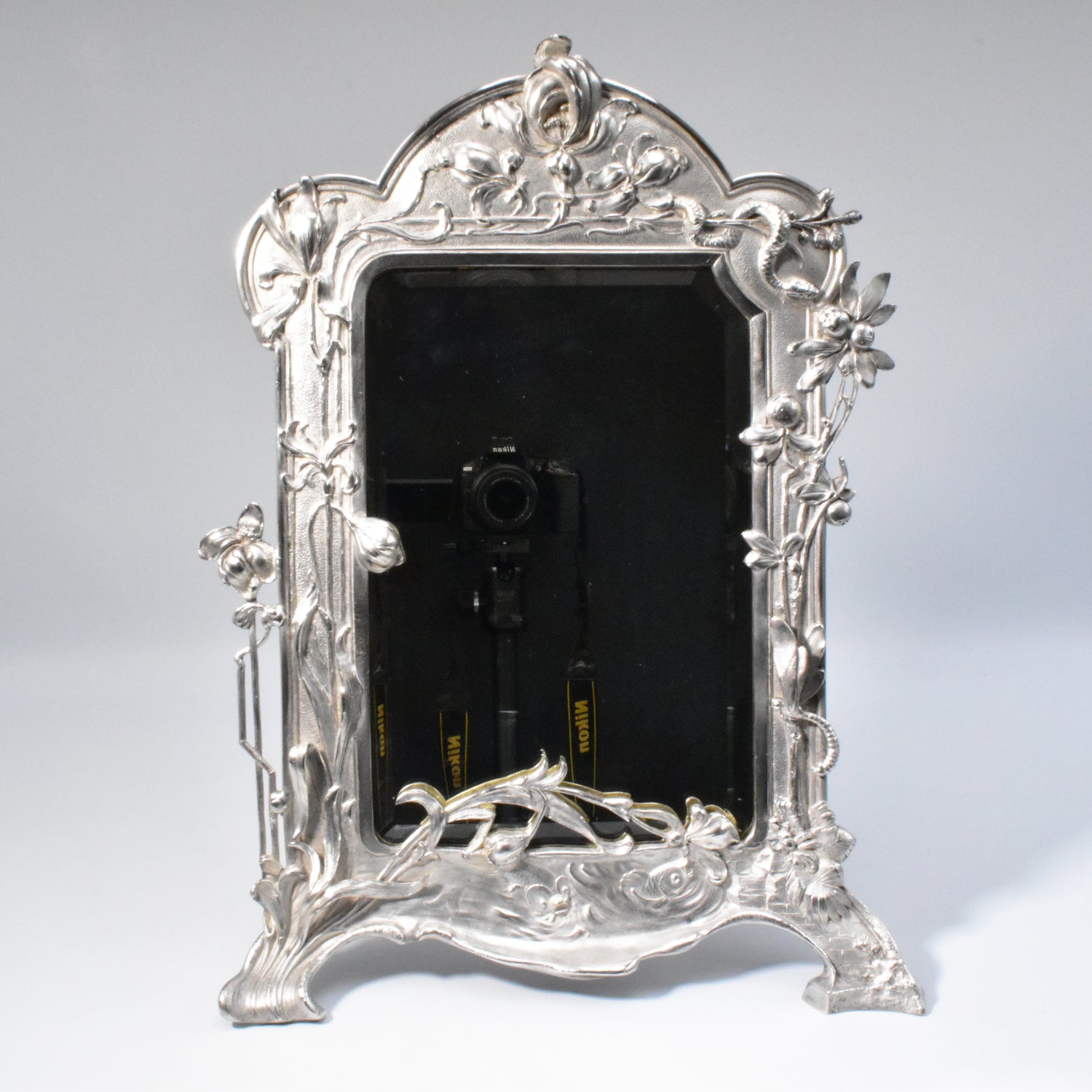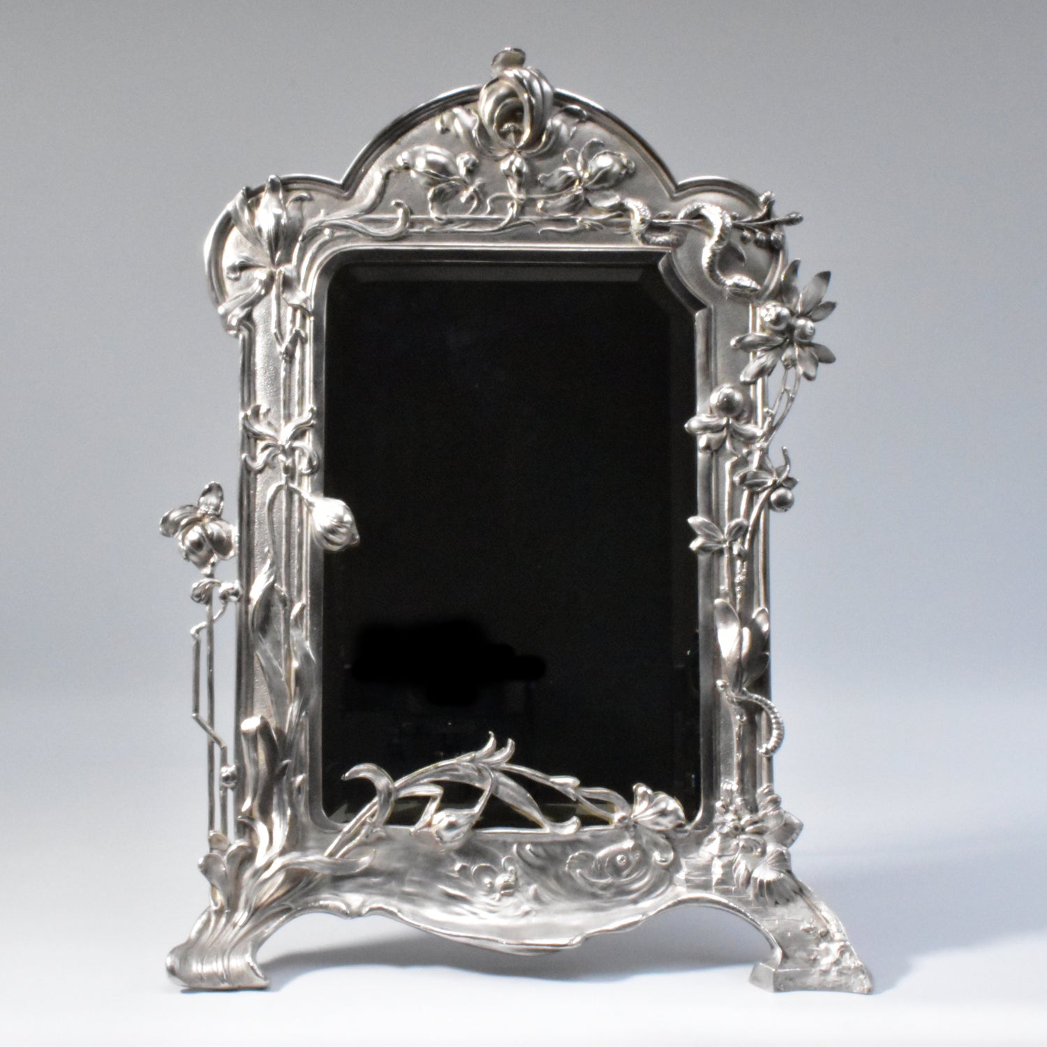 Zwaar verzilverde vroege messingbronzen spiegel van WMF. Zeer gedetailleerd uitgevoerde naturalistische tafelspiegel. Gemerkt WMFM. De M verwijst naar Messingbrons. I/O en As verwijzen naar één gram zilver per vierkante centimeter en naar het patina. Om de schoonheid en kwaliteit van deze spiegel te bewonderen moet je gedetailleerd kijken. We zien verfijnd uitgevoerde bloemen, een libelle, een slang en vissen. De vleugels van de libelle en de stengels en blaadjes van de bloemen komen los van de achtergrond. adembenemend wat een details, en wat is dit kunstwerk goed geconserveerd.