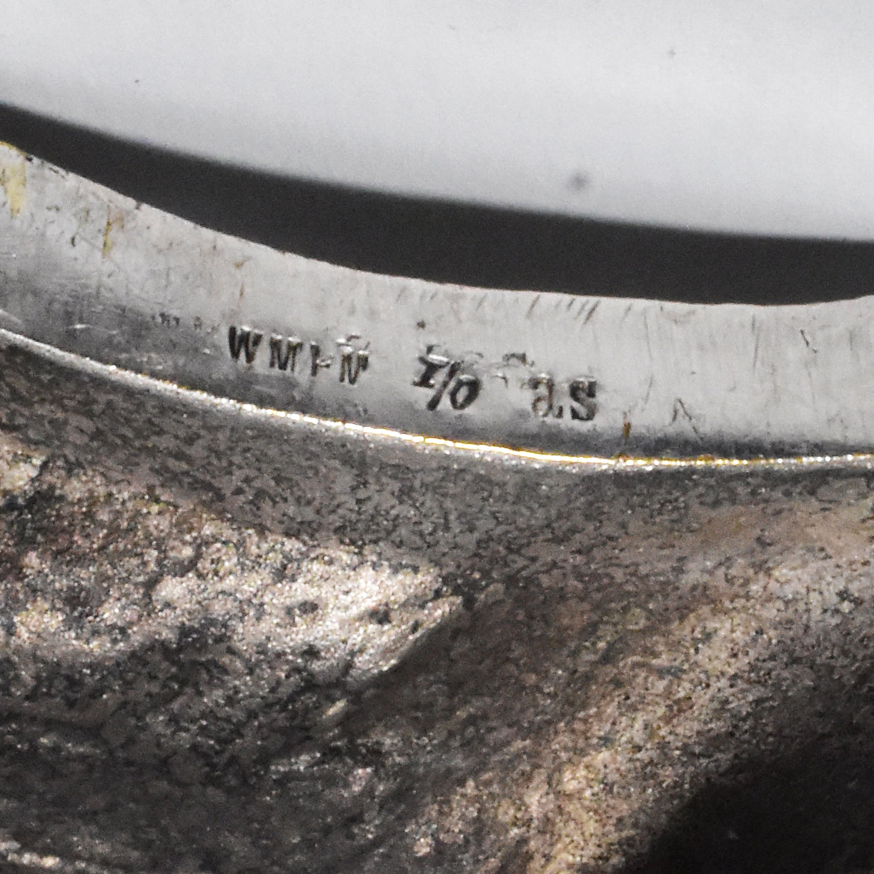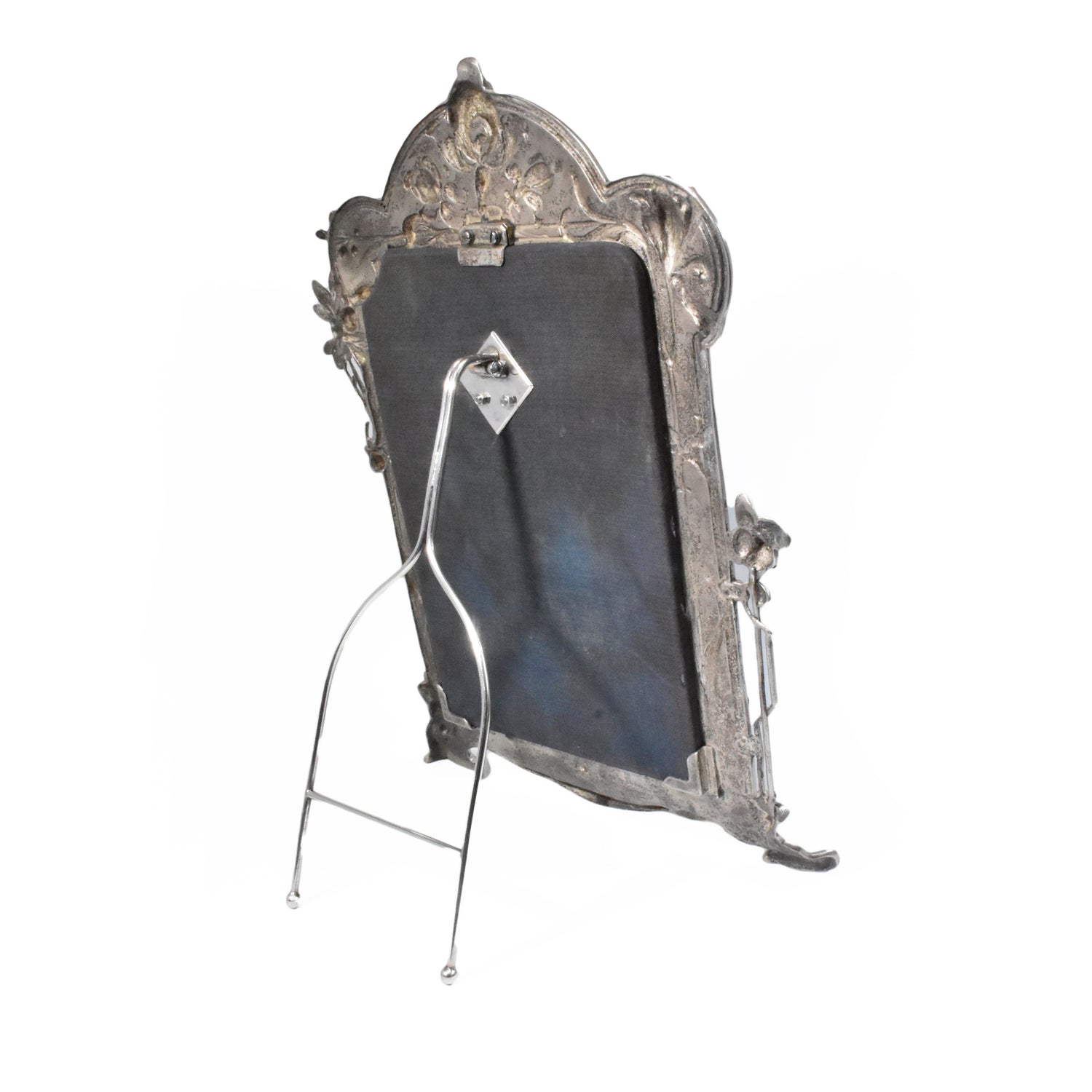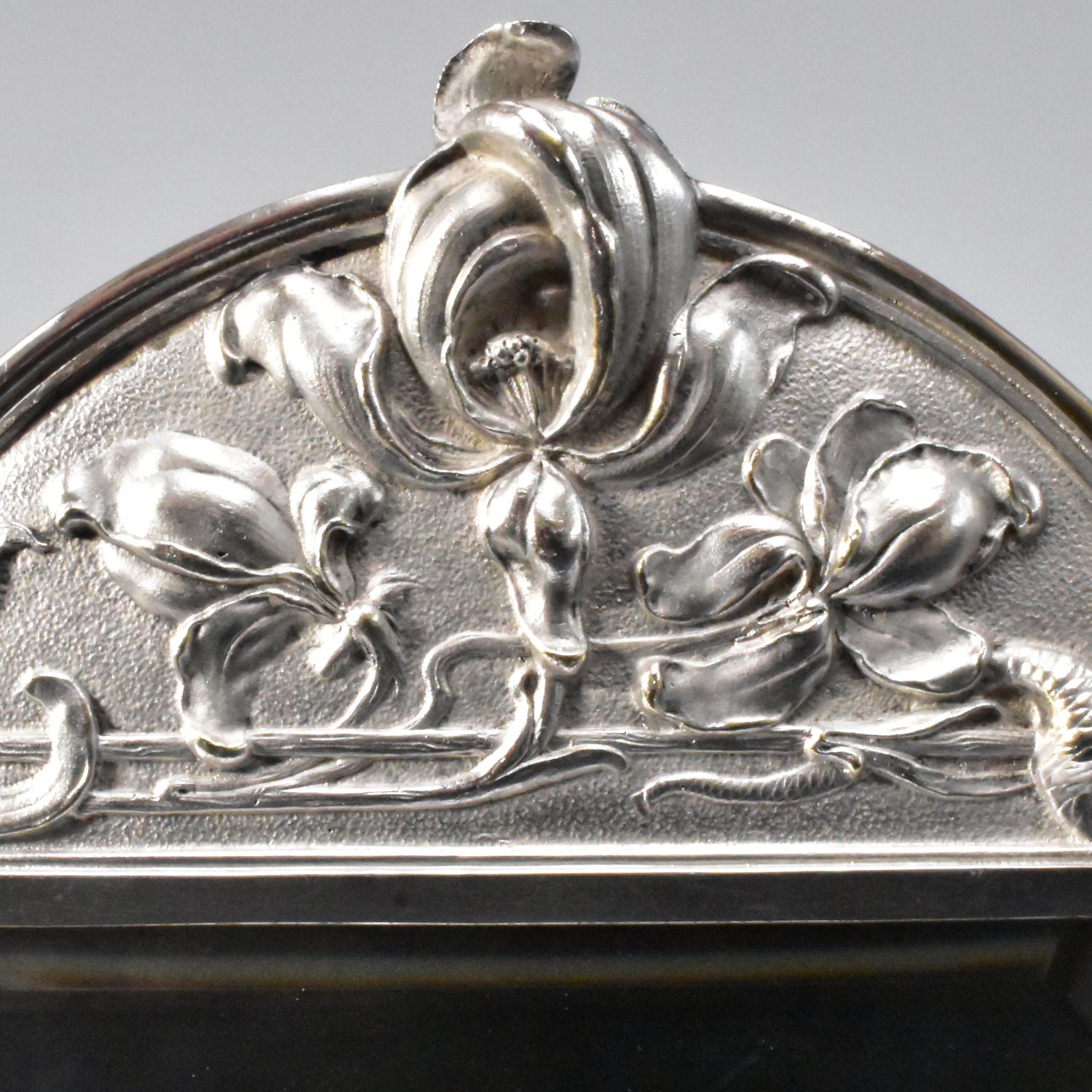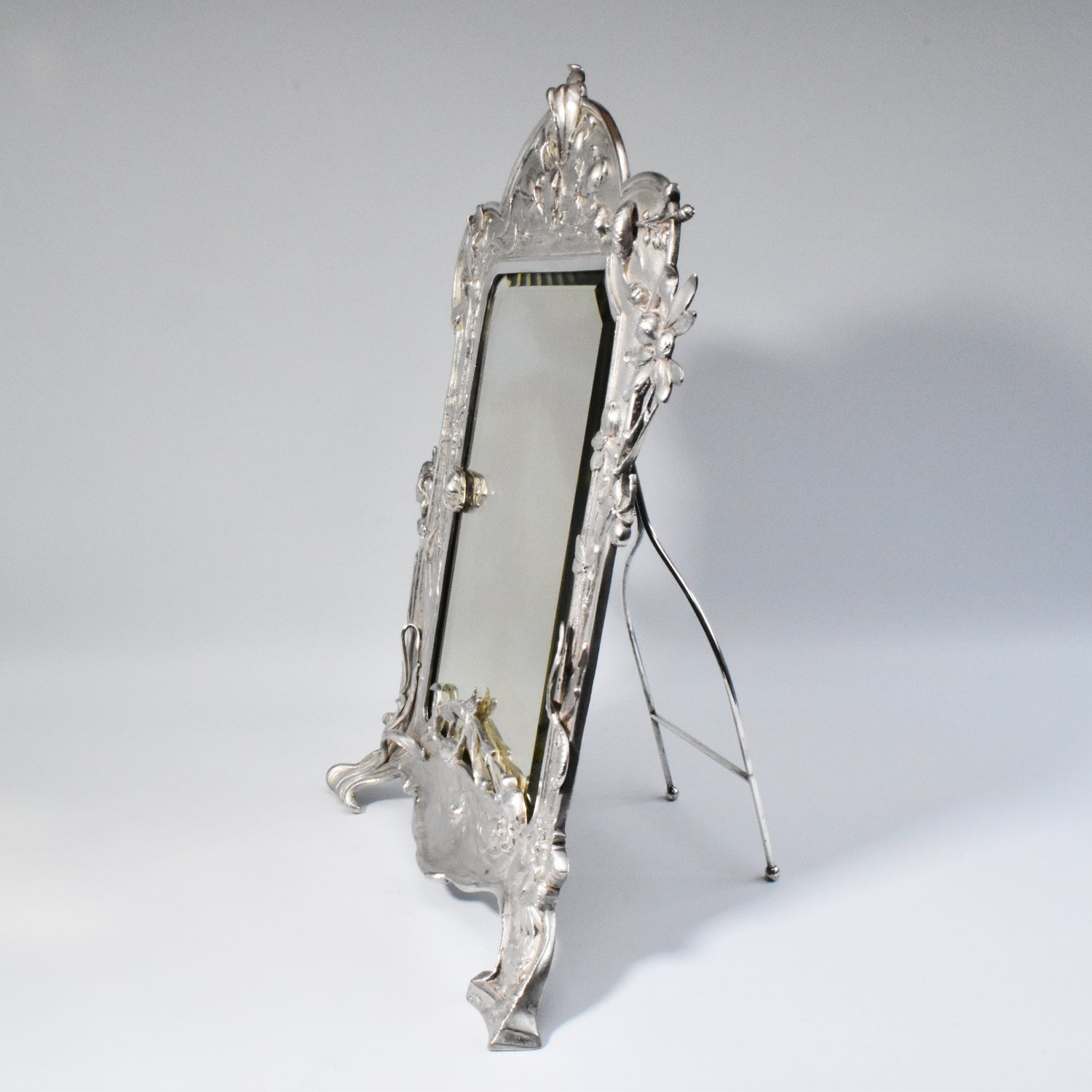 Zwaar verzilverde vroege messingbronzen spiegel van WMF. Zeer gedetailleerd uitgevoerde naturalistische tafelspiegel. Gemerkt WMFM. De M verwijst naar Messingbrons. I/O en As verwijzen naar één gram zilver per vierkante centimeter en naar het patina. Om de schoonheid en kwaliteit van deze spiegel te bewonderen moet je gedetailleerd kijken. We zien verfijnd uitgevoerde bloemen, een libelle, een slang en vissen. De vleugels van de libelle en de stengels en blaadjes van de bloemen komen los van de achtergrond. adembenemend wat een details, en wat is dit kunstwerk goed geconserveerd.