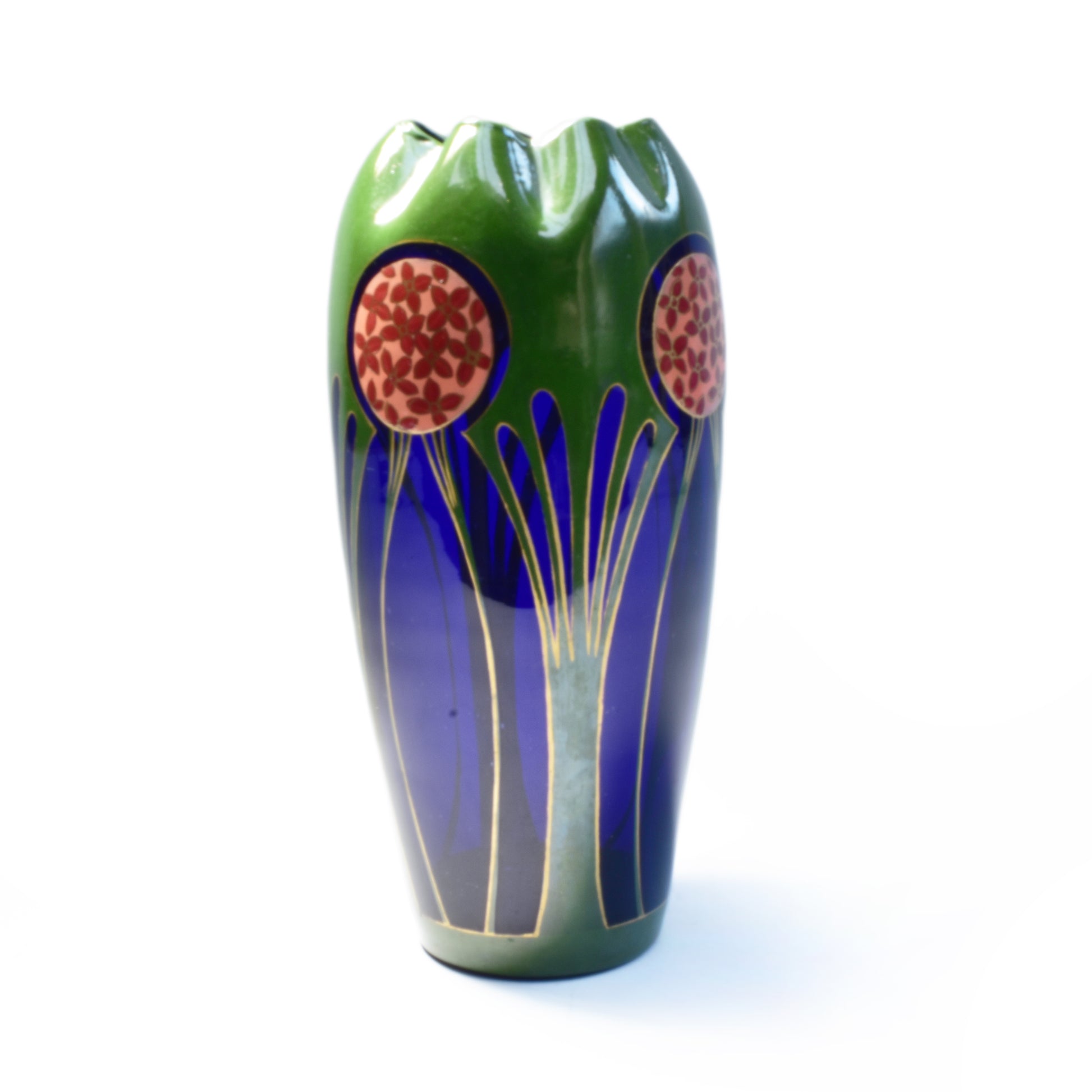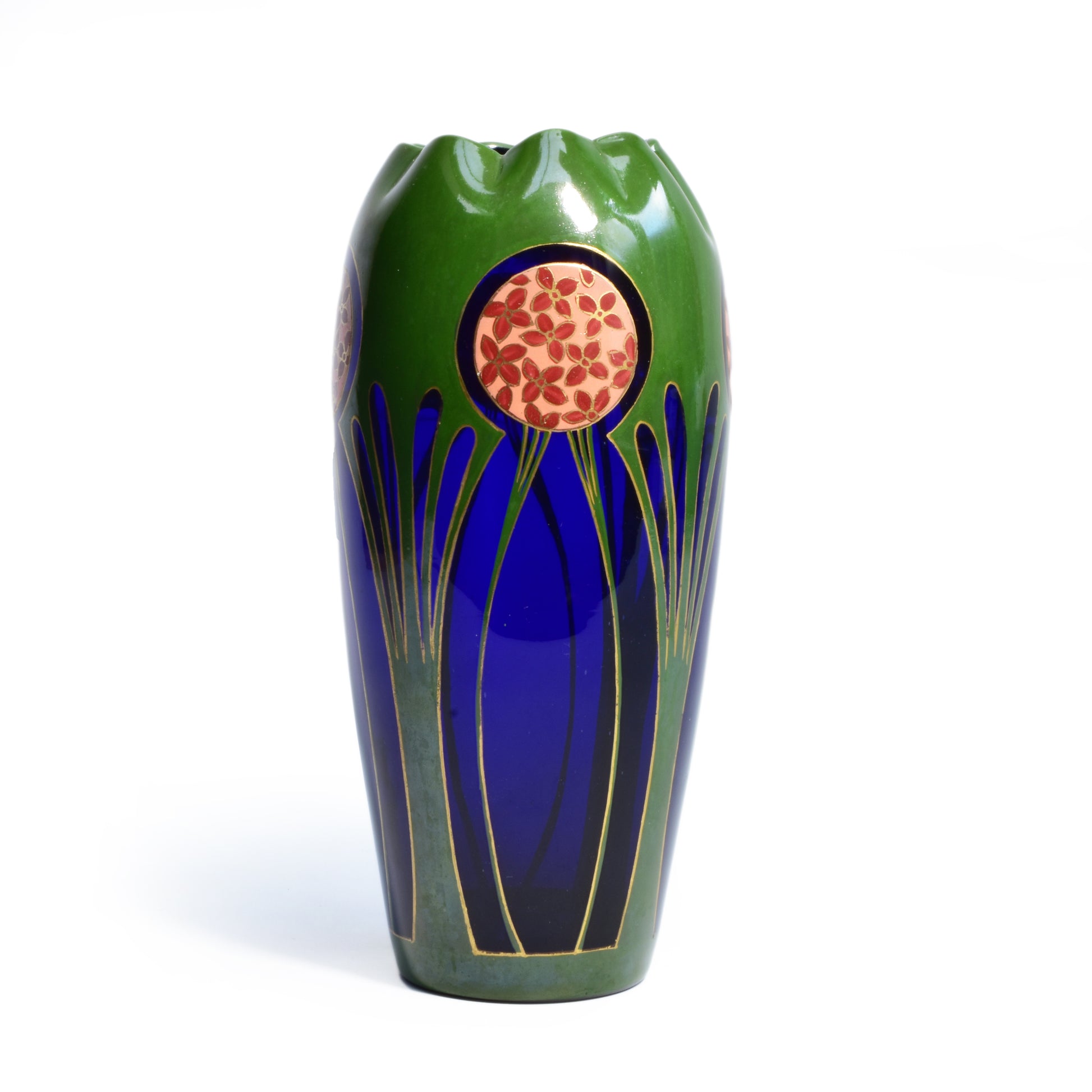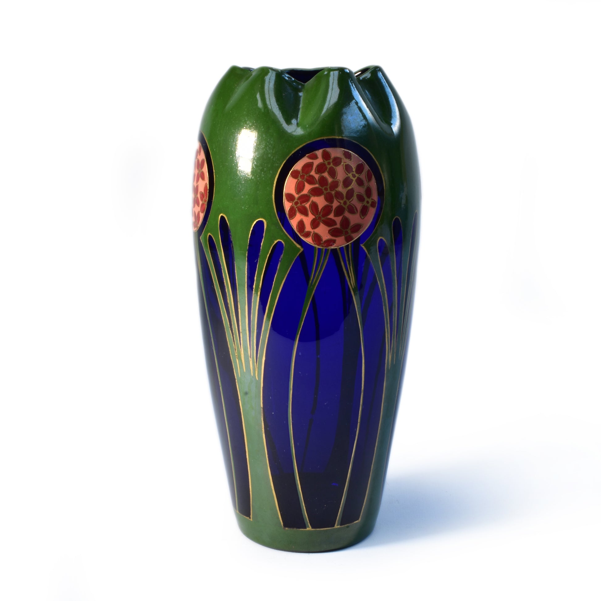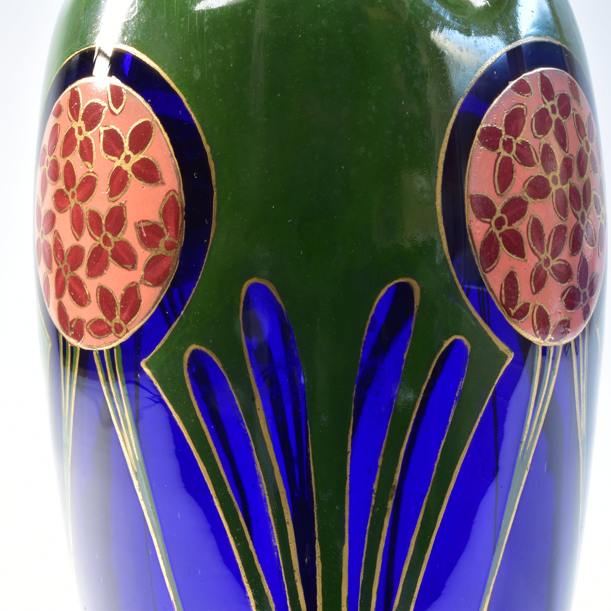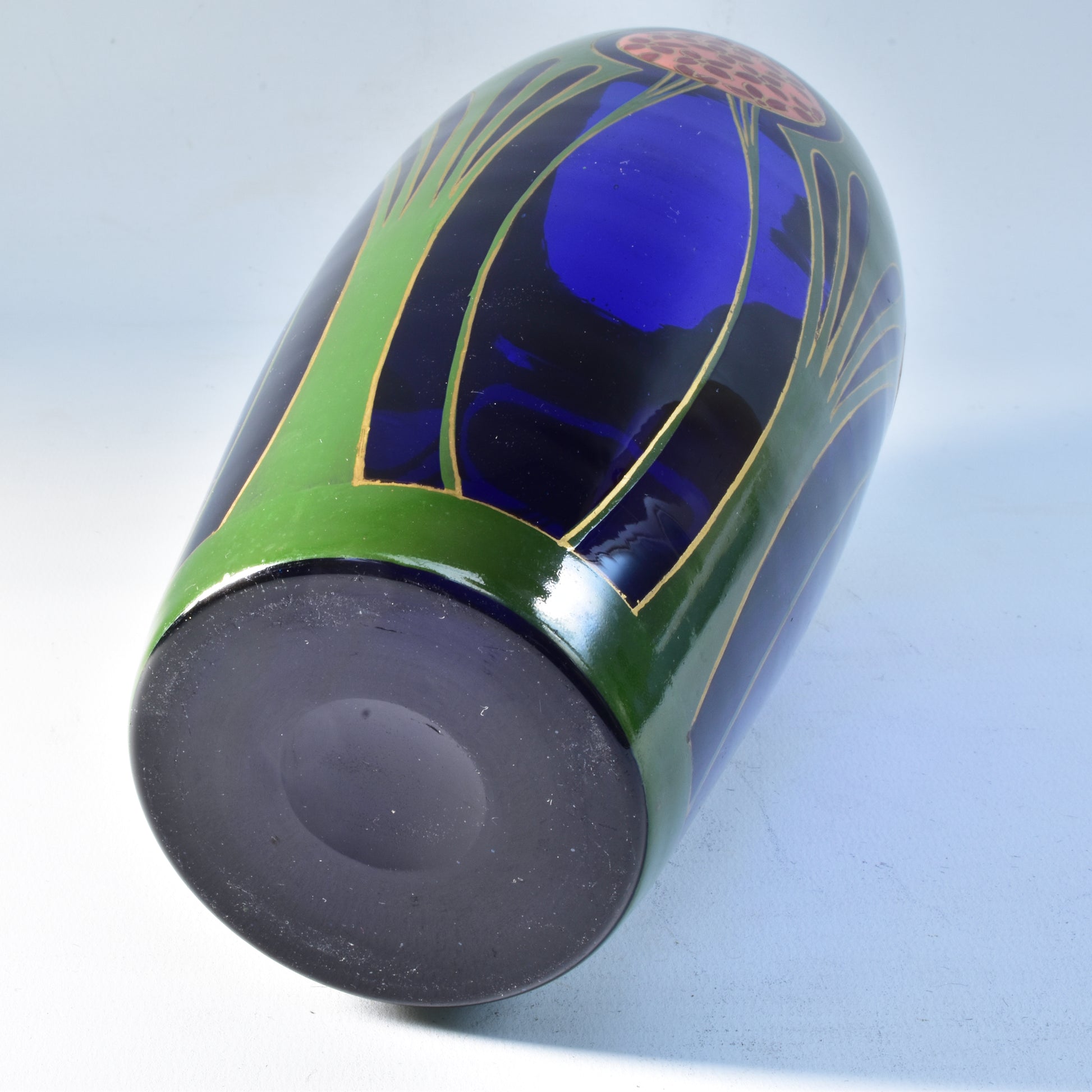 Boheemse glazen geëmailleerde vaas van intens diepblauw glas met emaille beschildering van gestileerde zaadbollen van de paardenbloem. Prachtige kleurstelling. De kleurvlakken zijn met fijne gouden lijntjes van elkaar gescheiden. De gevouwen geplooide hals sugereert op een gestileerde manier de gekartelde bladeren van de paardebloem. Ten tijde van het grote Oostenrijkse rijk bevonden zich in Bohemen talloze glasateliers, waar op een ambachtelijke manier kwaliteits glas-producten werden gemaakt. Het design van dit stuk verraadt de betrokkenheid van een goede kunstenaar. Maar helaas is het stuk anoniem, wat dan weer wel gunstig is voor de prijs.
