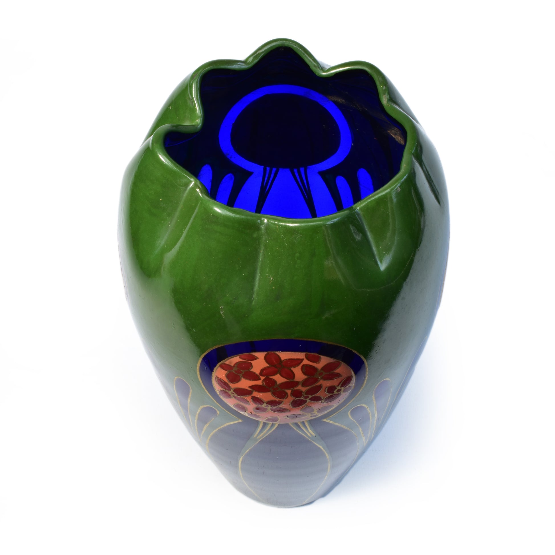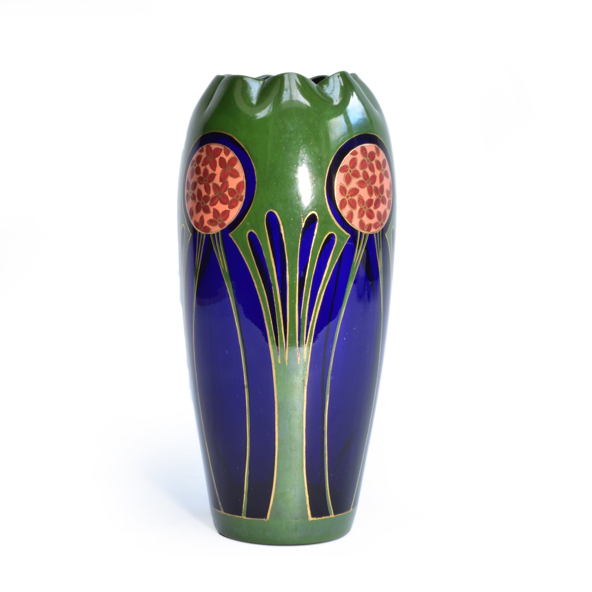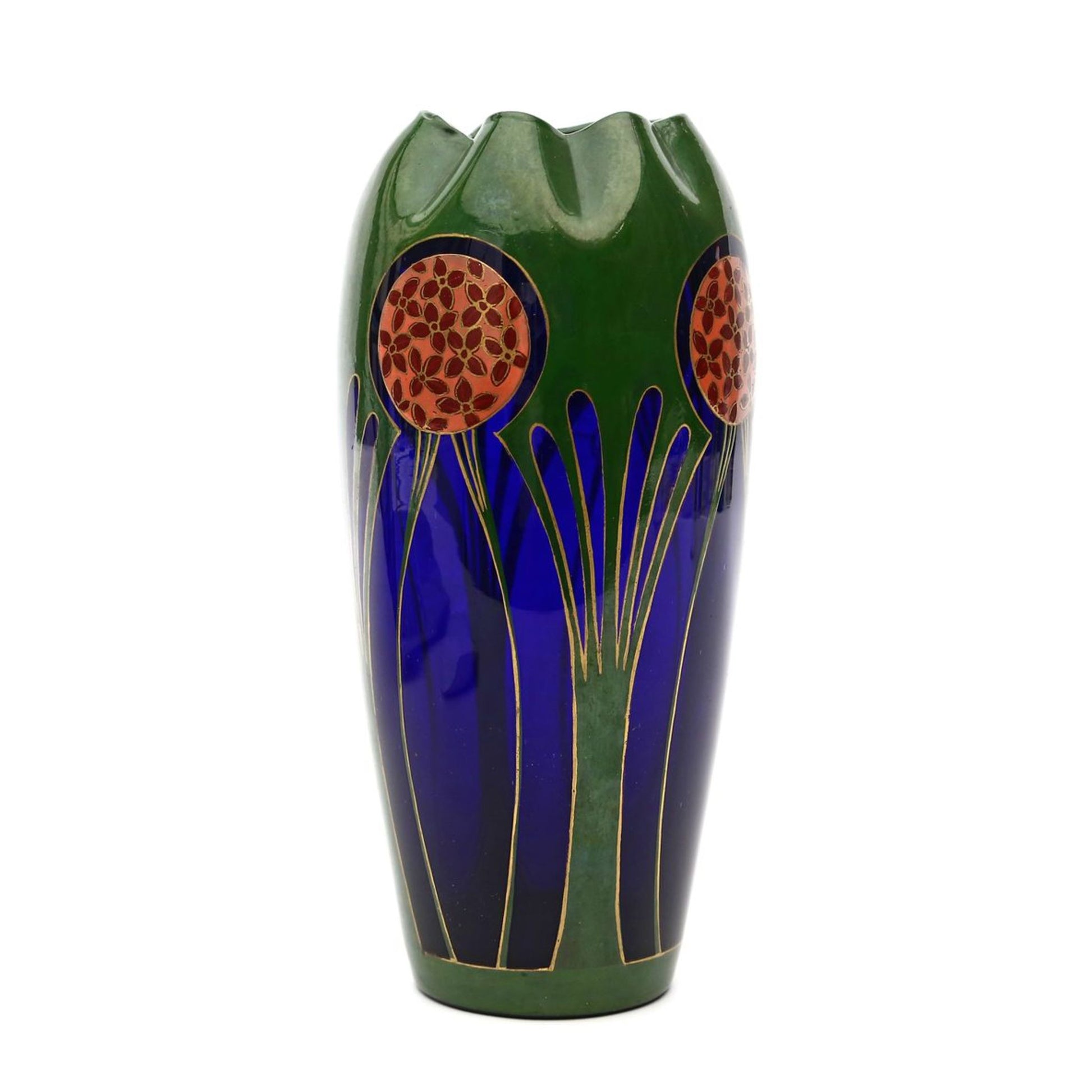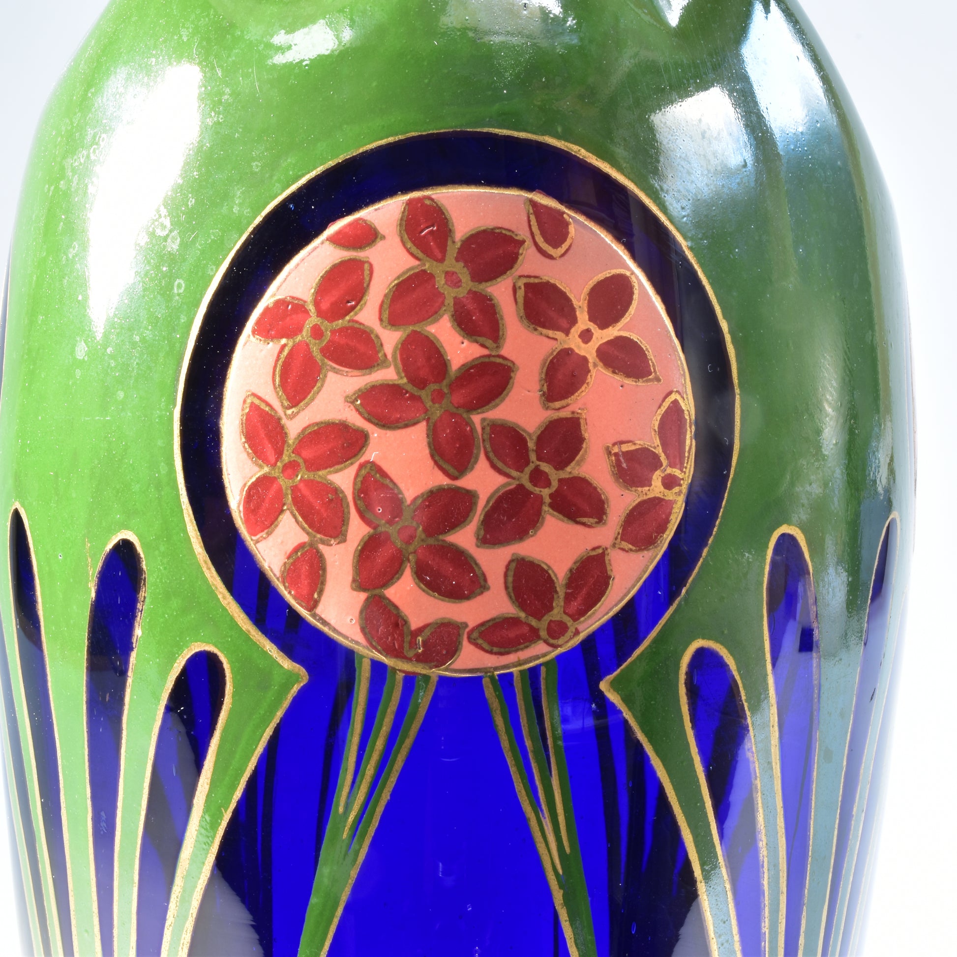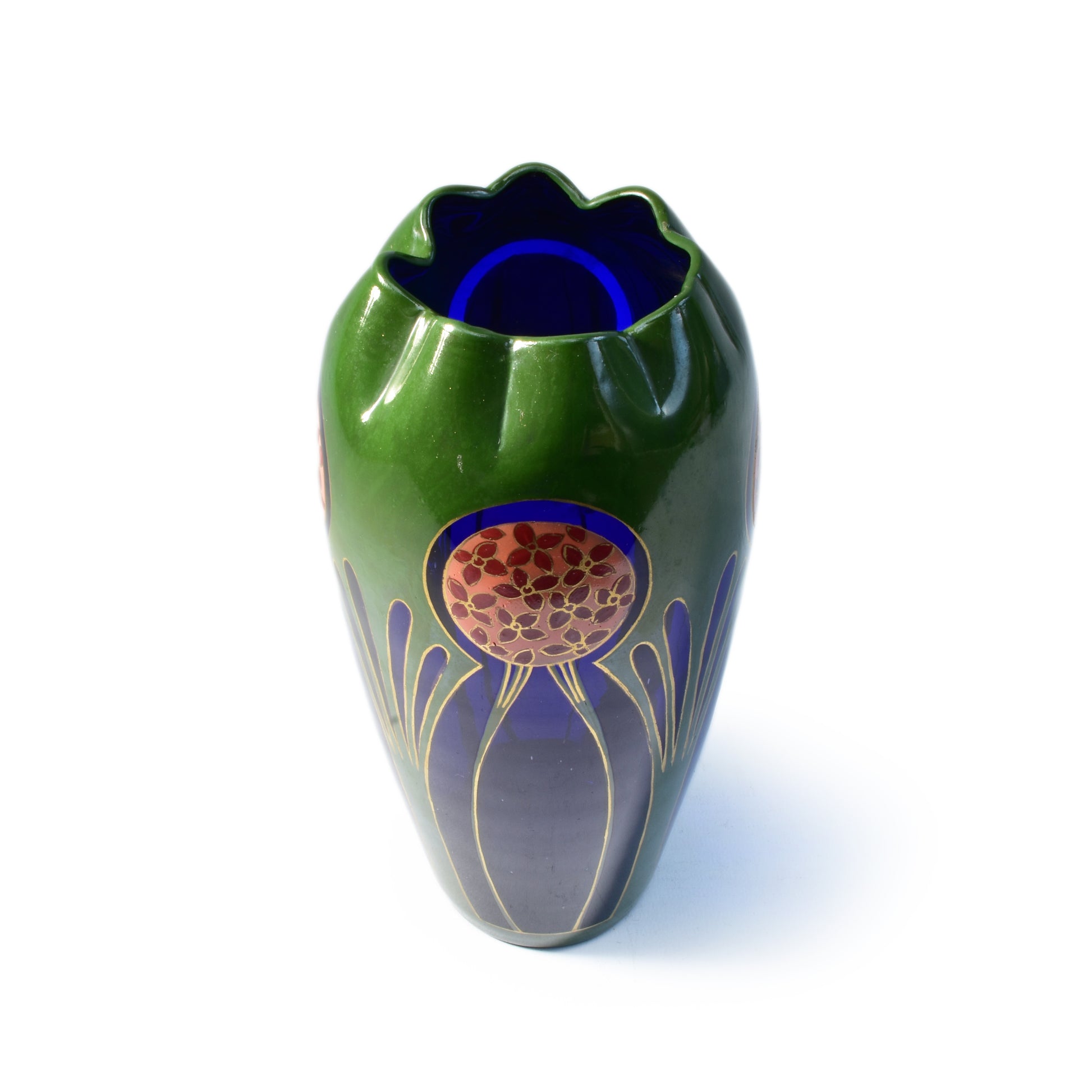 Boheemse glazen geëmailleerde vaas van intens diepblauw glas met emaille beschildering van gestileerde zaadbollen van de paardenbloem. Prachtige kleurstelling. De kleurvlakken zijn met fijne gouden lijntjes van elkaar gescheiden. De gevouwen geplooide hals sugereert op een gestileerde manier de gekartelde bladeren van de paardebloem. Ten tijde van het grote Oostenrijkse rijk bevonden zich in Bohemen talloze glasateliers, waar op een ambachtelijke manier kwaliteits glas-producten werden gemaakt. Het design van dit stuk verraadt de betrokkenheid van een goede kunstenaar. Maar helaas is het stuk anoniem, wat dan weer wel gunstig is voor de prijs.