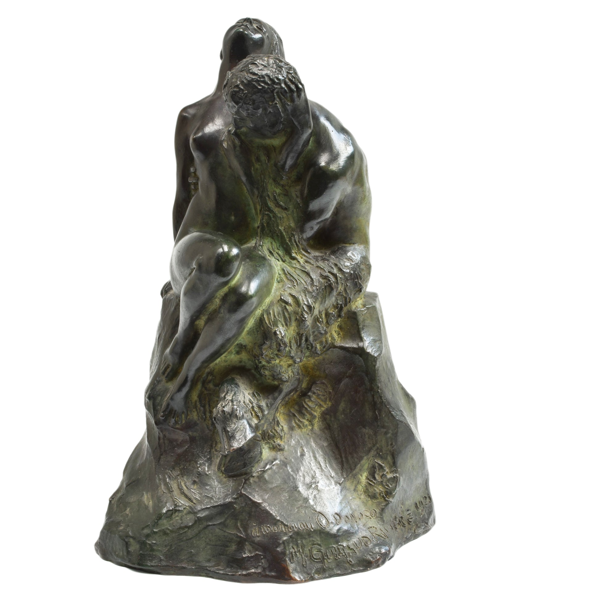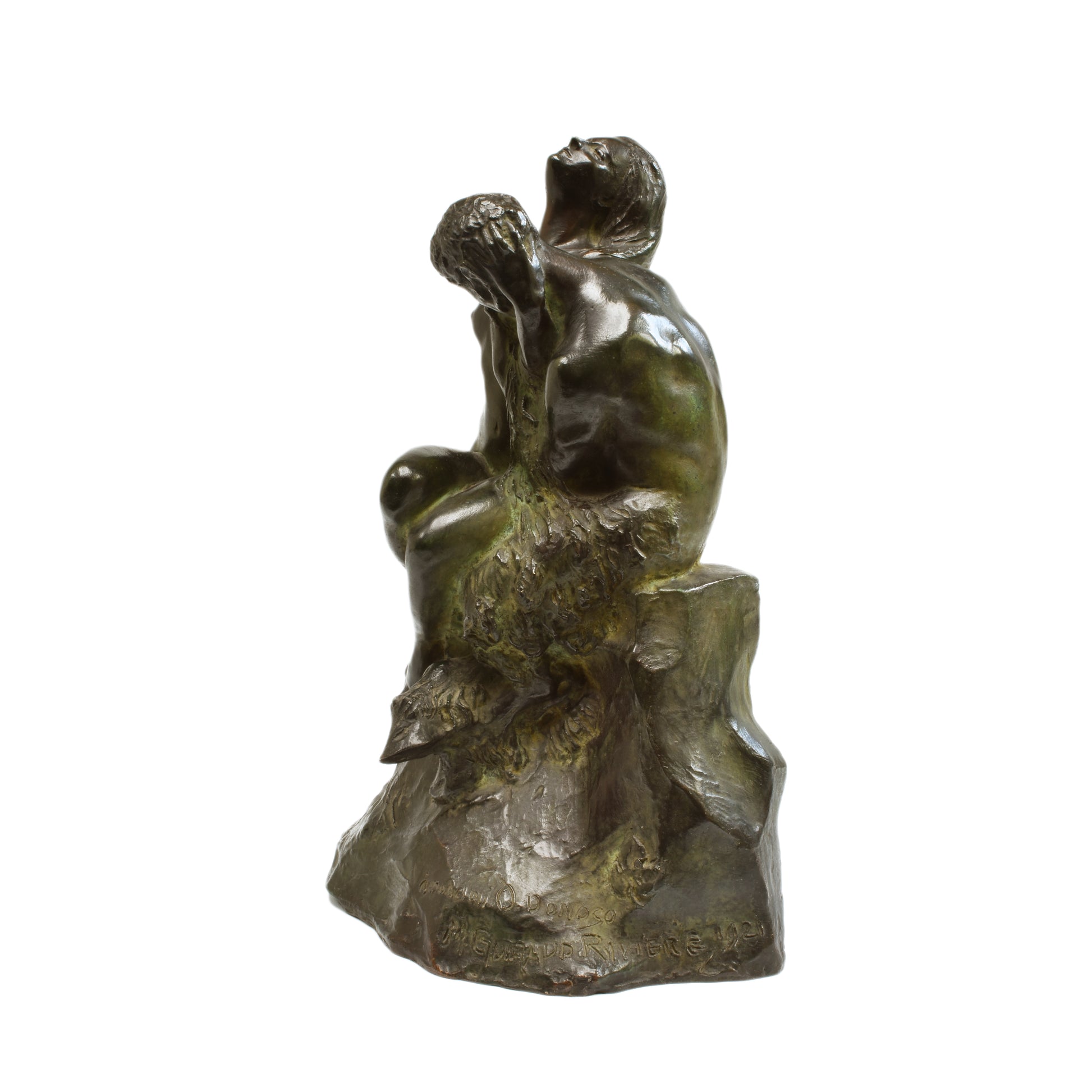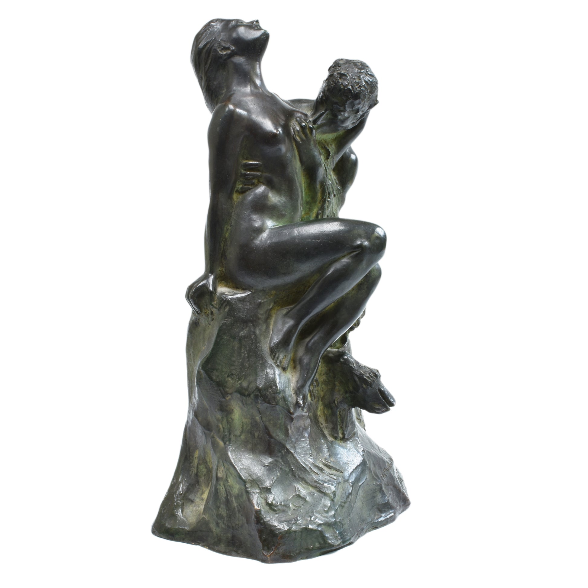 Deze sater en nimf laten zich door de toeschouwer niet afleiden. Daarvoor is hun liefdesspel te intens, ze genieten van elkaar en van hun eigen genot. Dit prachtig gepatineerde bronzen beeld is door Guiraud Rivière van een opdracht voorzien; A mon ami O.Donoso, en gedateerd 1921. Het beeld is cire perdue gegoten bij Montagutelli in Parijs, die ook beelden voor Rodin goten, en in 1923 naar Brussel vertrokken.