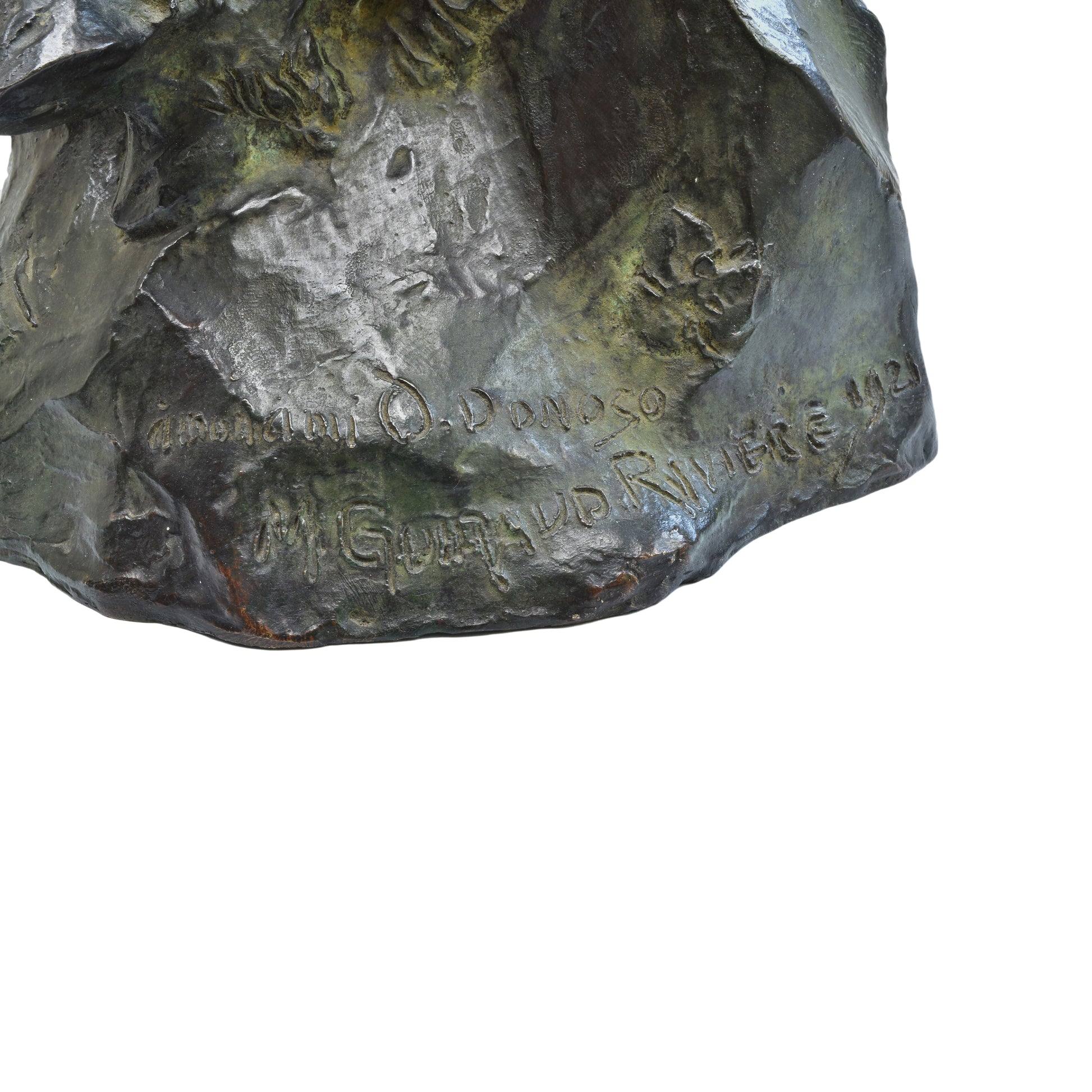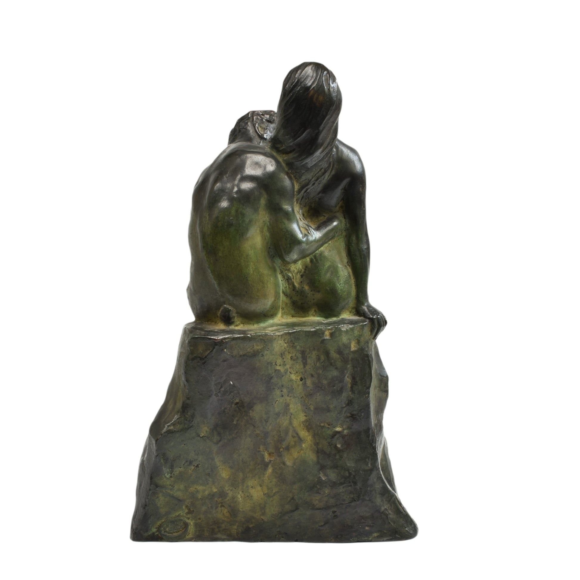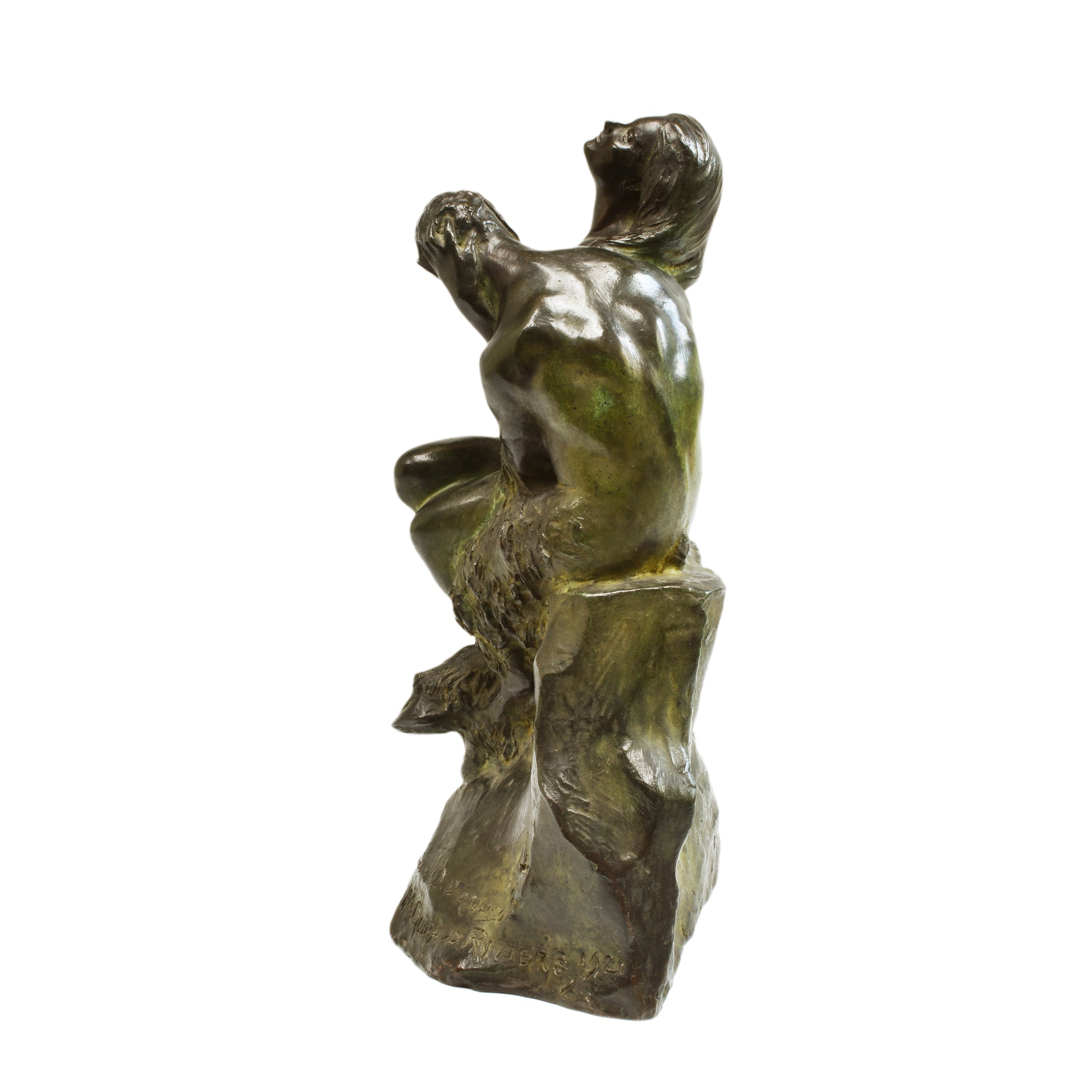 Deze sater en nimf laten zich door de toeschouwer niet afleiden. Daarvoor is hun liefdesspel te intens, ze genieten van elkaar en van hun eigen genot. Dit prachtig gepatineerde bronzen beeld is door Guiraud Rivière van een opdracht voorzien; A mon ami O.Donoso, en gedateerd 1921. Het beeld is cire perdue gegoten bij Montagutelli in Parijs, die ook beelden voor Rodin goten, en in 1923 naar Brussel vertrokken.