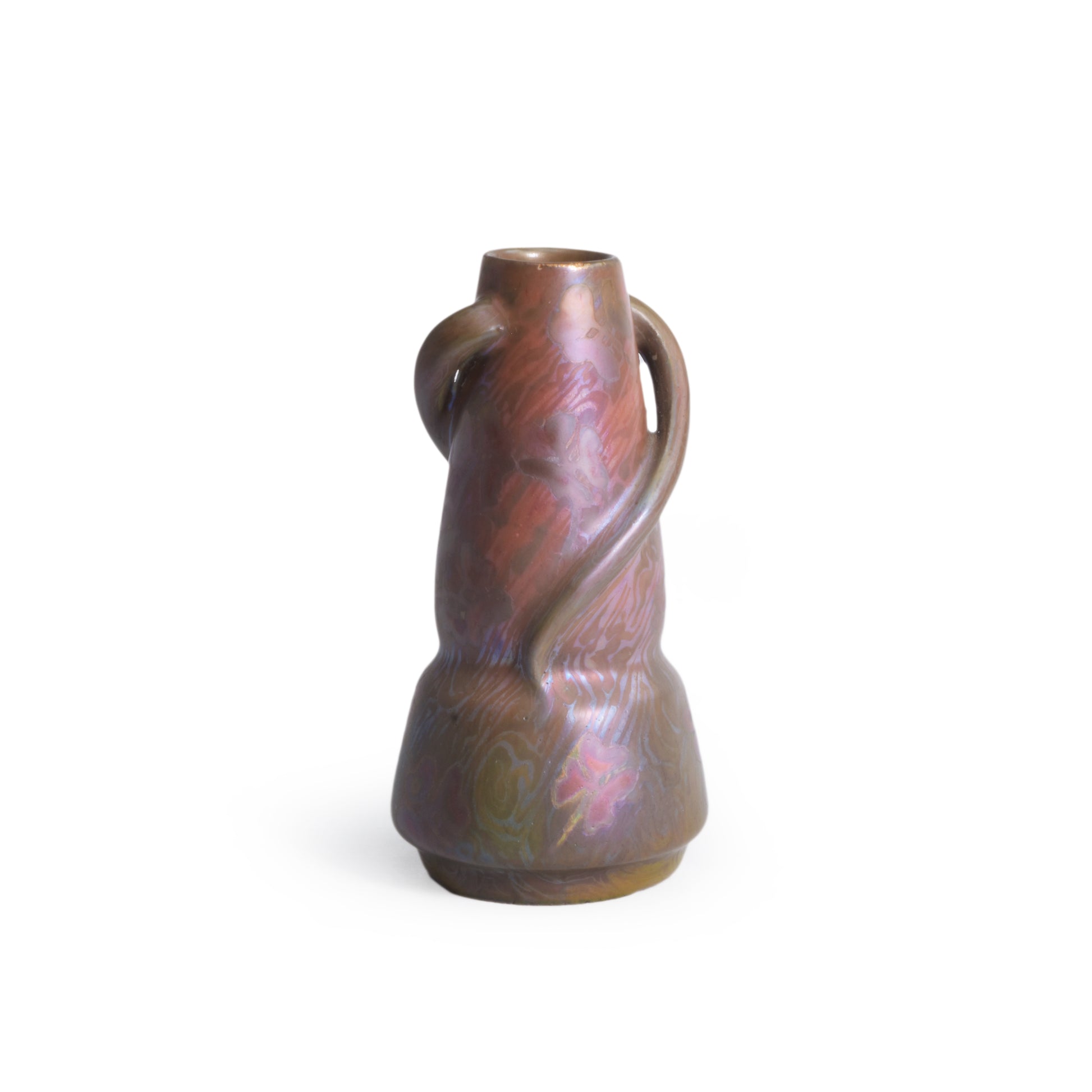 Mooi gevormd miniatuur vaasje van Clement Massier. Slangvormige oren. Decoratie van klaver in violet kleuren. De beweging van de slangen wordt voortgezet in de beweging van het decor. De lustrerende kleuren zijn mat, en geven het kunstwerkje een zachte uitstraling.