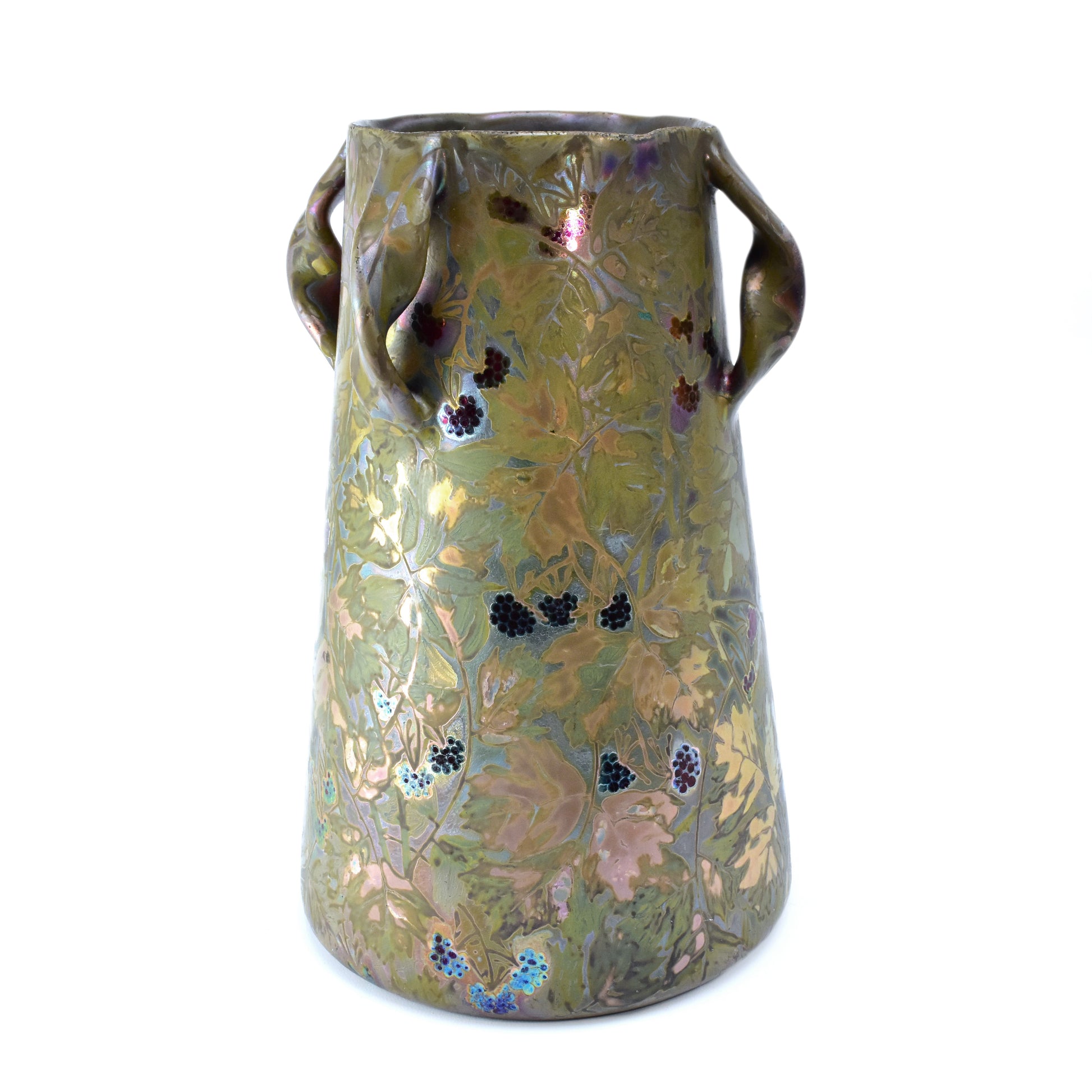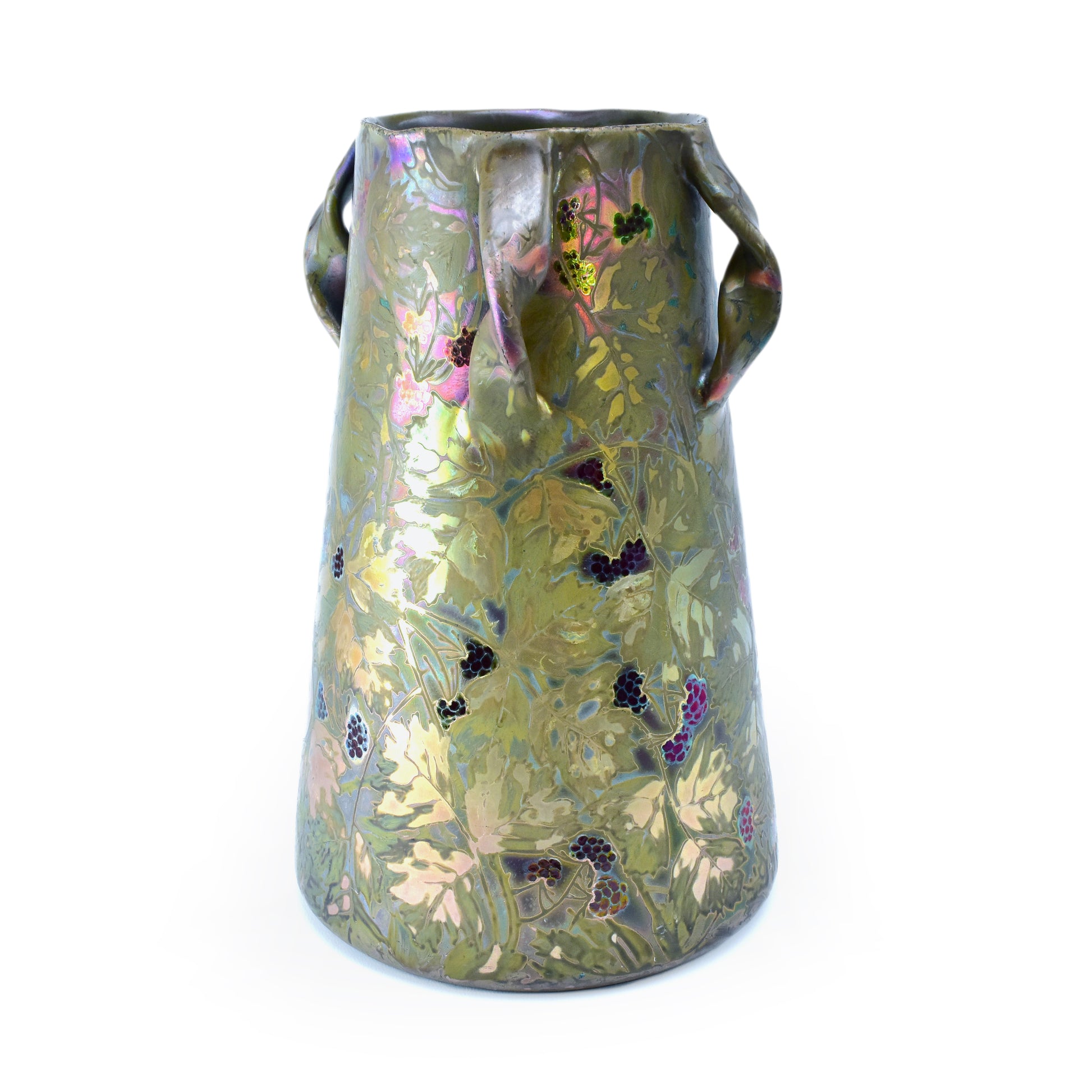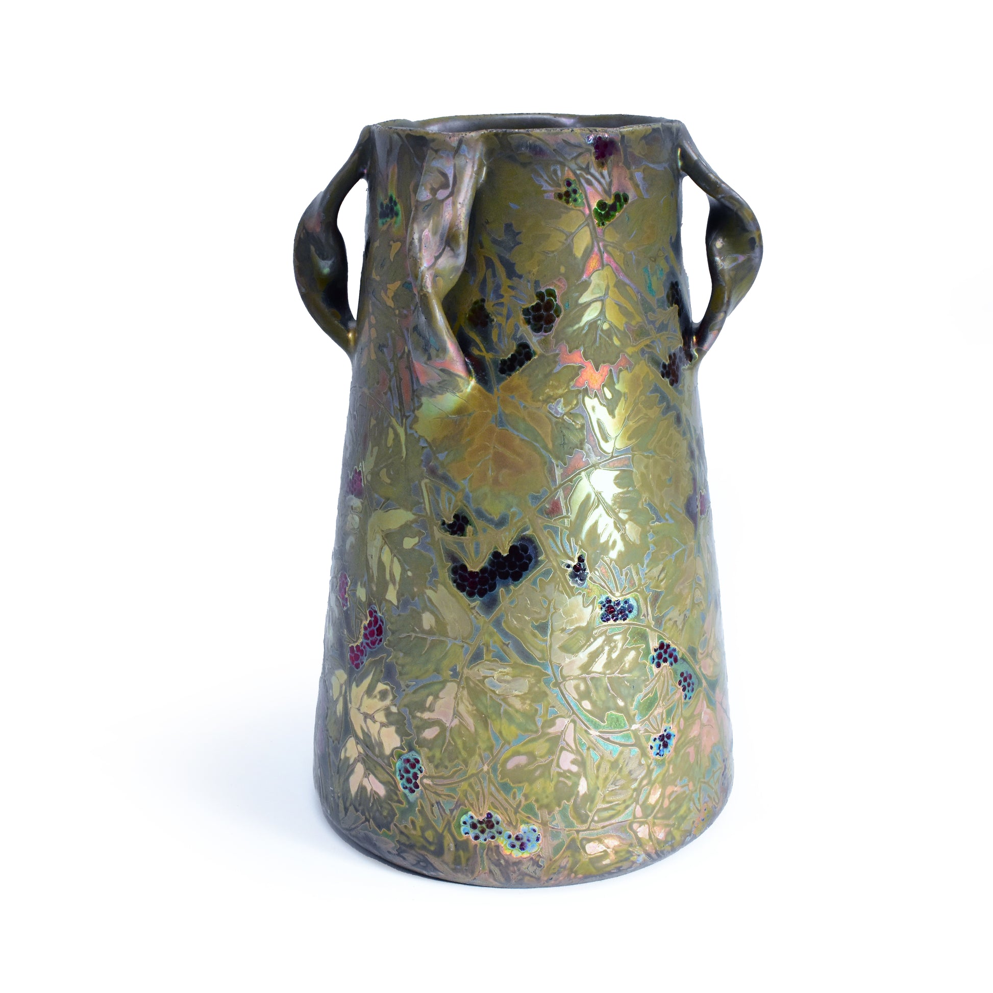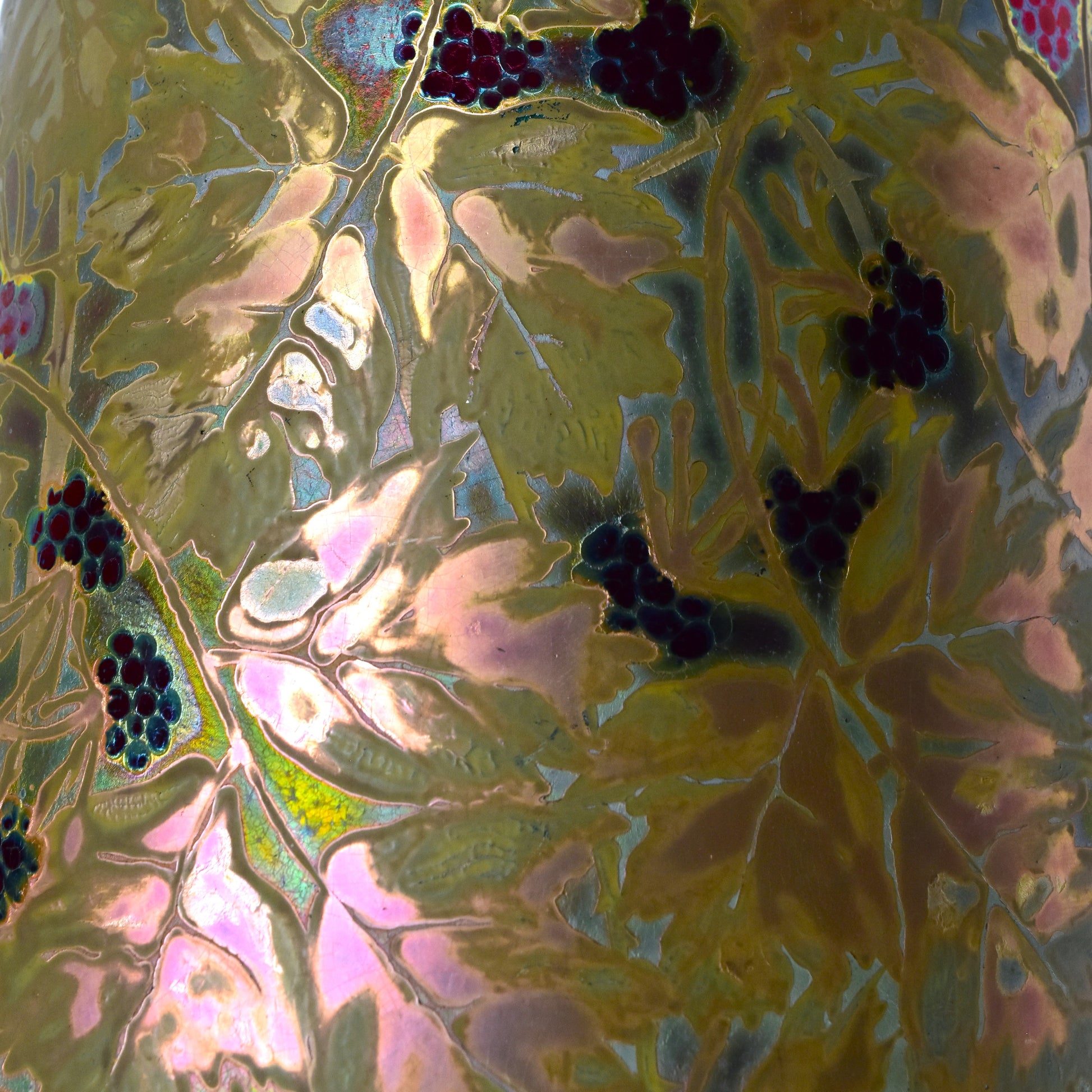 Grote vaas van Clement Massier uit het jaar dat zijn vrouw overleed. Gemerkt met de M van Marie voor zijn naam. Zo weten we dat deze vaas gemaakt is in 1900. De kleuren zijn zacht, maar als het licht er op de juiste manier in weerspiegeld ontstaan de contrasten en zien we alle kleuren van de regenboog. Deze vaas heeft sterke licht-donker en mat-glanzende effecten en een reliëf randje om ieder getekend blaadje, takje, nerf of braambes. Dat zien we alleen bij de beste stukken van Massier.