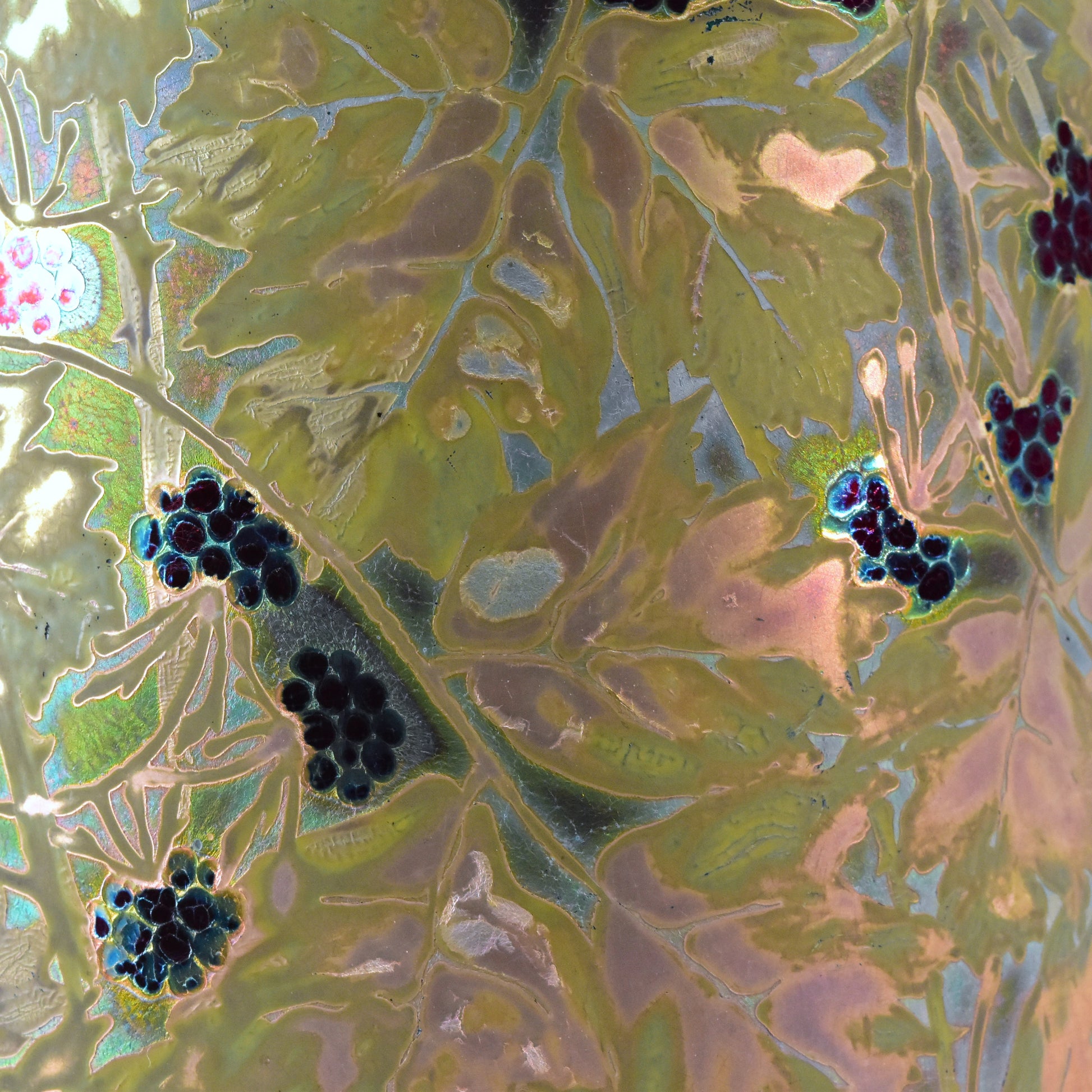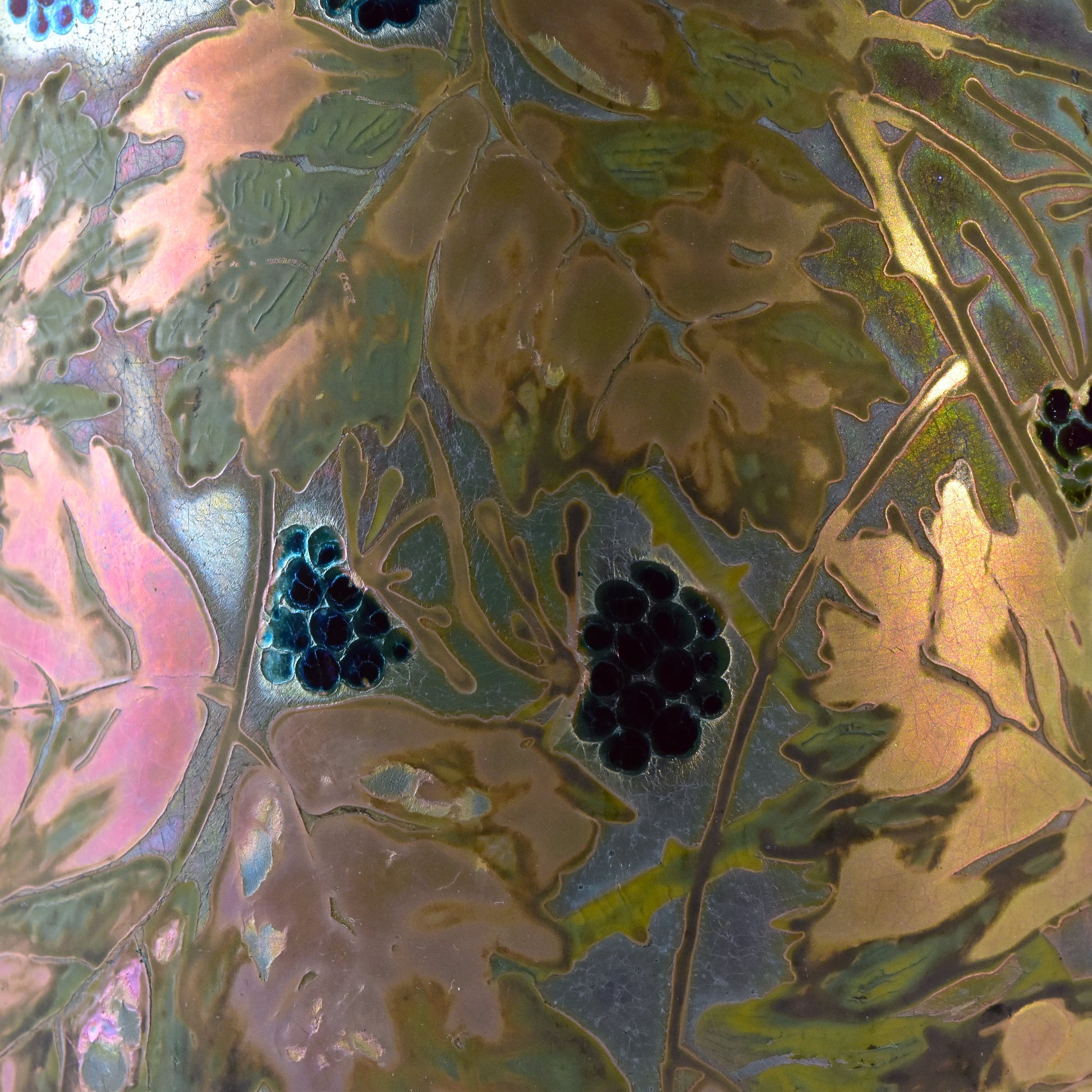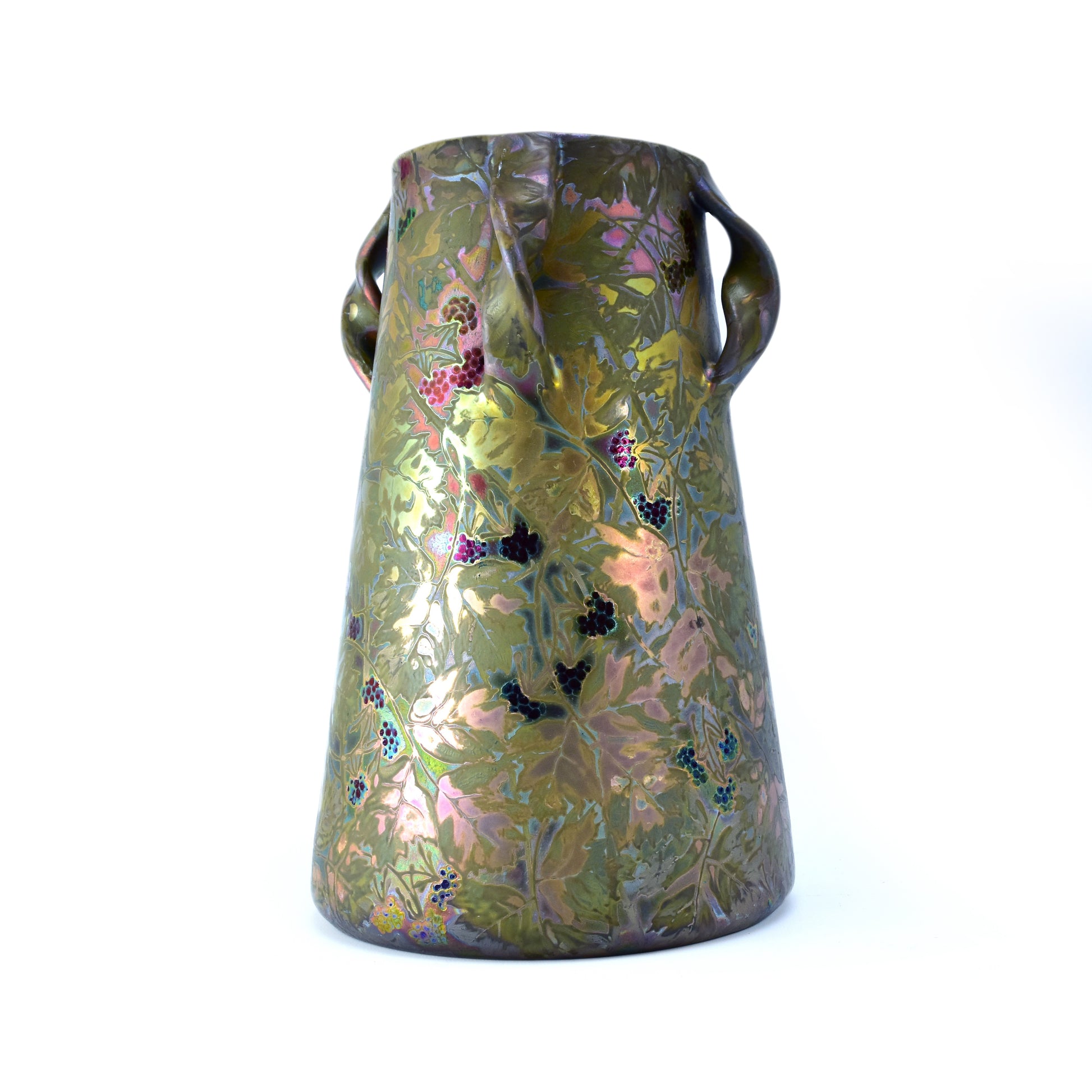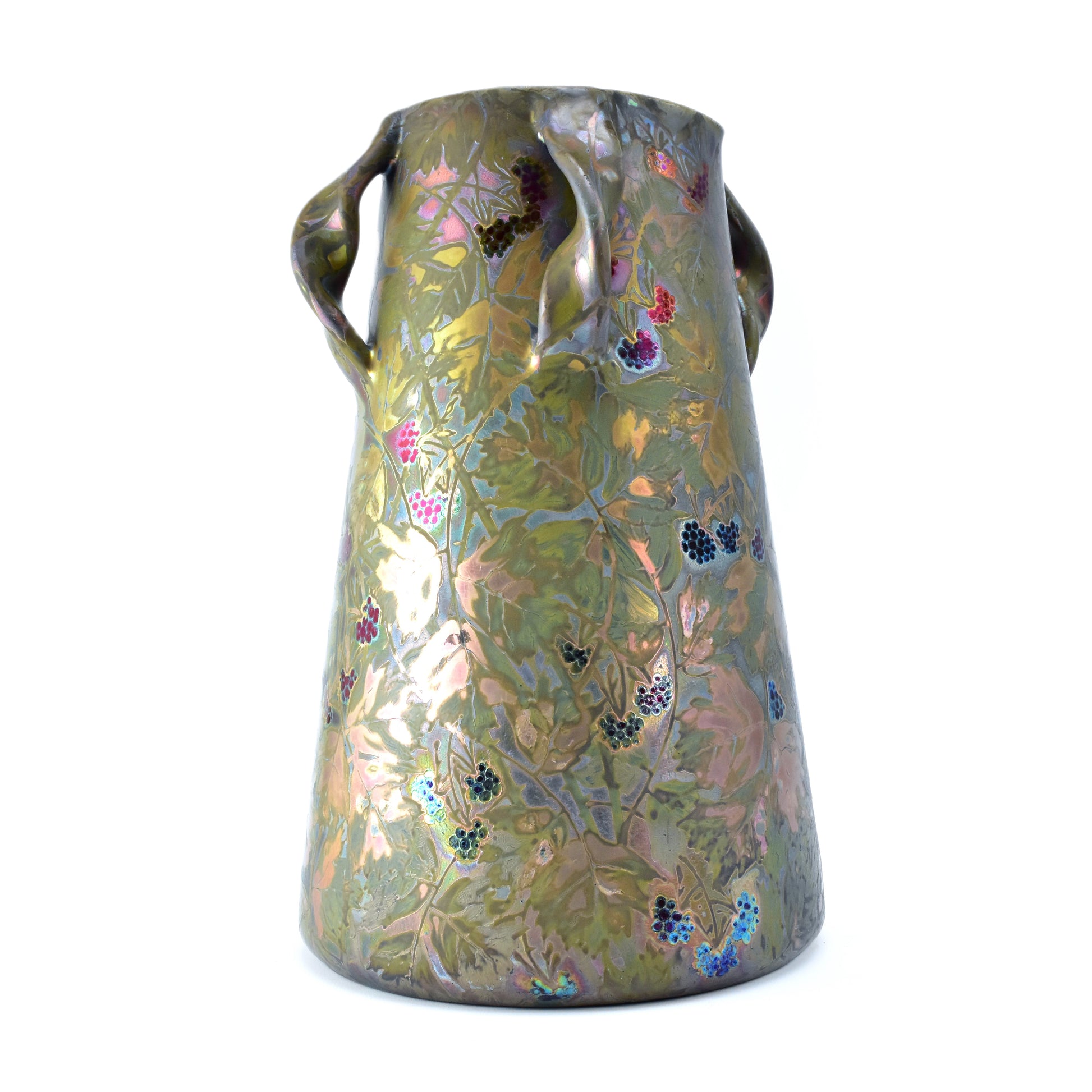 Grote vaas van Clement Massier uit het jaar dat zijn vrouw overleed. Gemerkt met de M van Marie voor zijn naam. Zo weten we dat deze vaas gemaakt is in 1900. De kleuren zijn zacht, maar als het licht er op de juiste manier in weerspiegeld ontstaan de contrasten en zien we alle kleuren van de regenboog. Deze vaas heeft sterke licht-donker en mat-glanzende effecten en een reliëf randje om ieder getekend blaadje, takje, nerf of braambes. Dat zien we alleen bij de beste stukken van Massier.