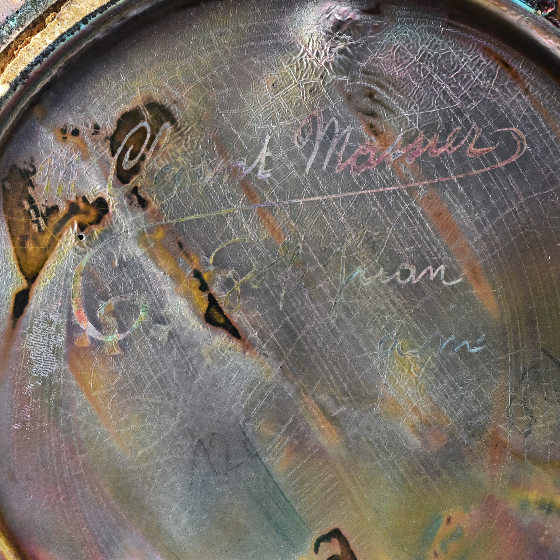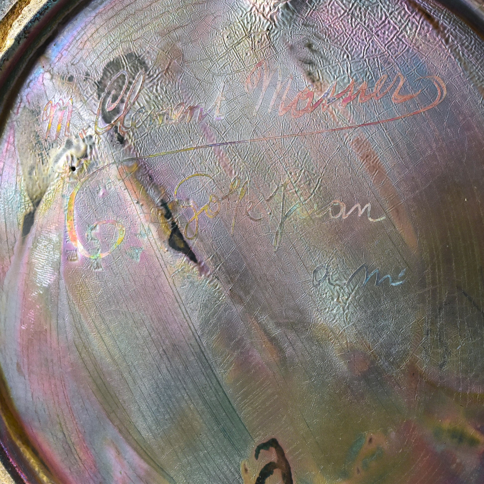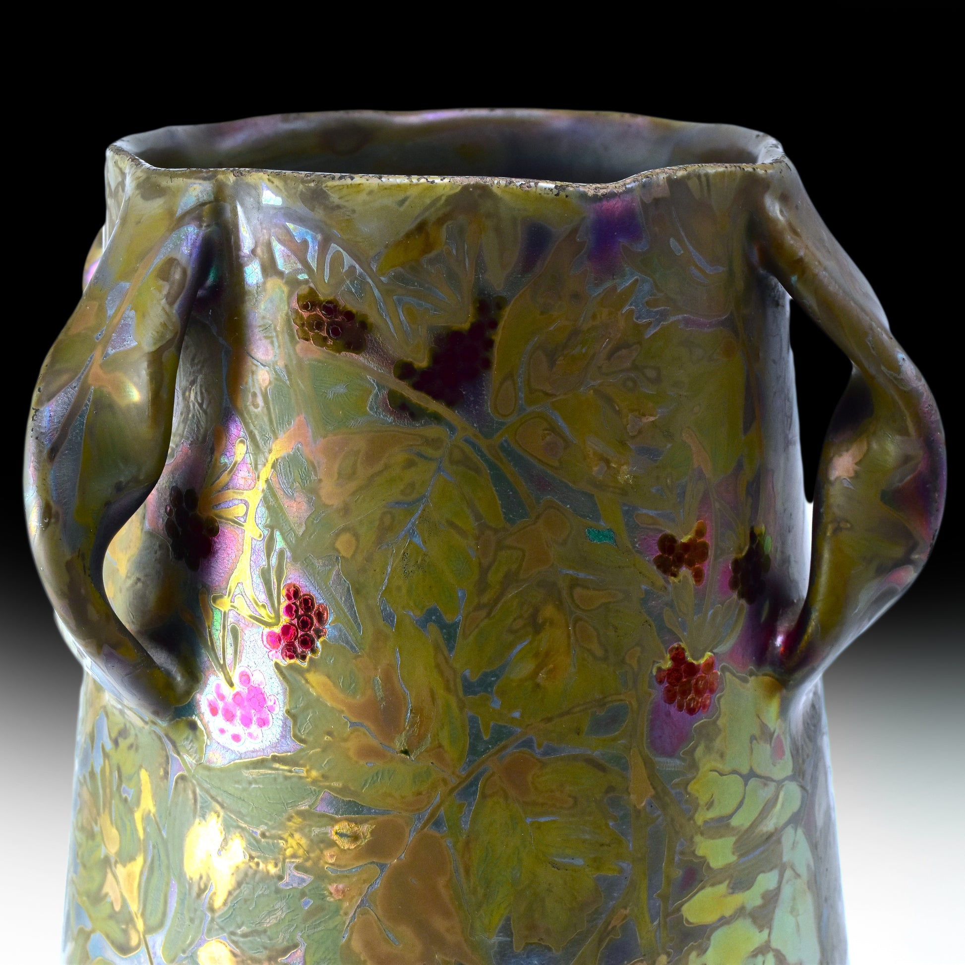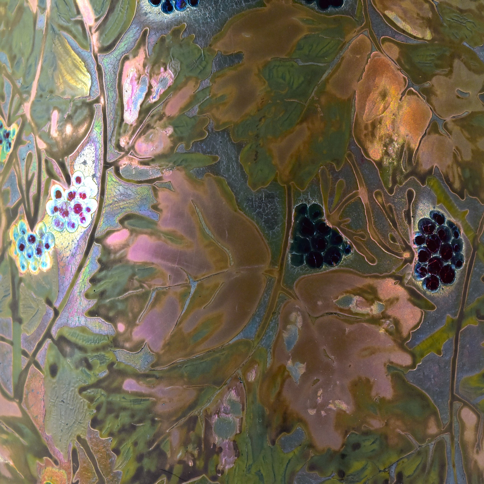 Grote vaas van Clement Massier uit het jaar dat zijn vrouw overleed. Gemerkt met de M van Marie voor zijn naam. Zo weten we dat deze vaas gemaakt is in 1900. De kleuren zijn zacht, maar als het licht er op de juiste manier in weerspiegeld ontstaan de contrasten en zien we alle kleuren van de regenboog. Deze vaas heeft sterke licht-donker en mat-glanzende effecten en een reliëf randje om ieder getekend blaadje, takje, nerf of braambes. Dat zien we alleen bij de beste stukken van Massier.