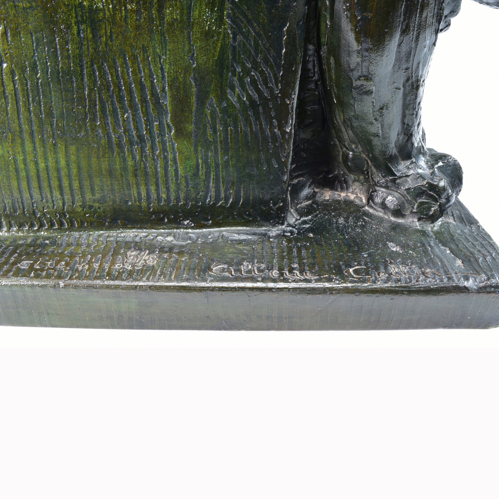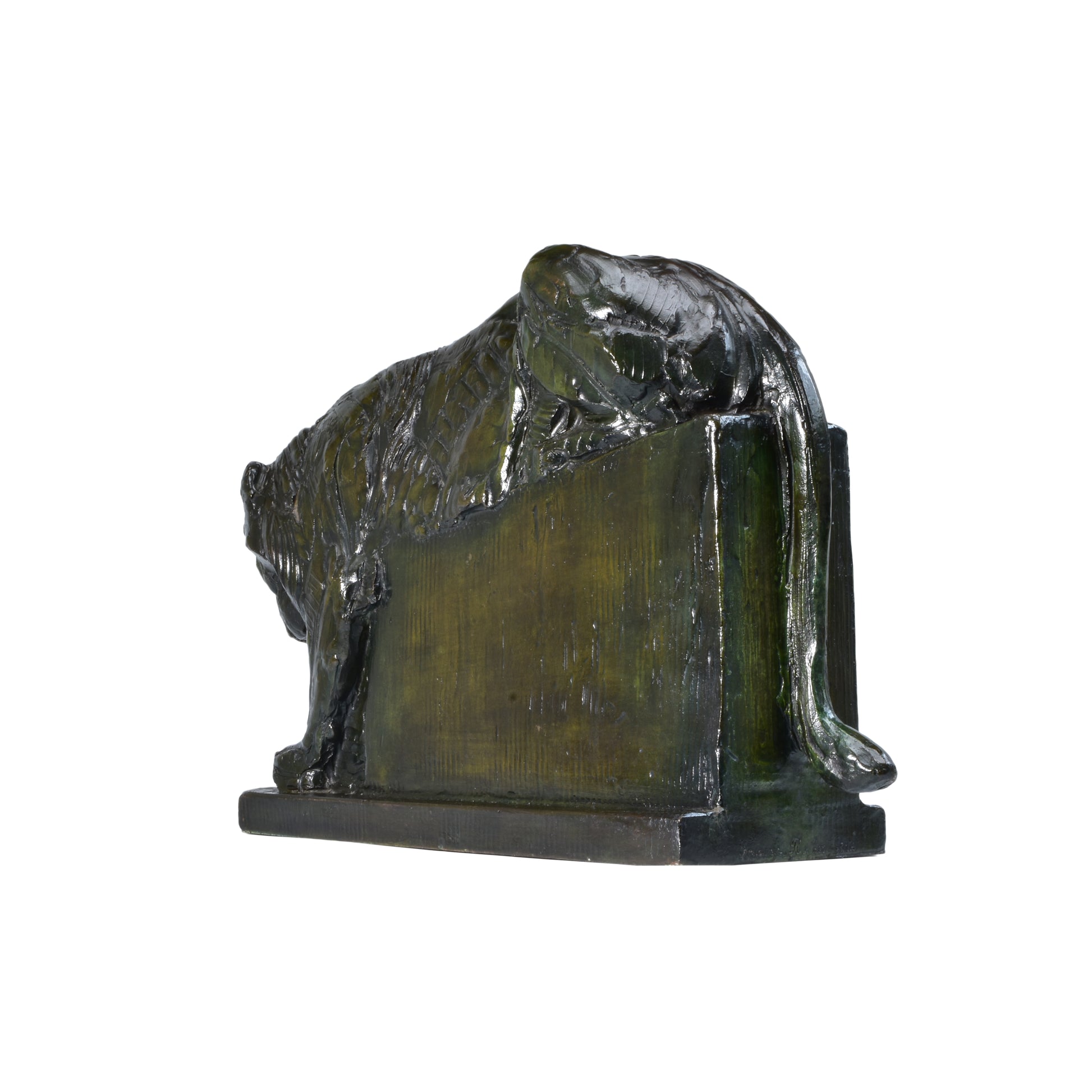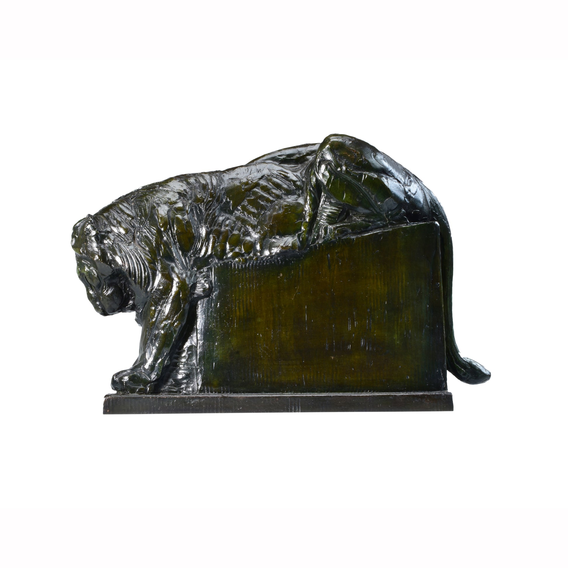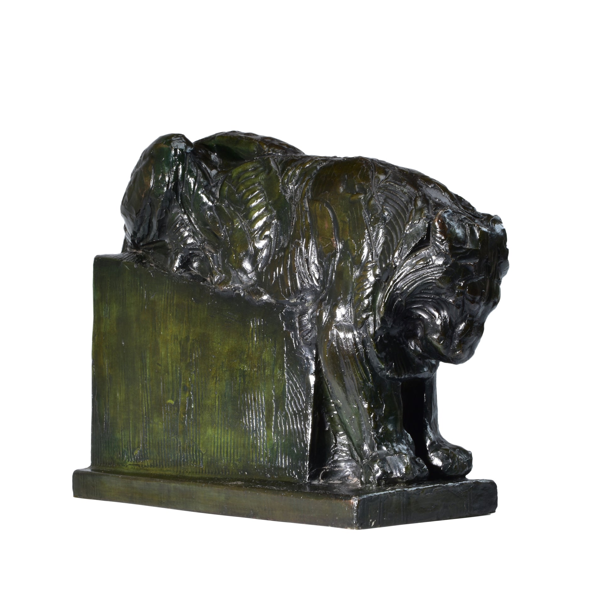 Deze vorstelijke leeuw straalt massieve kracht uit. De koning der dieren hoeft niets te doen om te imponeren. Alberic Collin heeft voor de eerste wereldoorlog jaren lang dagelijks in de Antwerpse Zoo gewerkt, samen met zijn collega en vriend Rembrandt Bugatti. Hij kende de dieren door en door. Zijn werk is ook sterk beïnvloed door dat van Bugatti. Tegenwoordig geldt Collin wereldwijd als de bekendste Belgische animalier waarvan het werk graag verzameld wordt.