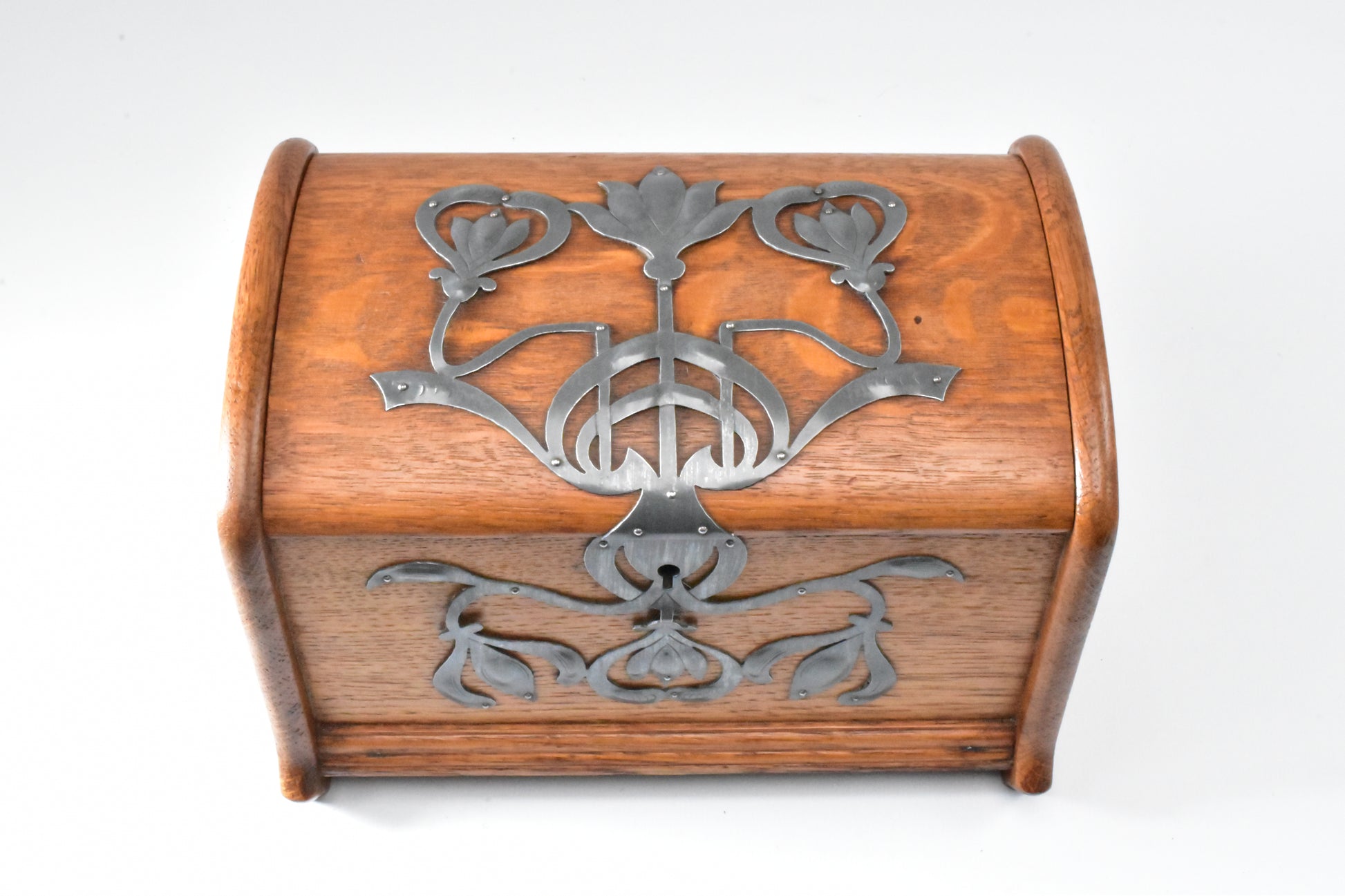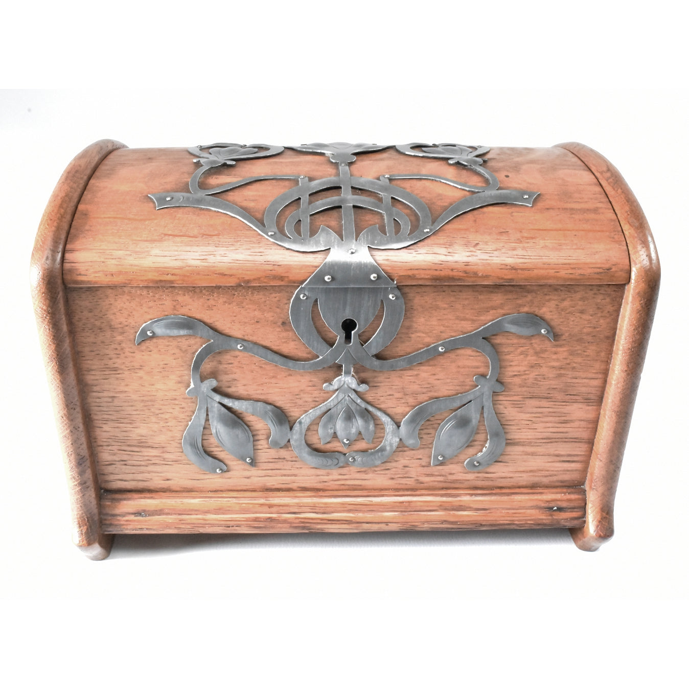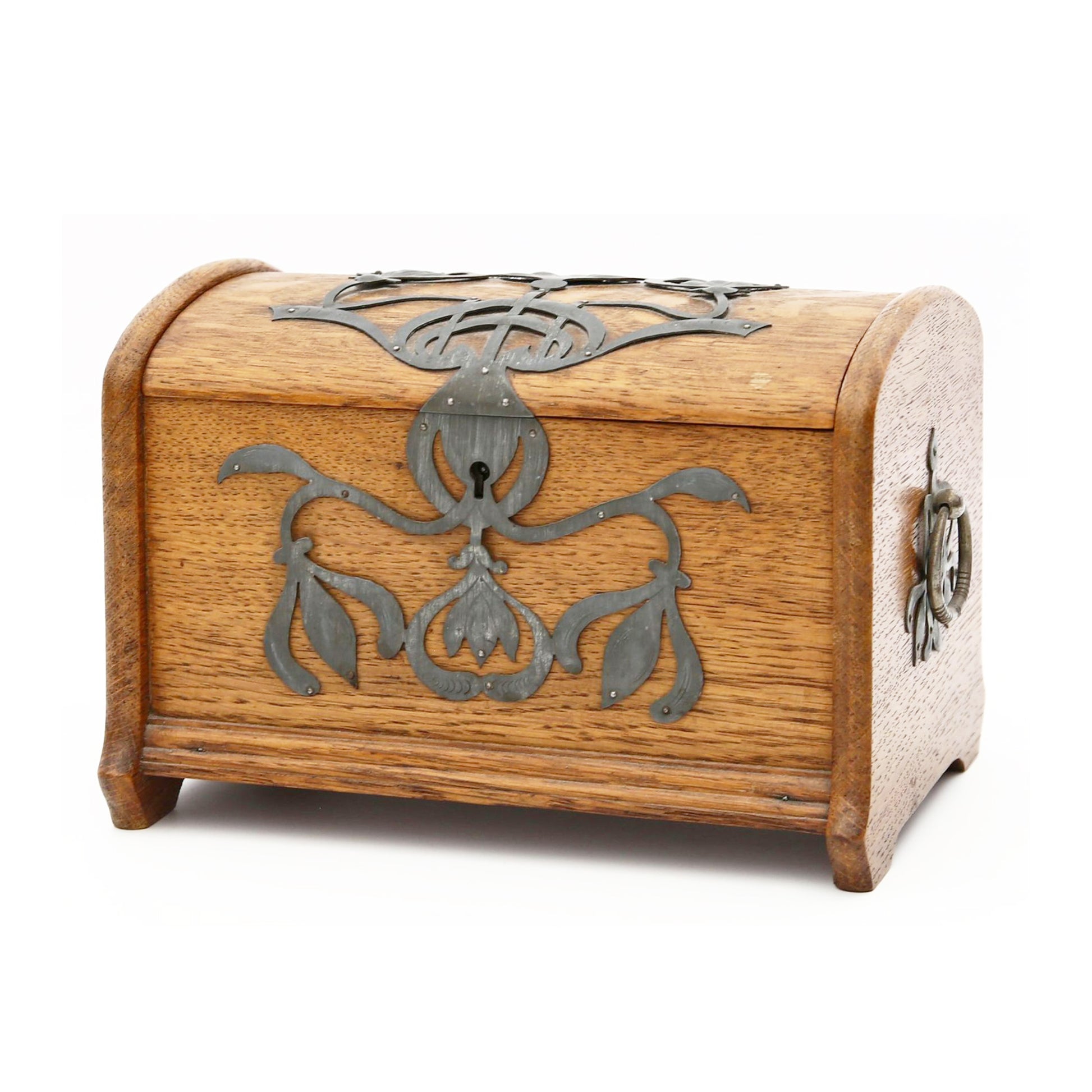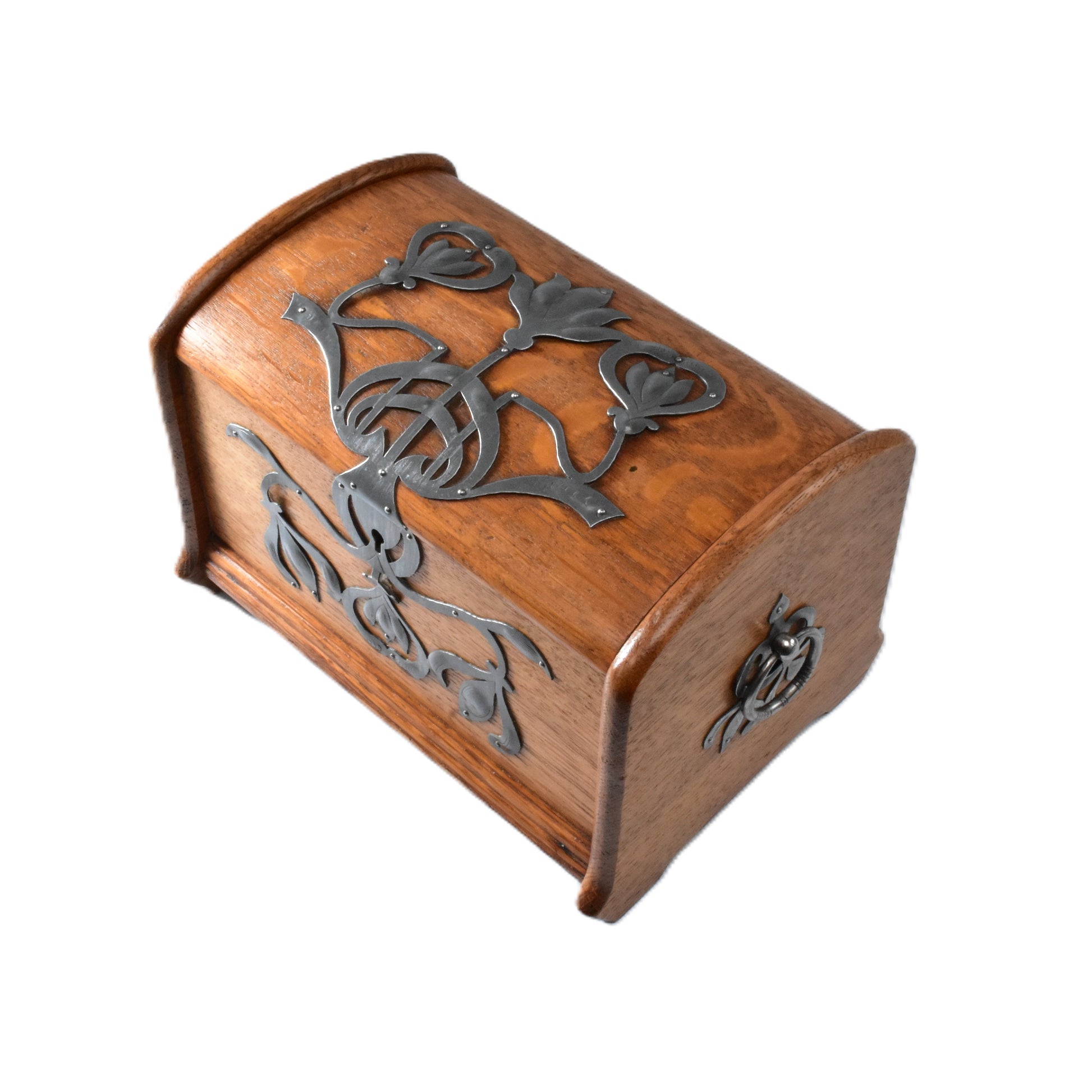 Eikenhouten kist met stoere zinken ornamenten. Duitse Jugendstil van rond 1900. In dit soort objecten zien we de grote invloed van de Engelse Arts & Crafts beweging. ook hier staat het zuivere gebruik van materiaal en het eerlijke handwerk centraal. De kist is zeer ambachtelijk gemaakt. Let op de dikte van het eikenhout ( Niet gefineerd ). De verschillende planken; Bodum, zijwanden en deksel steken allemaal uit ten opzichte van elkaar om de constructie te laten zien. Het deksel is gemaakt uit twee perfect aansluitende onder een hoek met elkaar geplaatste plankjes die vanboven bol geschaafd zijn. Het gedreven, ajour gezaagde en gegraveerde zink is ook zeer puur en ambachtelijk gemaakt. Een uniek stuk uit de werkplaats van een sierkunstenaar. De sleutel ontbreekt.