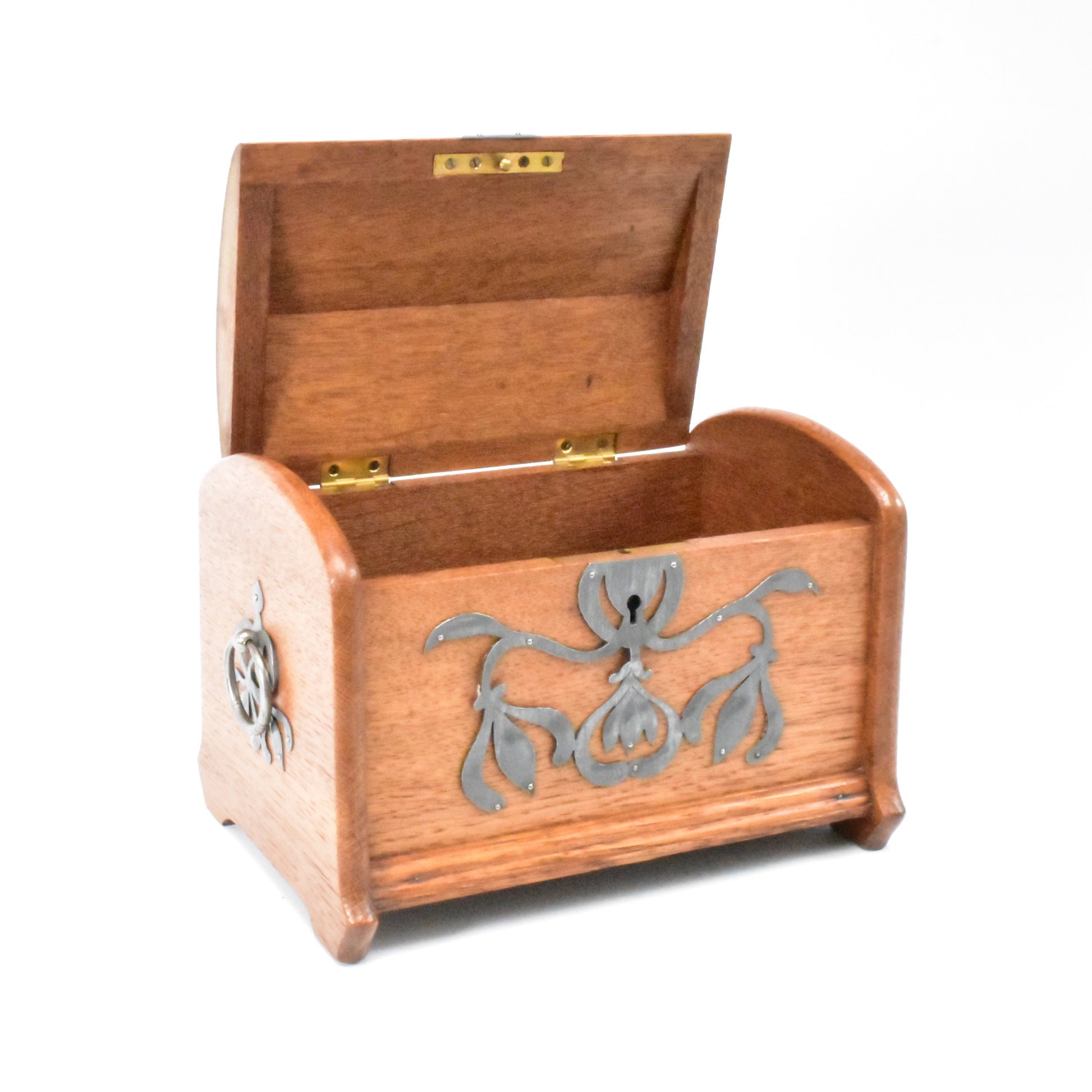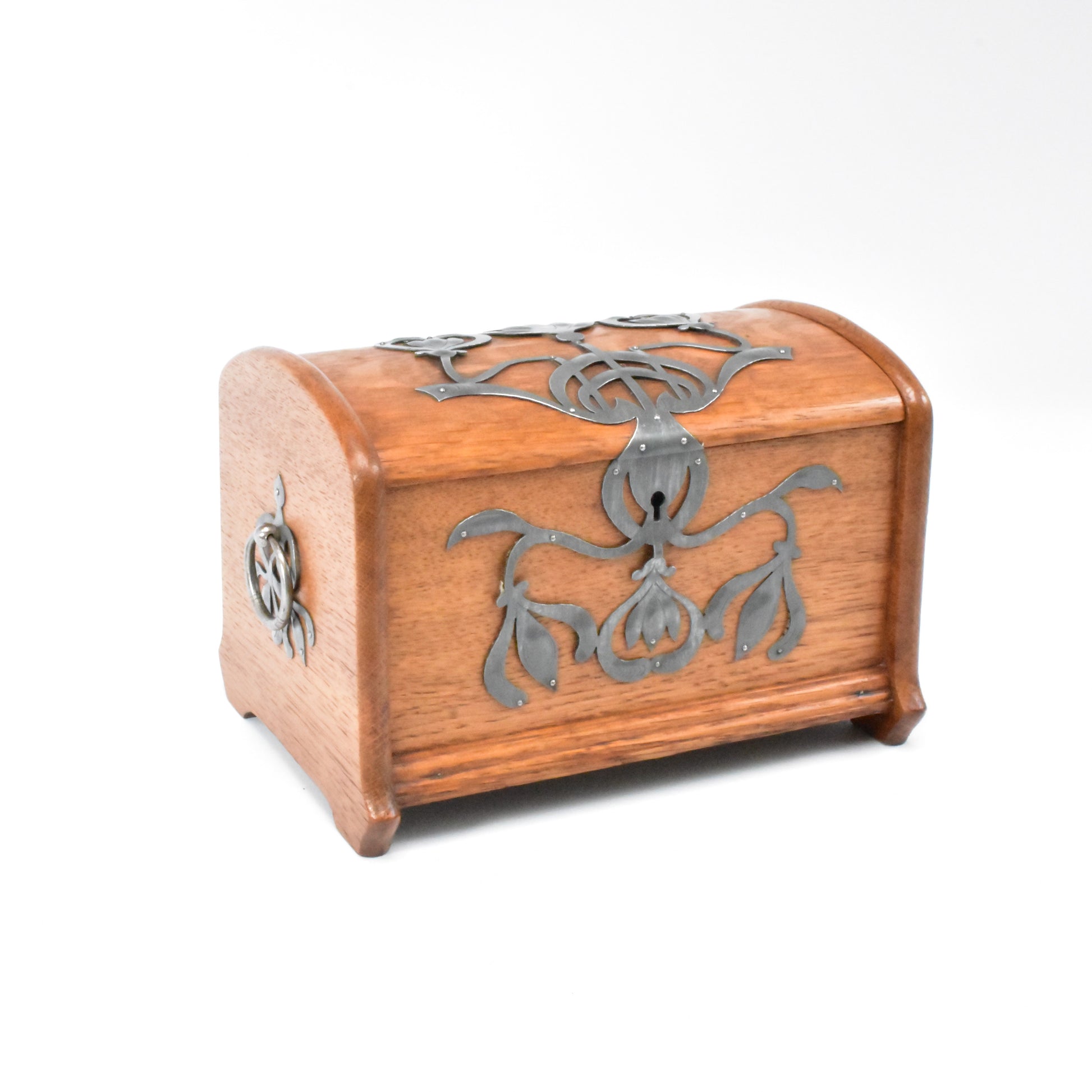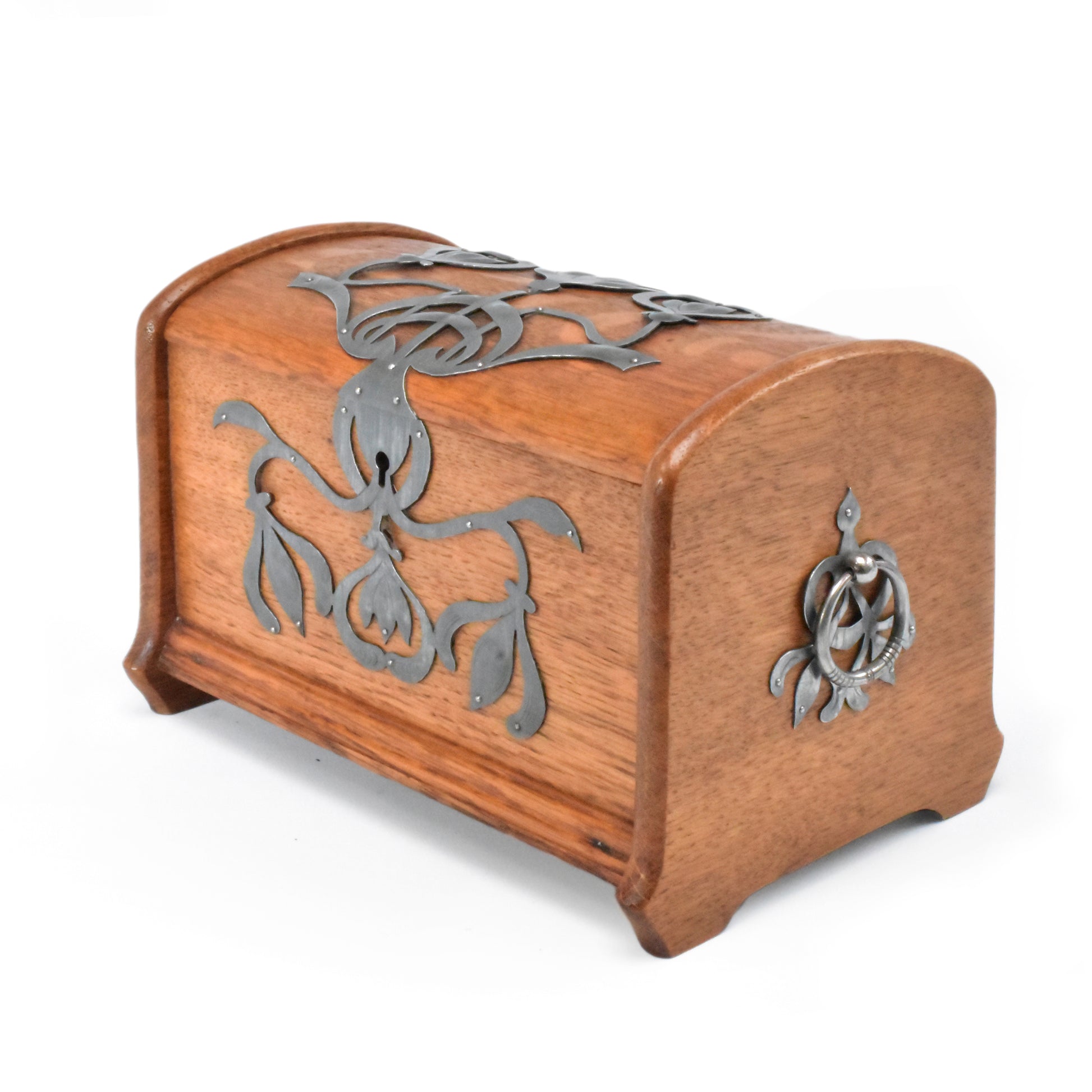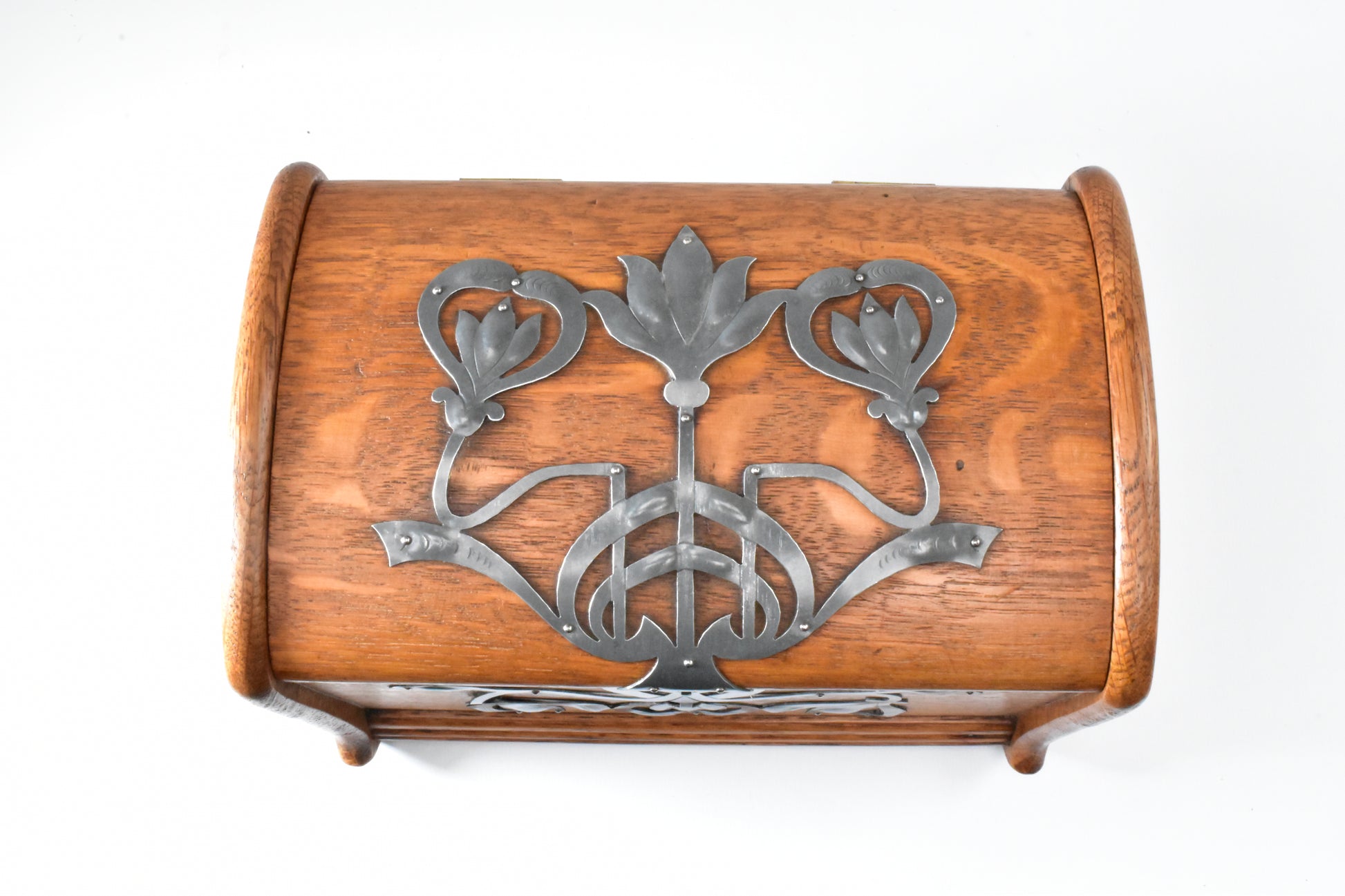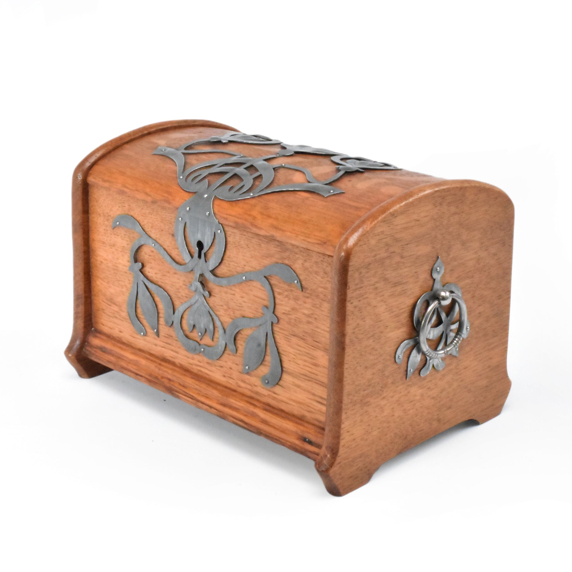 Eikenhouten kist met stoere zinken ornamenten. Duitse Jugendstil van rond 1900. In dit soort objecten zien we de grote invloed van de Engelse Arts & Crafts beweging. ook hier staat het zuivere gebruik van materiaal en het eerlijke handwerk centraal. De kist is zeer ambachtelijk gemaakt. Let op de dikte van het eikenhout ( Niet gefineerd ). De verschillende planken; Bodum, zijwanden en deksel steken allemaal uit ten opzichte van elkaar om de constructie te laten zien. Het deksel is gemaakt uit twee perfect aansluitende onder een hoek met elkaar geplaatste plankjes die vanboven bol geschaafd zijn. Het gedreven, ajour gezaagde en gegraveerde zink is ook zeer puur en ambachtelijk gemaakt. Een uniek stuk uit de werkplaats van een sierkunstenaar. De sleutel ontbreekt.
