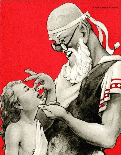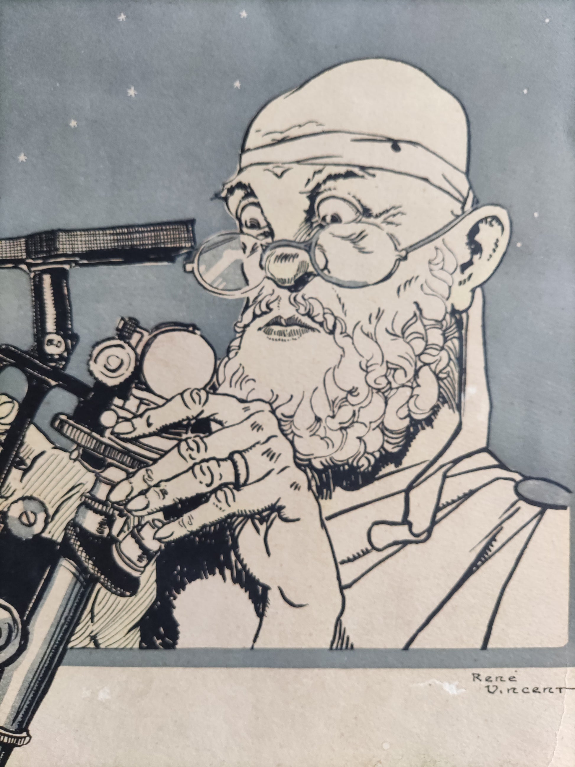 Deze illustratie laat een oude griek zien die met een twintigste eeuws wetenschappelijk instrument geconfronteerd wordt. Deze antieke Griek illustreert de sprong die de wetenschap gemaakt heeft. Het is een antiek figuur die als wetenschapper of dokter vaker voorkomt in zijn oeuvre ( zie laatste illustratie)