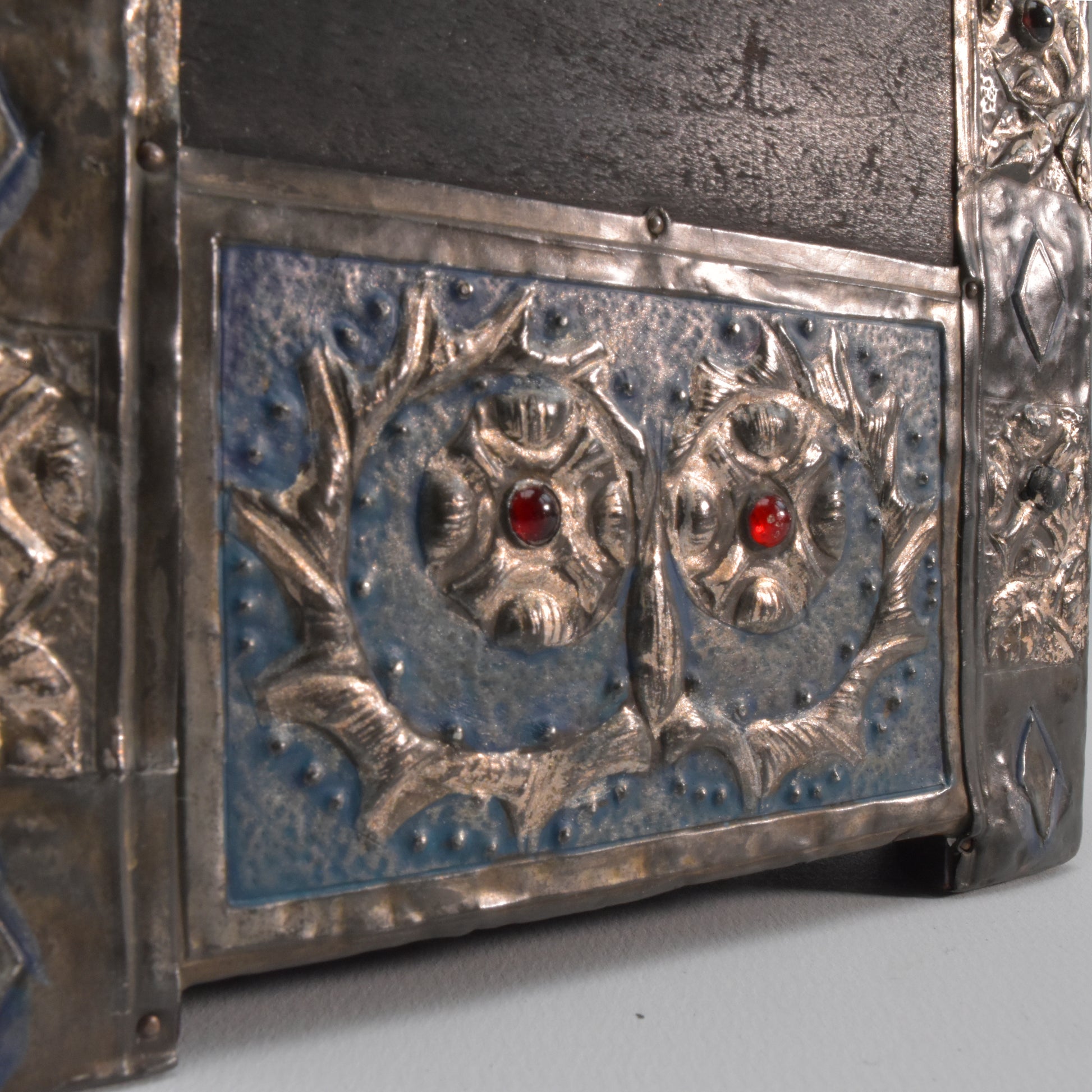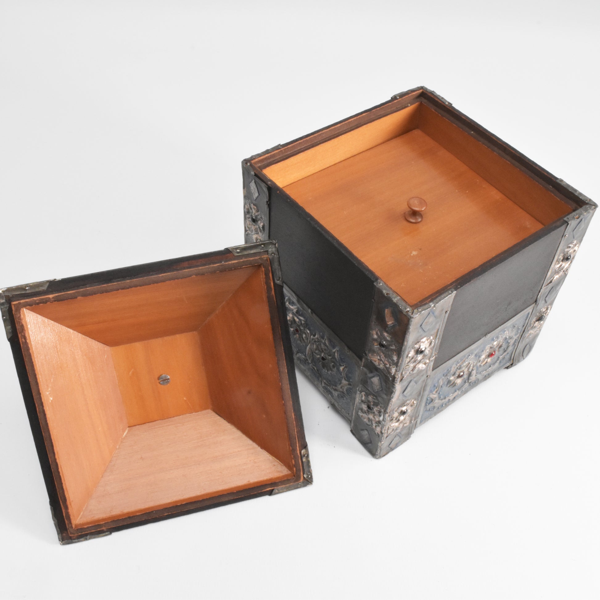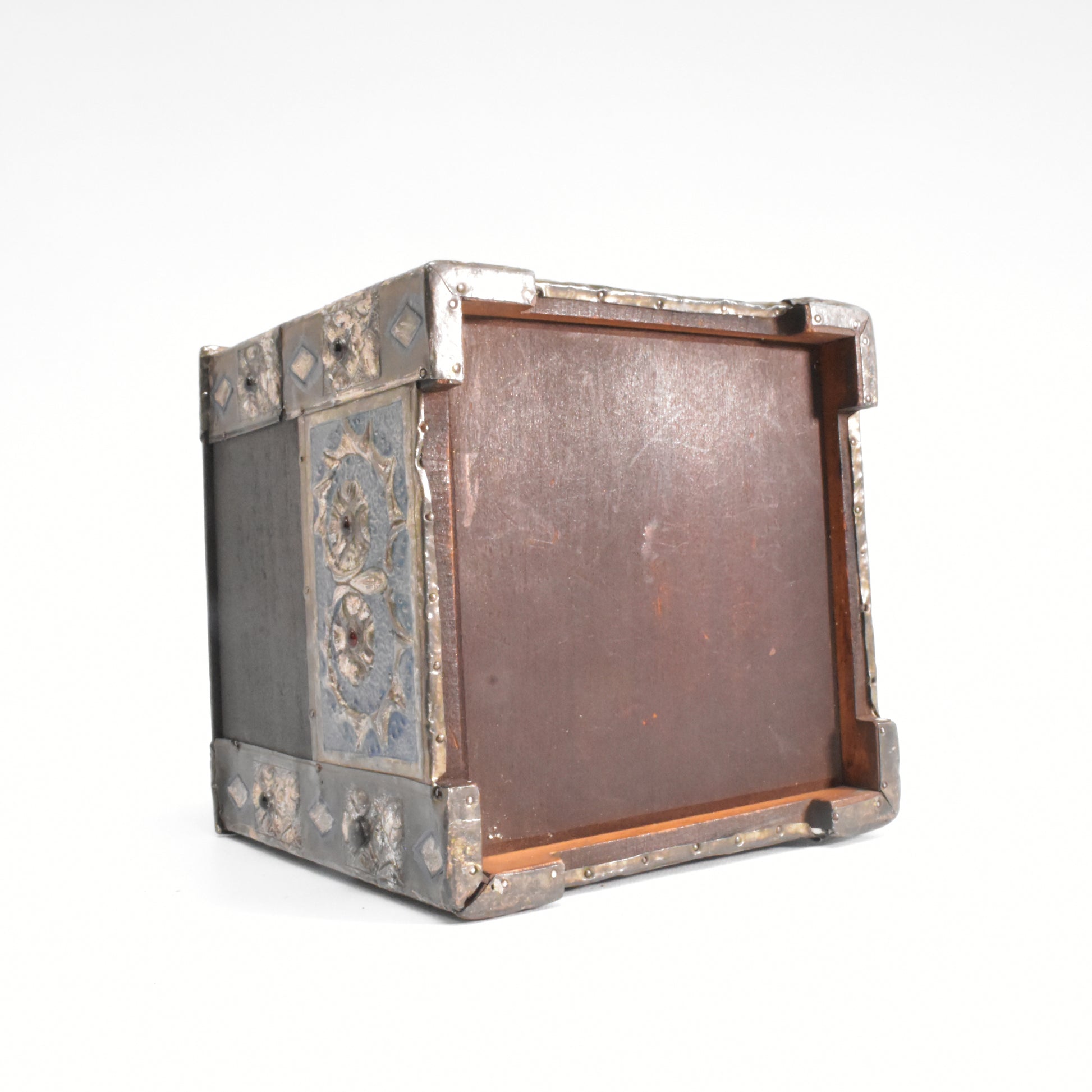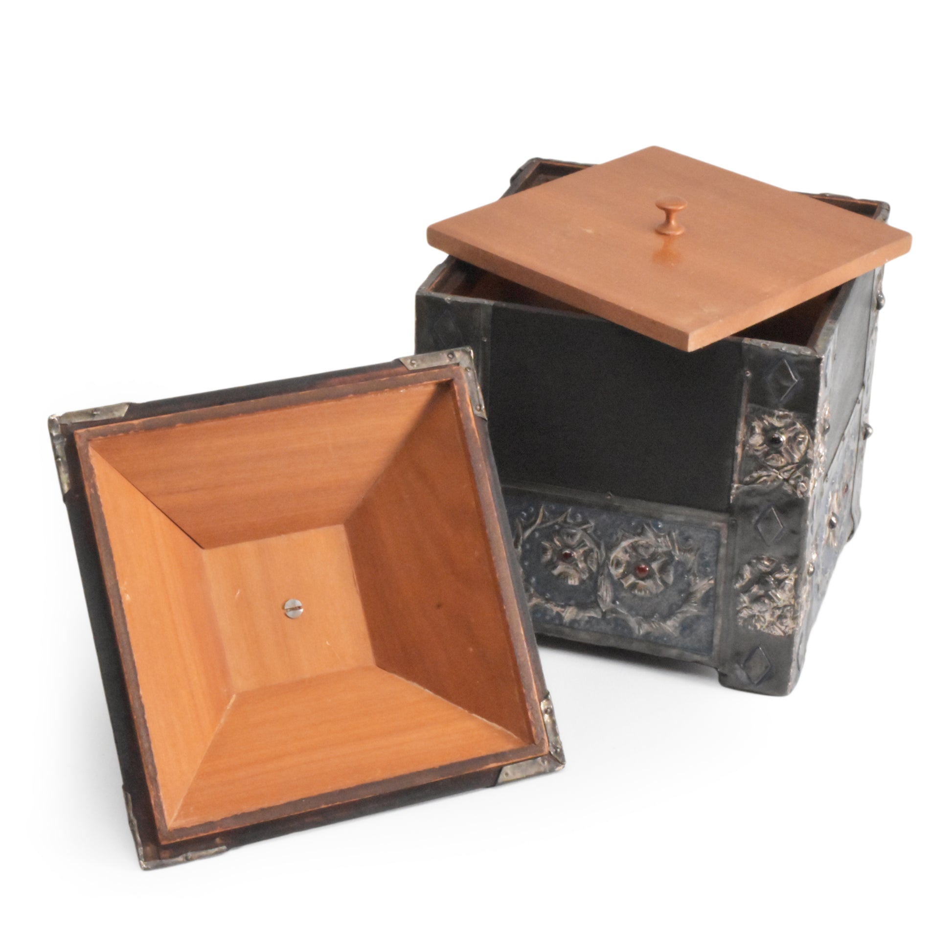 Luxe ceder houten doos met decoratie van répoussé tinlegering en cabochons van rood glas. Een los plateau van cederhout past precies in de doos.