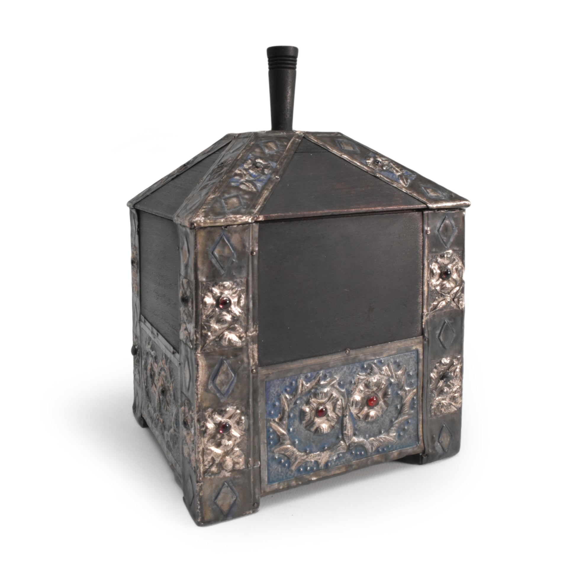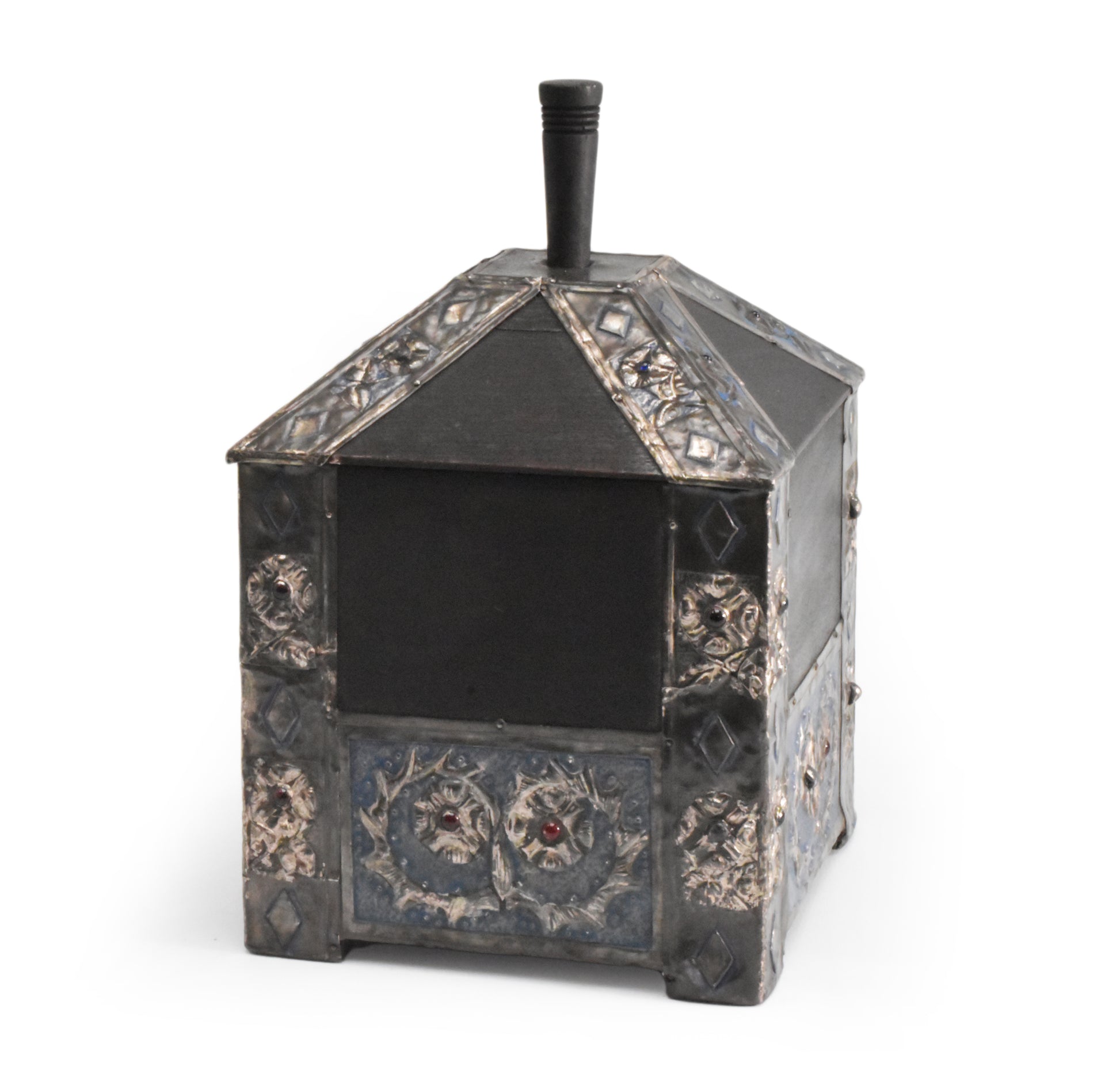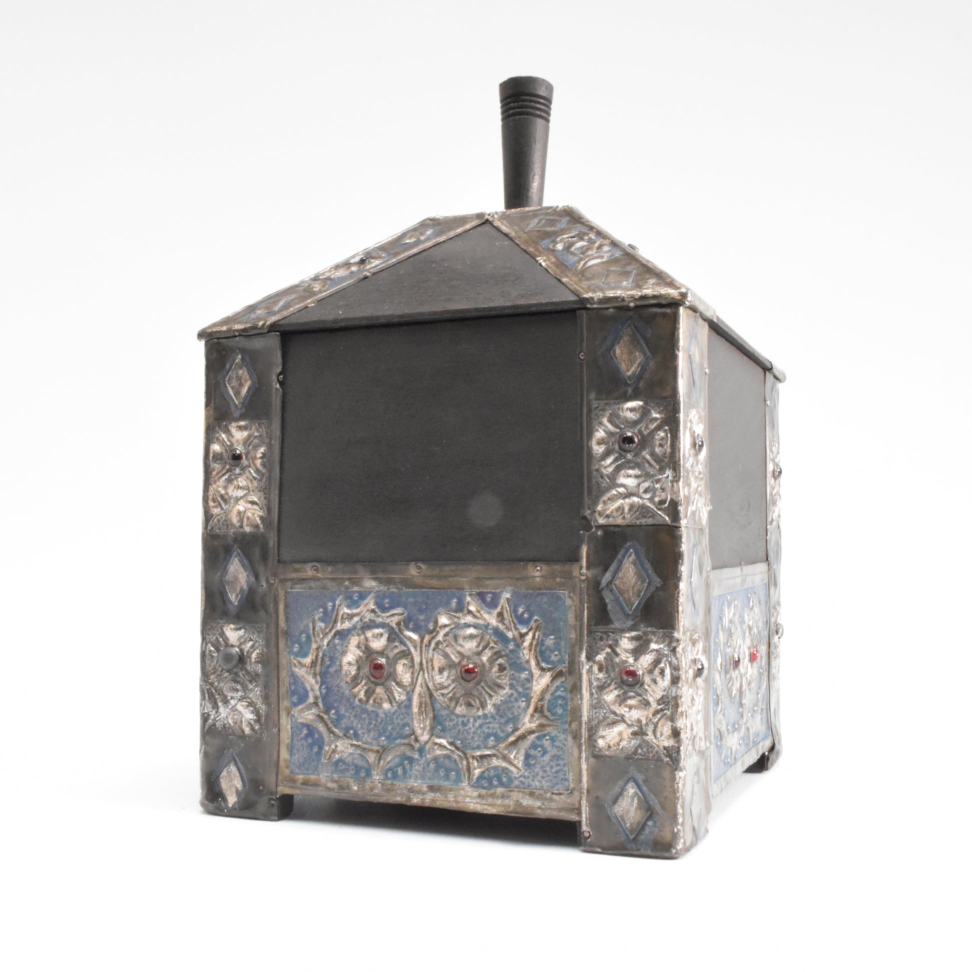 Luxe ceder houten doos met decoratie van répoussé tinlegering en cabochons van rood glas. Een los plateau van cederhout past precies in de doos.