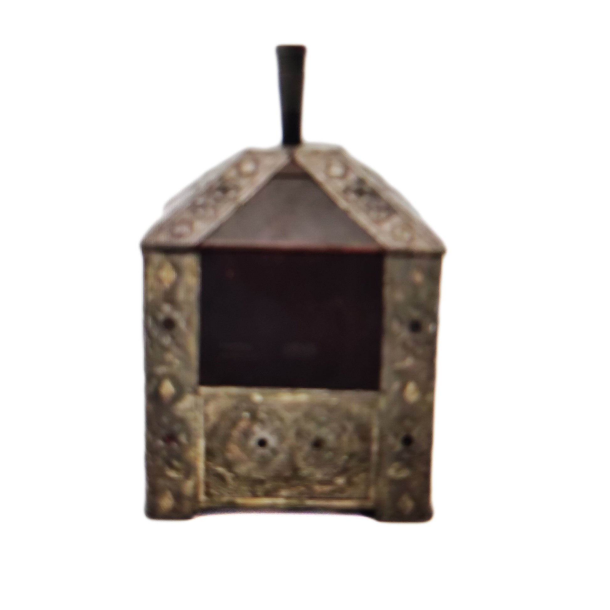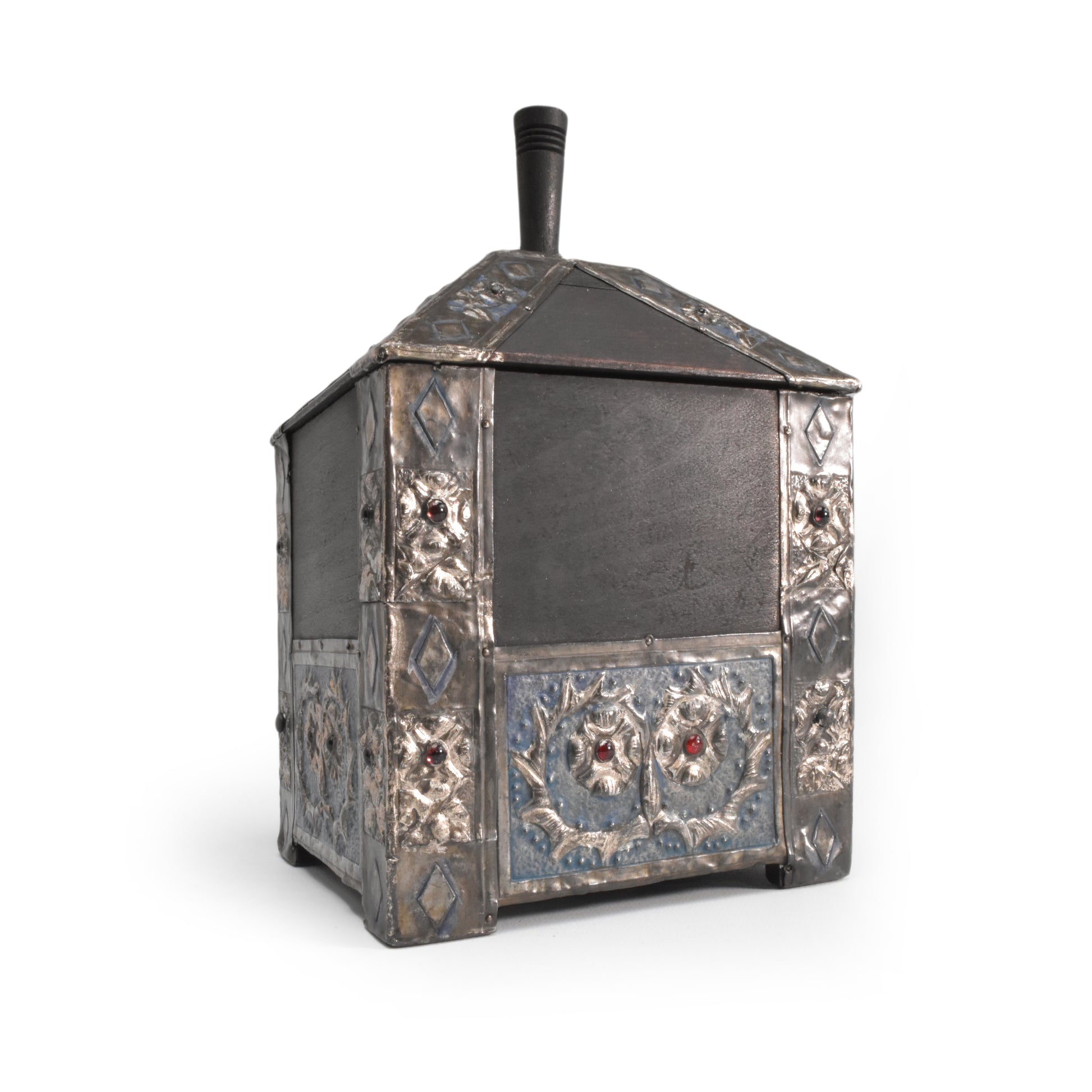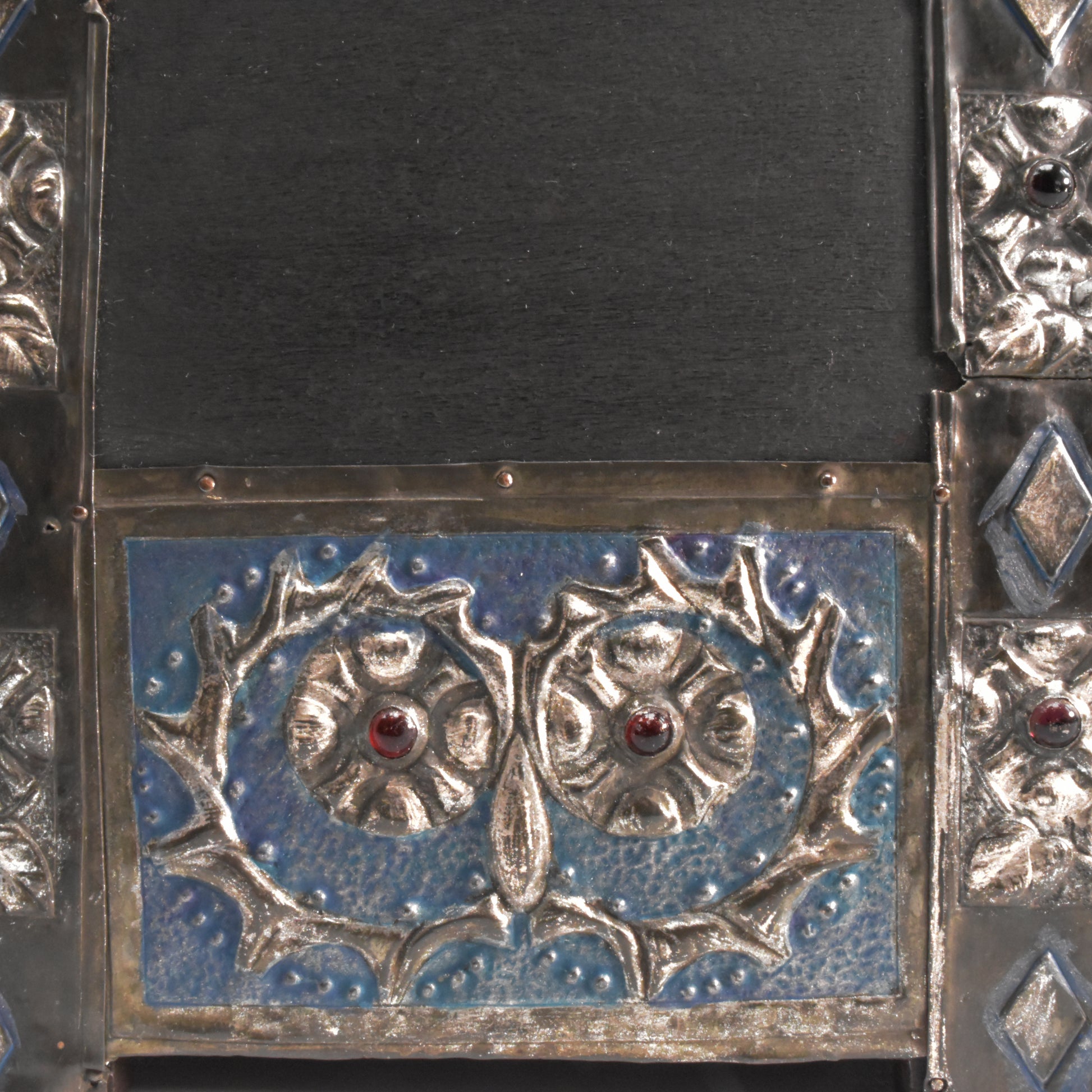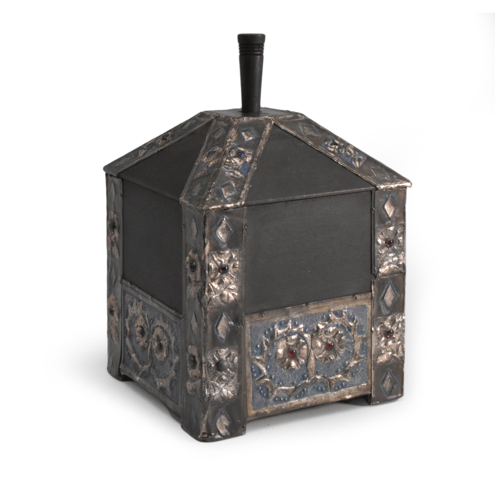 Luxe ceder houten doos met decoratie van répoussé tinlegering en cabochons van rood glas. Een los plateau van cederhout past precies in de doos.