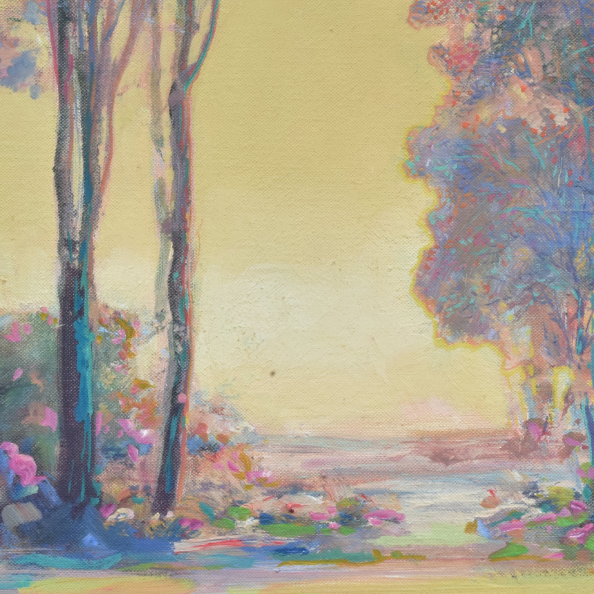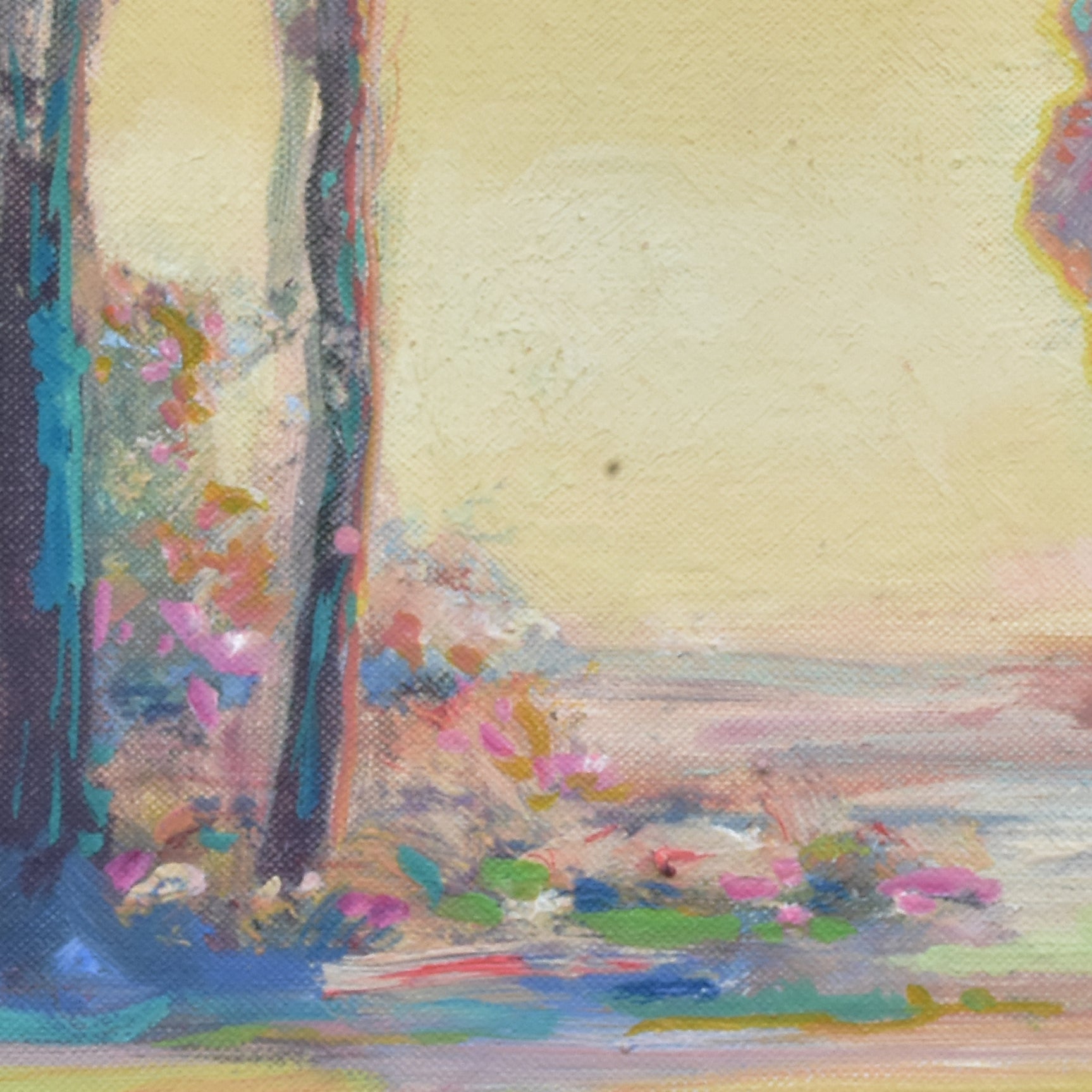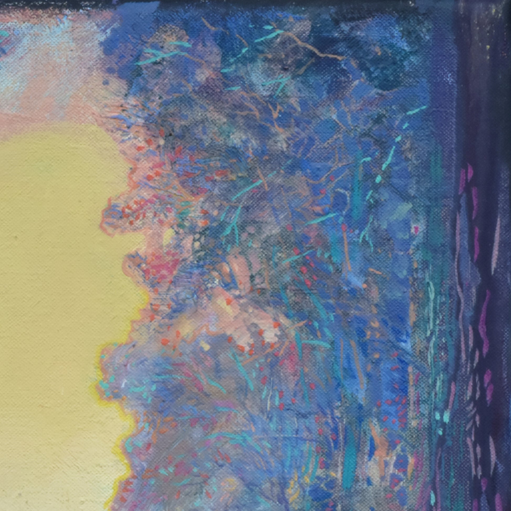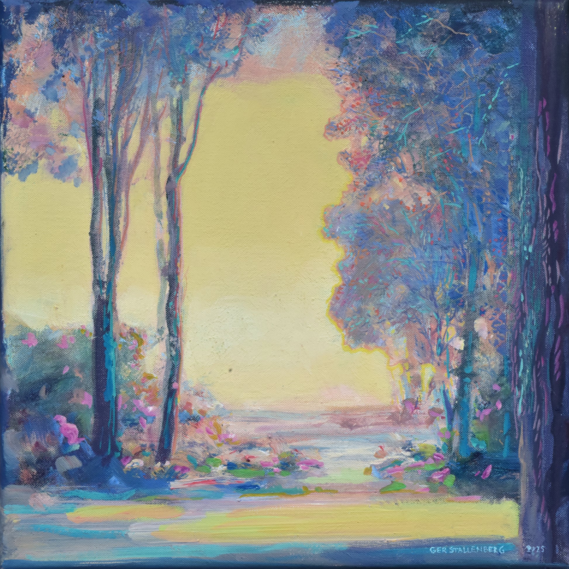 dit schilderij lijkt impressionistisch. Dat is het in zekere zin ook, maar het is een impressie van een droombeeld. Geen realiteit. Het gaat dus ook niet om kleurtoetsen die de realistische inval van het licht proberen te vangen. De kleuren zijn impressies van emotie. En ik hoop dan ook dat de kleuren bij de kijker ook weer individuele emoties opwekken.