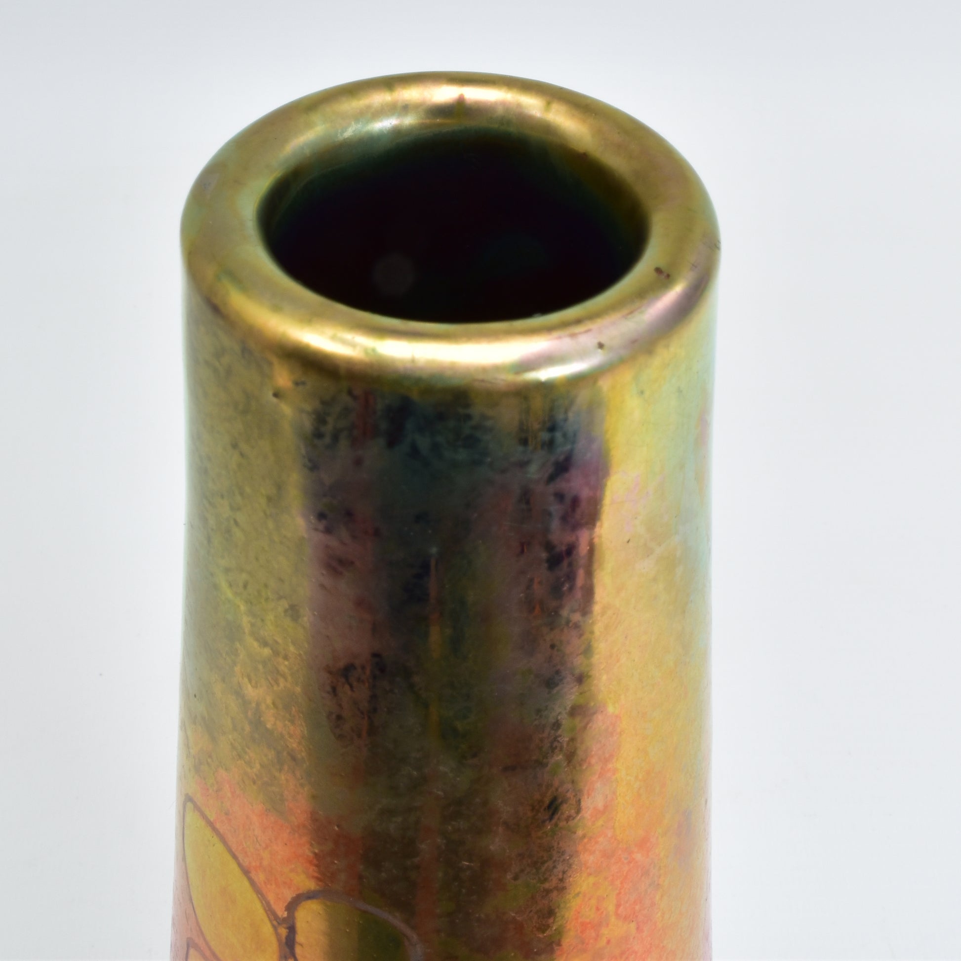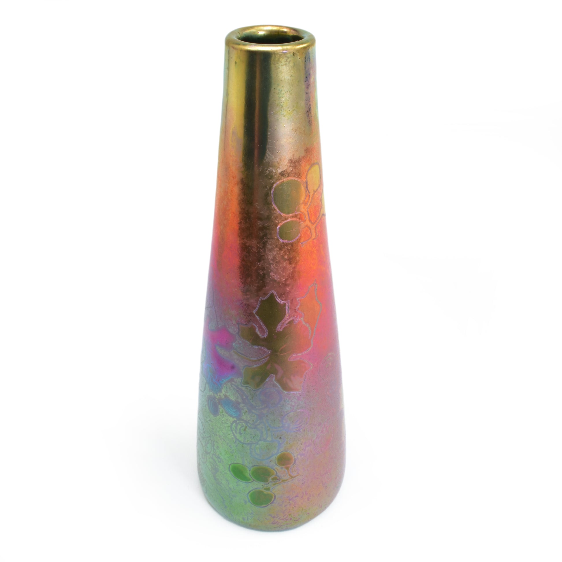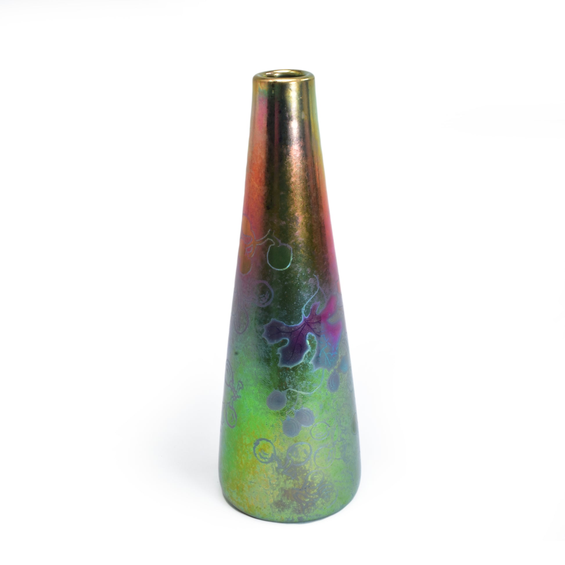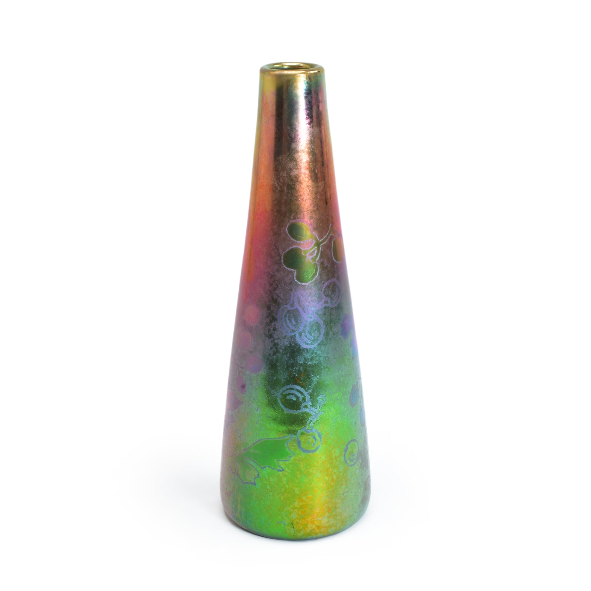 Clement Massier is de meester van het lustre glazuur. Zijn eerste experimenten startte hij al in 1865. In 1887 kon hij trots zijn collectie reflets metallique keramiek presenteren. Op de wereldtentoonstelling in Parijs won hij een gouden medaille. De ingewikkelde en fragiele techniek leidt in het beste geval, zoals bij deze vaas tot een spectaculair kleurrijk schilderachtig en feëriek resultaat. Een decor van druiven en wijnbladeren.