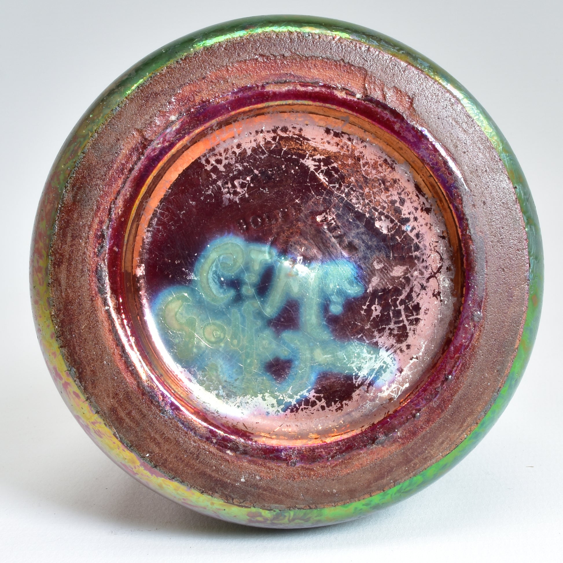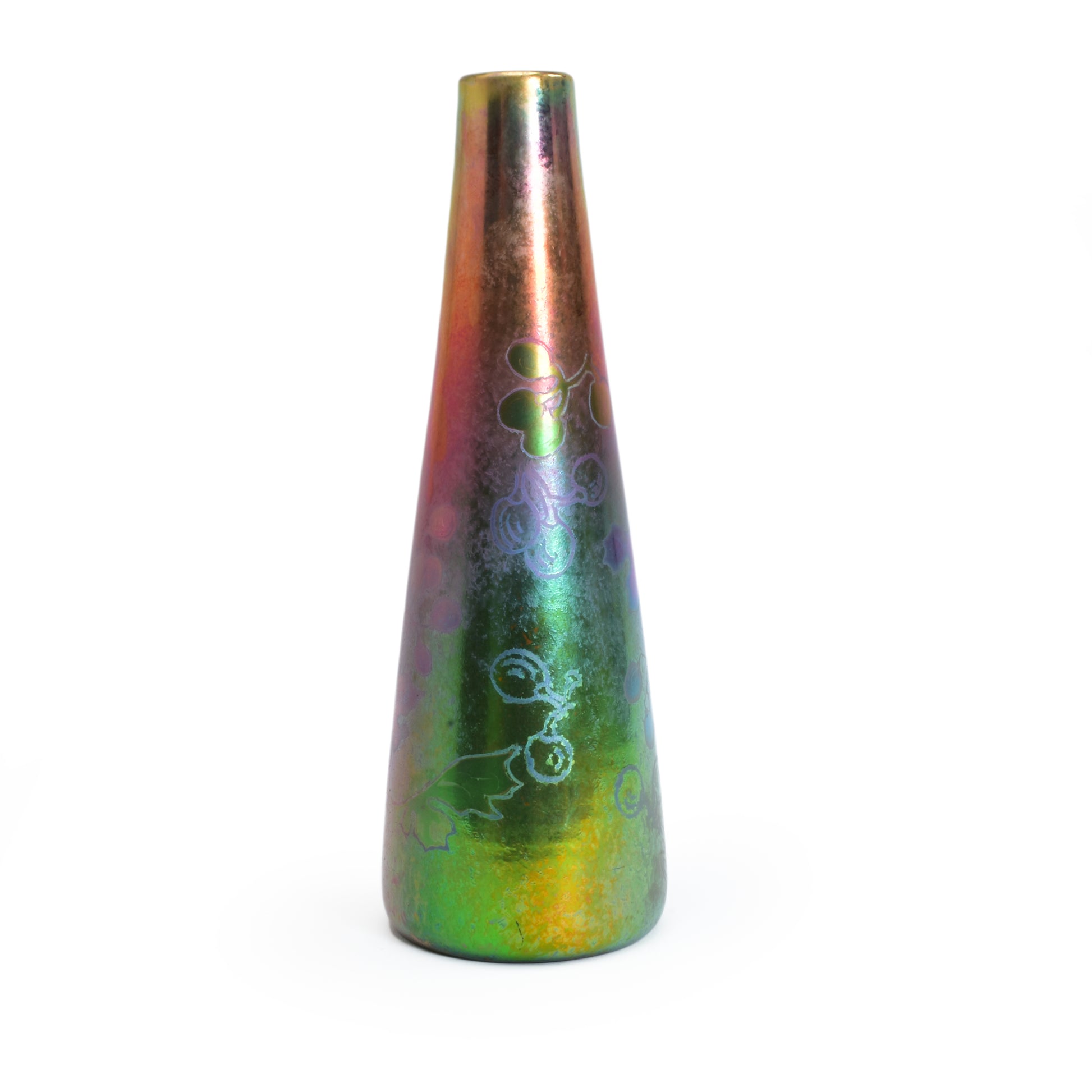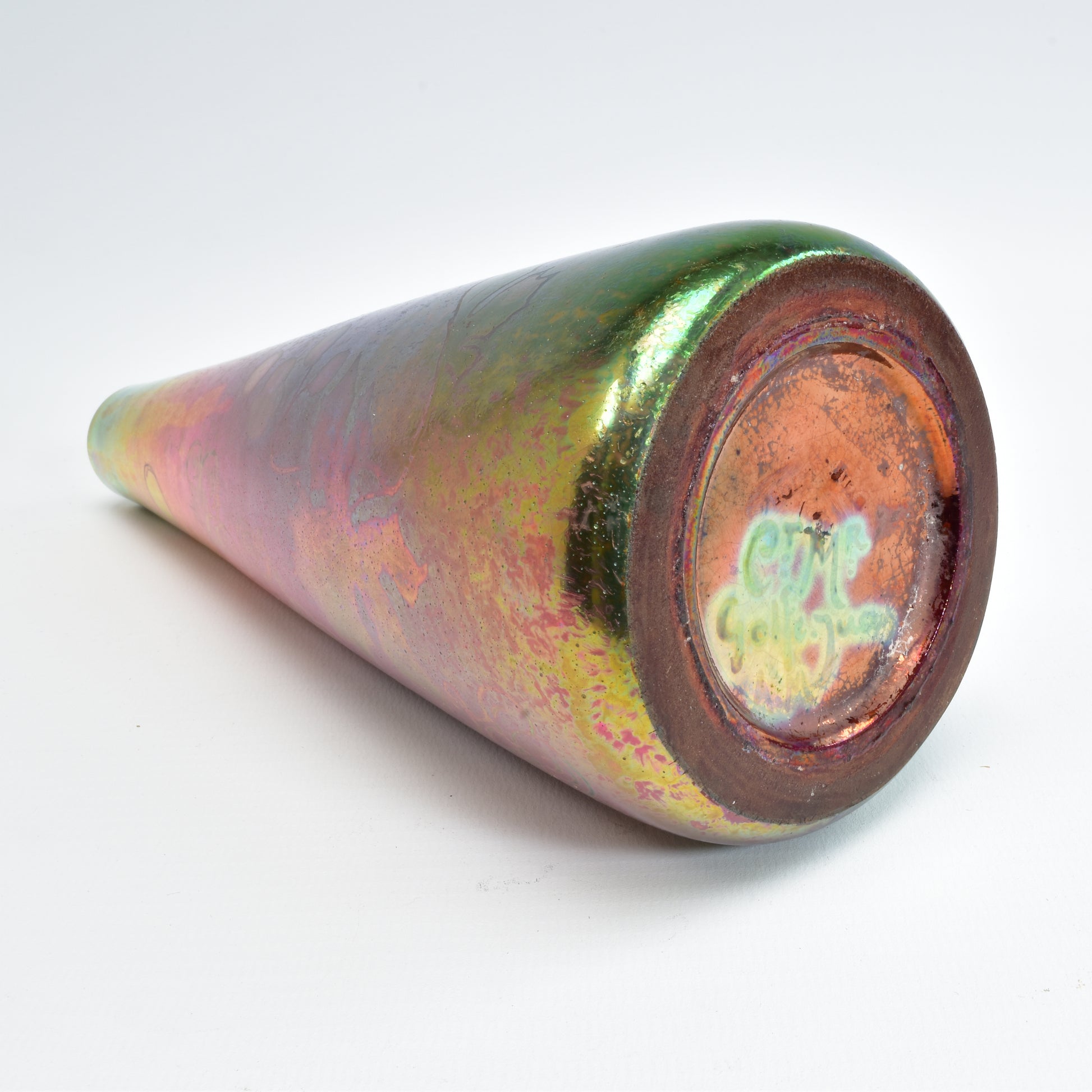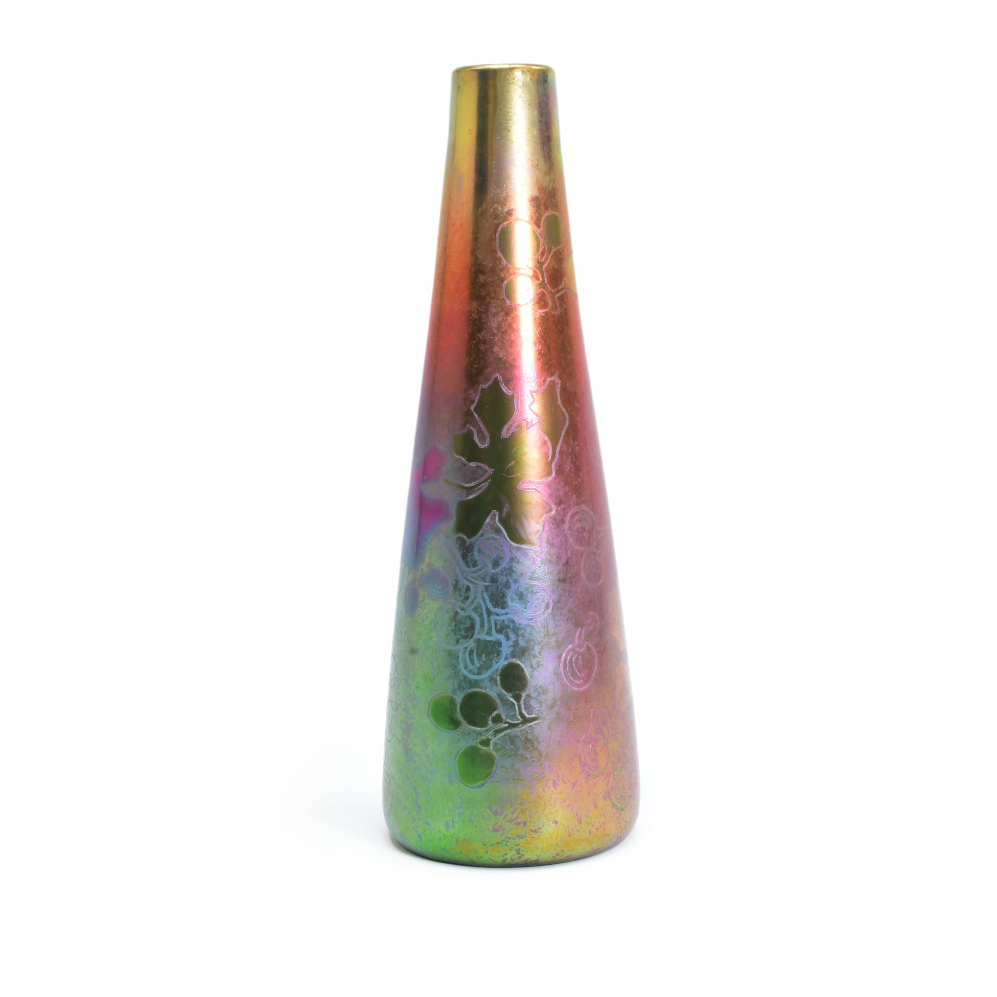 Clement Massier is de meester van het lustre glazuur. Zijn eerste experimenten startte hij al in 1865. In 1887 kon hij trots zijn collectie reflets metallique keramiek presenteren. Op de wereldtentoonstelling in Parijs won hij een gouden medaille. De ingewikkelde en fragiele techniek leidt in het beste geval, zoals bij deze vaas tot een spectaculair kleurrijk schilderachtig en feëriek resultaat. Een decor van druiven en wijnbladeren.