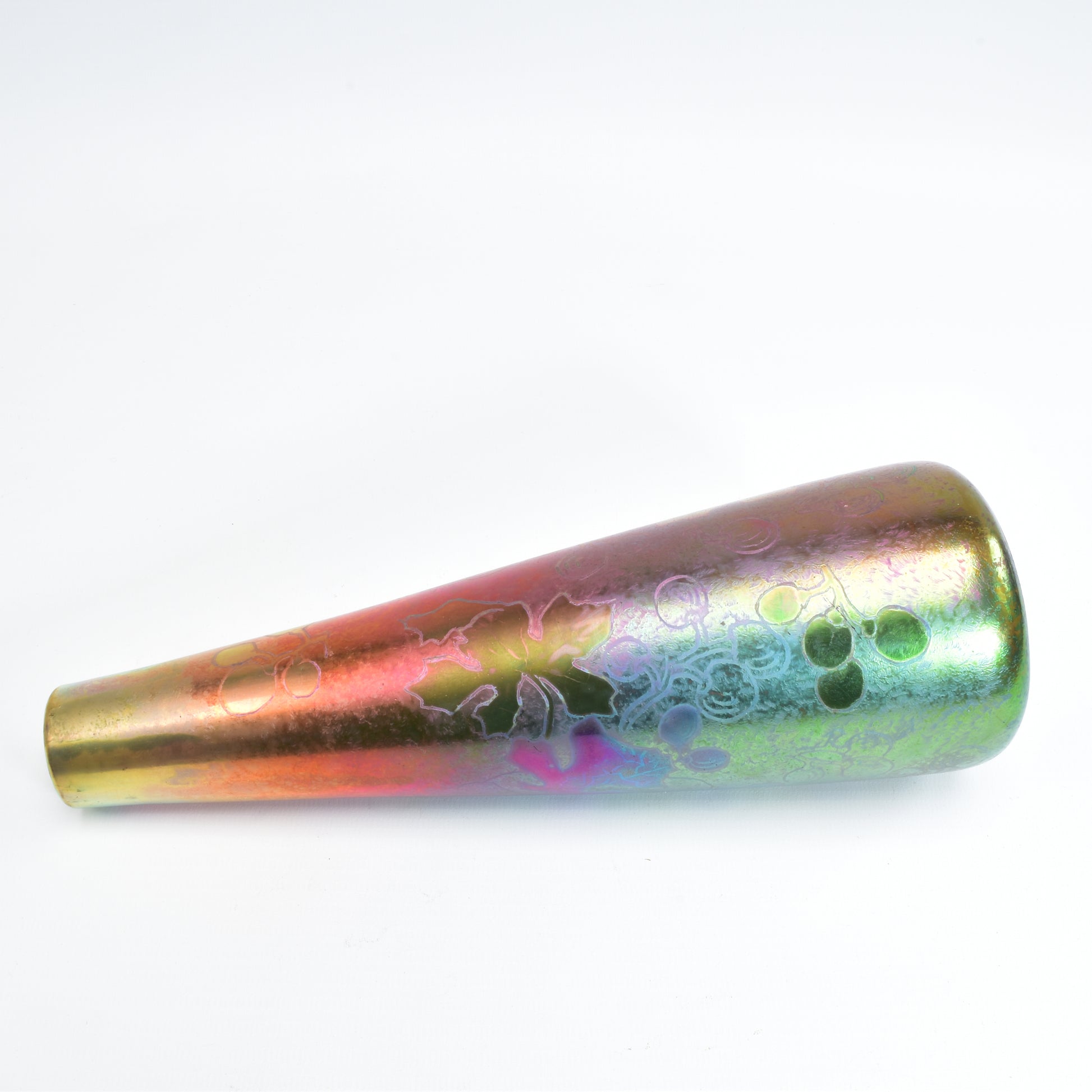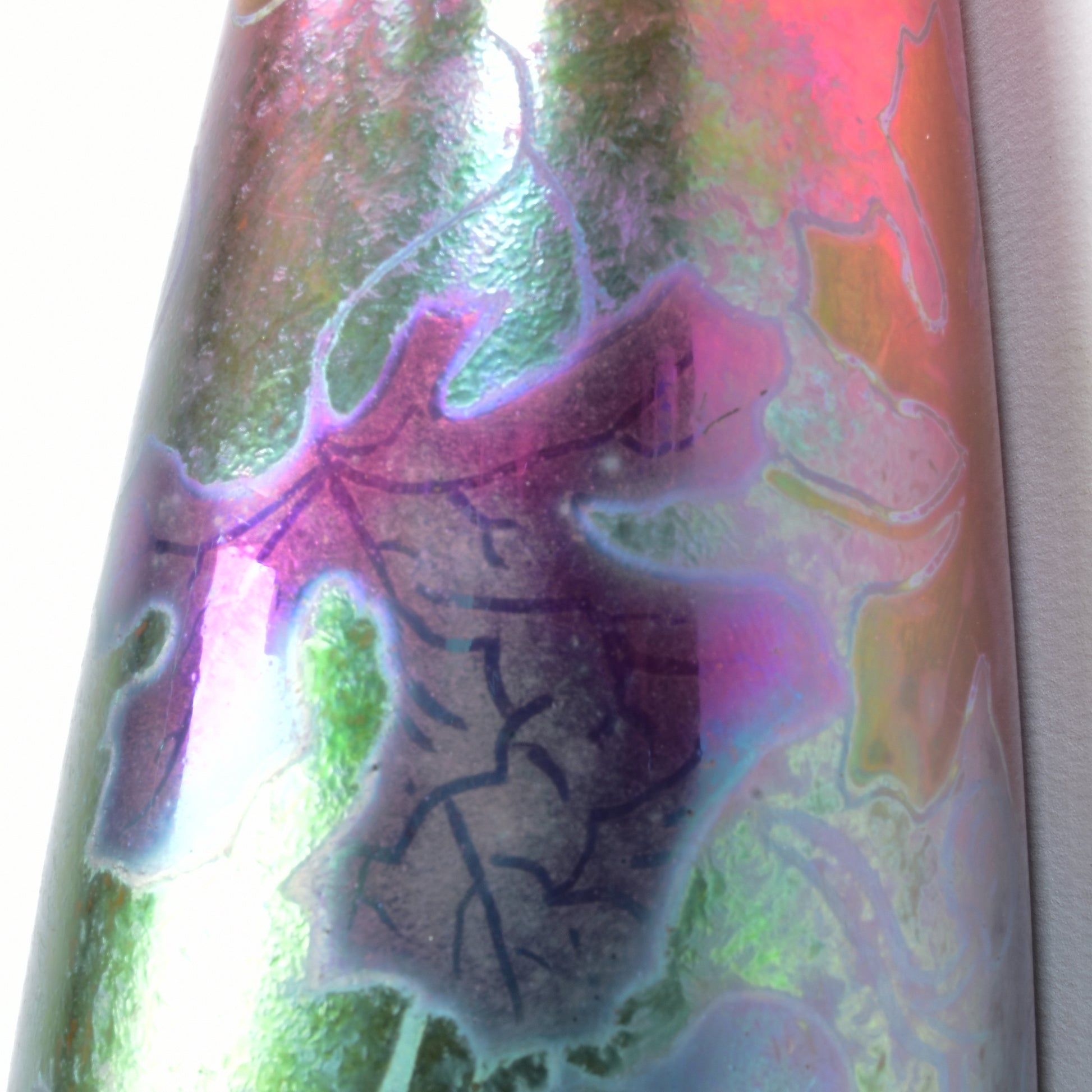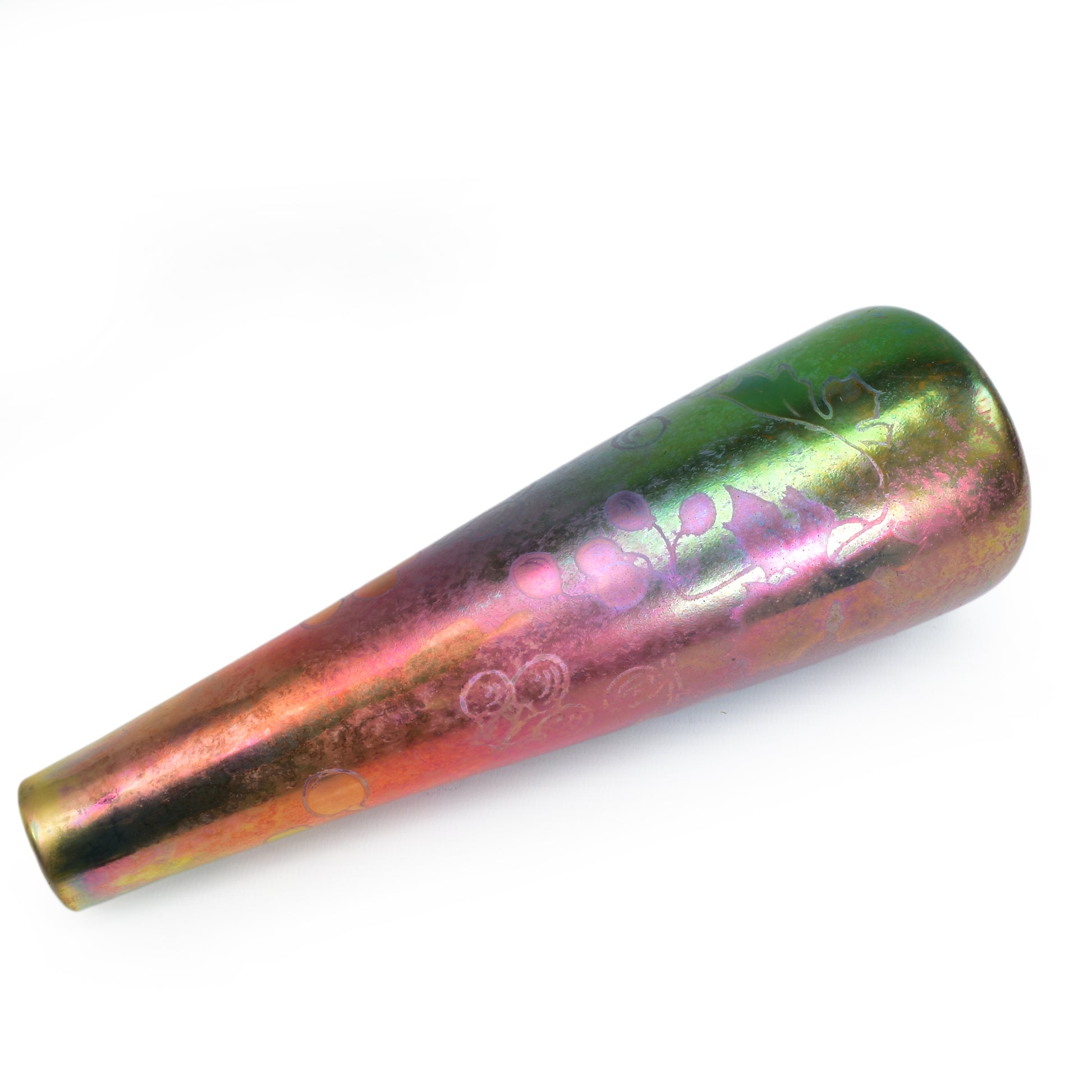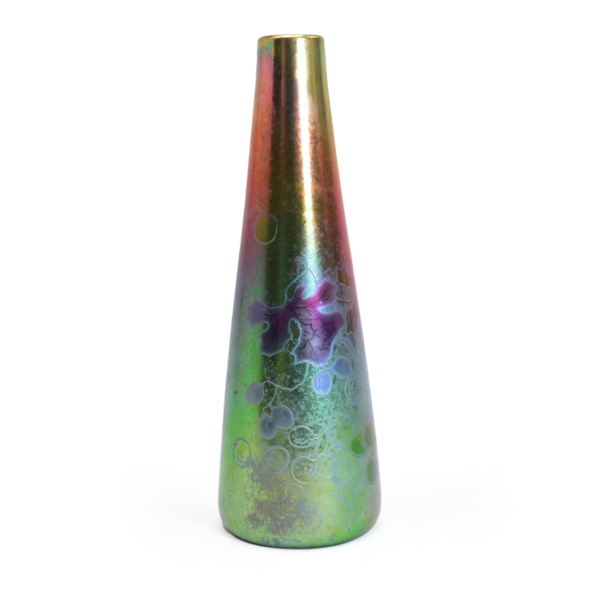 Clement Massier is de meester van het lustre glazuur. Zijn eerste experimenten startte hij al in 1865. In 1887 kon hij trots zijn collectie reflets metallique keramiek presenteren. Op de wereldtentoonstelling in Parijs won hij een gouden medaille. De ingewikkelde en fragiele techniek leidt in het beste geval, zoals bij deze vaas tot een spectaculair kleurrijk schilderachtig en feëriek resultaat. Een decor van druiven en wijnbladeren.