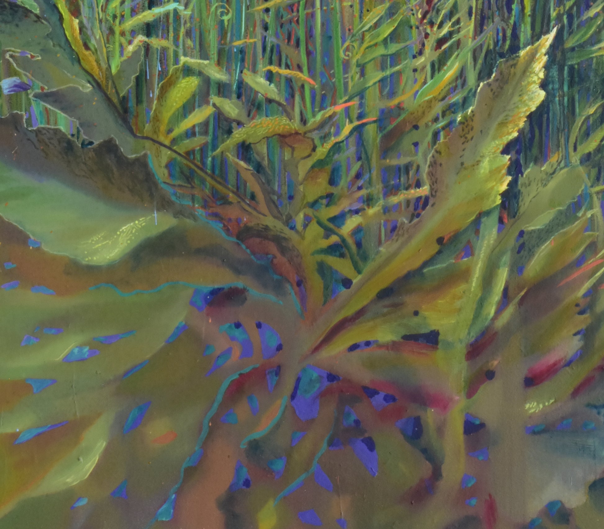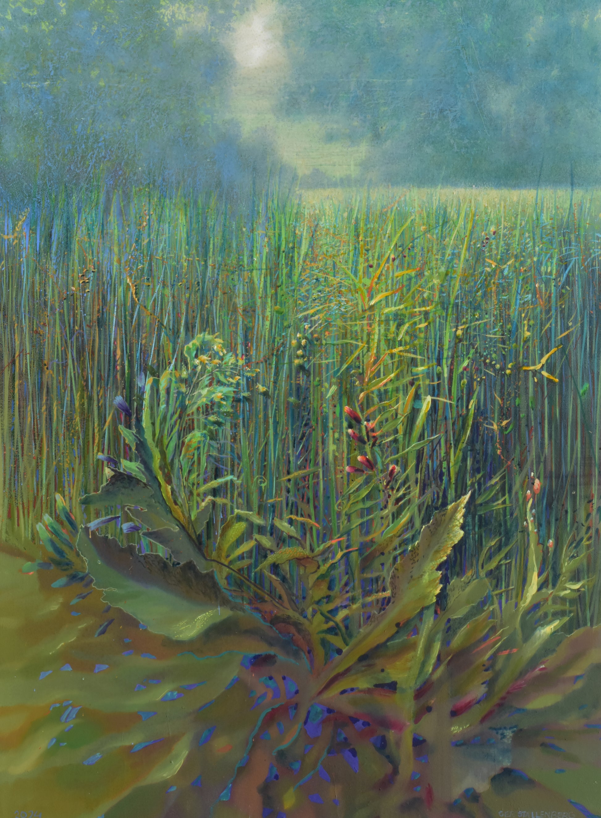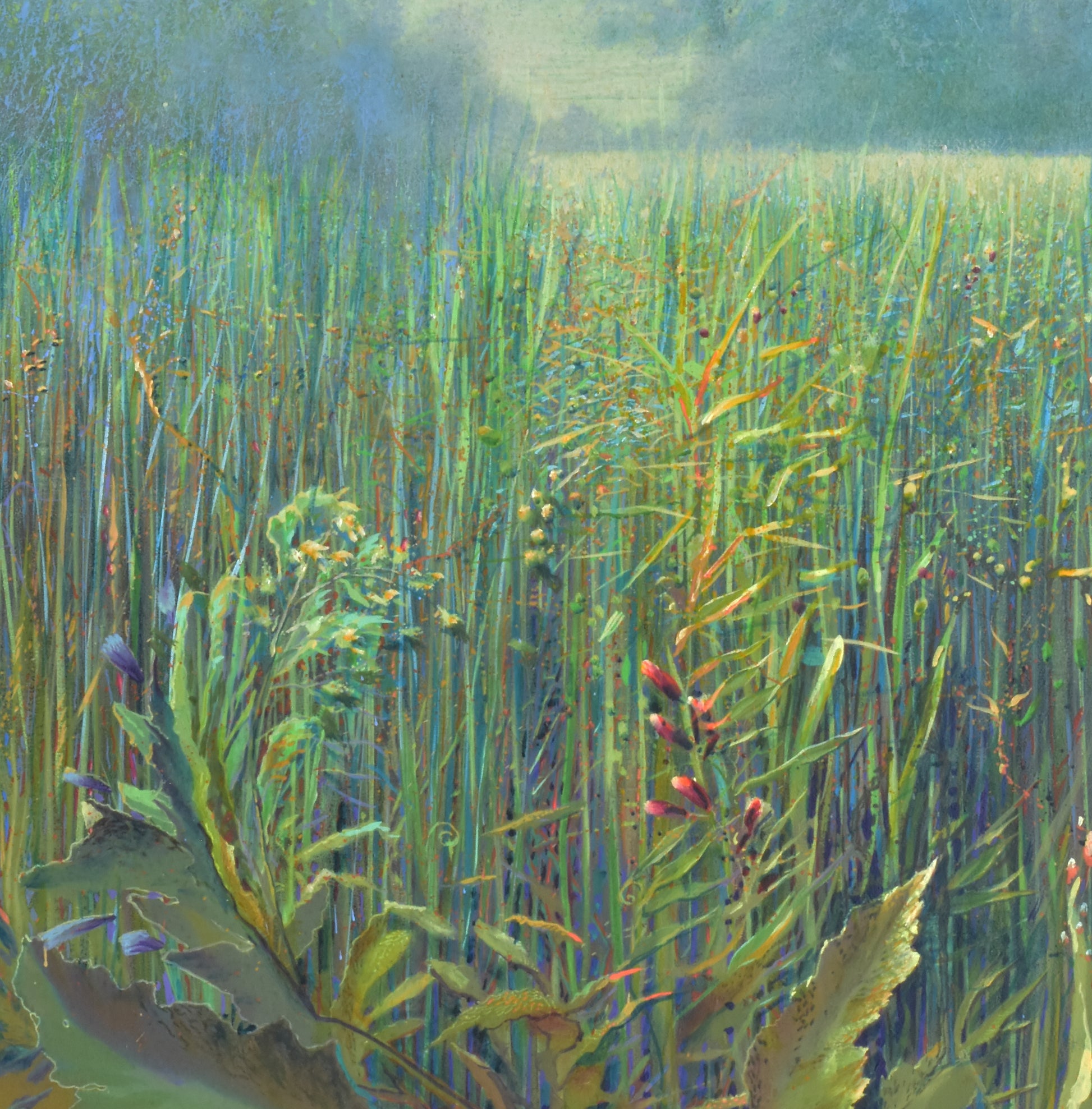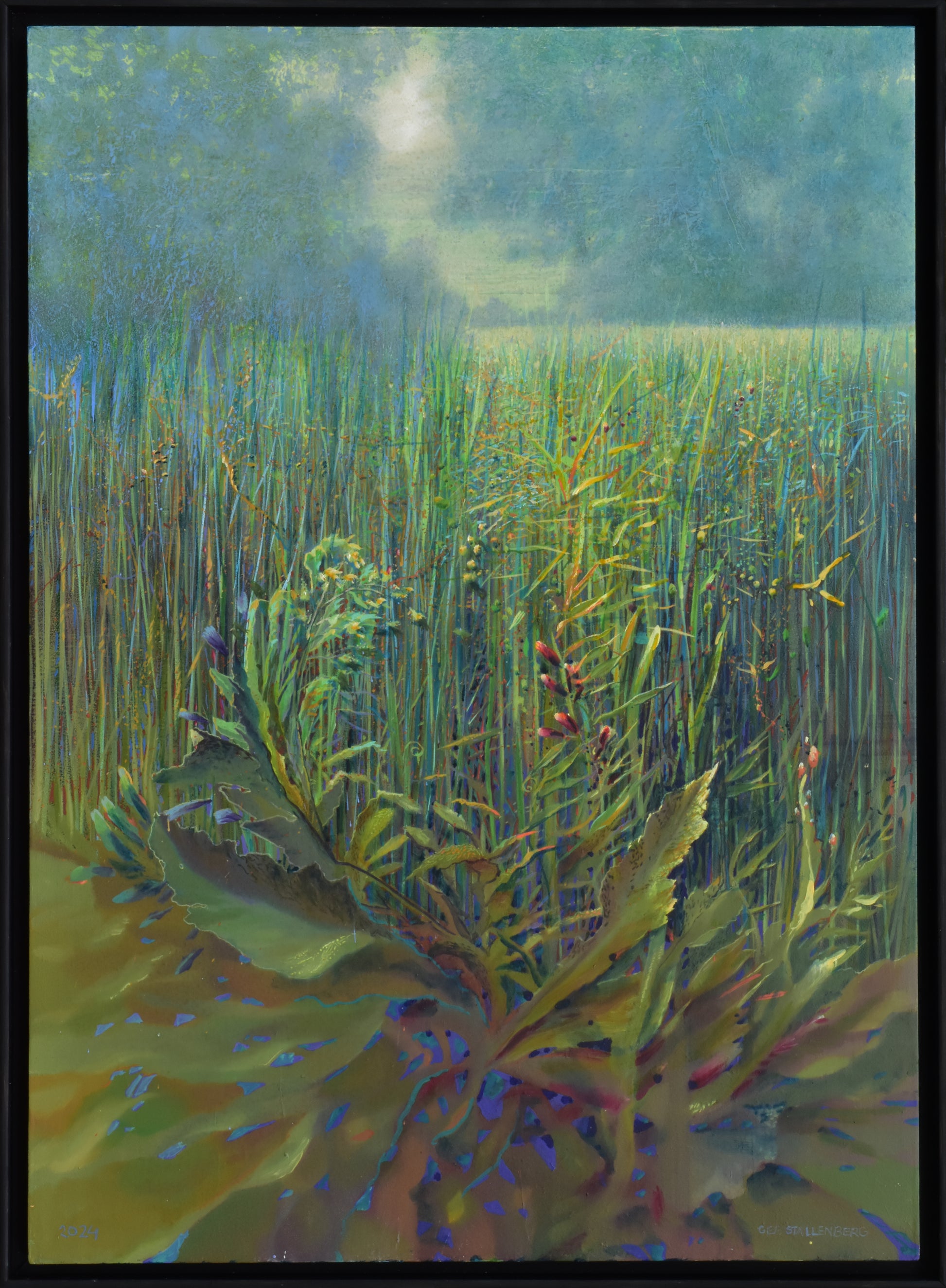 Dit olieverf op paneel schilderij van 47 x 63 cm is ontstaan over een periode van drie jaar. Na mijn verhuizing naar België was het mogelijk om het af te maken, doordat ik vanuit mijn atelierraam uitzicht heb op een bloemenweide en een coulissen landschap. Wat ik wilde is dat je als toeschouwer opgenomen bent in het landschap. Daarbij kijk ik ook graag van korte afstand naar het schilderij, zodat alle kleuropbouw en gelaagdheid zichtbaar wordt.