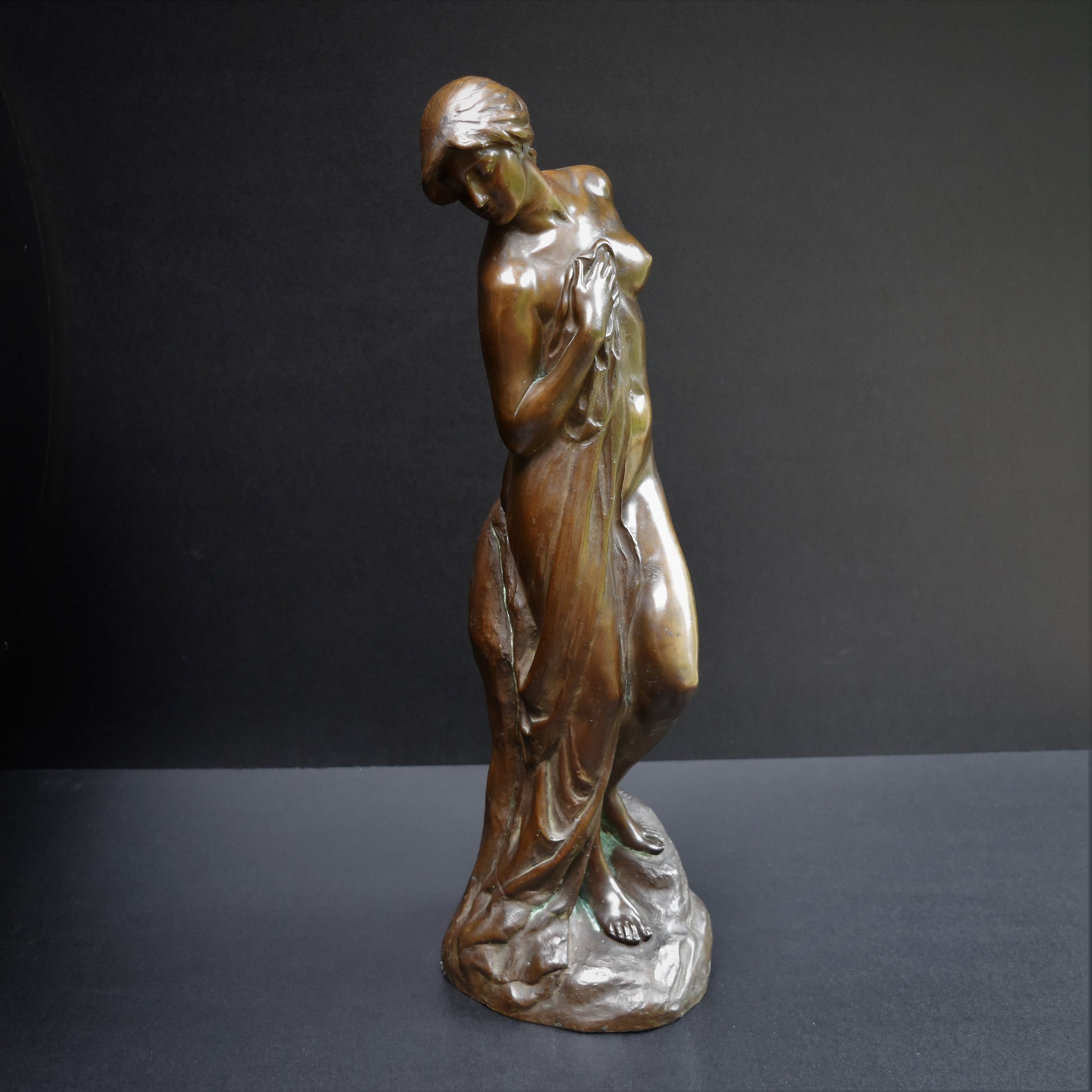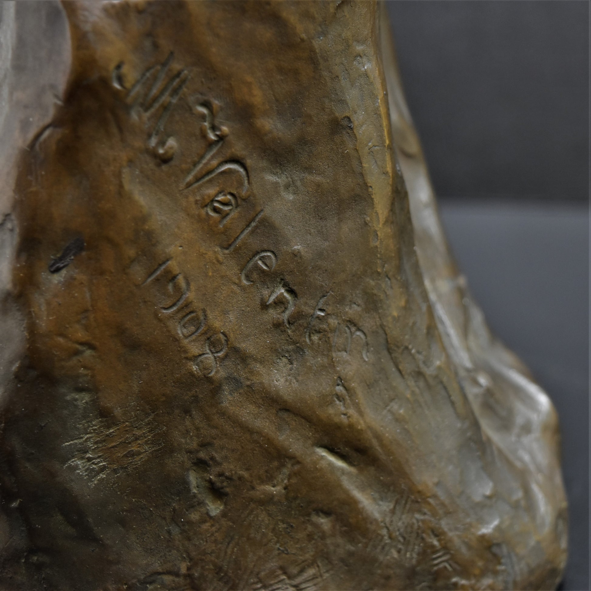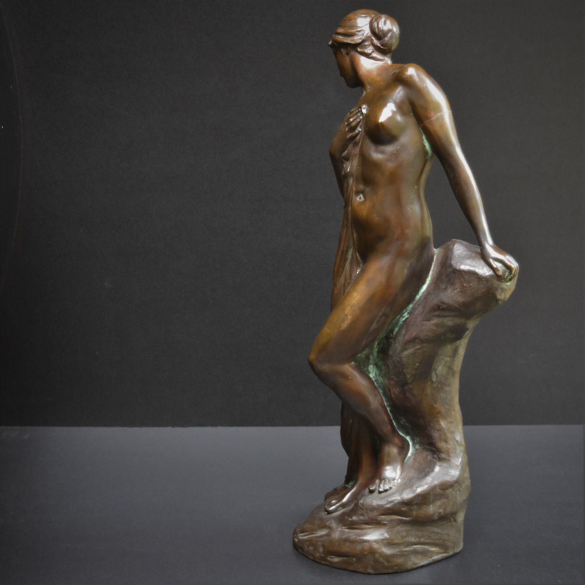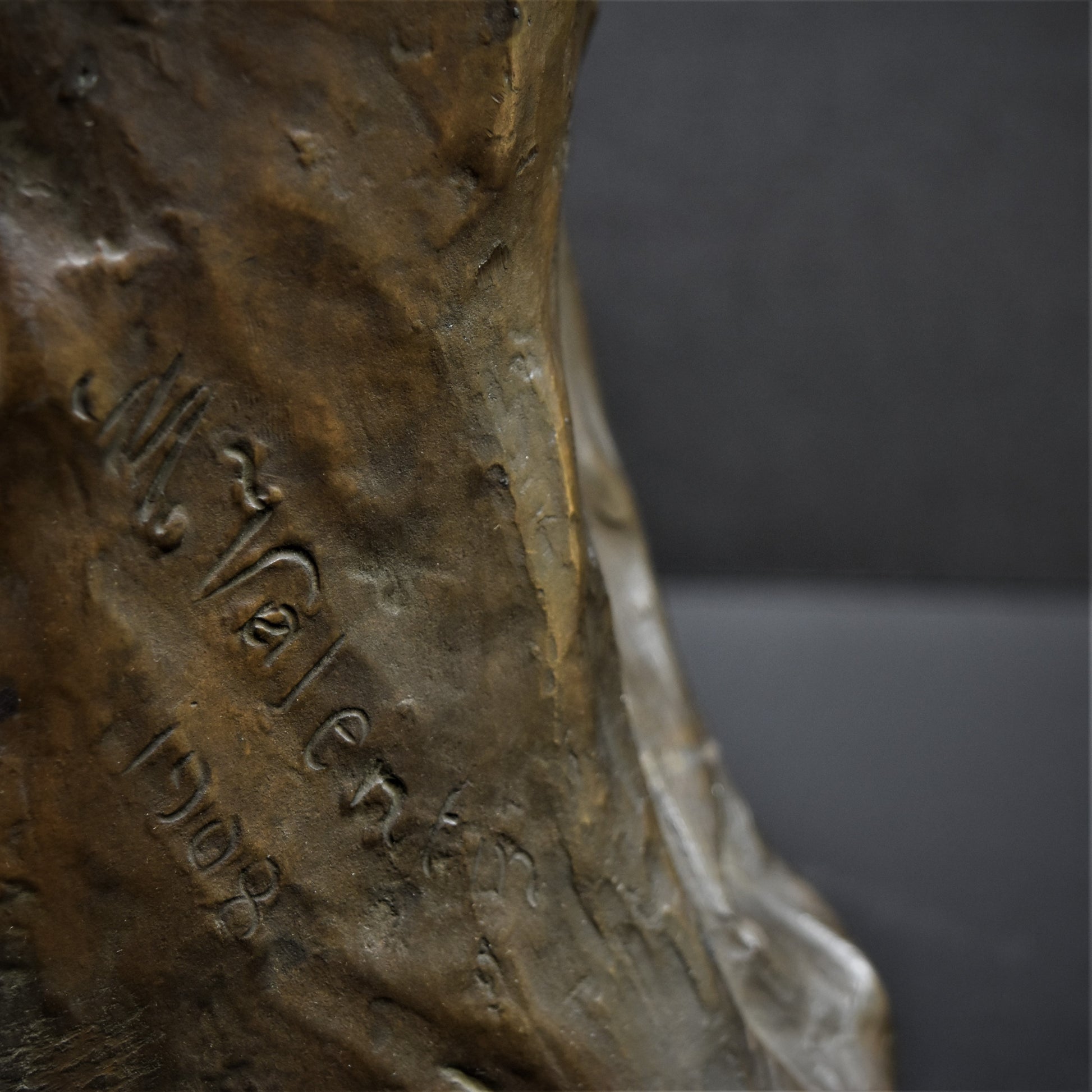 Bather. A classic theme in which the pure beauty of the female body is the subject. It is up to the artist to give that an extra dimension. Max Valentin has succeeded very well in this. Because of the downward gaze and the serene appearance, we see a woman who muses about life, while no one is around so she can be 100% herself. The statue is dated 1908 and provided with a dedication; We remember the date of 19.XI.08 with the officials of the AG form. Carl Funk.