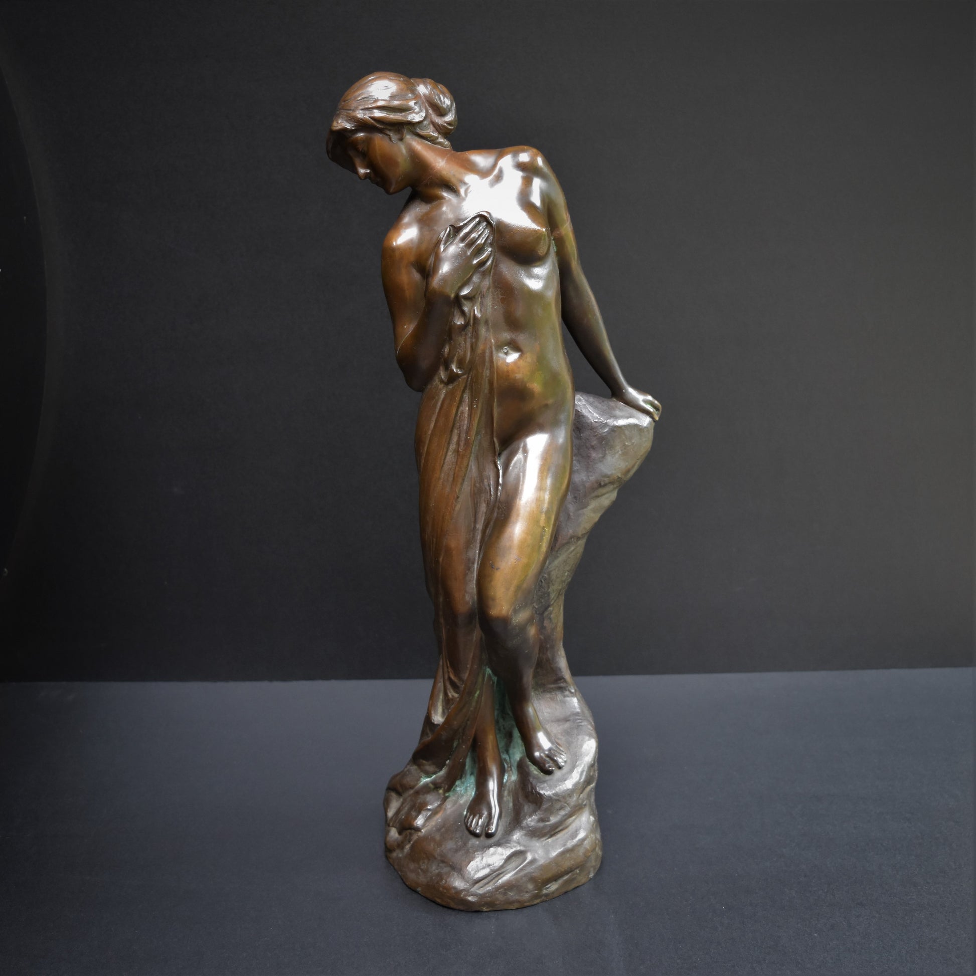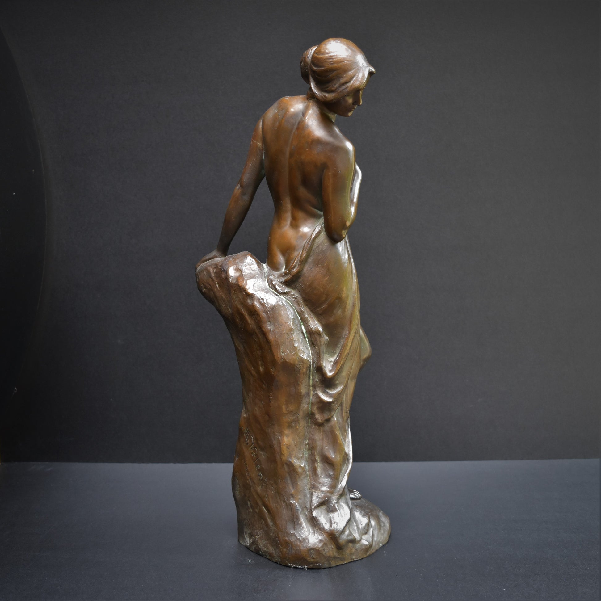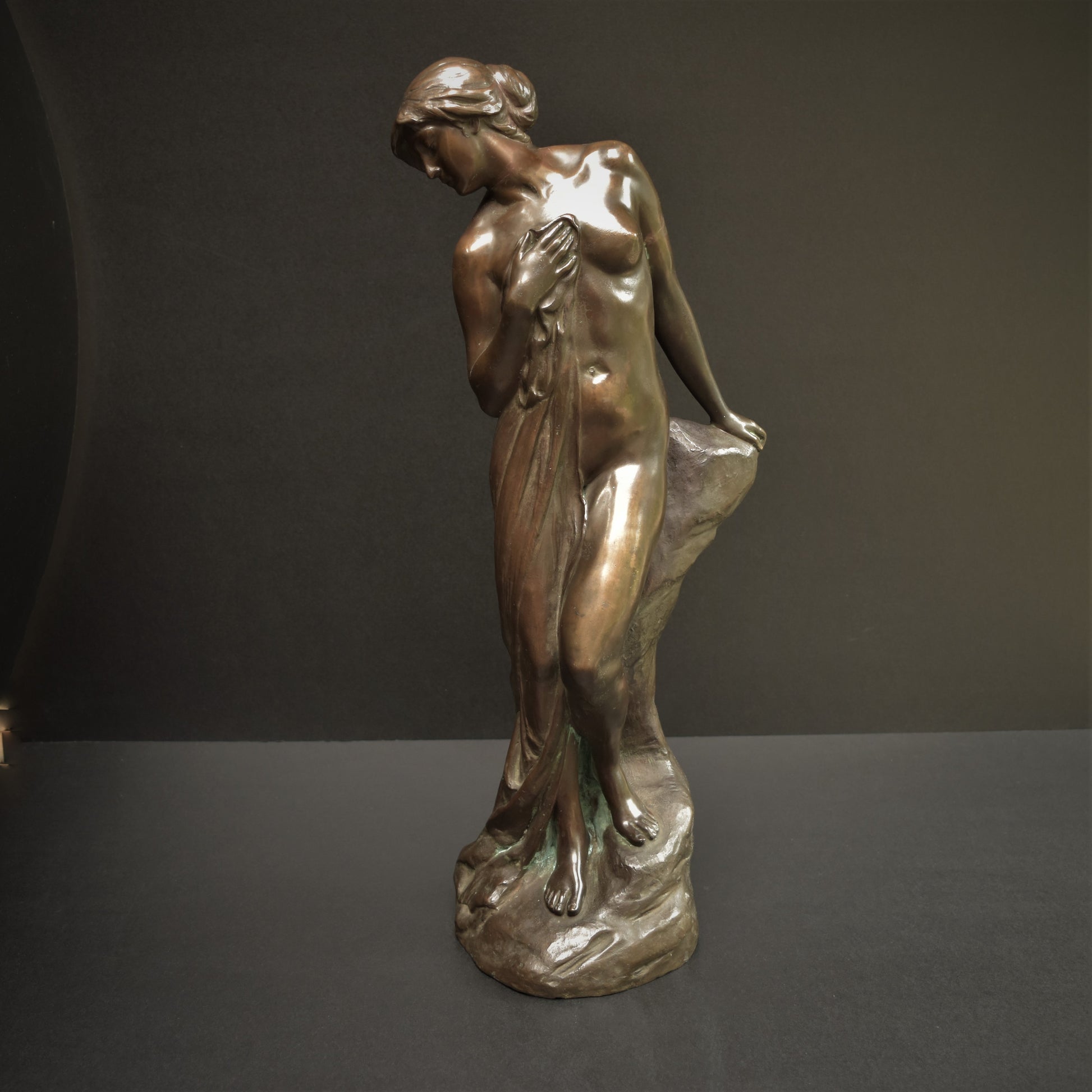 Bather. A classic theme in which the pure beauty of the female body is the subject. It is up to the artist to give that an extra dimension. Max Valentin has succeeded very well in this. Because of the downward gaze and the serene appearance, we see a woman who muses about life, while no one is around so she can be 100% herself. The statue is dated 1908 and provided with a dedication; We remember the date of 19.XI.08 with the officials of the AG form. Carl Funk.