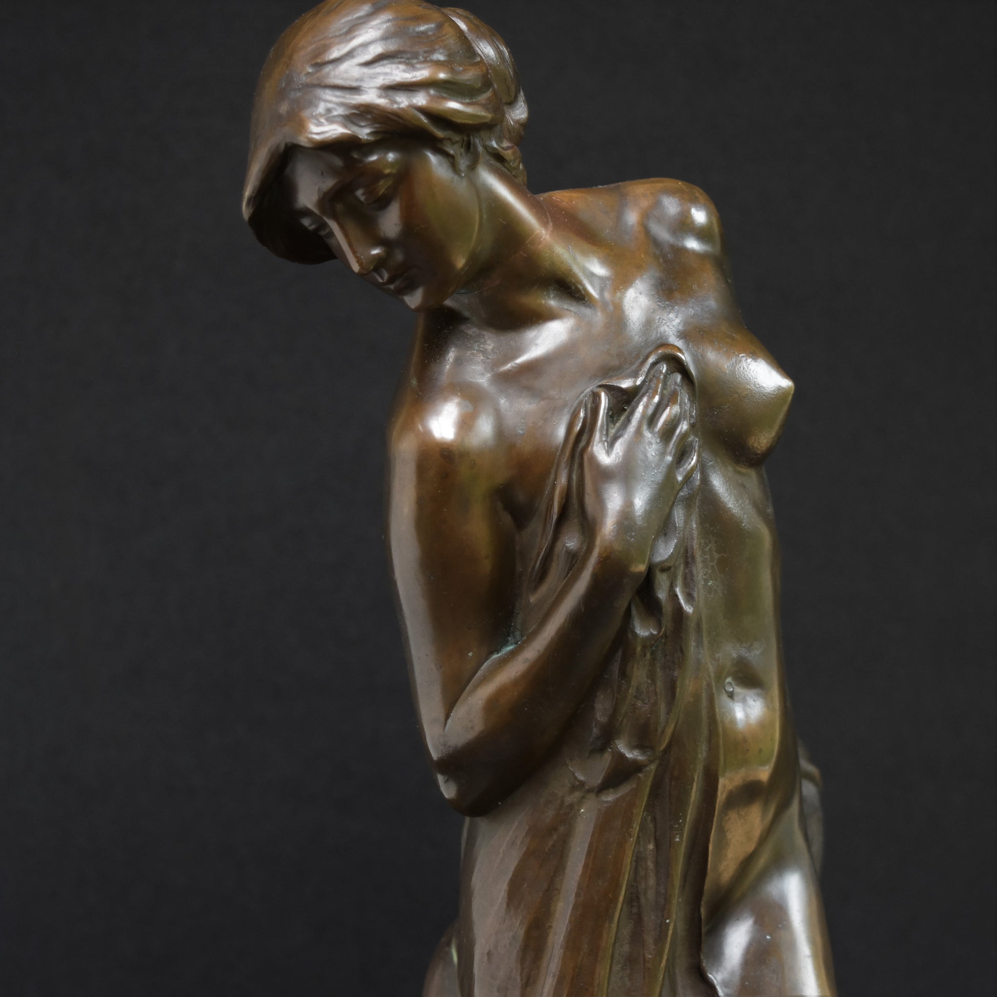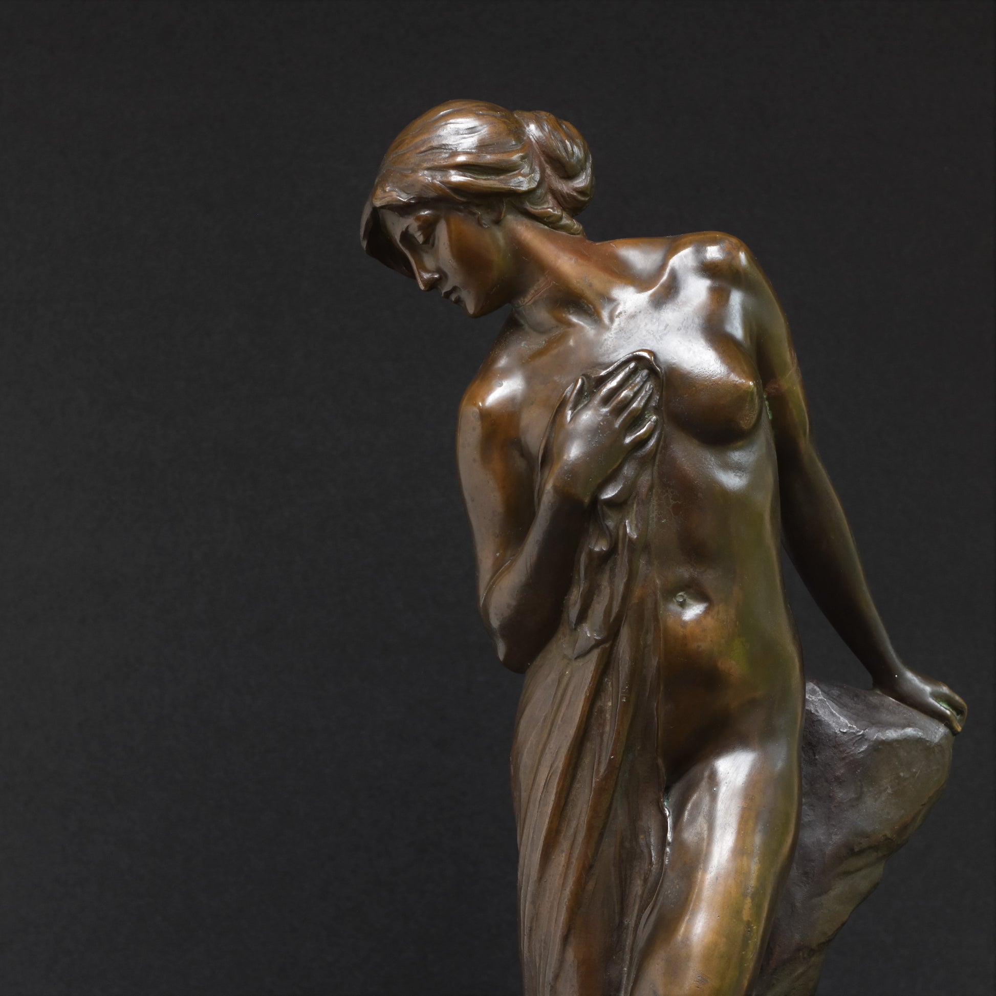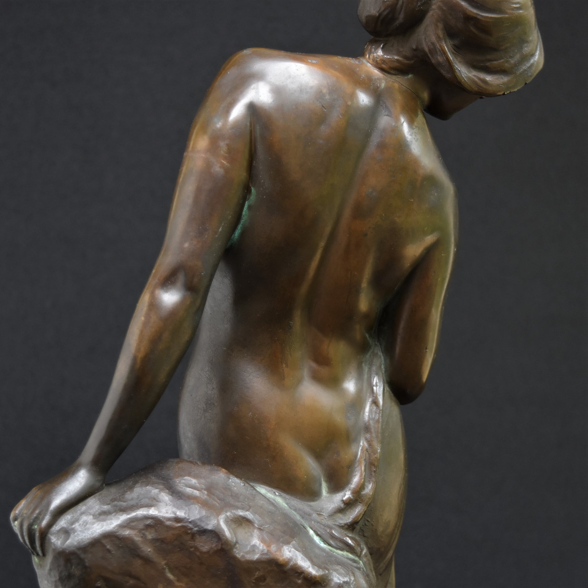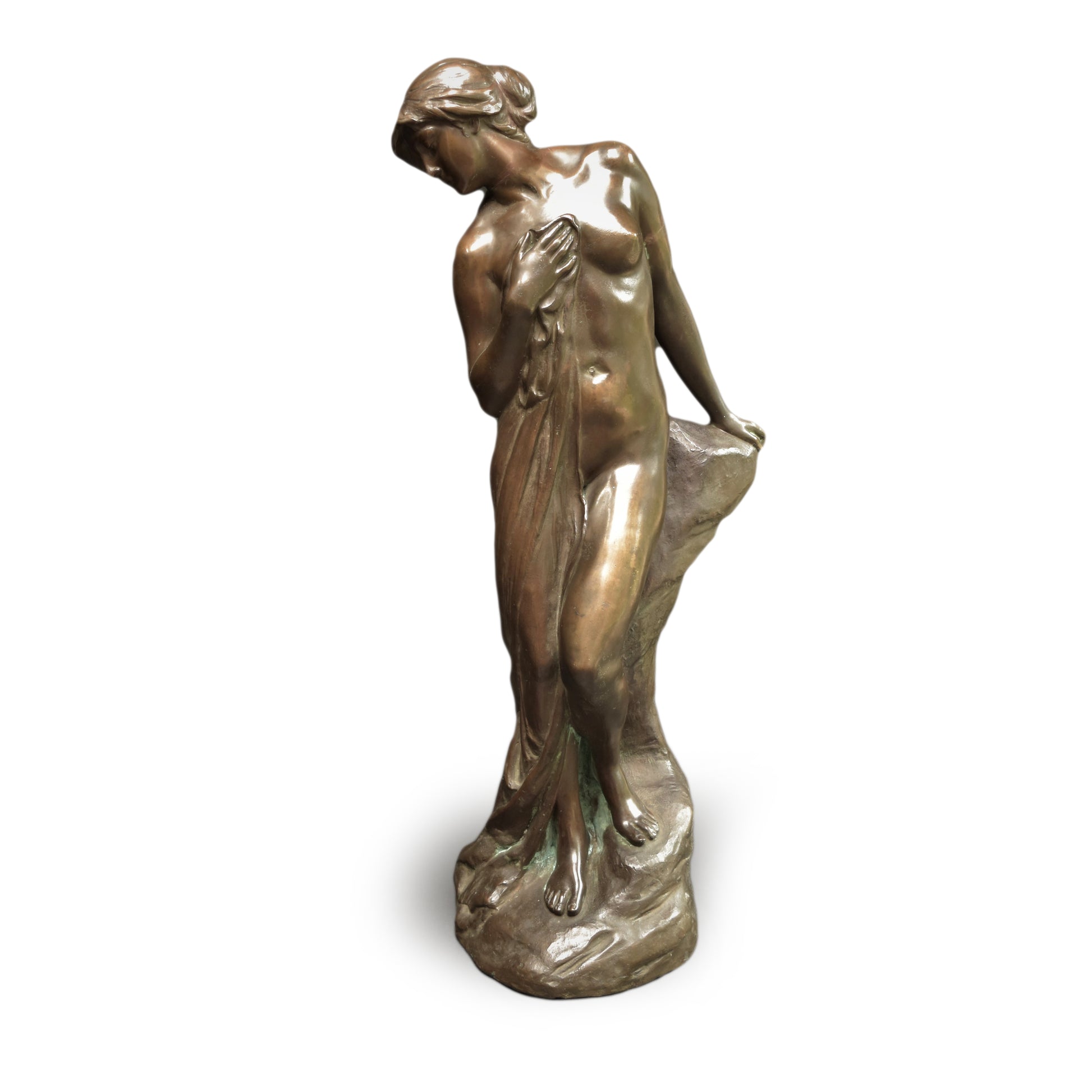 Bather. A classic theme in which the pure beauty of the female body is the subject. It is up to the artist to give that an extra dimension. Max Valentin has succeeded very well in this. Because of the downward gaze and the serene appearance, we see a woman who muses about life, while no one is around so she can be 100% herself. The statue is dated 1908 and provided with a dedication; We remember the date of 19.XI.08 with the officials of the AG form. Carl Funk.