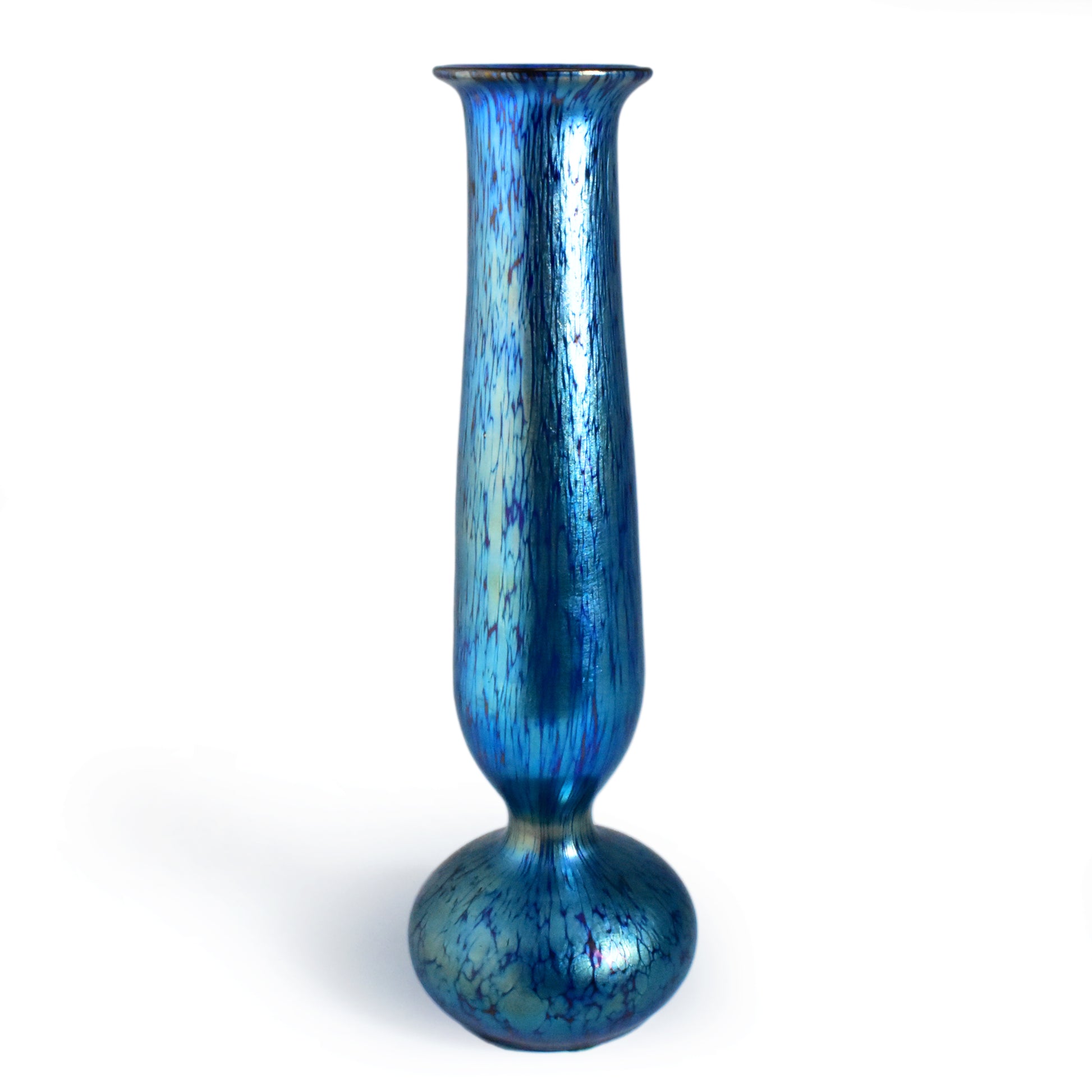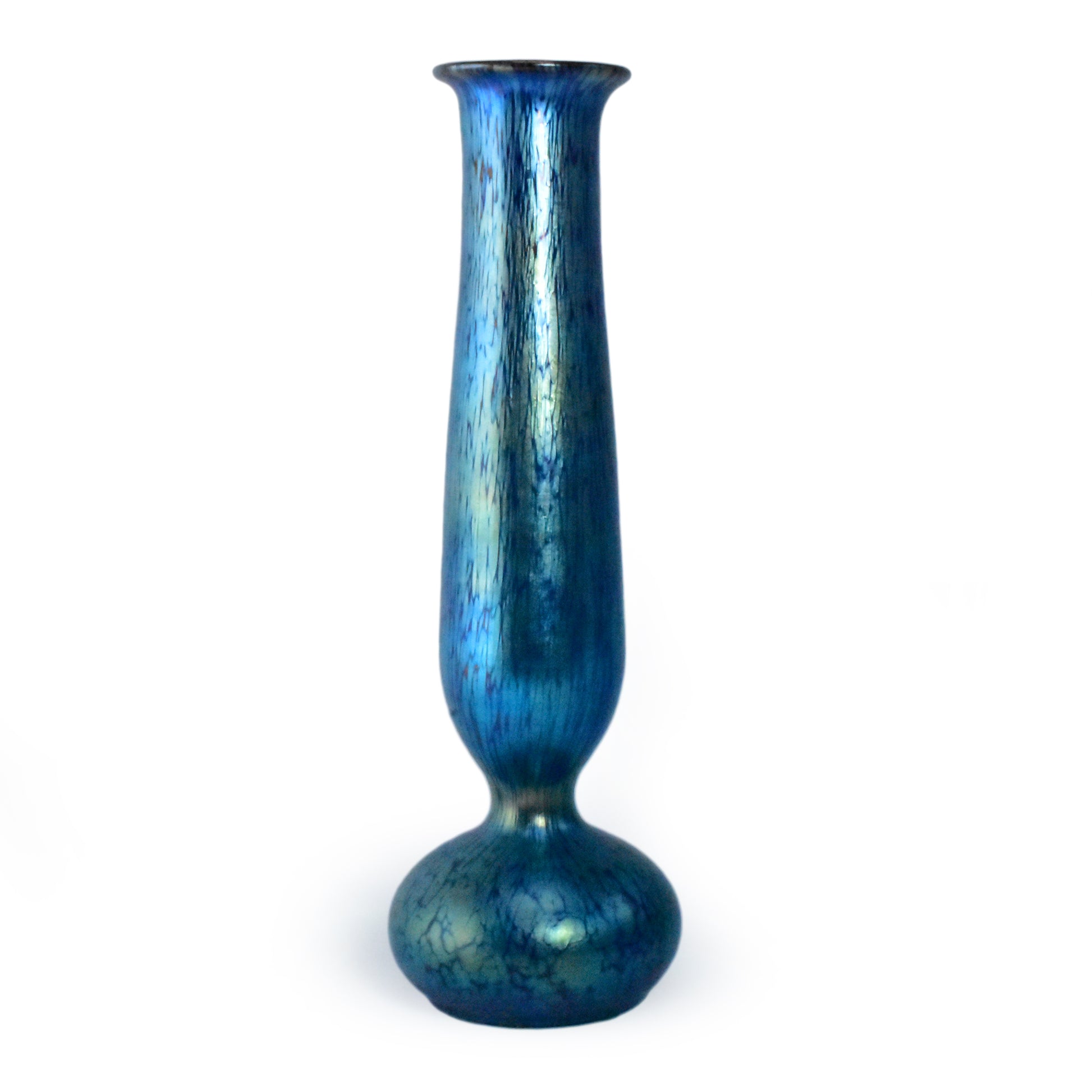 Beautifully elegantly shaped cobalt papillon vase from Loetz model 699 (see last photo). This decor on the deep cobalt colored glass was very successful. Beautiful deep metal reflection. The vase fits beautifully in a group because of its slim, high, yet modern-looking shape.