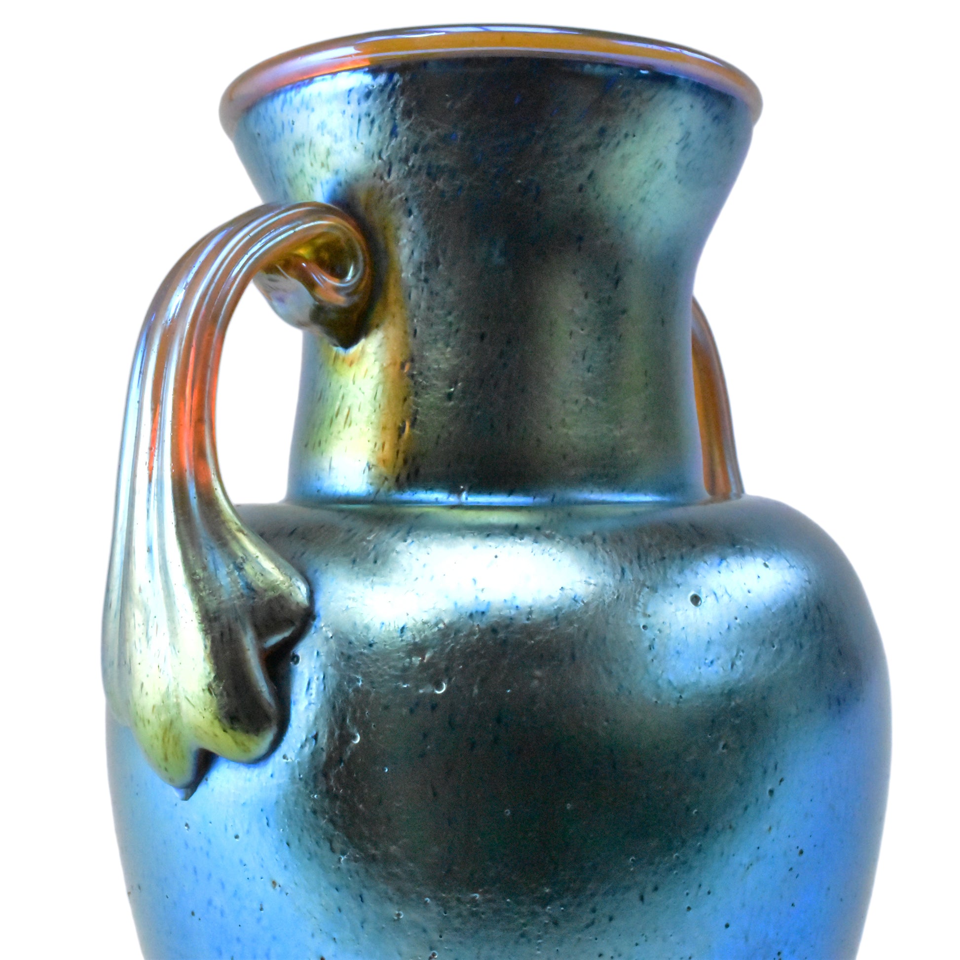 The fact that ancient Roman glass was one of the most important sources of inspiration for Loetz's Art Nouveau glass is not only reflected in the iridescence. The silver iridescence is comparable to Roman glass-soil finds. Glass that has been affected by salts from the earth for centuries also shows a strong iridescent metallic luster. But here we also see the influence of antique glass in the shape and the handles or handles.