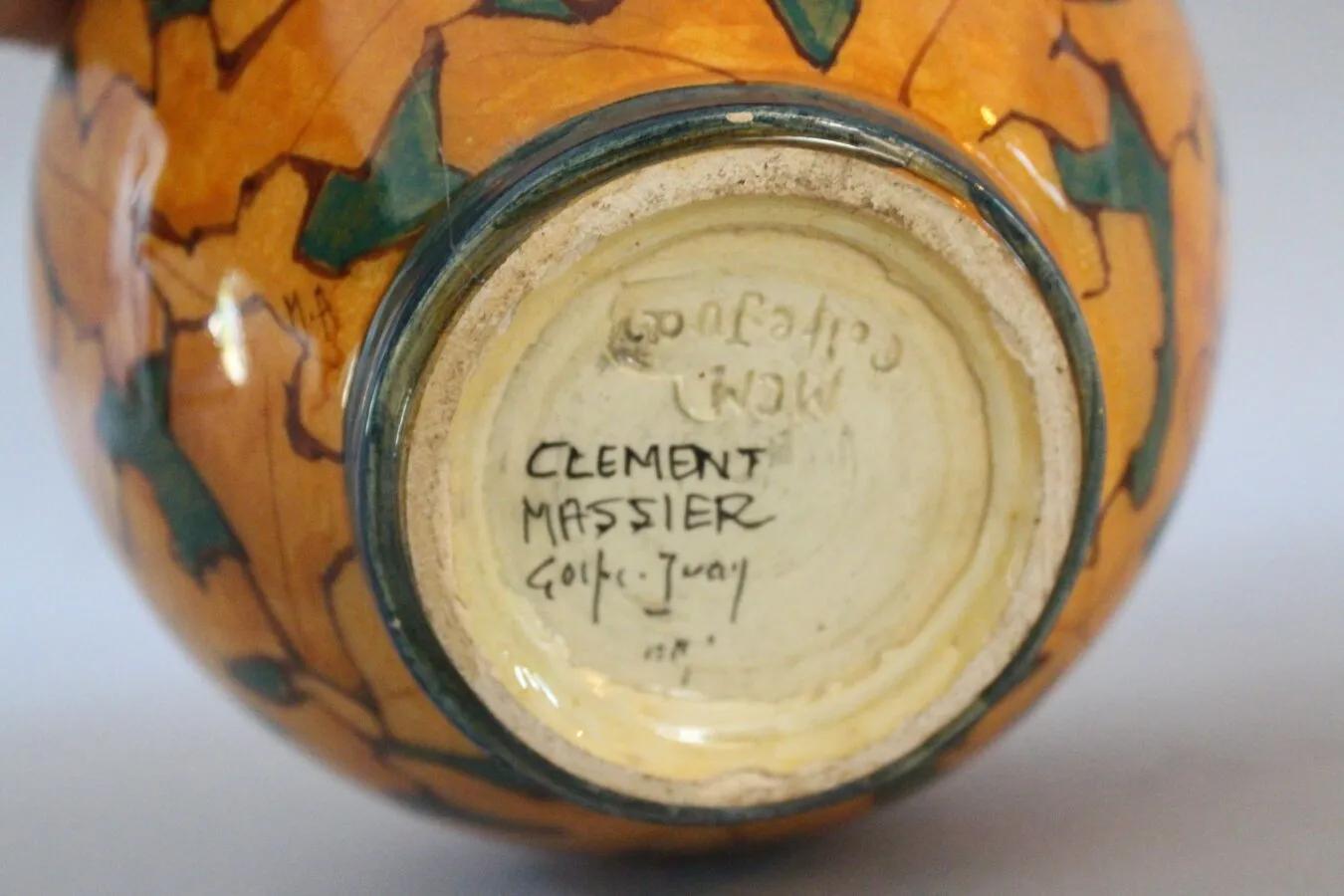 Een kleine cachepot van Clement Massier met een overlappend decor van herfstbladeren op een groene achtergrond. Gemaakt in het jaar 1900. De reliefstempel laat de M van zijn overleden vrouw Marie zien, dat was in het jaar1900. 125 jaar oud en nog steeds modern.