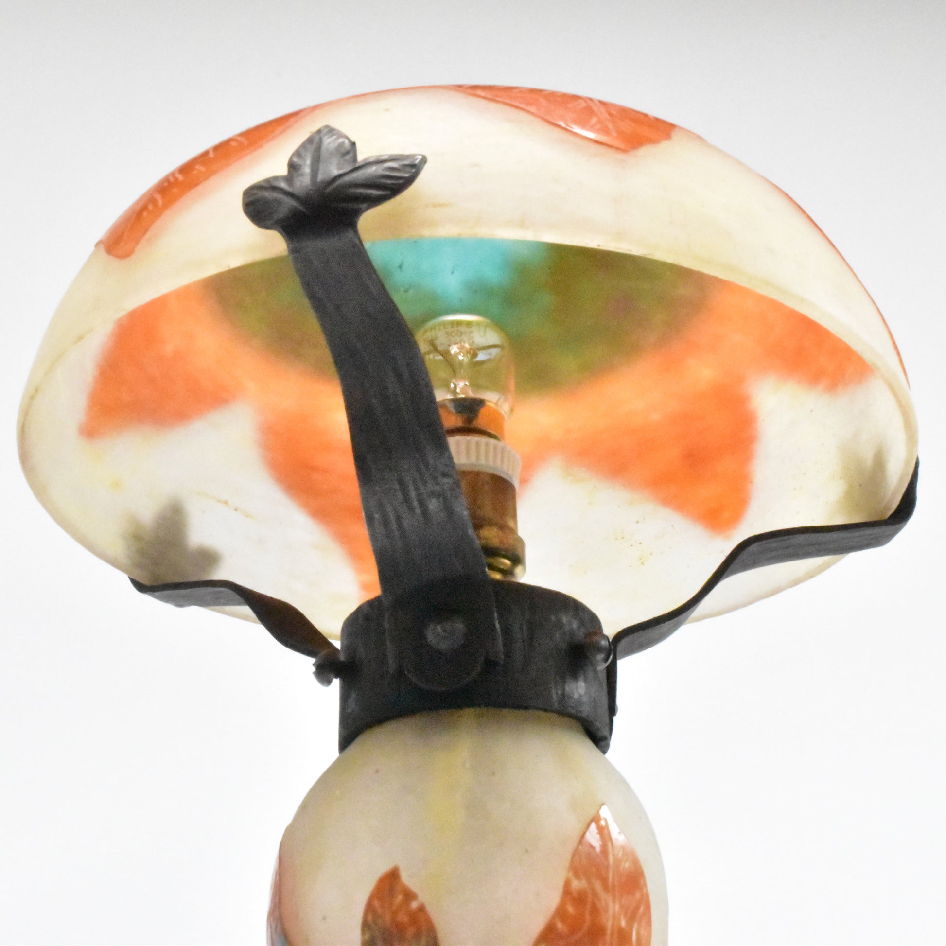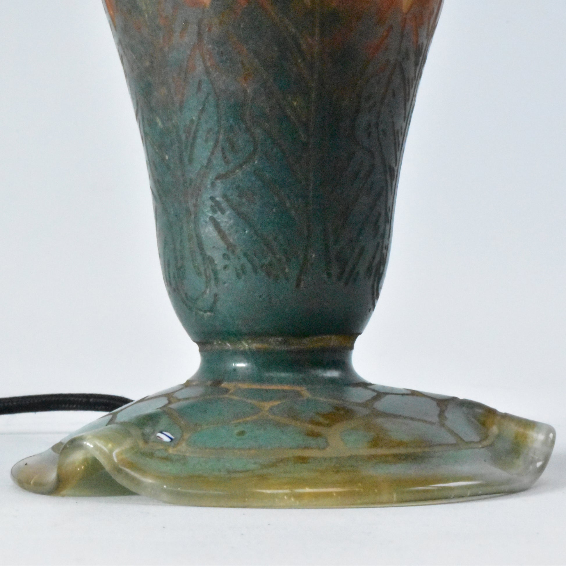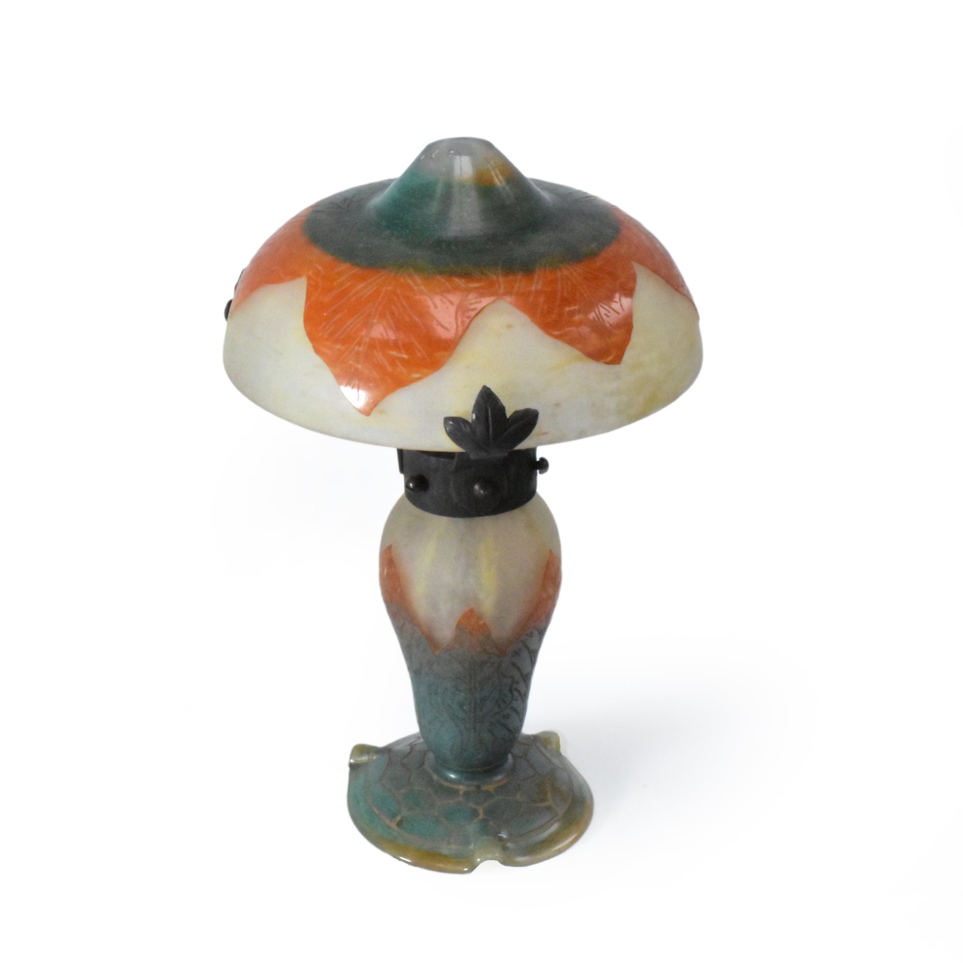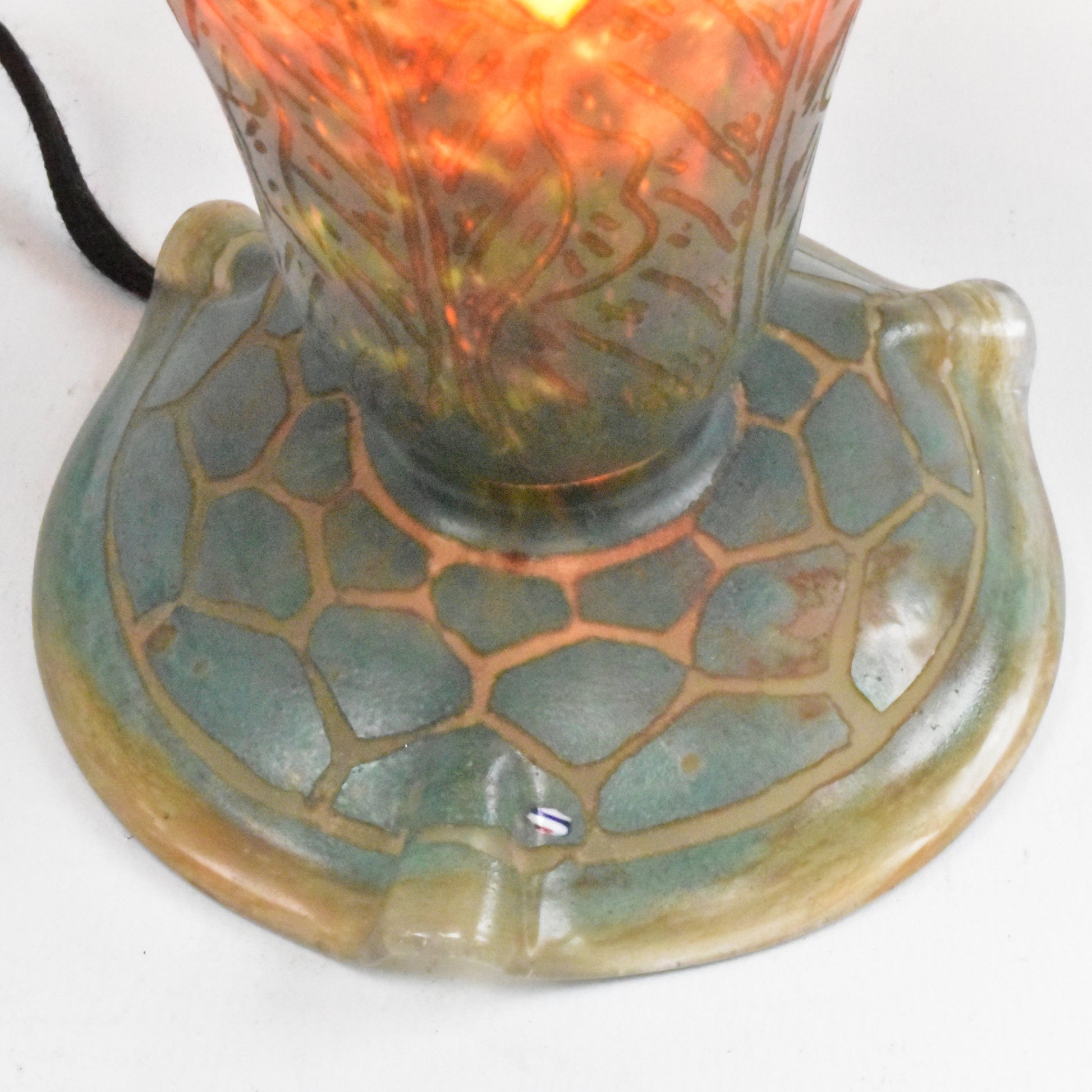 Dit prachtige lampje is gesigneerd met de Berlingot op de basis van de lampvoet. Het lampje is geheel origineel met een fitting in de voet en eentje in de kap. De fittingen zijn geschikt voor kleine schroefdraad lampen, die gemakkelijk in LED verkrijgbaar zijn. Het meest bijzondere aan dit mooi gekleurde lampje is het kleine formaat, dat dit stuk van Le Verre Francais extra aimable maakt.