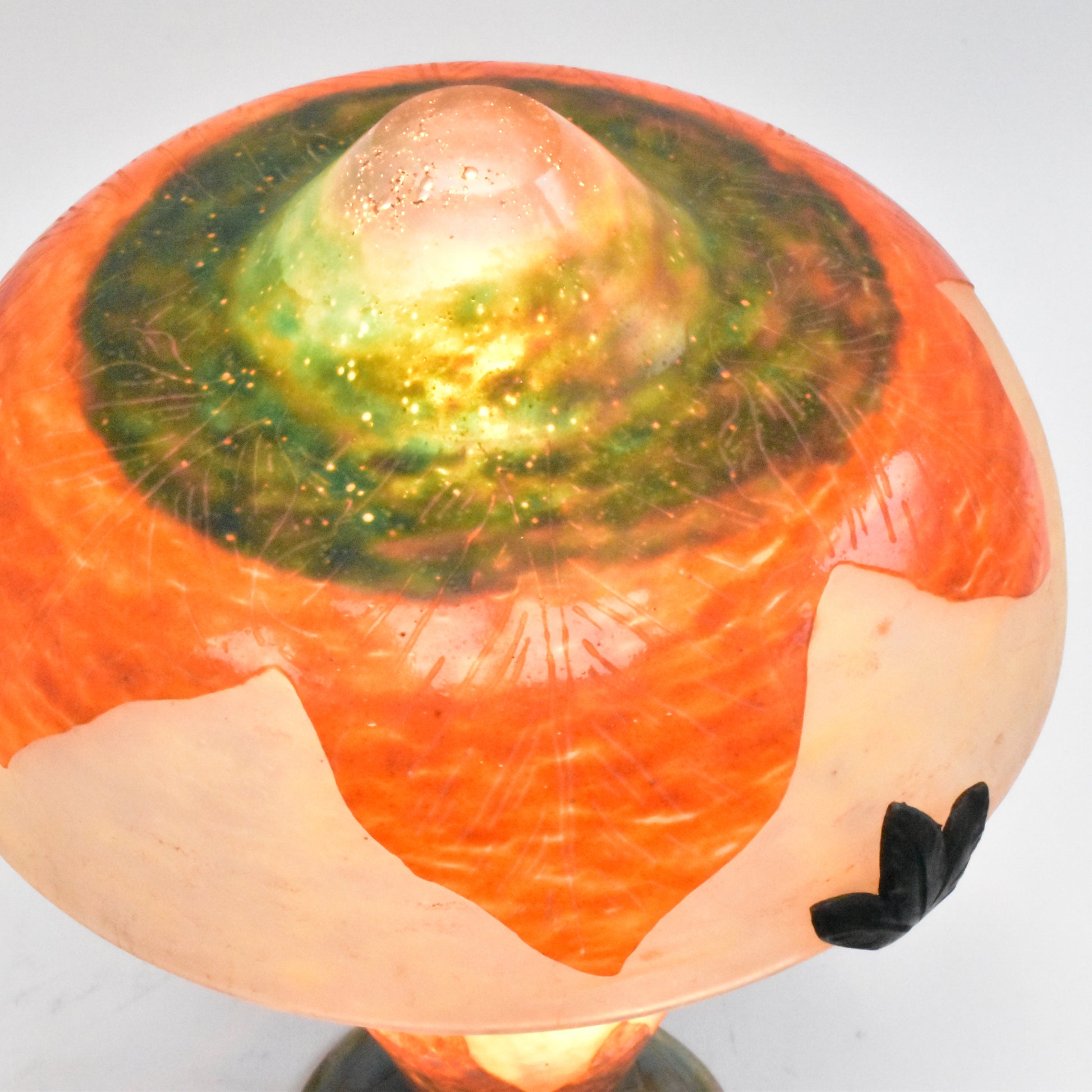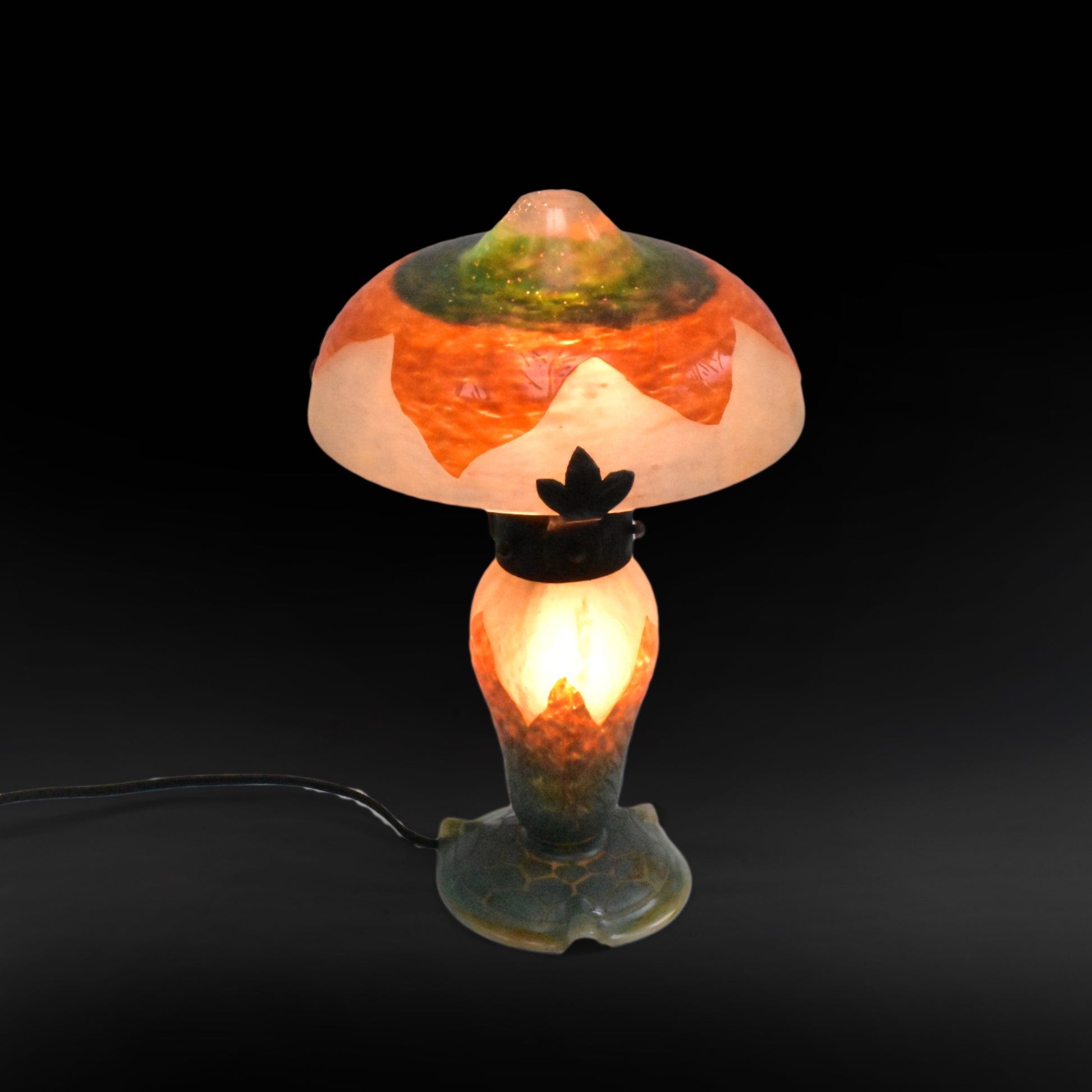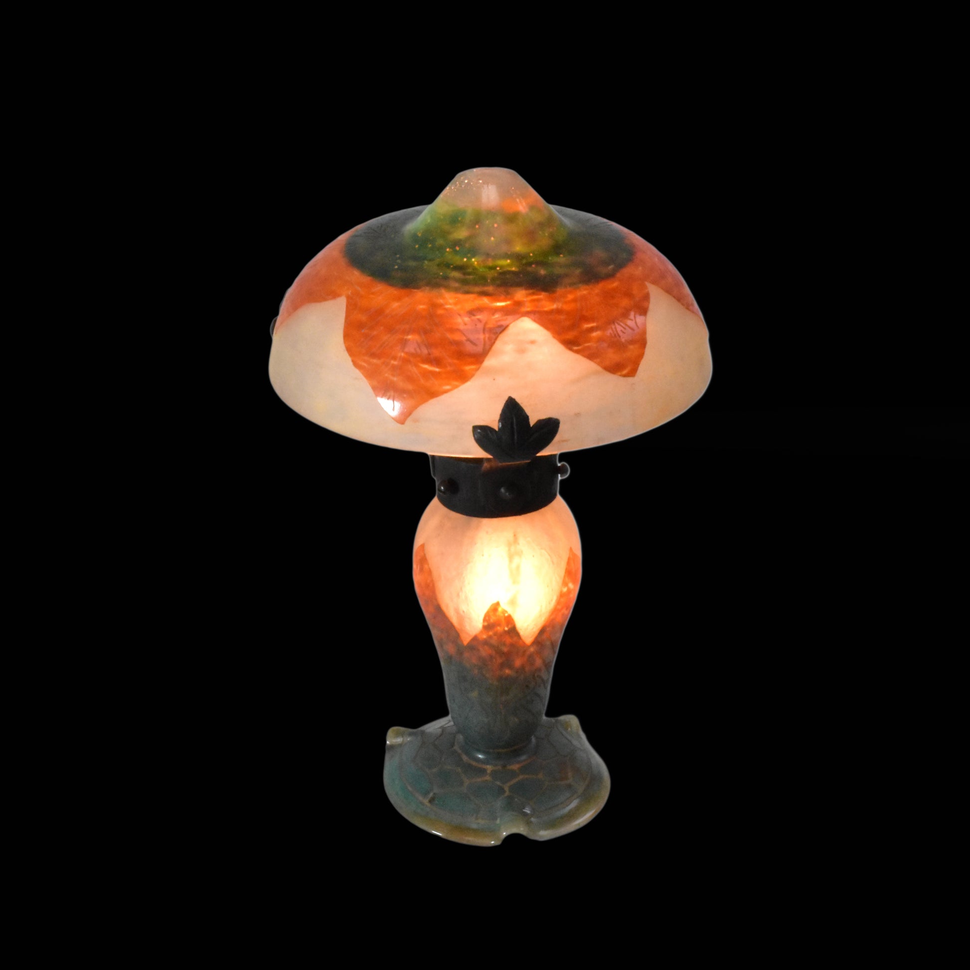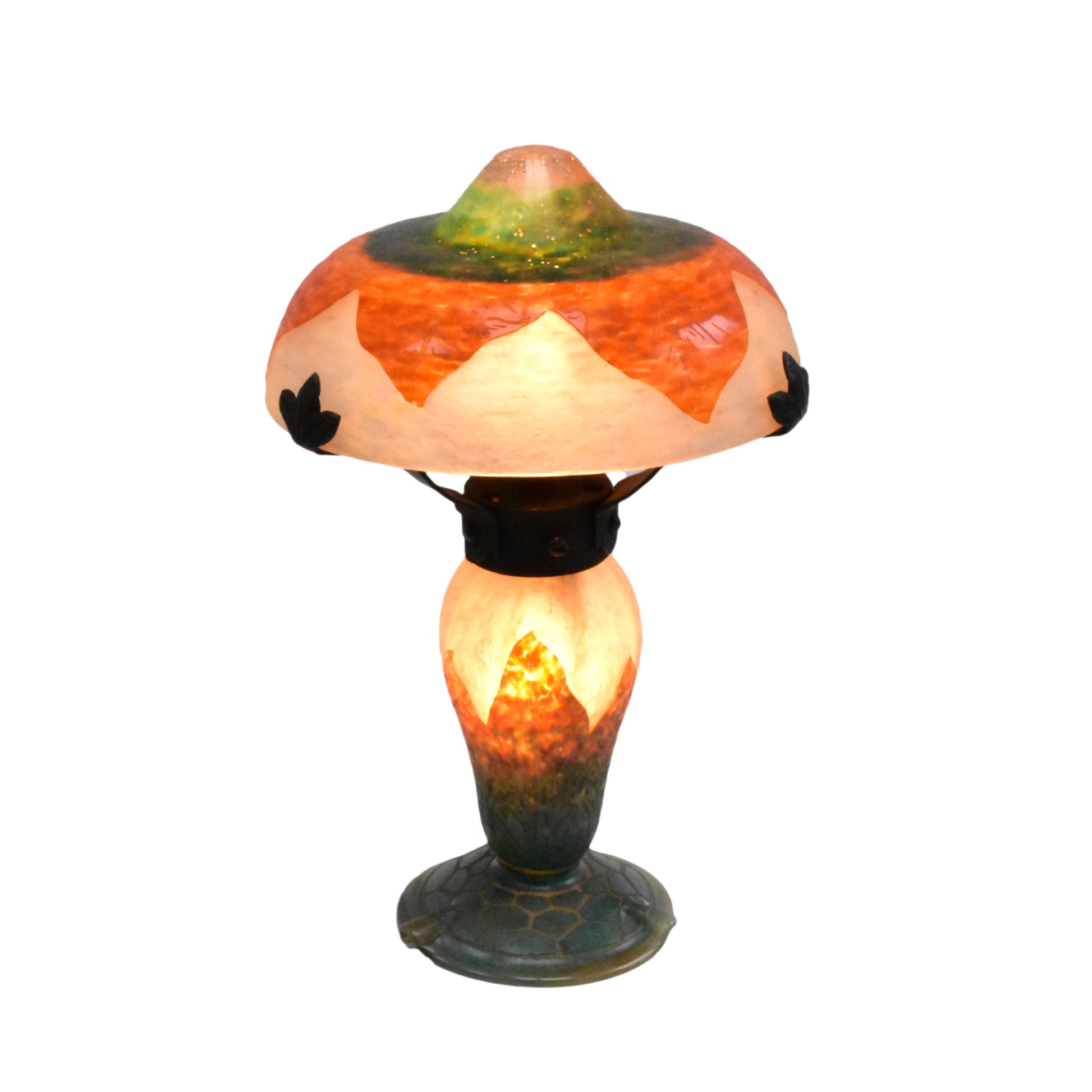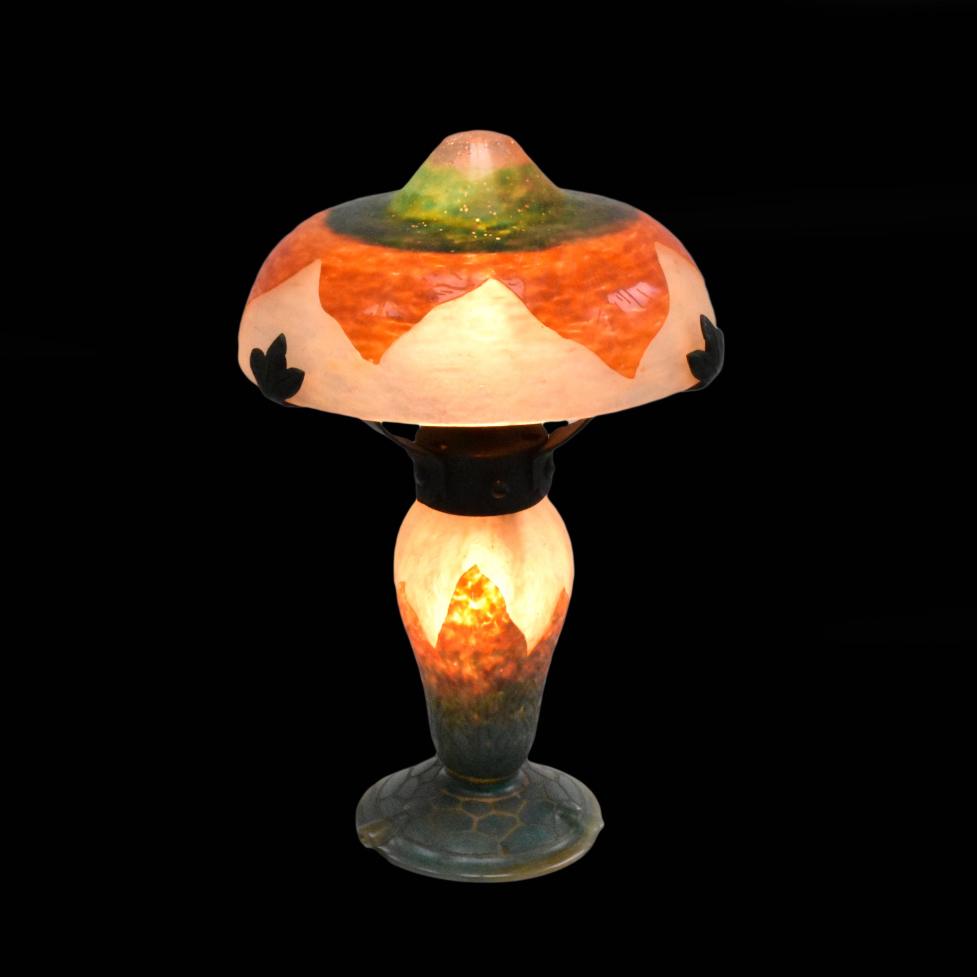 Dit prachtige lampje is gesigneerd met de Berlingot op de basis van de lampvoet. Het lampje is geheel origineel met een fitting in de voet en eentje in de kap. De fittingen zijn geschikt voor kleine schroefdraad lampen, die gemakkelijk in LED verkrijgbaar zijn. Het meest bijzondere aan dit mooi gekleurde lampje is het kleine formaat, dat dit stuk van Le Verre Francais extra aimable maakt.