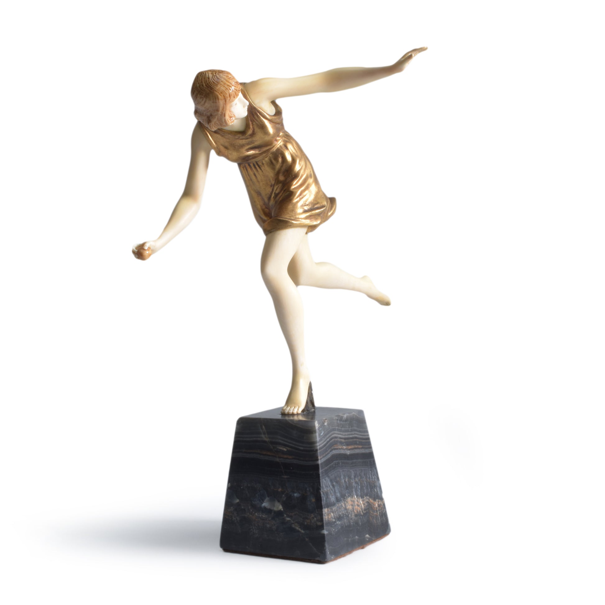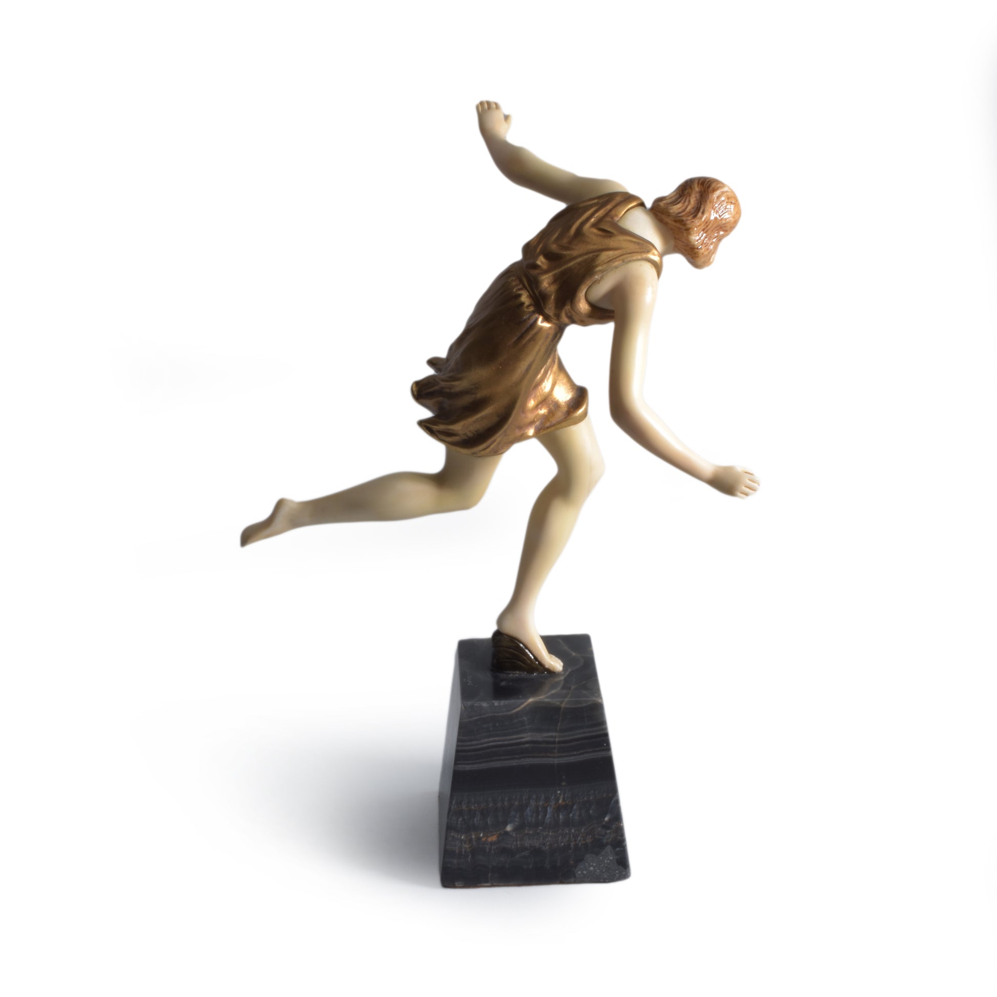Chryselefantine Sculpture by Pierre Le Faguays. Instead of a classical representation, the artist opts for an action of a modern young woman exercising. Onyx pedestal.