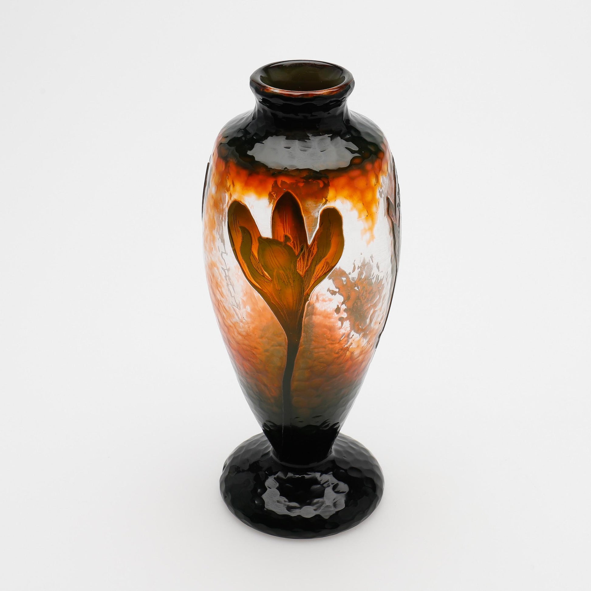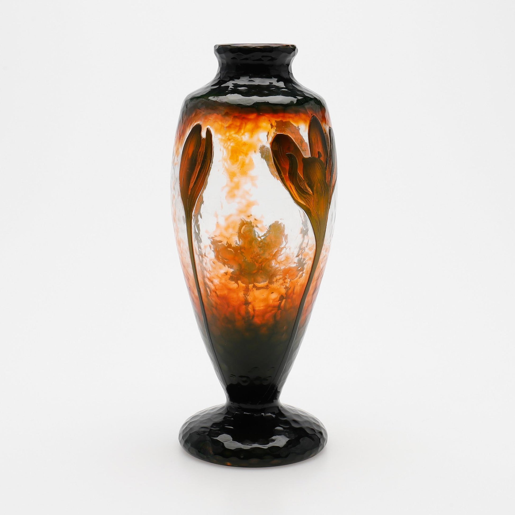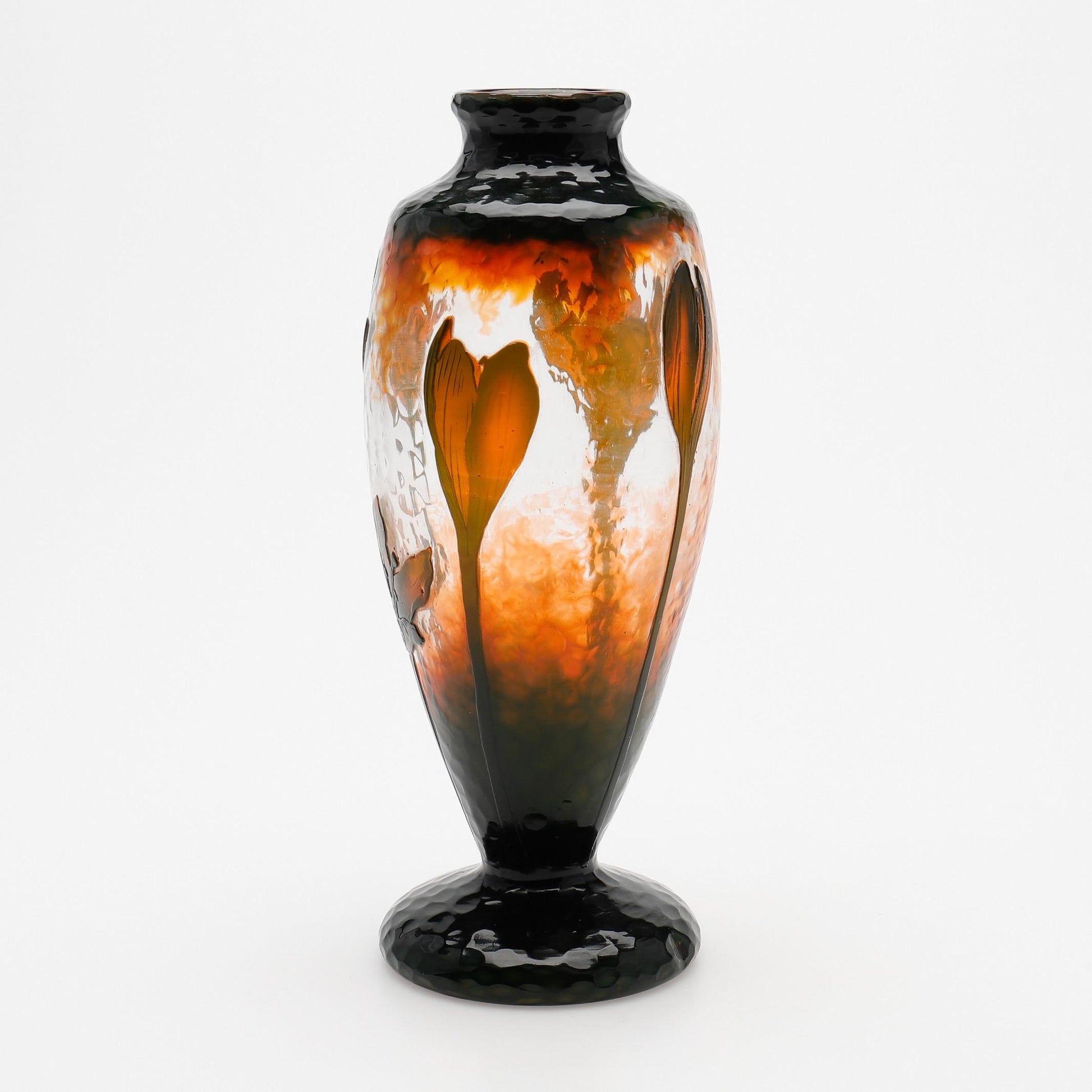 Early vase by Daum. A clear glass base with a red glass layer on top and a green glass layer on top. In addition to partially etching away the glass layers, a lot has been ground away with the diamond wheel. In the flowers this is done very subtly and gradually and in the background with a torturelé (hammer) effect. In transmitted light the vase is mainly warm in color, and in incident light it is mainly green. A very special effect.
