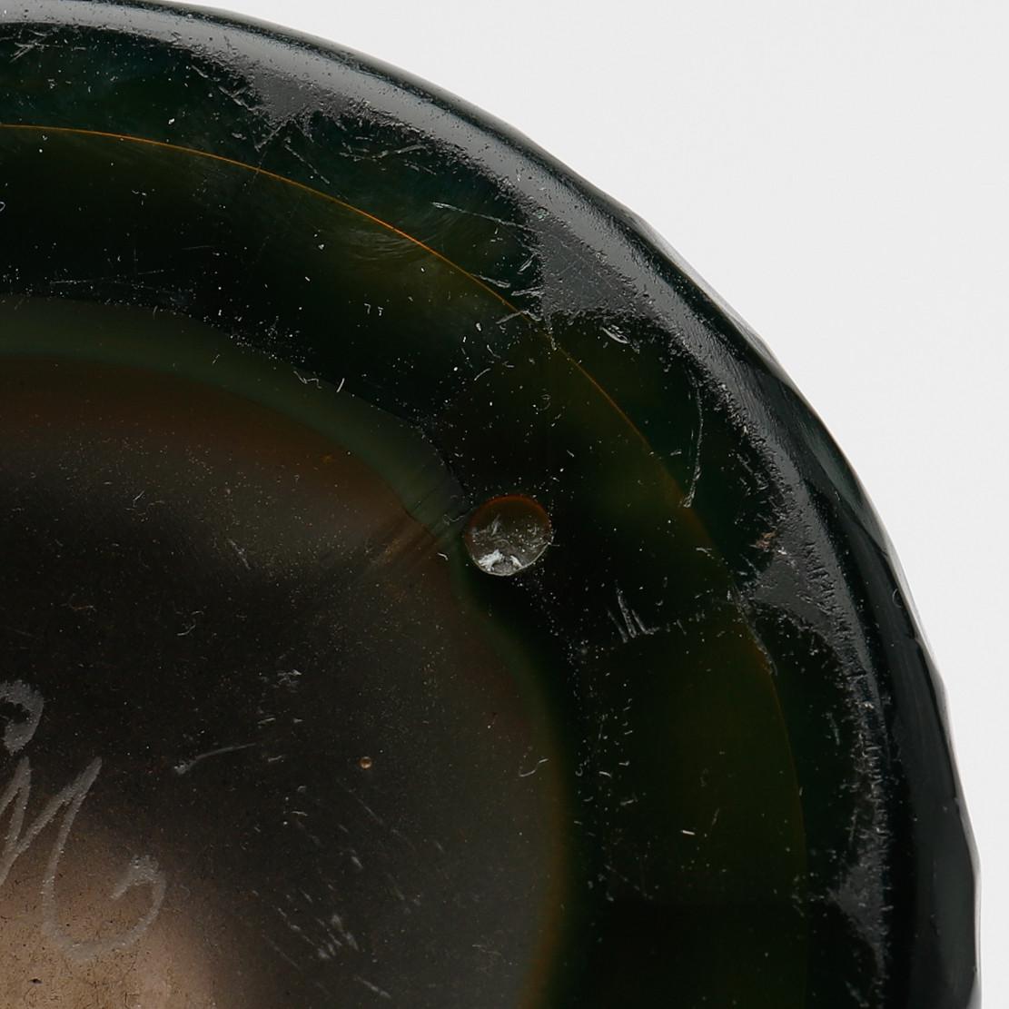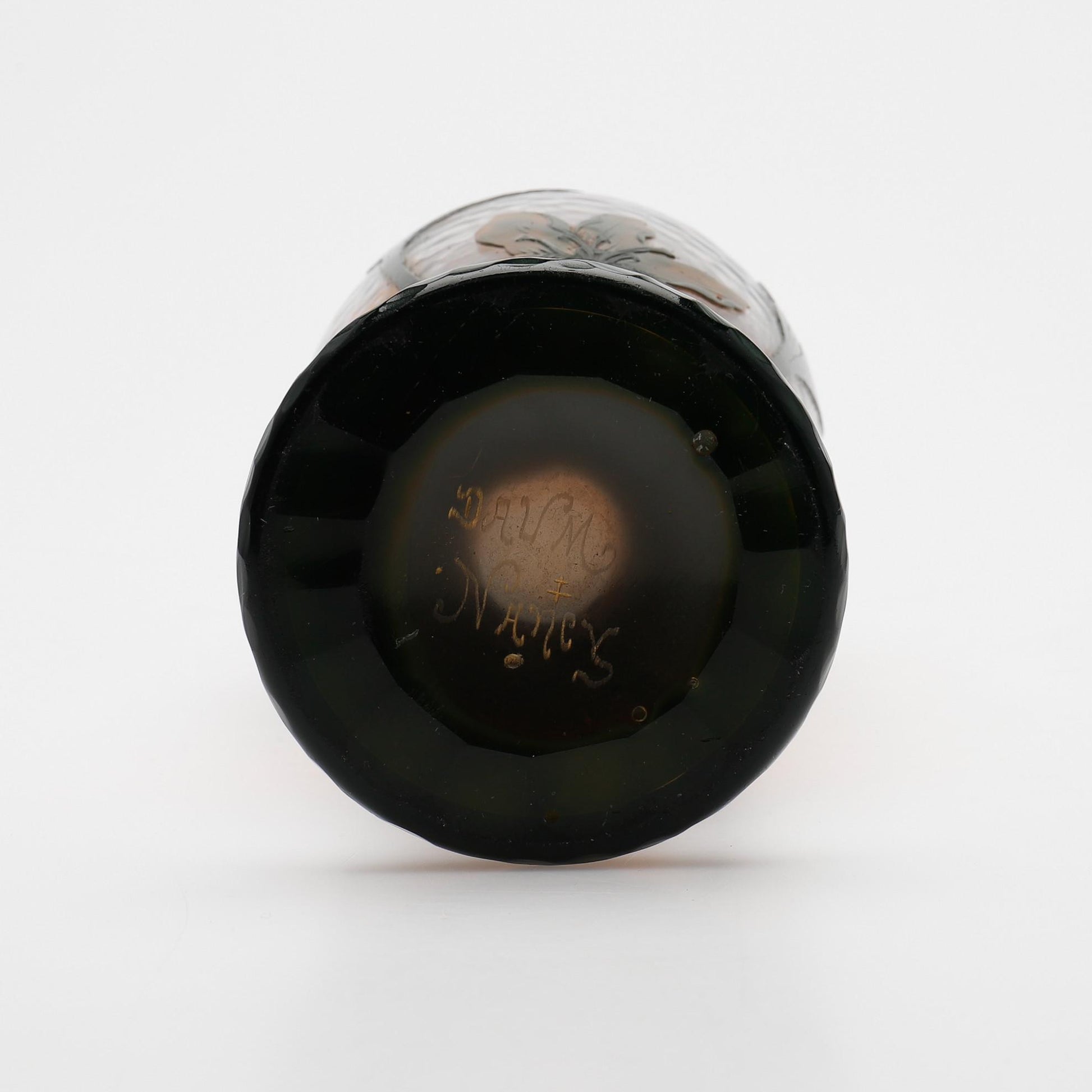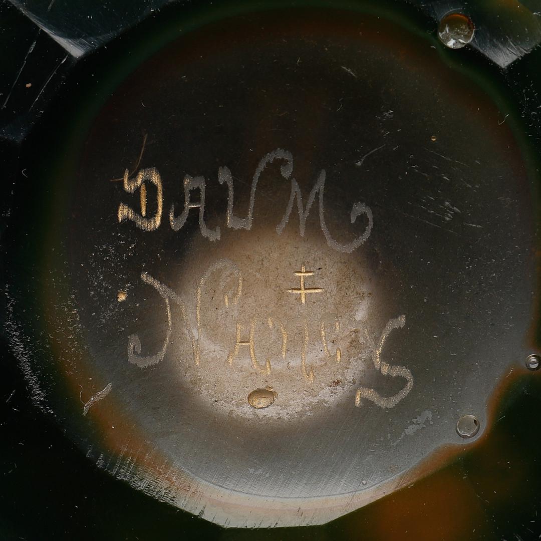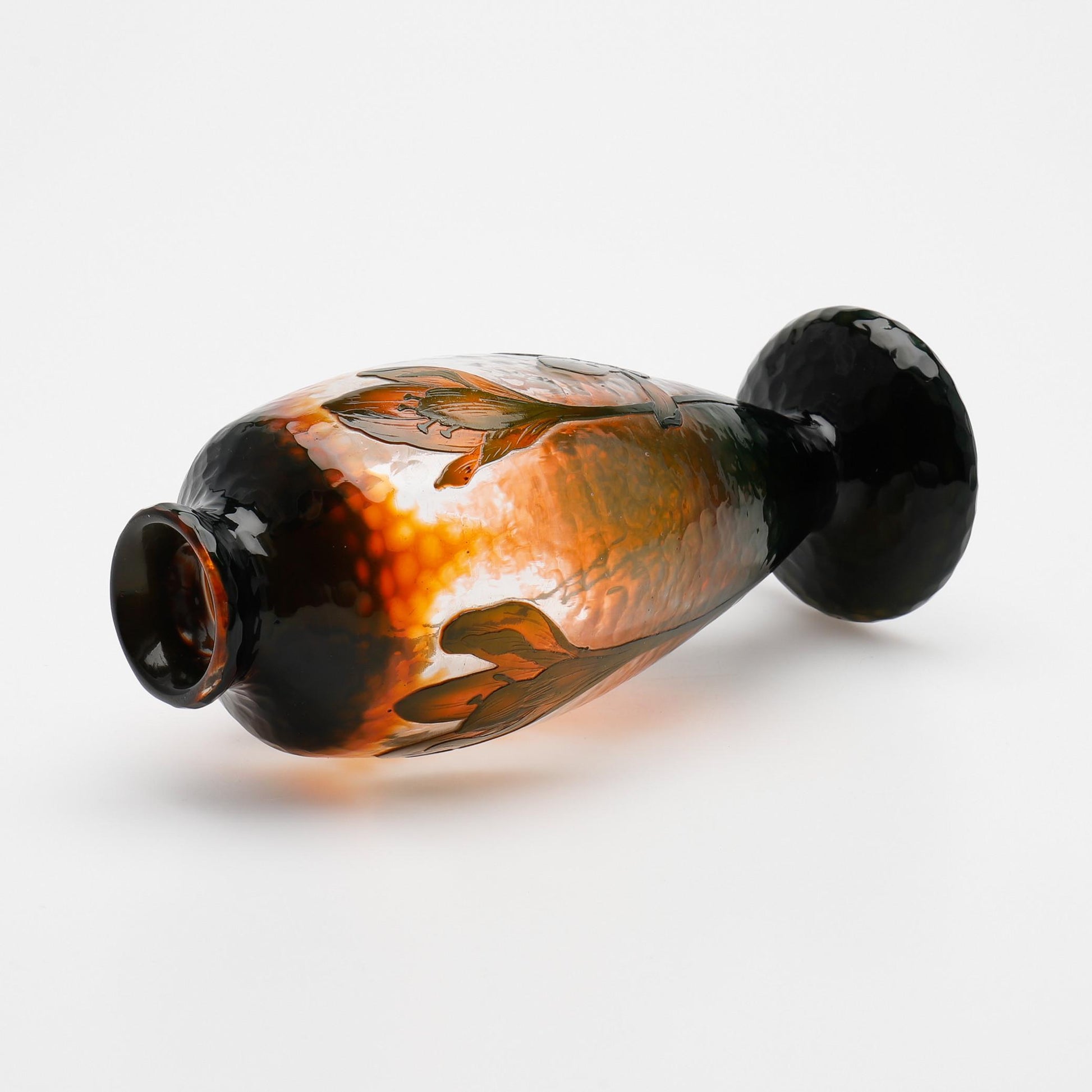 Early vase by Daum. A clear glass base with a red glass layer on top and a green glass layer on top. In addition to partially etching away the glass layers, a lot has been ground away with the diamond wheel. In the flowers this is done very subtly and gradually and in the background with a torturelé (hammer) effect. In transmitted light the vase is mainly warm in color, and in incident light it is mainly green. A very special effect.