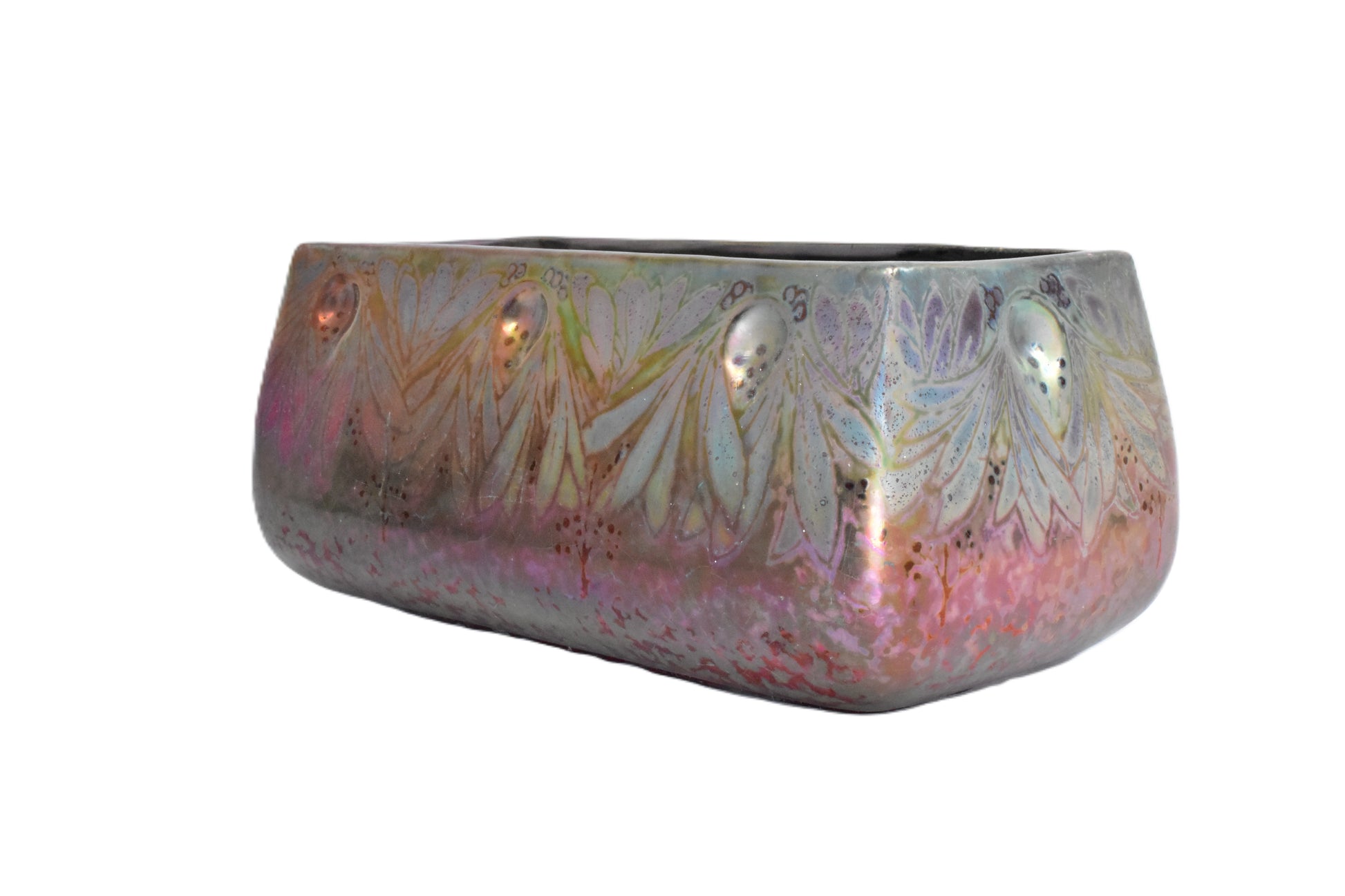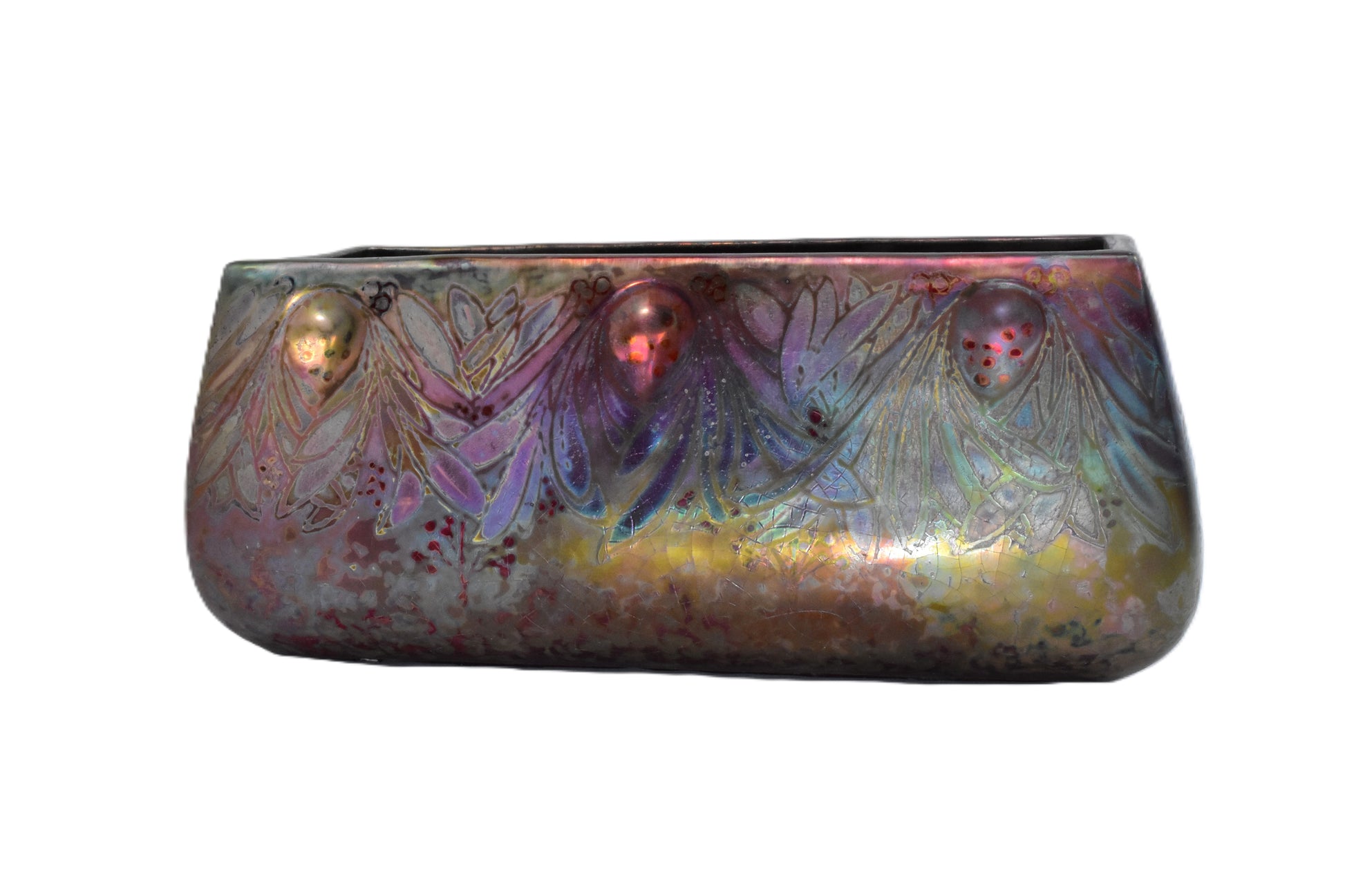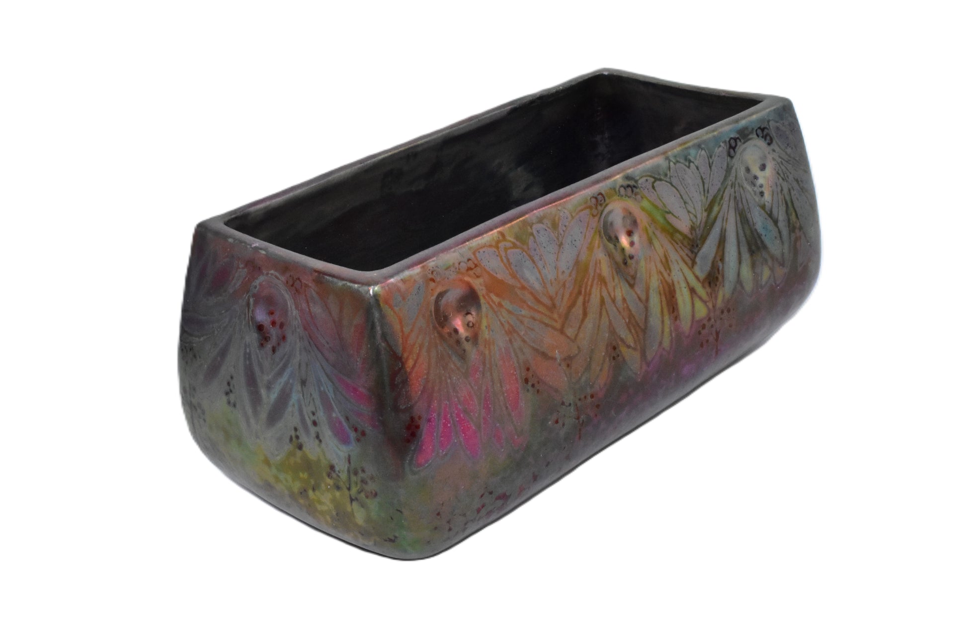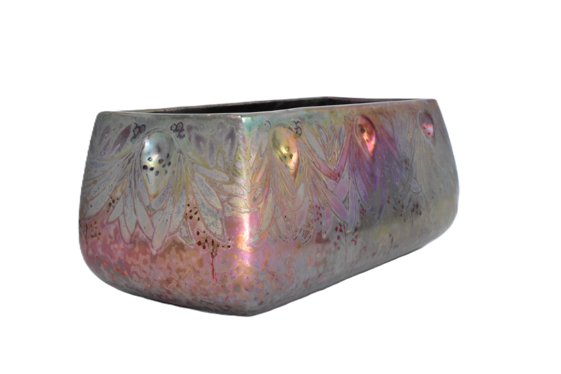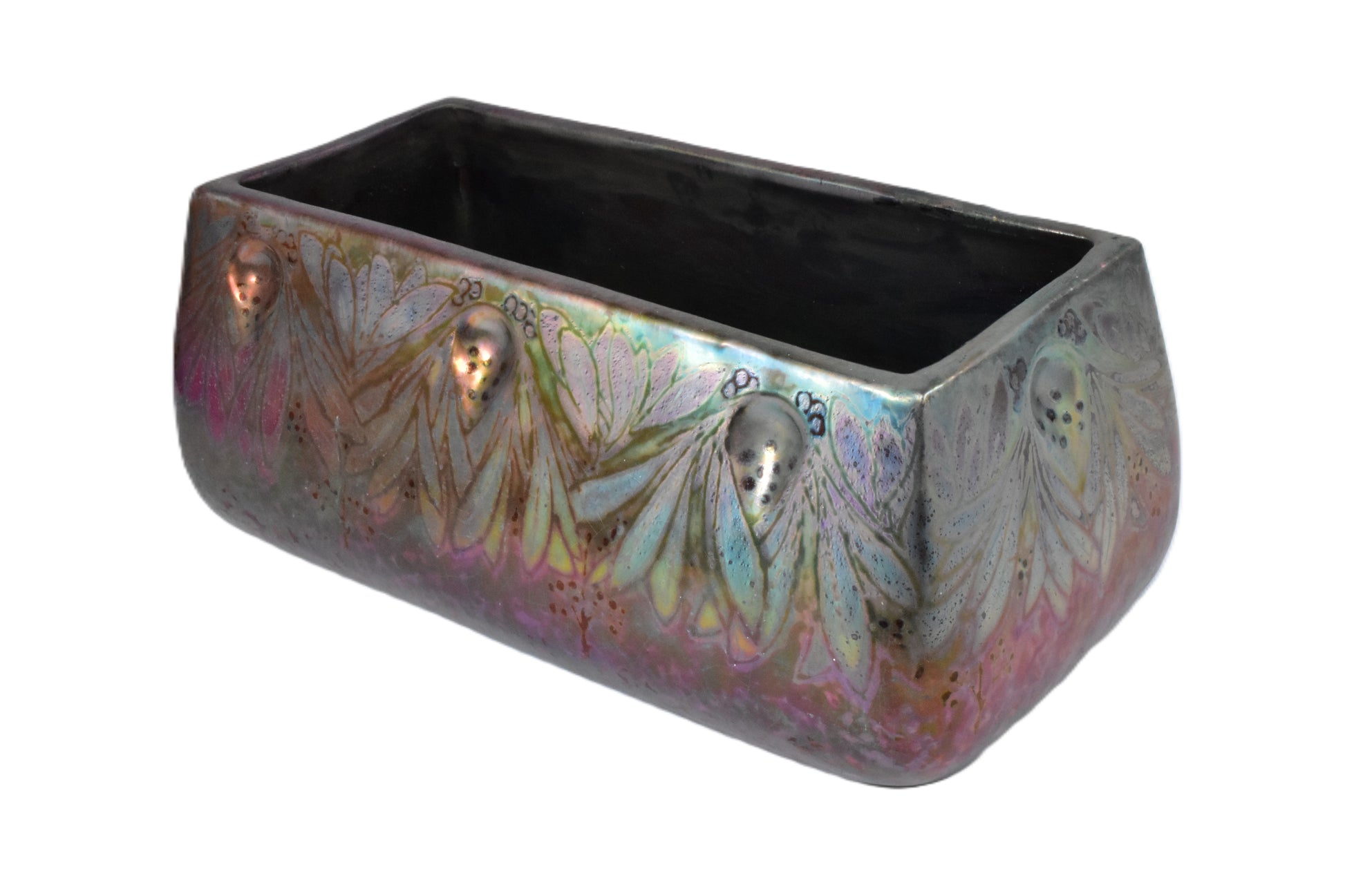 Binnen het ouvre van Clement Massier is dit een zeldzame vorm. Het is een jardinière die gedecoreerd is door Maurice Alexandre. Hij heeft op de zijkant onderaan zijn initialen M.A. toegevoegd. Niet te verwarren met de letters A M die tussen haakjes zijn gelaatst onder het stuk, en die staan voor Alpes Maritimes, het district waar Golfe Juan ligt, de vestigingsplaats van Clement Massier. De reducerend gestookte tweede brand van de jardinière zorgde ervoor dat de metaaloxiden die in de aangebrachte glazuur zaten metaalachtig gaan reflecteren. Een door Massier gezocht en ontwikkeld procedé waarmee hij wereldberoemd geworden is. Alle kleuren van de regenboog komen met deze keramiek naar voren.