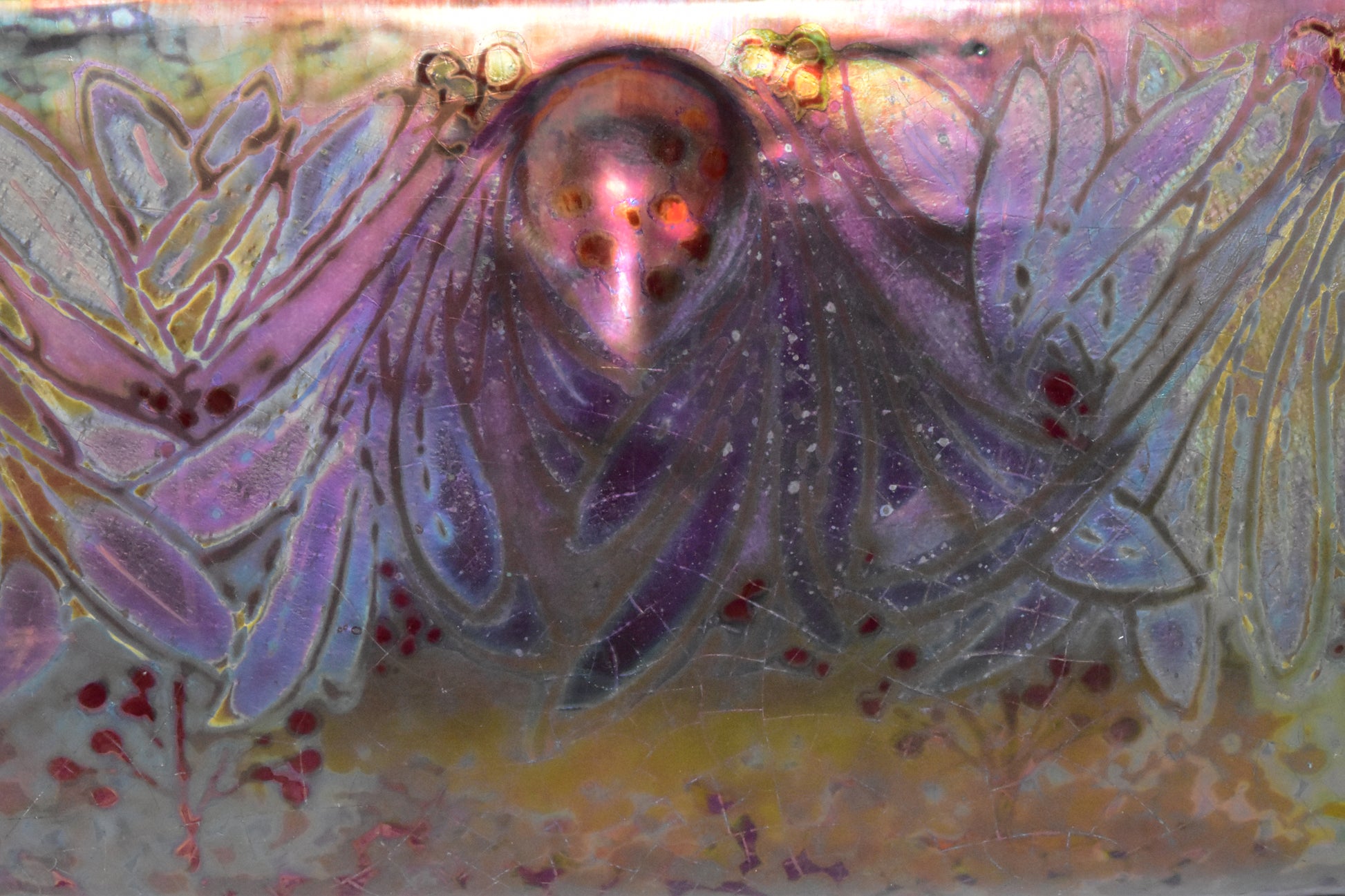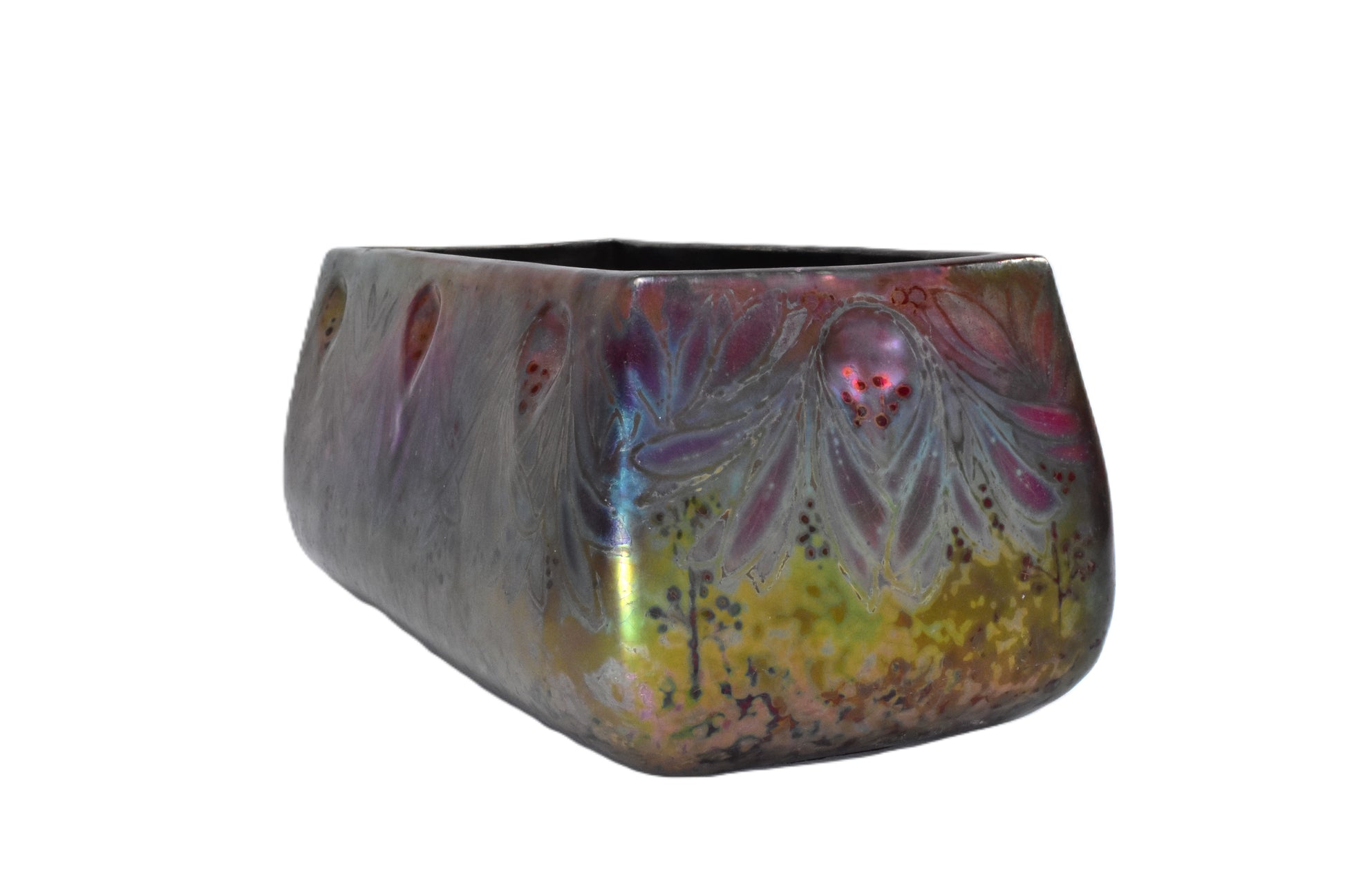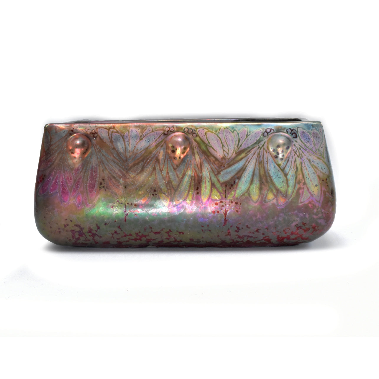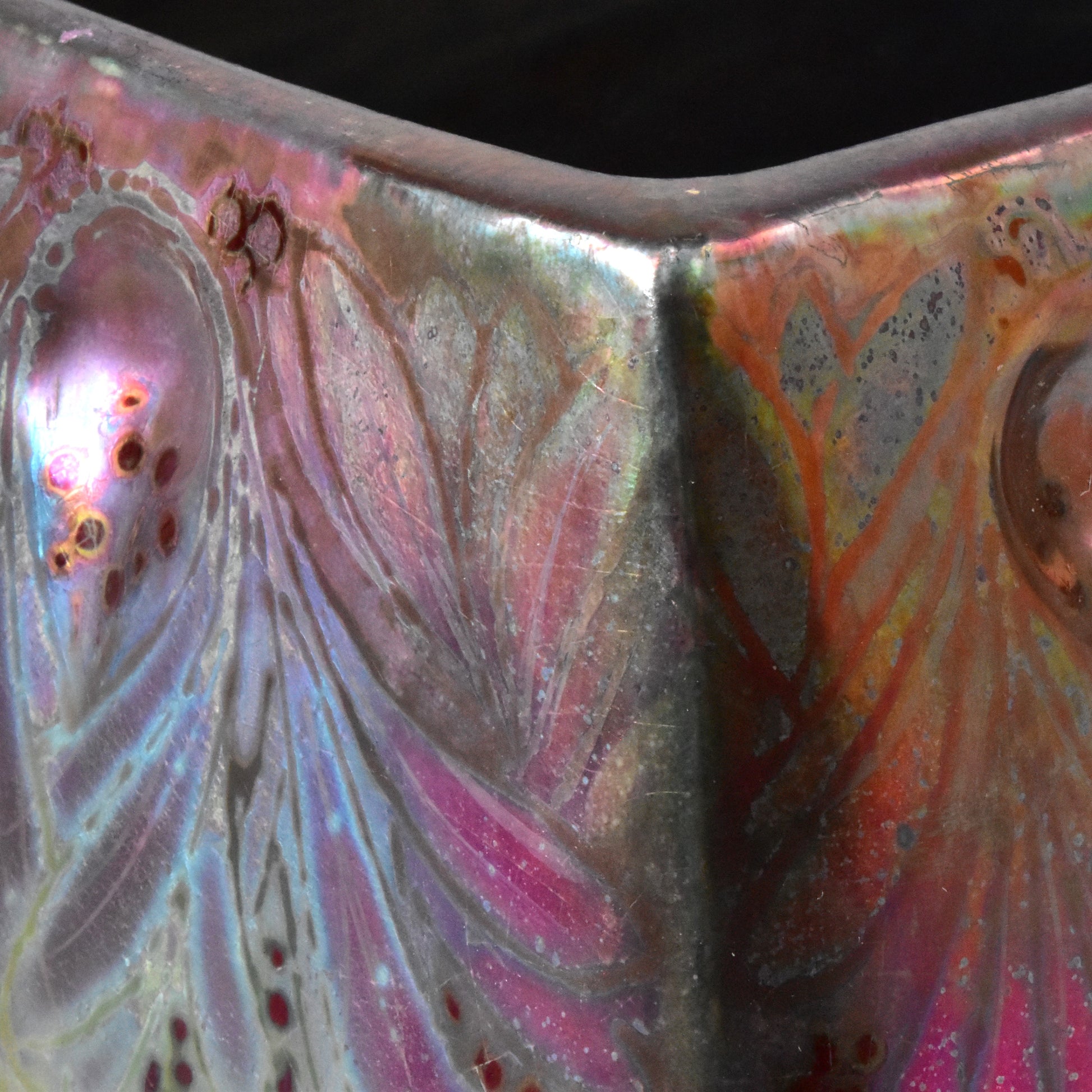 Binnen het ouvre van Clement Massier is dit een zeldzame vorm. Het is een jardinière die gedecoreerd is door Maurice Alexandre. Hij heeft op de zijkant onderaan zijn initialen M.A. toegevoegd. Niet te verwarren met de letters A M die tussen haakjes zijn gelaatst onder het stuk, en die staan voor Alpes Maritimes, het district waar Golfe Juan ligt, de vestigingsplaats van Clement Massier. De reducerend gestookte tweede brand van de jardinière zorgde ervoor dat de metaaloxiden die in de aangebrachte glazuur zaten metaalachtig gaan reflecteren. Een door Massier gezocht en ontwikkeld procedé waarmee hij wereldberoemd geworden is. Alle kleuren van de regenboog komen met deze keramiek naar voren.