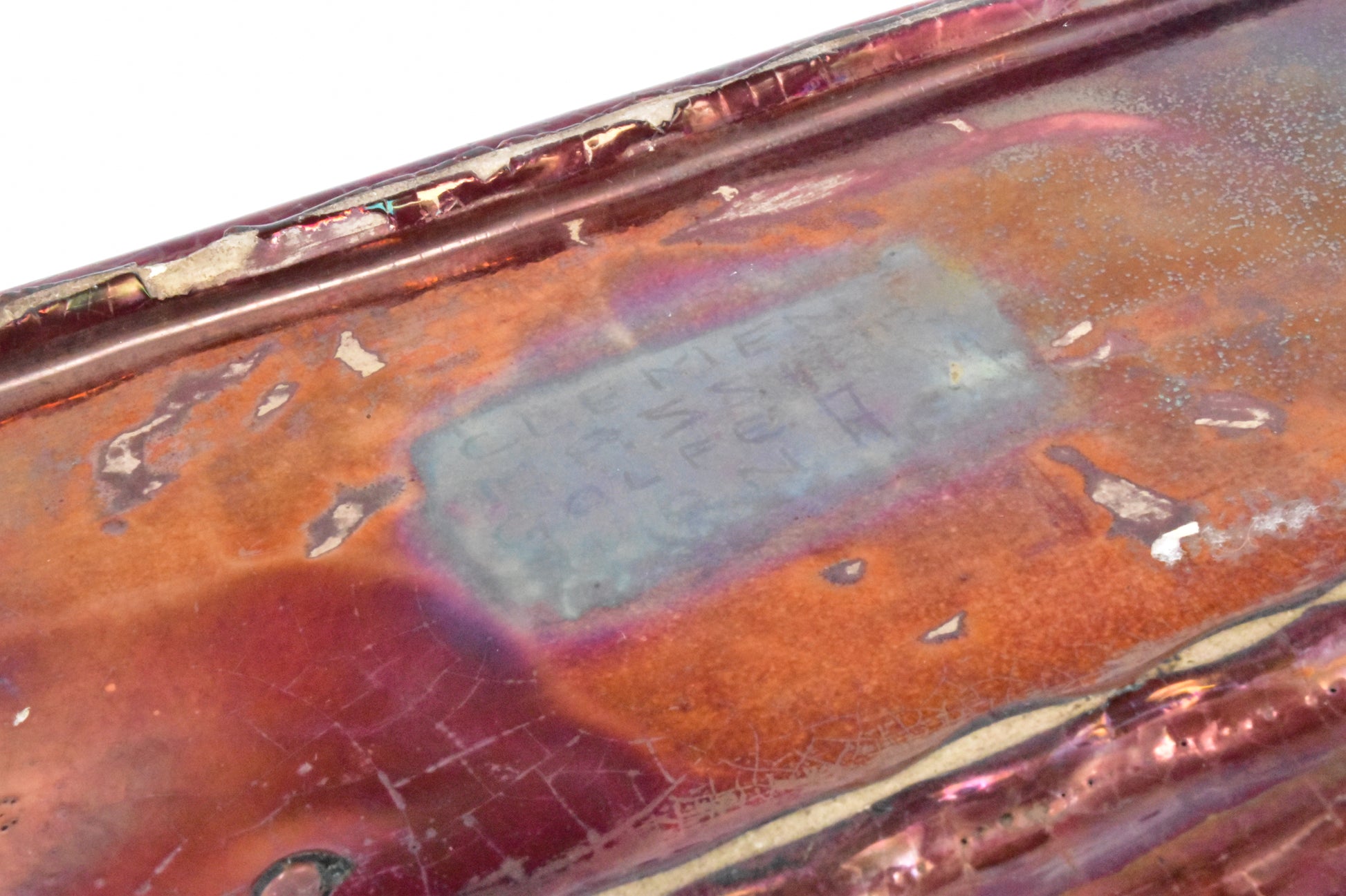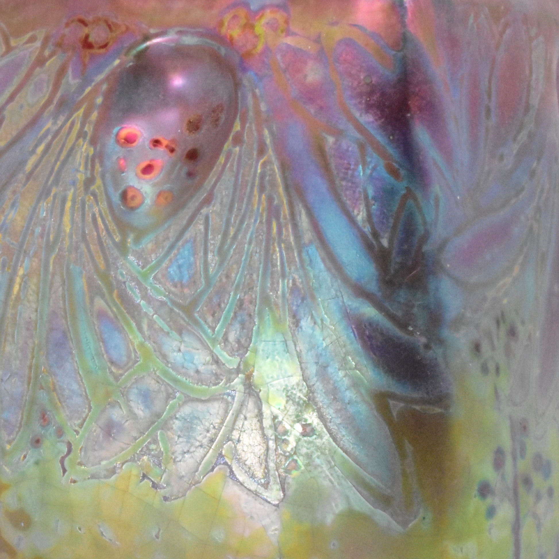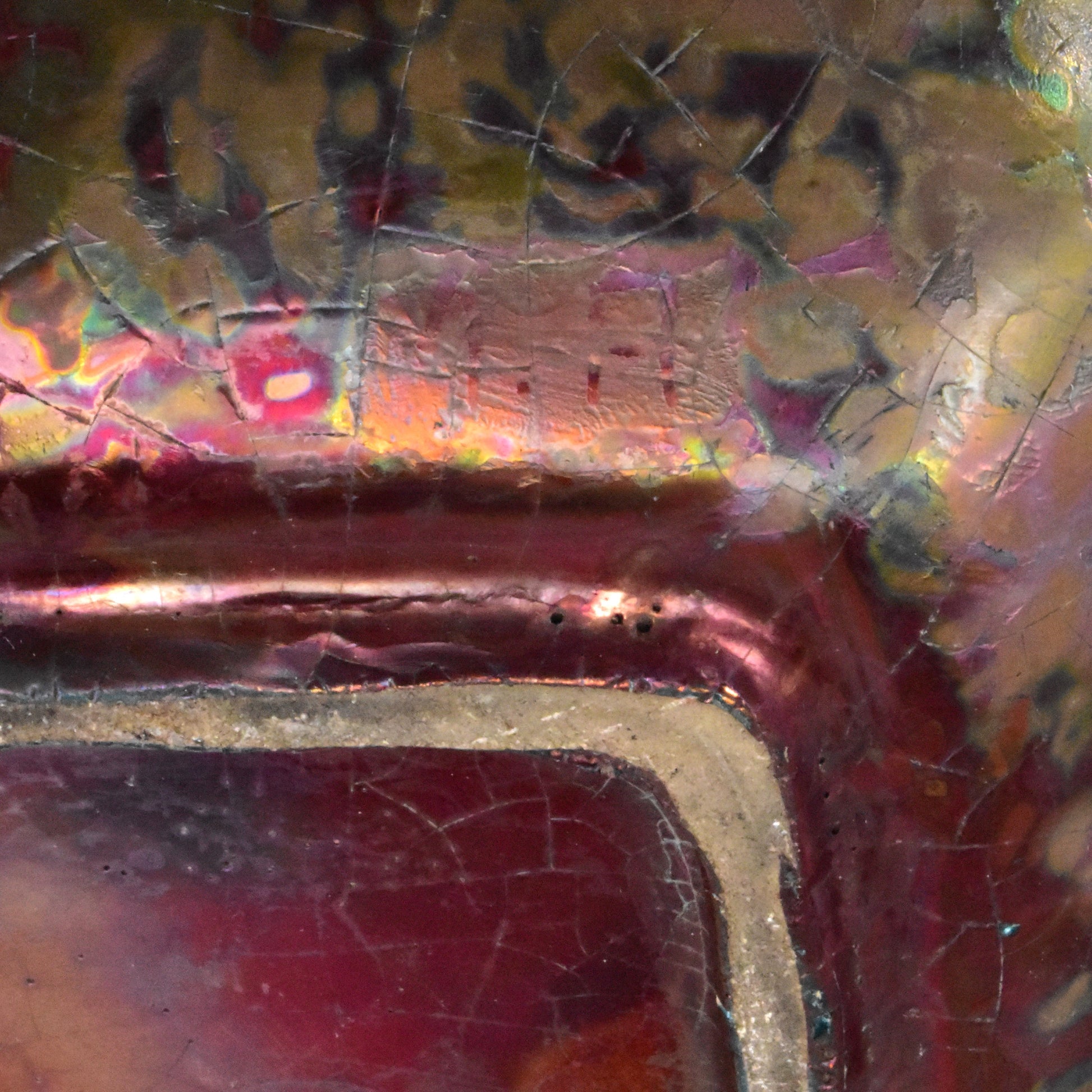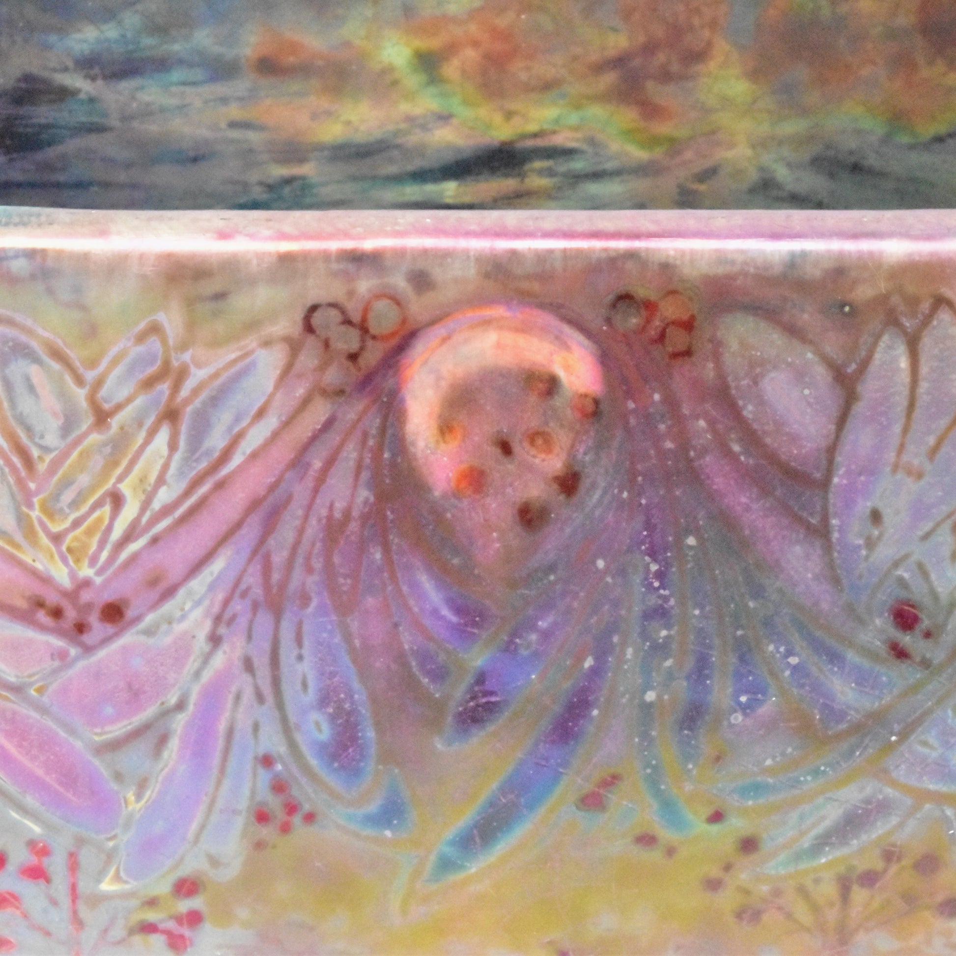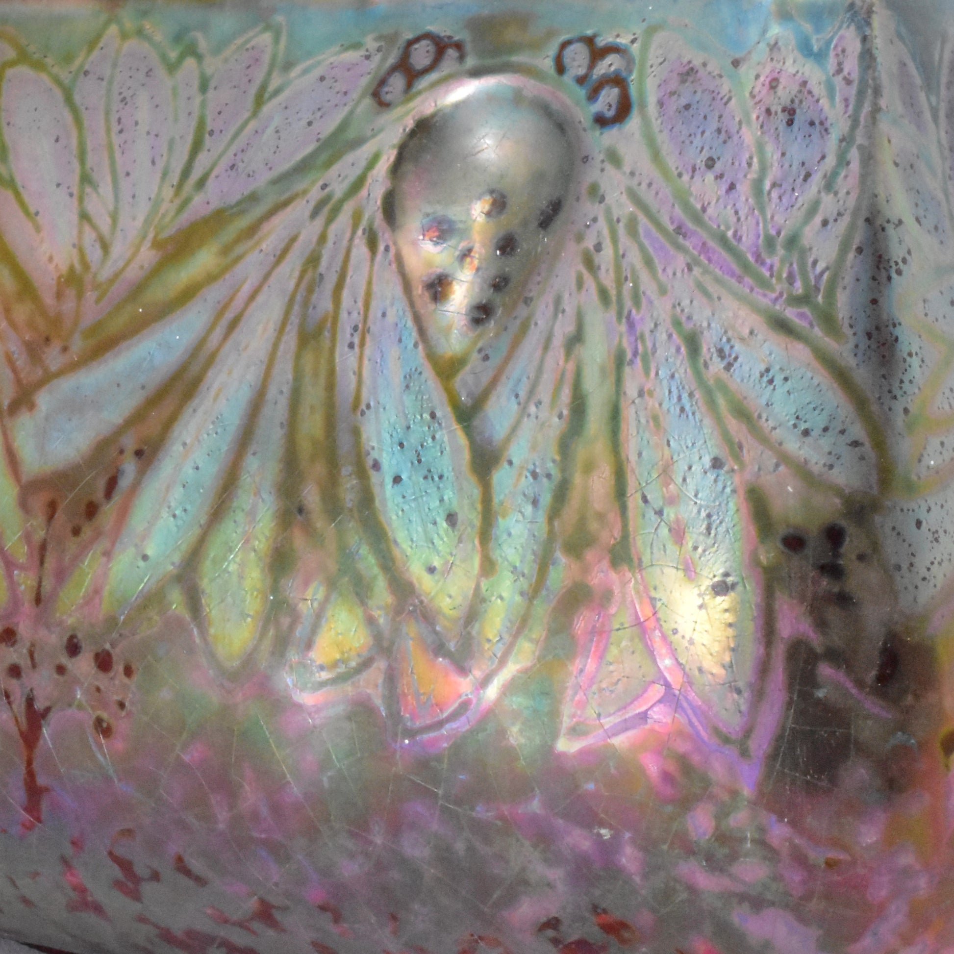 Binnen het ouvre van Clement Massier is dit een zeldzame vorm. Het is een jardinière die gedecoreerd is door Maurice Alexandre. Hij heeft op de zijkant onderaan zijn initialen M.A. toegevoegd. Niet te verwarren met de letters A M die tussen haakjes zijn gelaatst onder het stuk, en die staan voor Alpes Maritimes, het district waar Golfe Juan ligt, de vestigingsplaats van Clement Massier. De reducerend gestookte tweede brand van de jardinière zorgde ervoor dat de metaaloxiden die in de aangebrachte glazuur zaten metaalachtig gaan reflecteren. Een door Massier gezocht en ontwikkeld procedé waarmee hij wereldberoemd geworden is. Alle kleuren van de regenboog komen met deze keramiek naar voren.