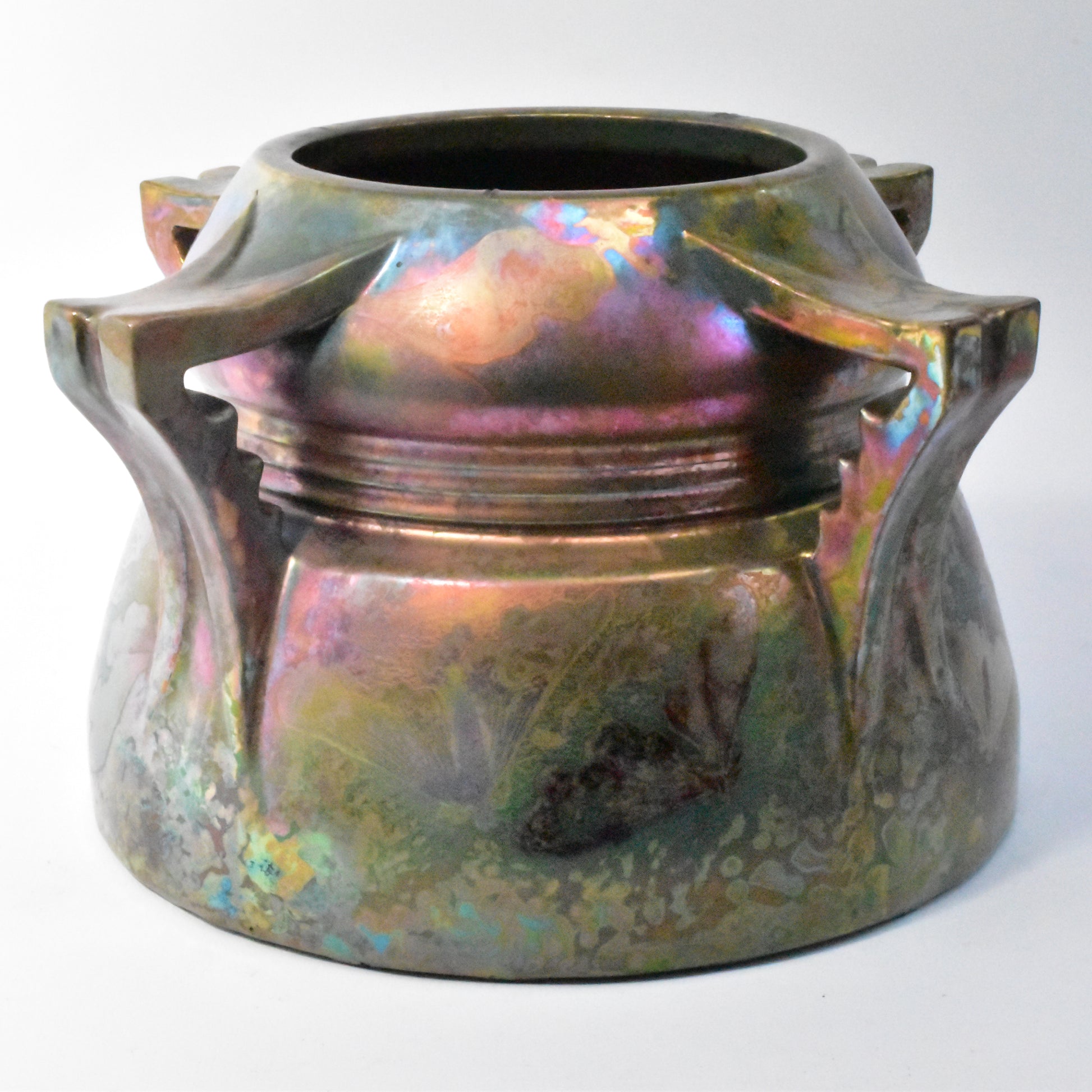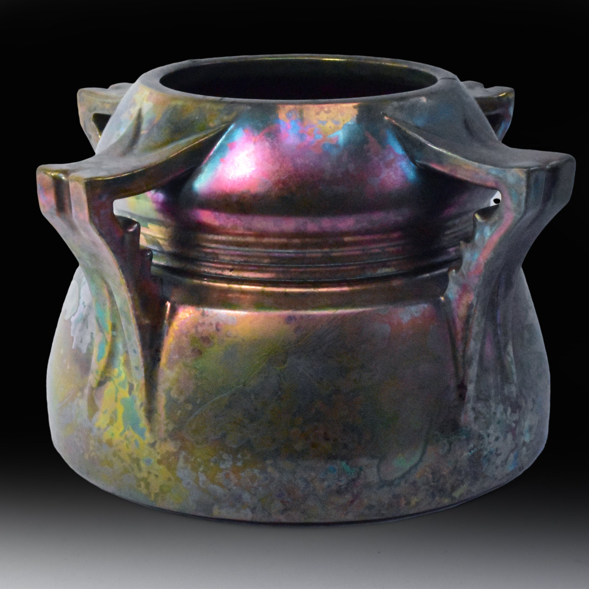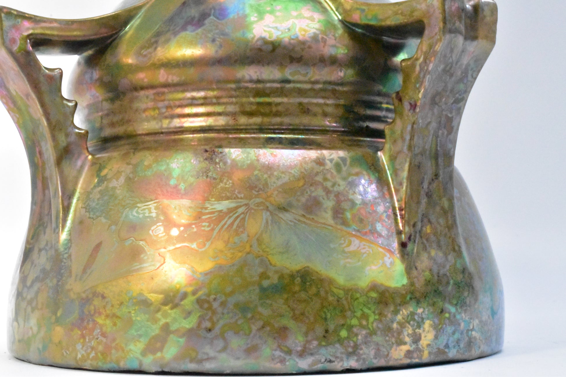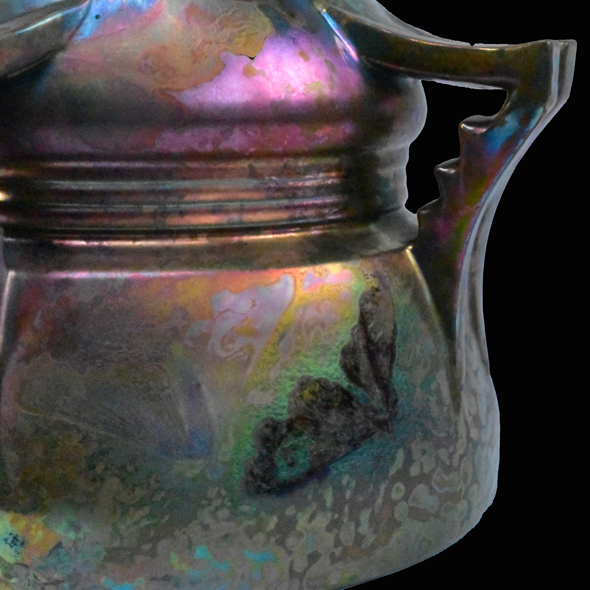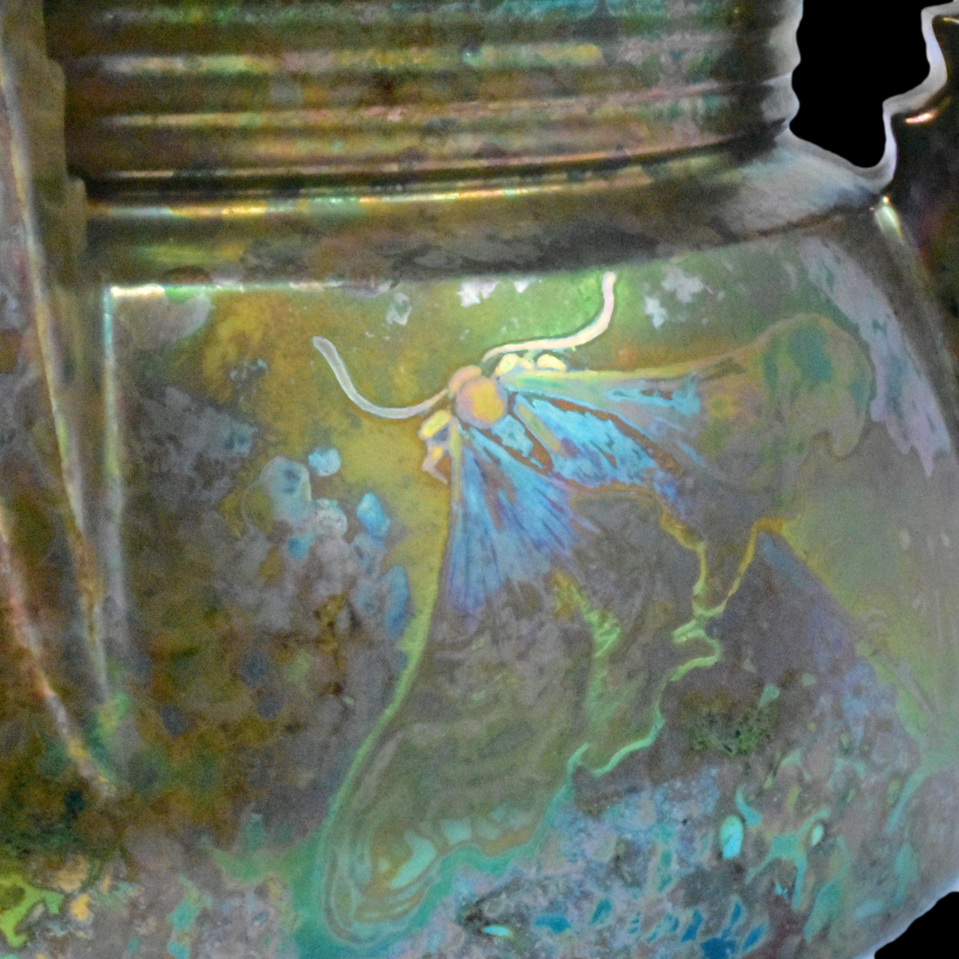 Exceptionele vorm pot van Clement Massier uit 1900. Prachtig gedecoreerd met nachtvlinders. Mysterieus en veelkleurig. De bijzondere reflets metallique glazuren vragen om inspectie van dichtbij. Dan ontdek je de fantastische kleuren en de talloze vliegende nachtvlinders die opdoemen uit de achtergrond. Alle kleuren van de regenboog fladderen mysterieus rond dit kunstwerk. De oplettende beschouwer wordt ik dan ook evenzeer aangetrokken tot dit object als motten naar een brandende kaars in de nacht.