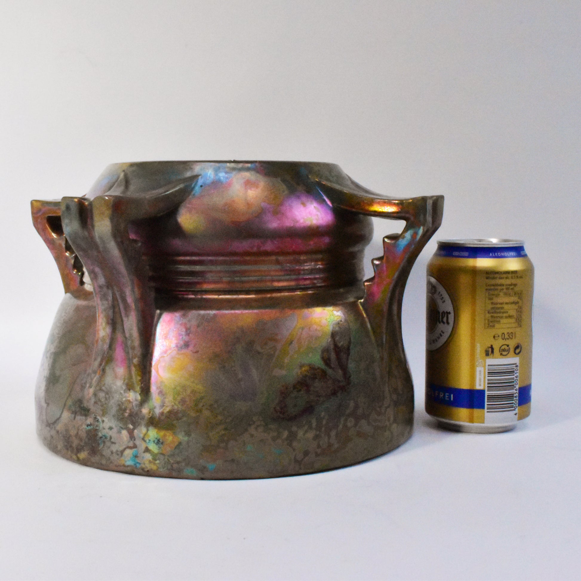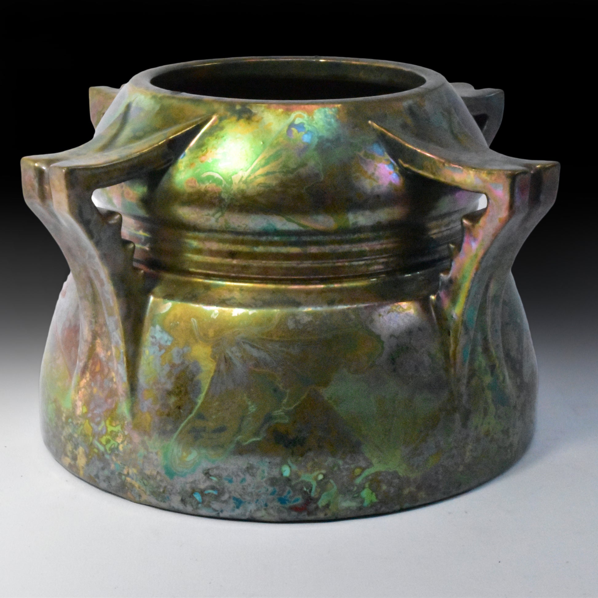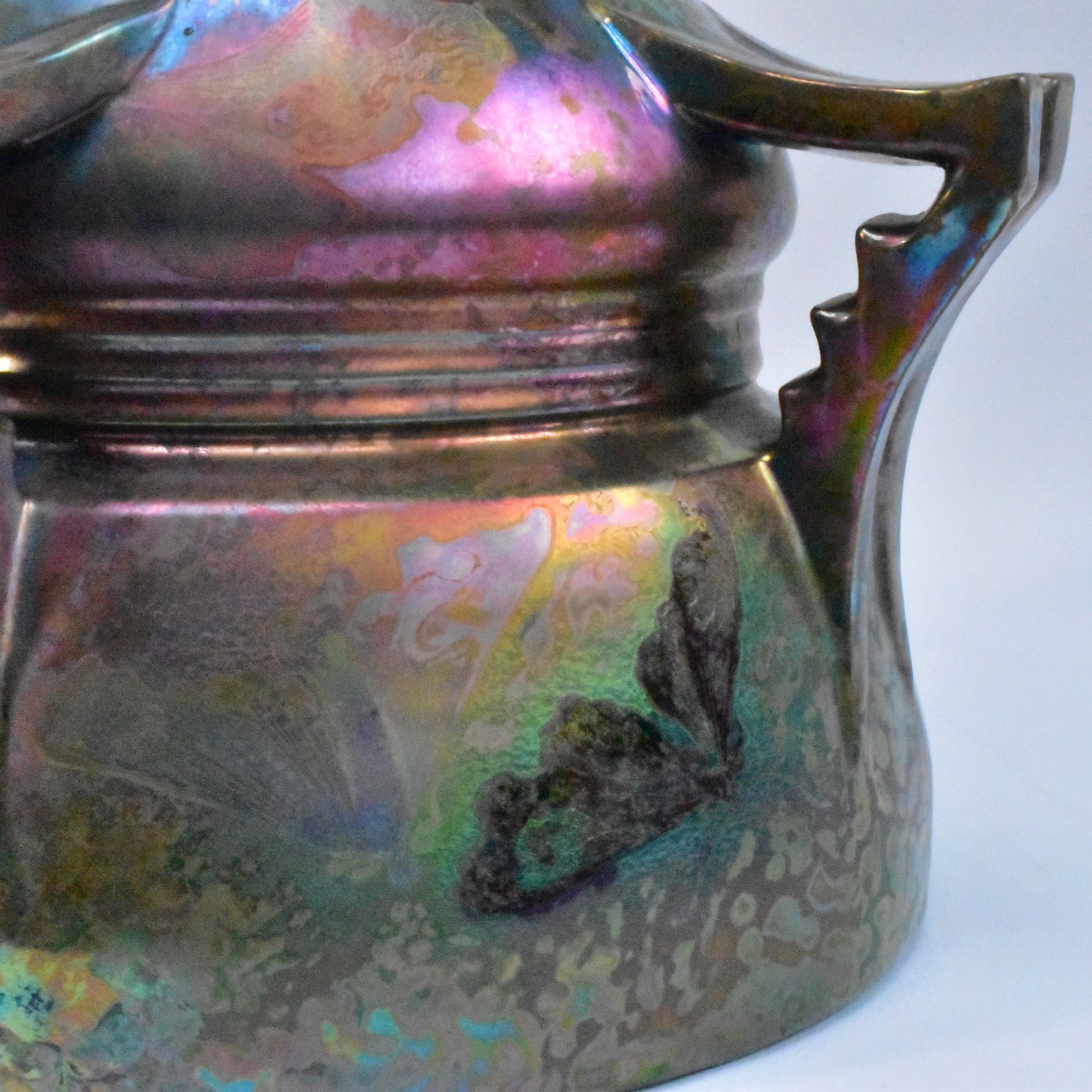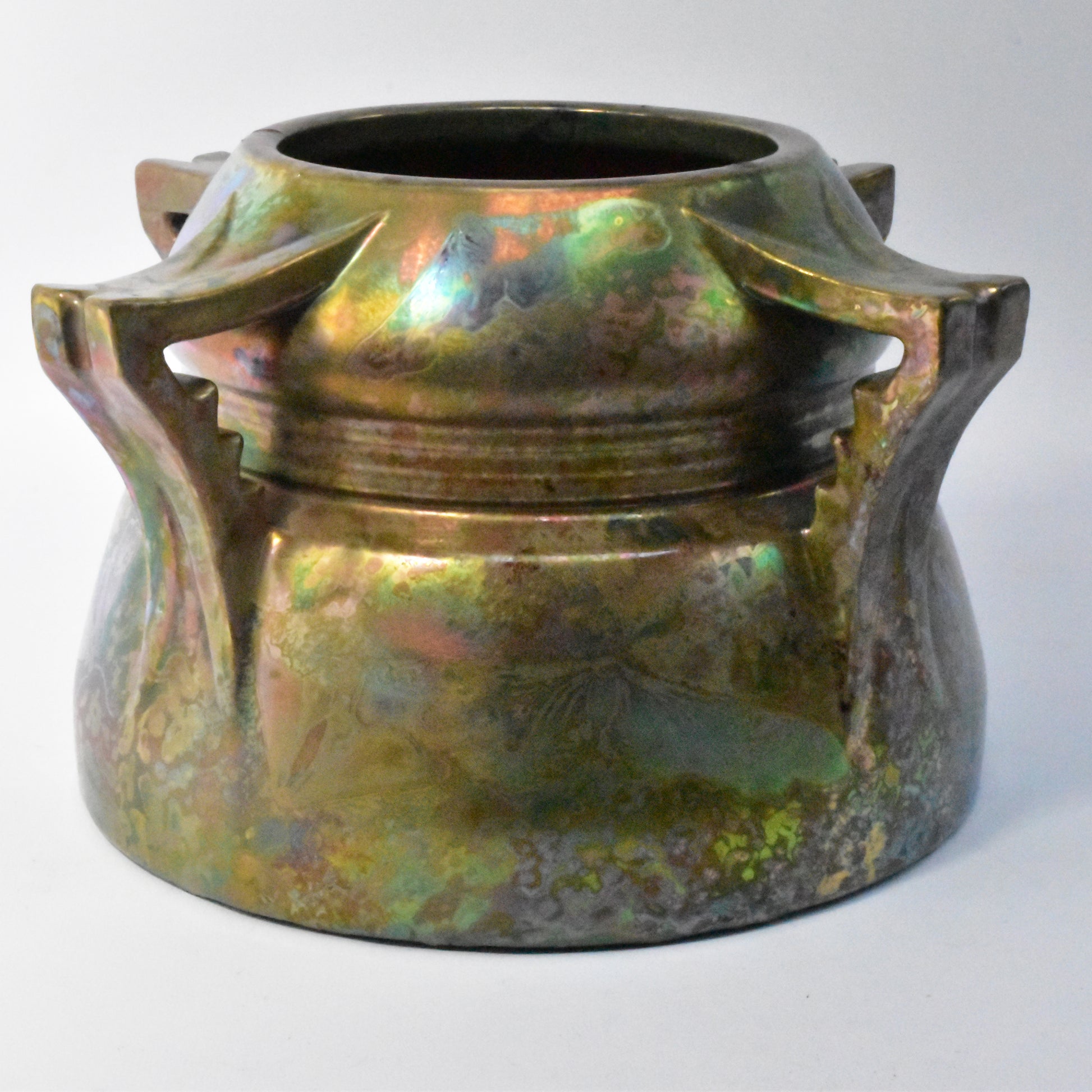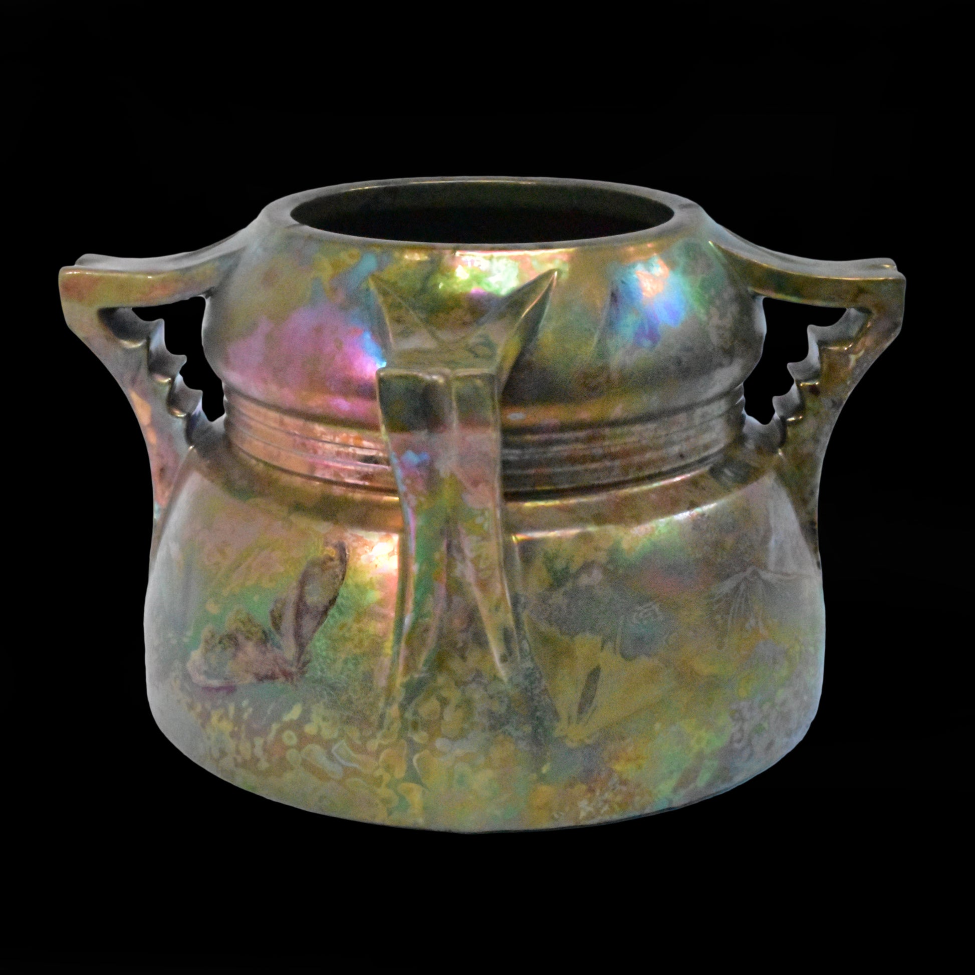 Exceptionele vorm pot van Clement Massier uit 1900. Prachtig gedecoreerd met nachtvlinders. Mysterieus en veelkleurig. De bijzondere reflets metallique glazuren vragen om inspectie van dichtbij. Dan ontdek je de fantastische kleuren en de talloze vliegende nachtvlinders die opdoemen uit de achtergrond. Alle kleuren van de regenboog fladderen mysterieus rond dit kunstwerk. De oplettende beschouwer wordt ik dan ook evenzeer aangetrokken tot dit object als motten naar een brandende kaars in de nacht.