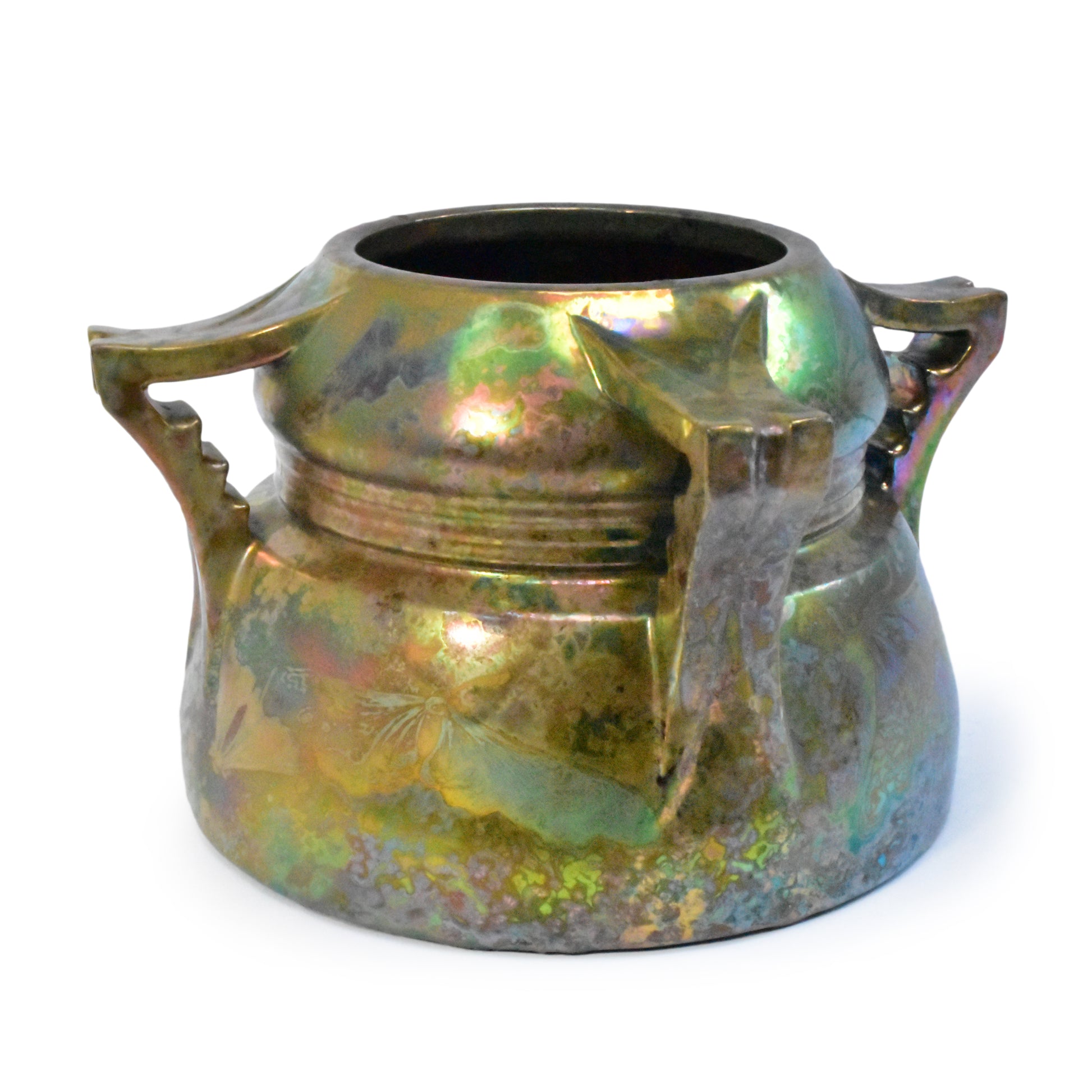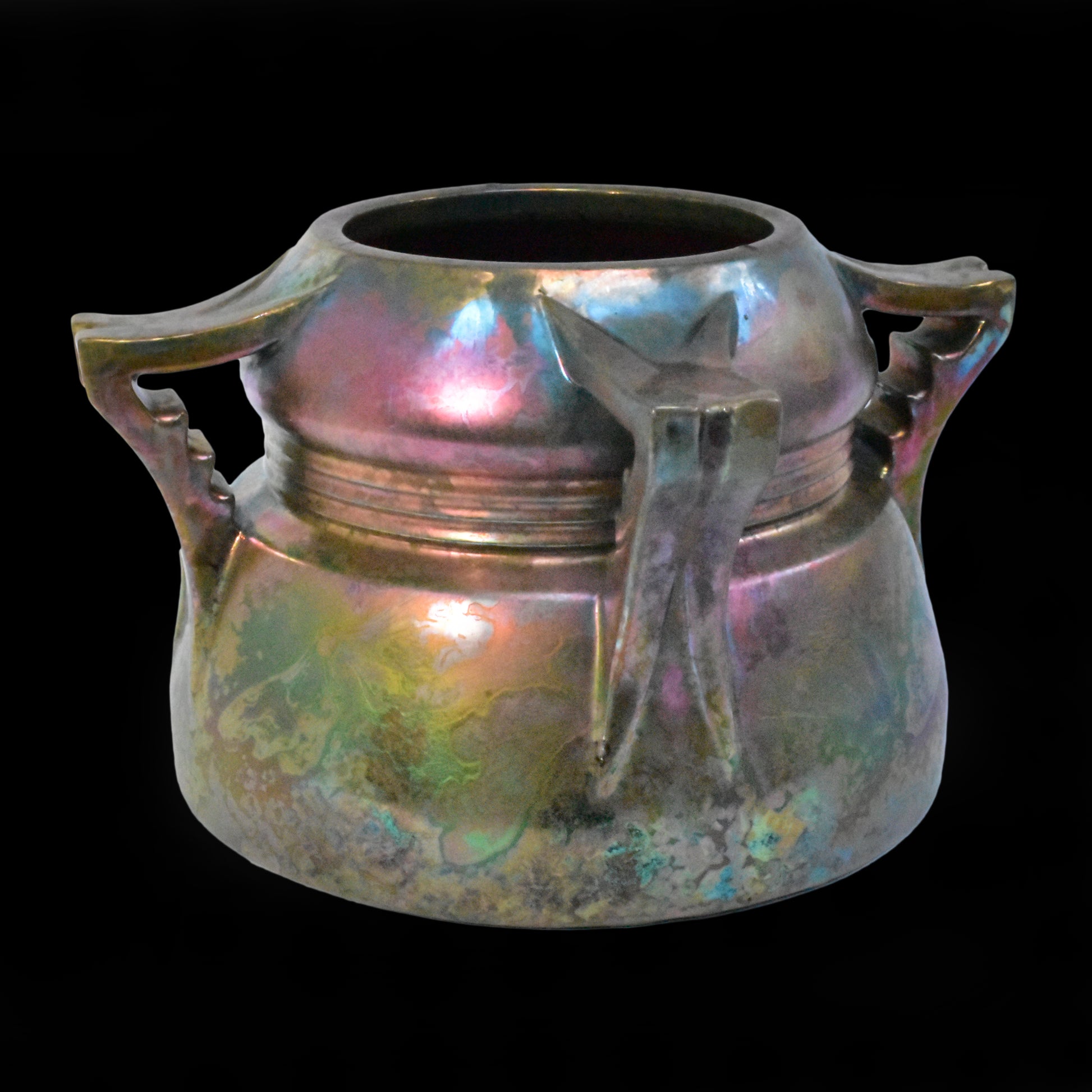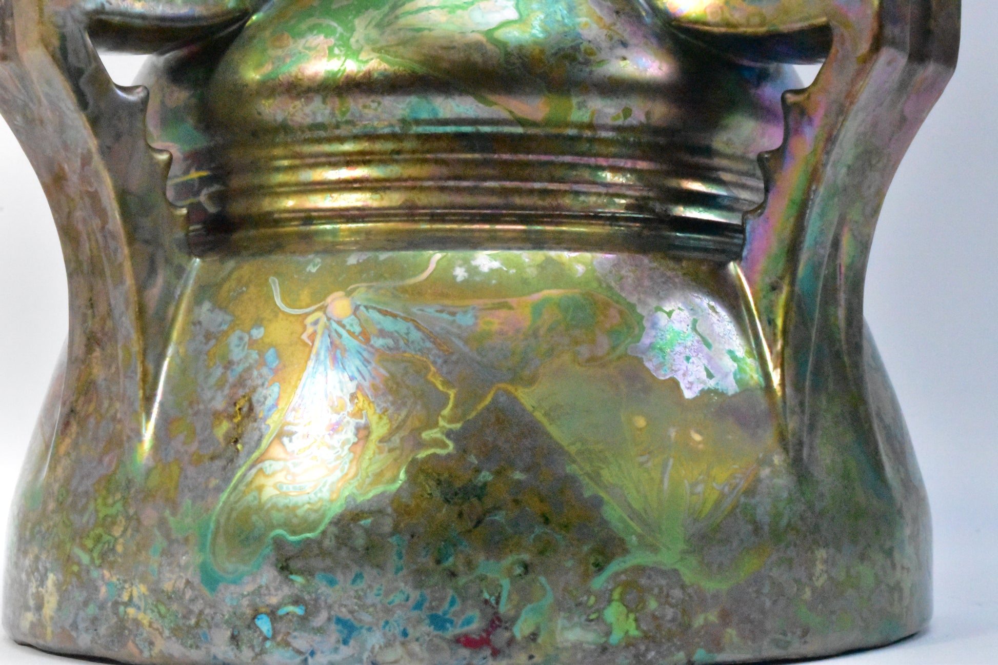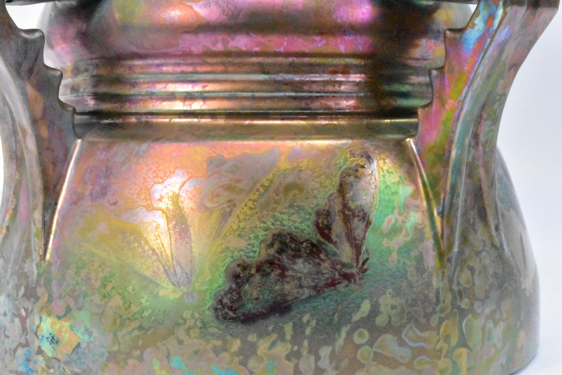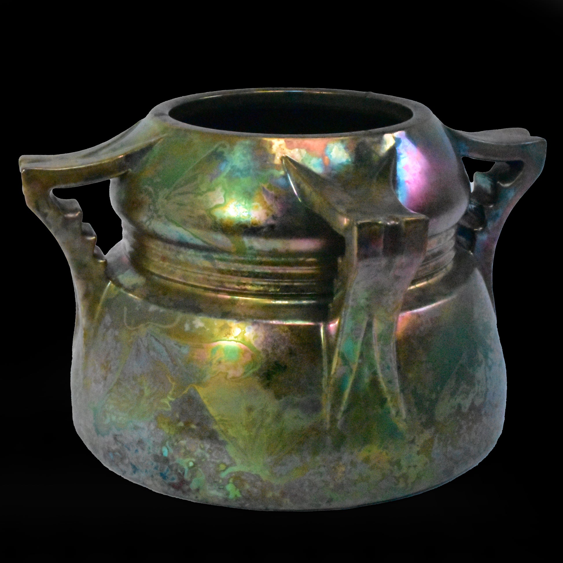 Exceptionele vorm pot van Clement Massier uit 1900. Prachtig gedecoreerd met nachtvlinders. Mysterieus en veelkleurig. De bijzondere reflets metallique glazuren vragen om inspectie van dichtbij. Dan ontdek je de fantastische kleuren en de talloze vliegende nachtvlinders die opdoemen uit de achtergrond. Alle kleuren van de regenboog fladderen mysterieus rond dit kunstwerk. De oplettende beschouwer wordt ik dan ook evenzeer aangetrokken tot dit object als motten naar een brandende kaars in de nacht.